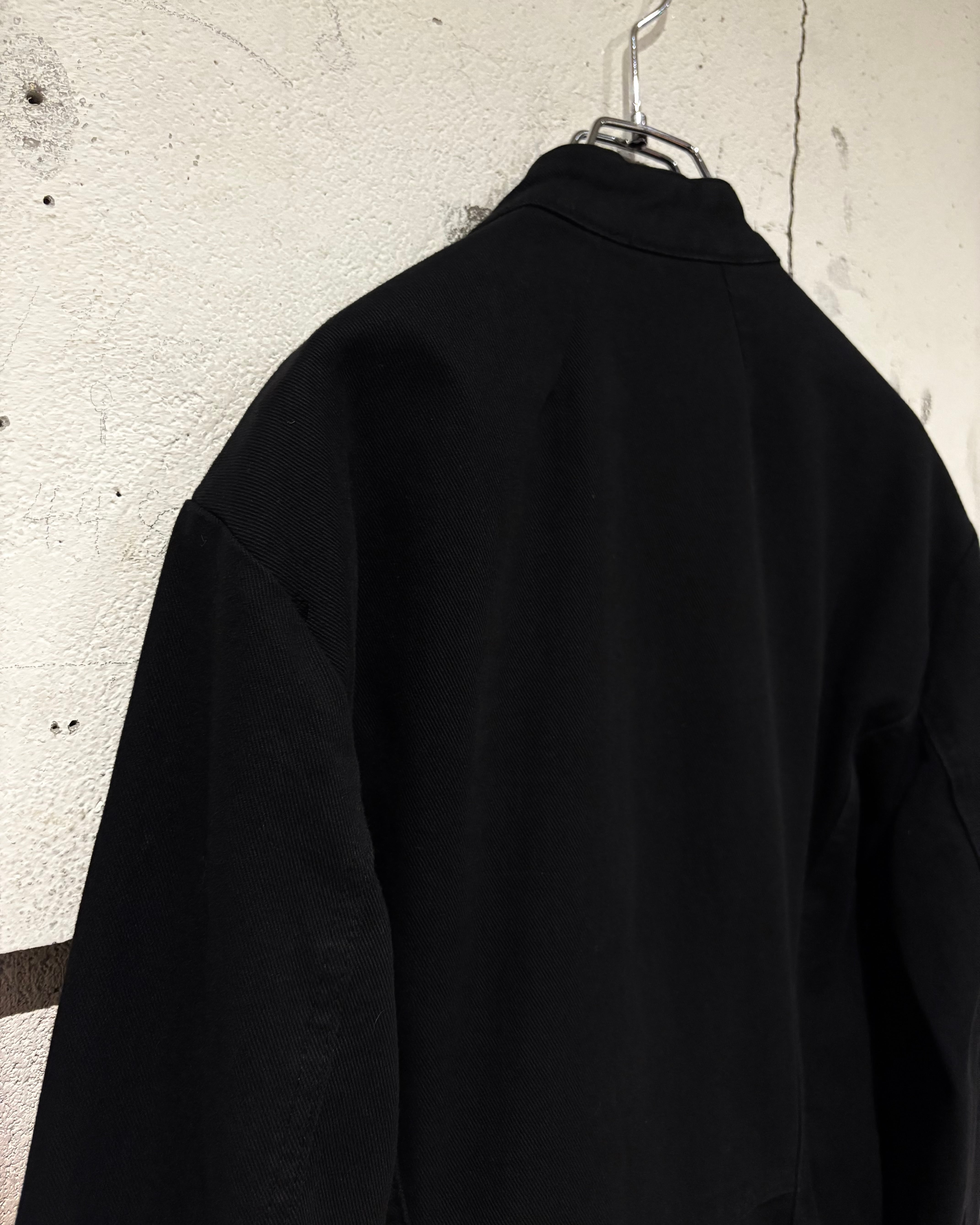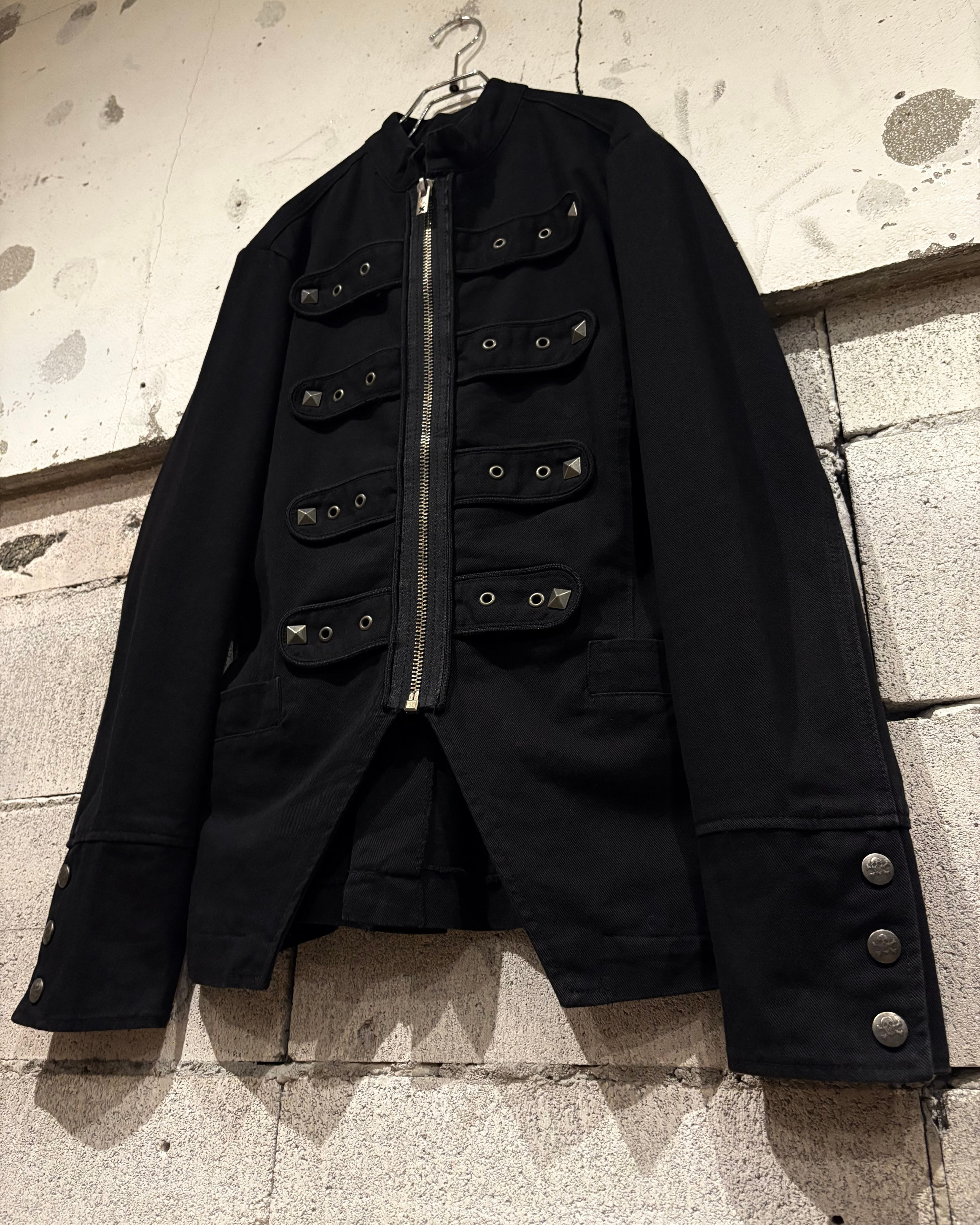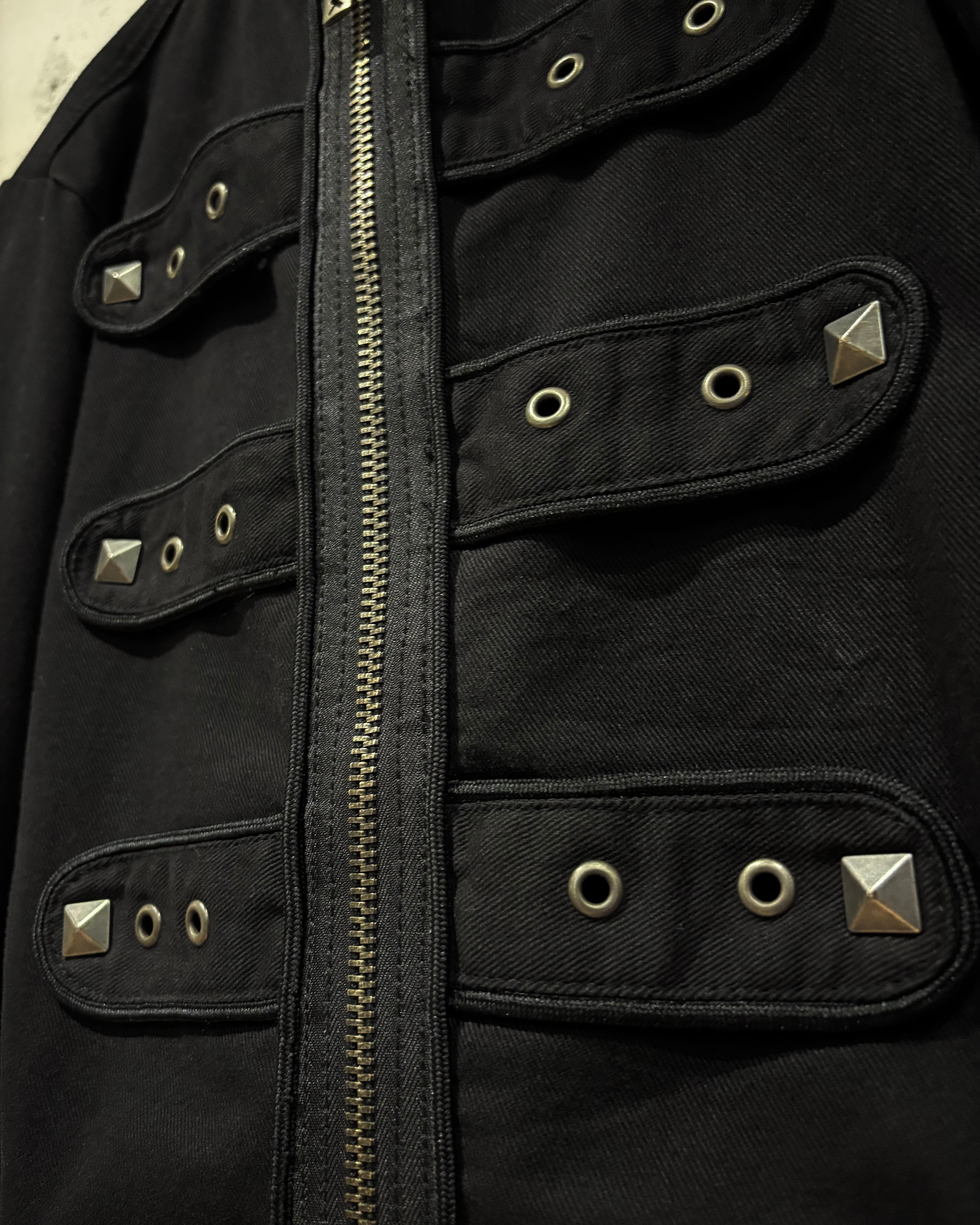 ブラックデニムをボディに使用し、フロントにスタッズやハトメの装飾を施したナポレオンジャケット。