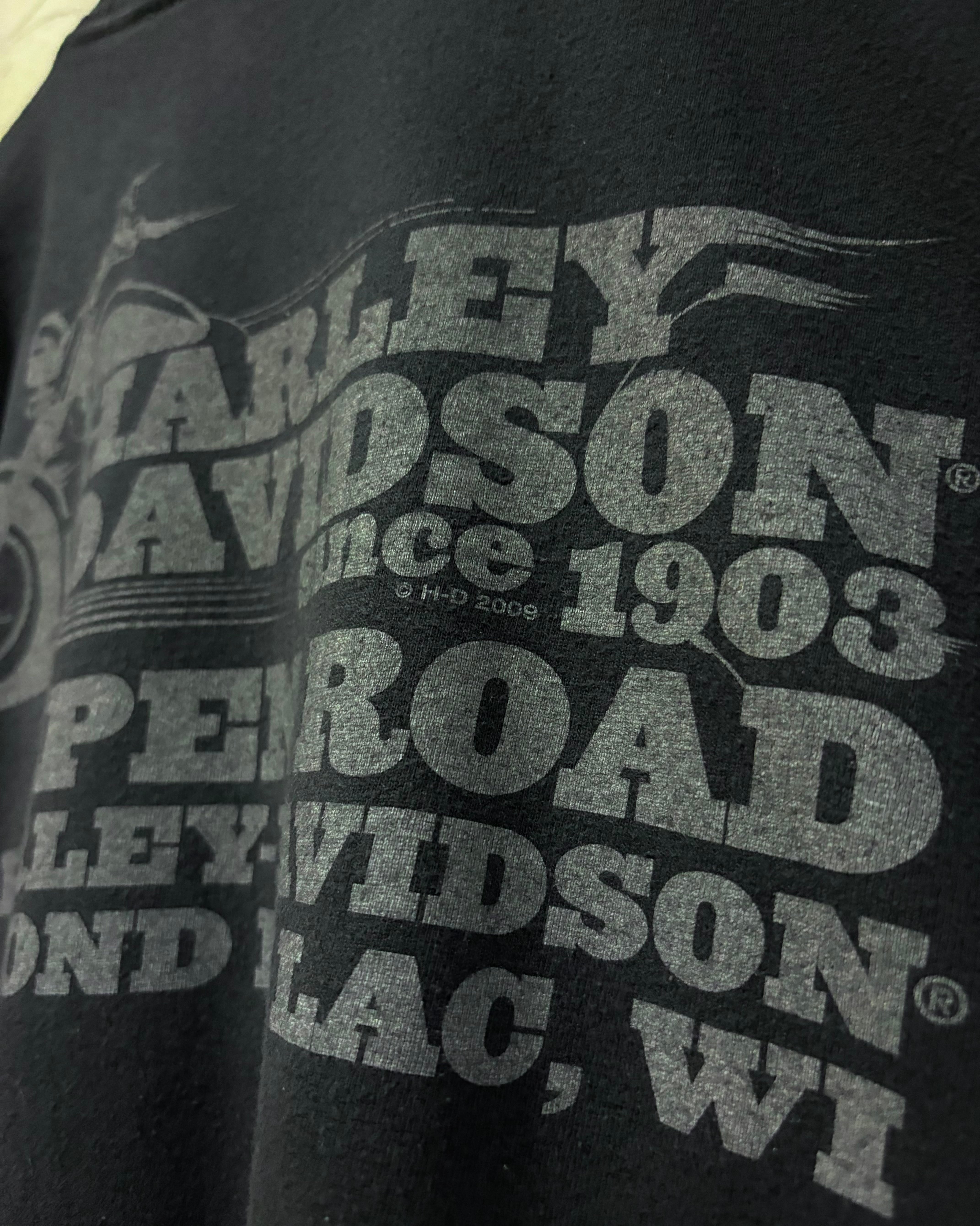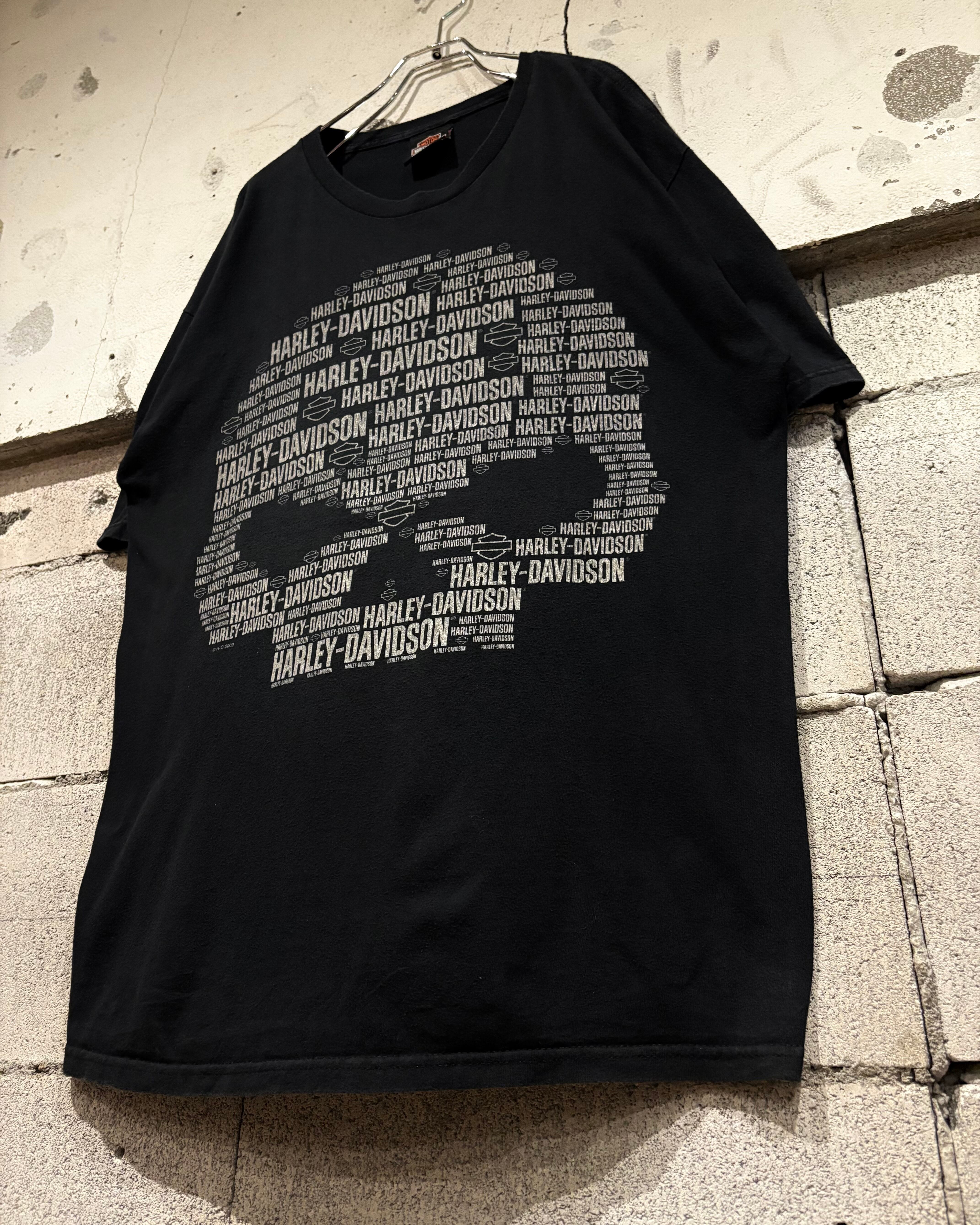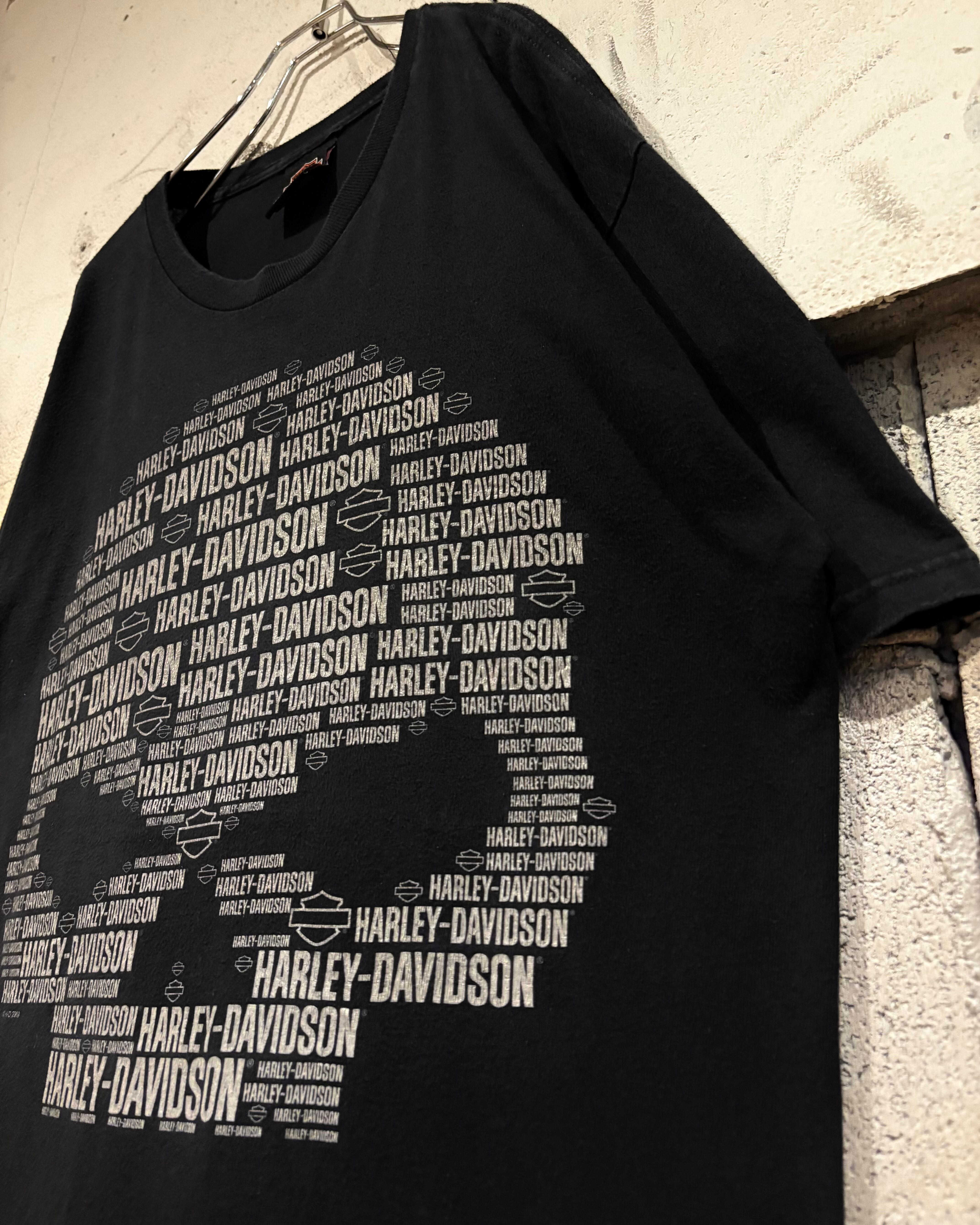 ほんのりとフェードの効いたブラックボディに、ブランドロゴによってスカルを表現した00's "HARLEY DAVIDSON"のTシャツ。
