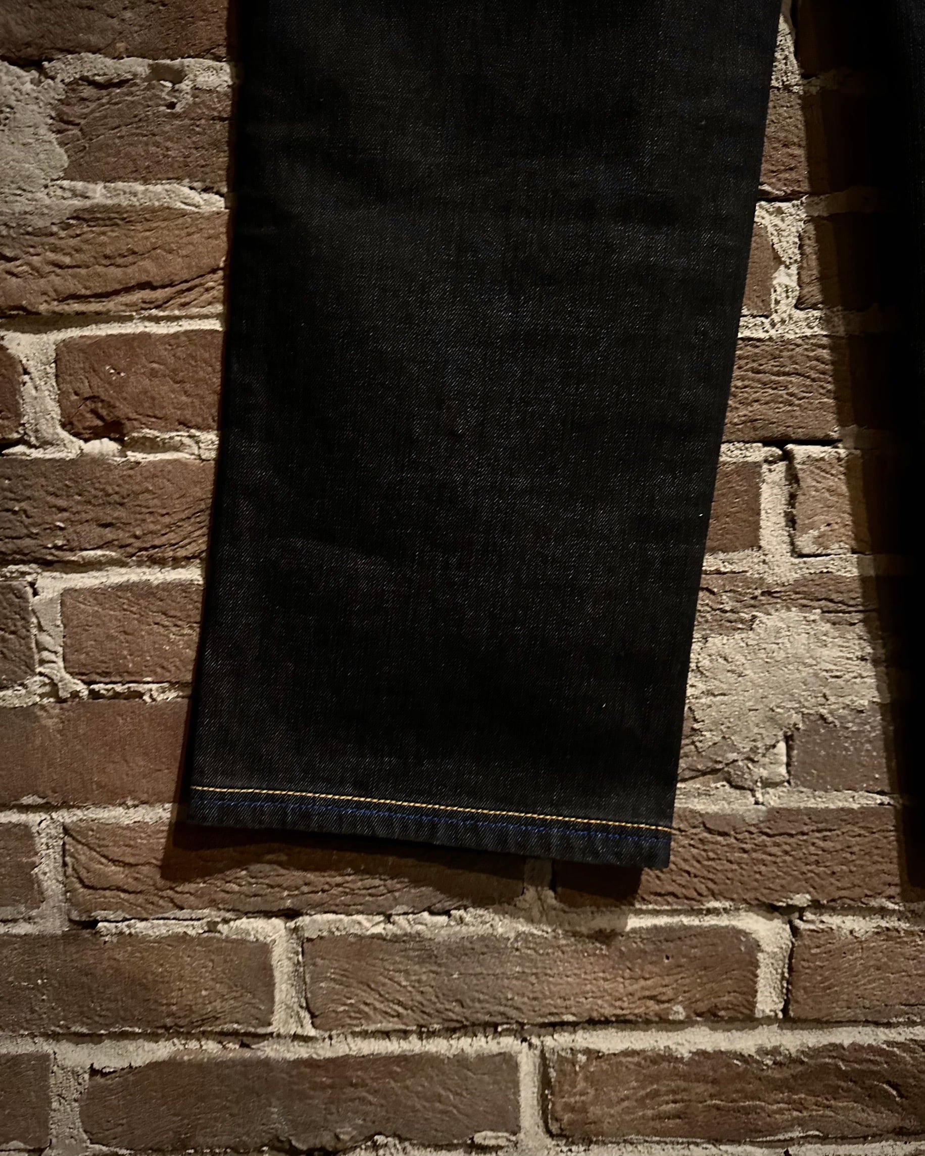 色濃く残ったブラックデニムをボディに使用し、背面のパッチポケットをパイソン柄のエナメル生地で切り替えた1本。