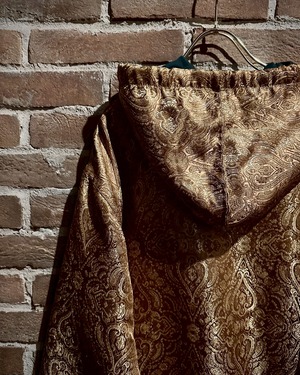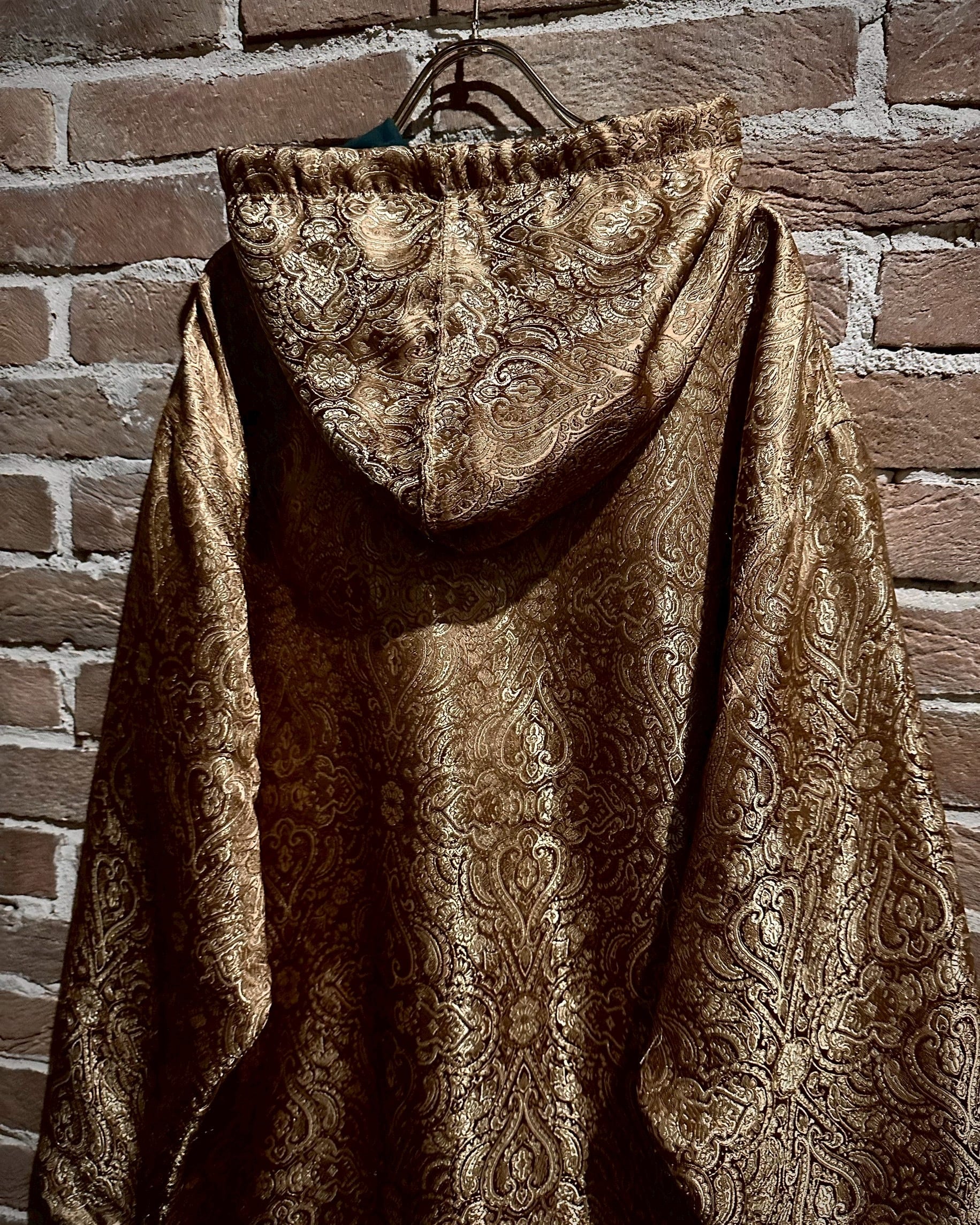 アラベスク調の柄模様を表現した、鋭い光沢を放つジャガード織りのテキスタイルをボディに使用した稀有な1着。