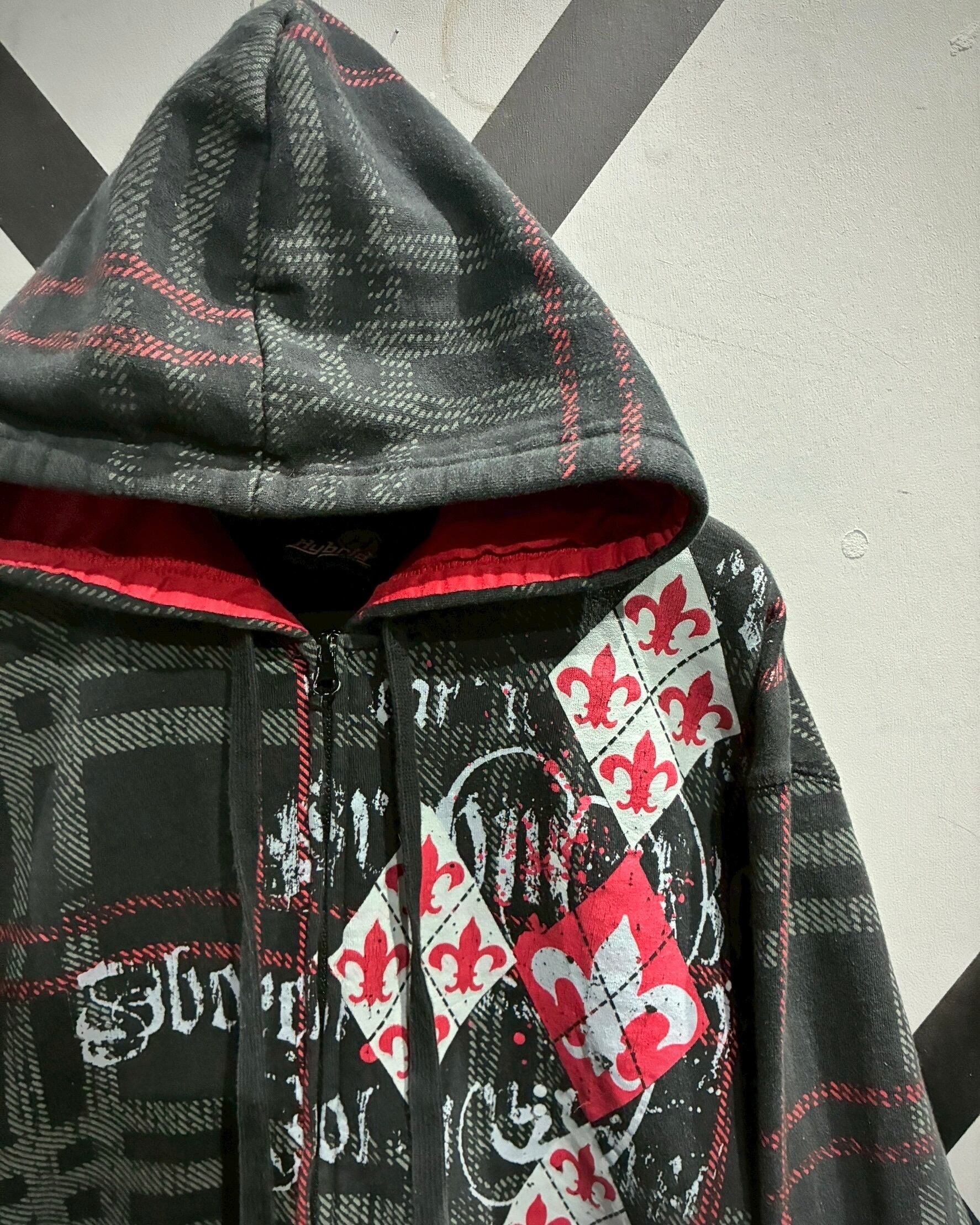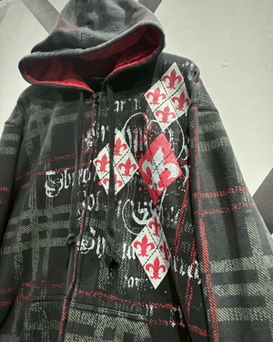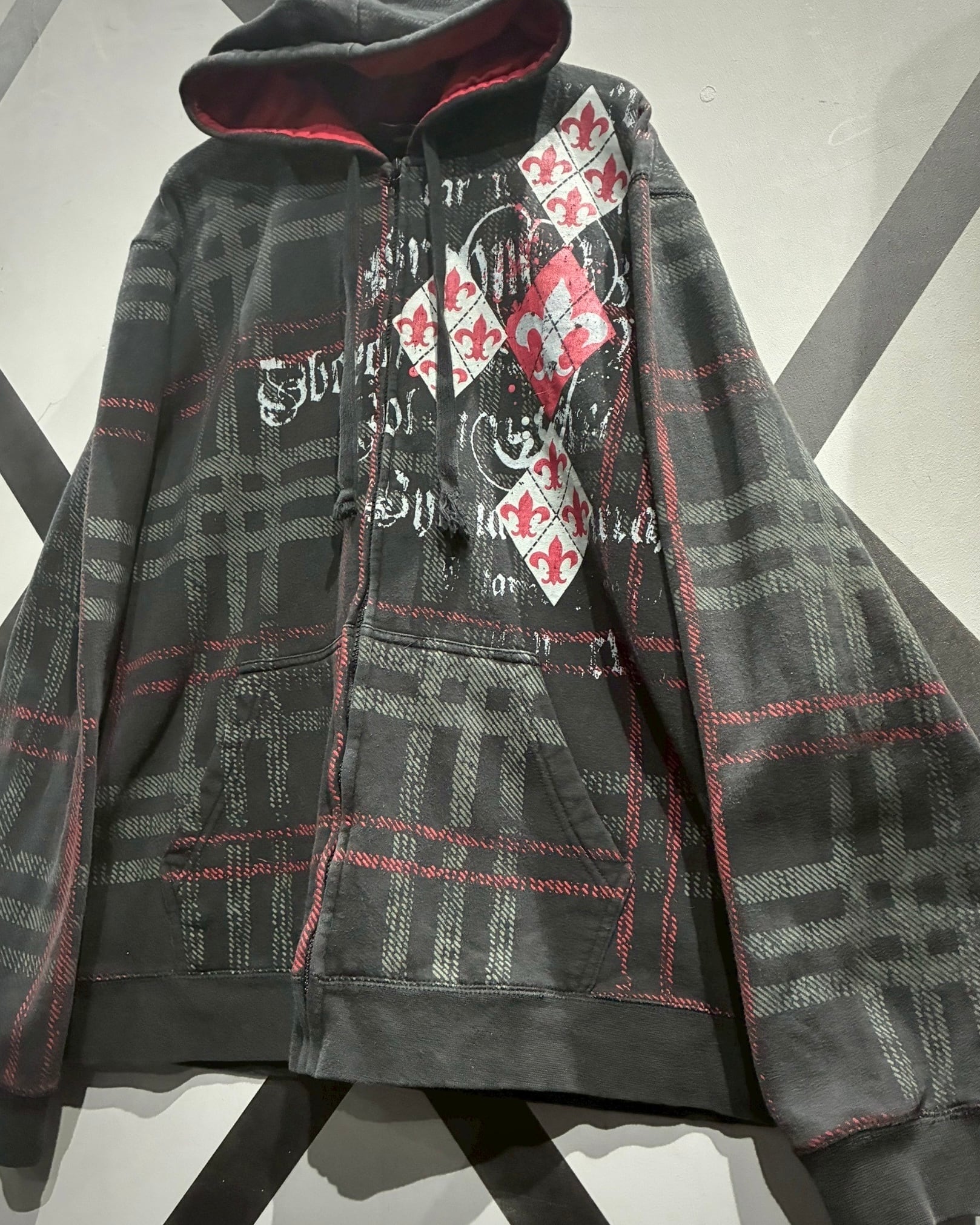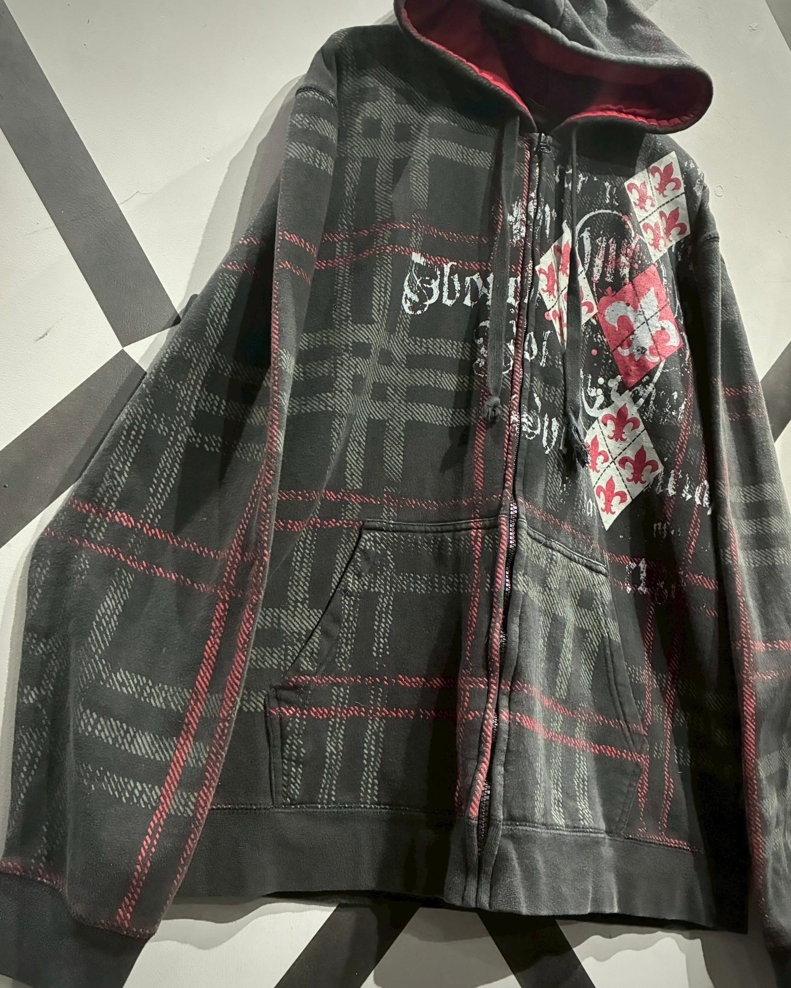 ブラックのスウェット地のボディに、ダークな雰囲気漂うゴシック調のデザインを載せたジップアップフーディー。