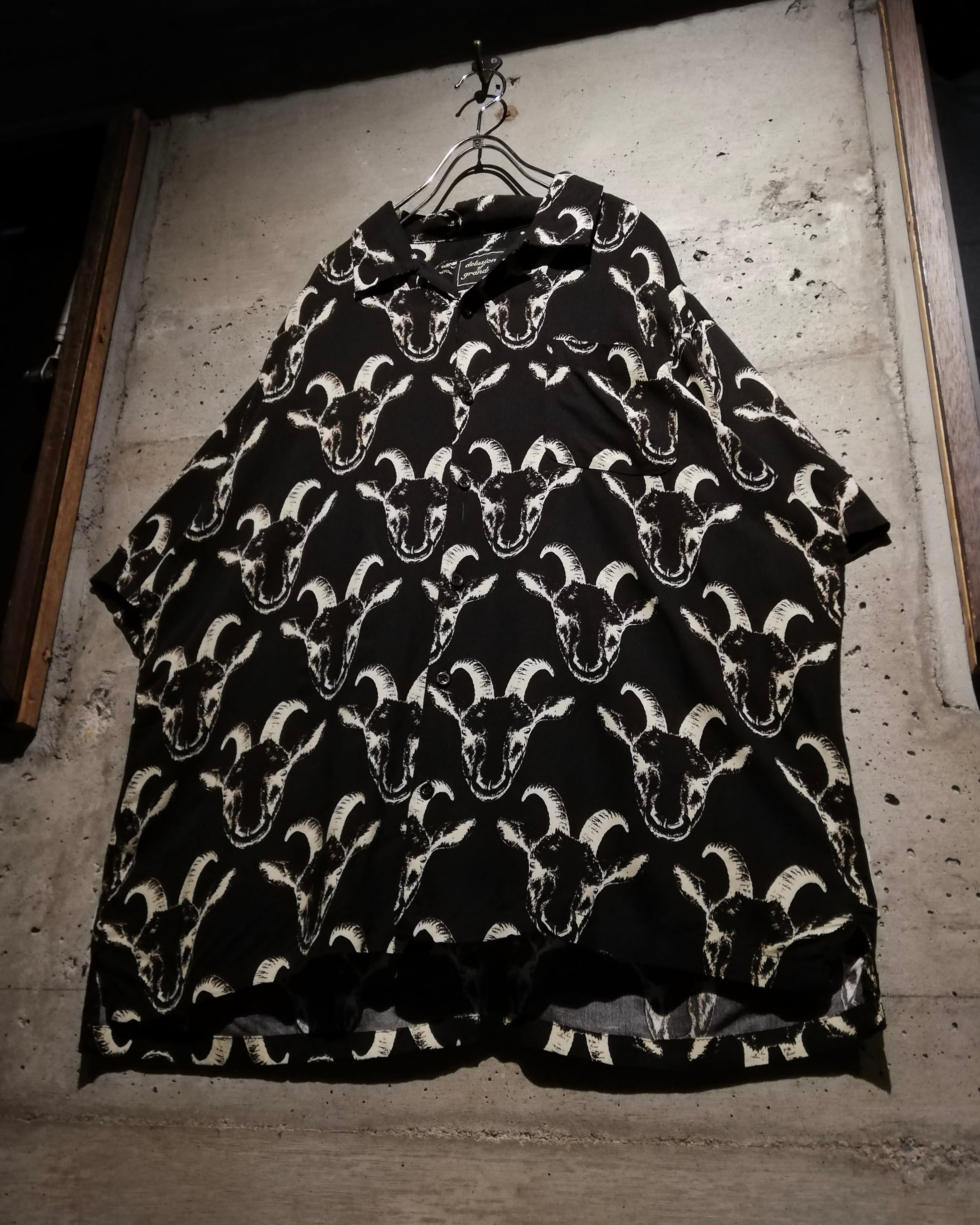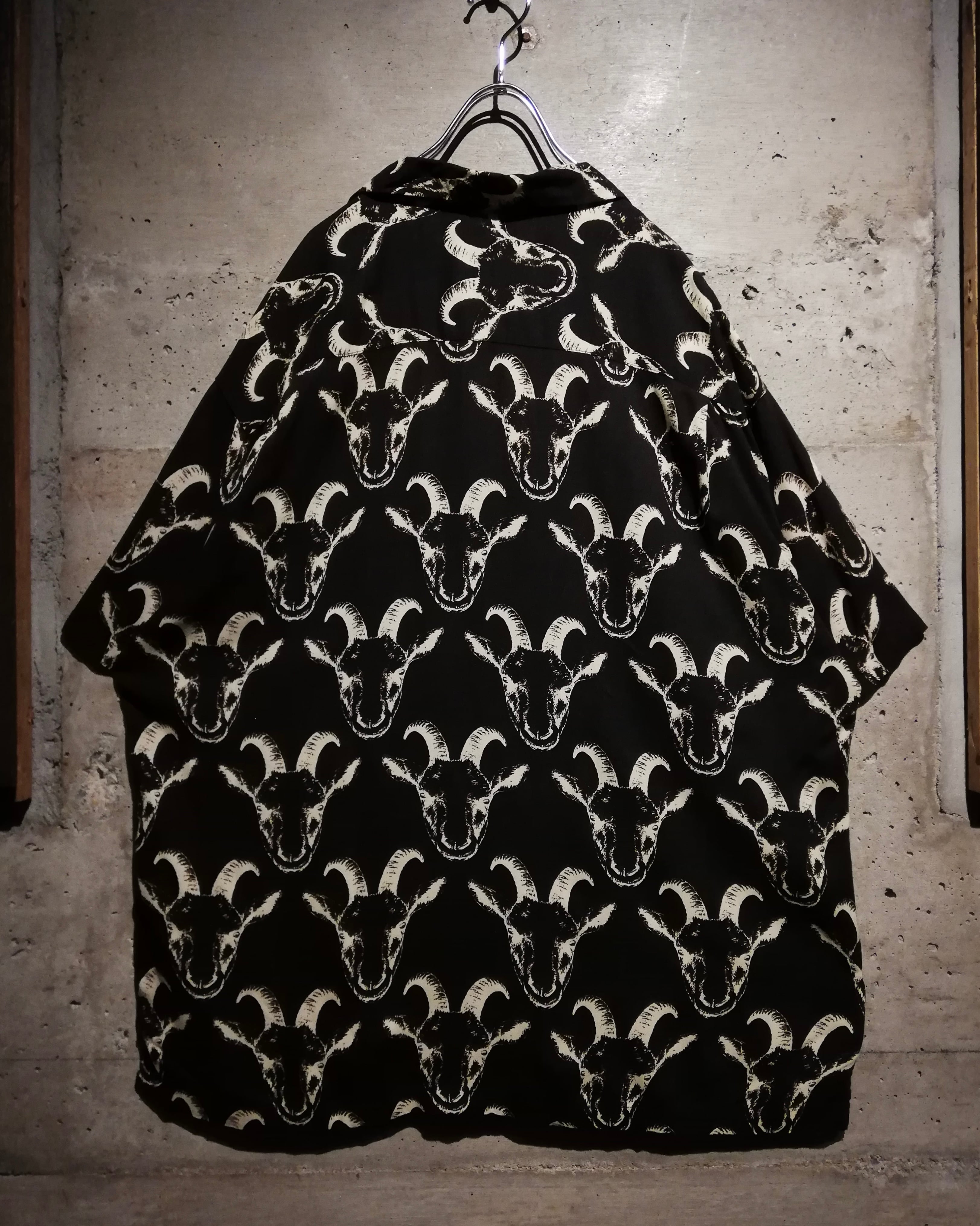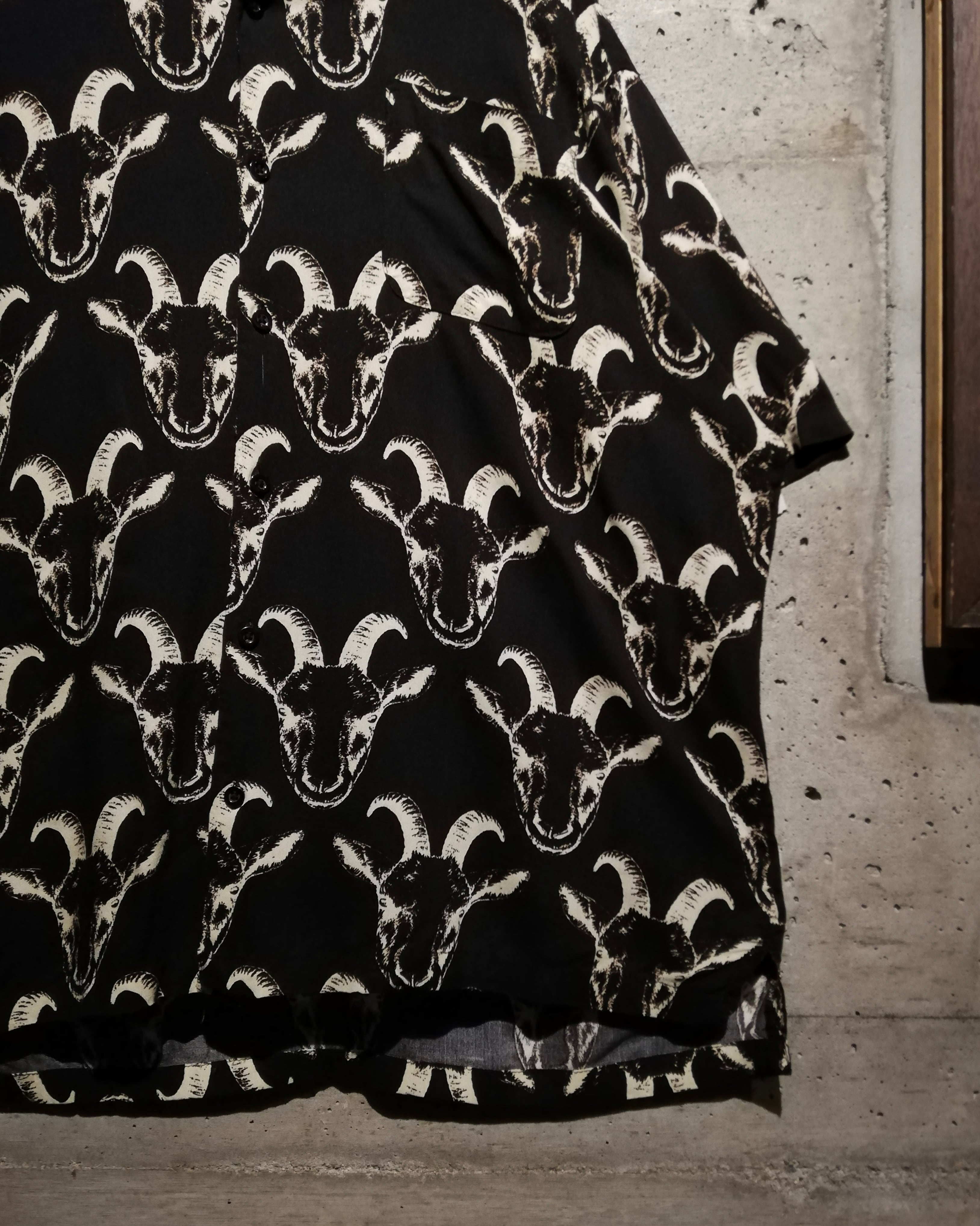 ブラックをベースとしたボディに、山羊の顔を全体に載せた半袖オープンカラーシャツ。
