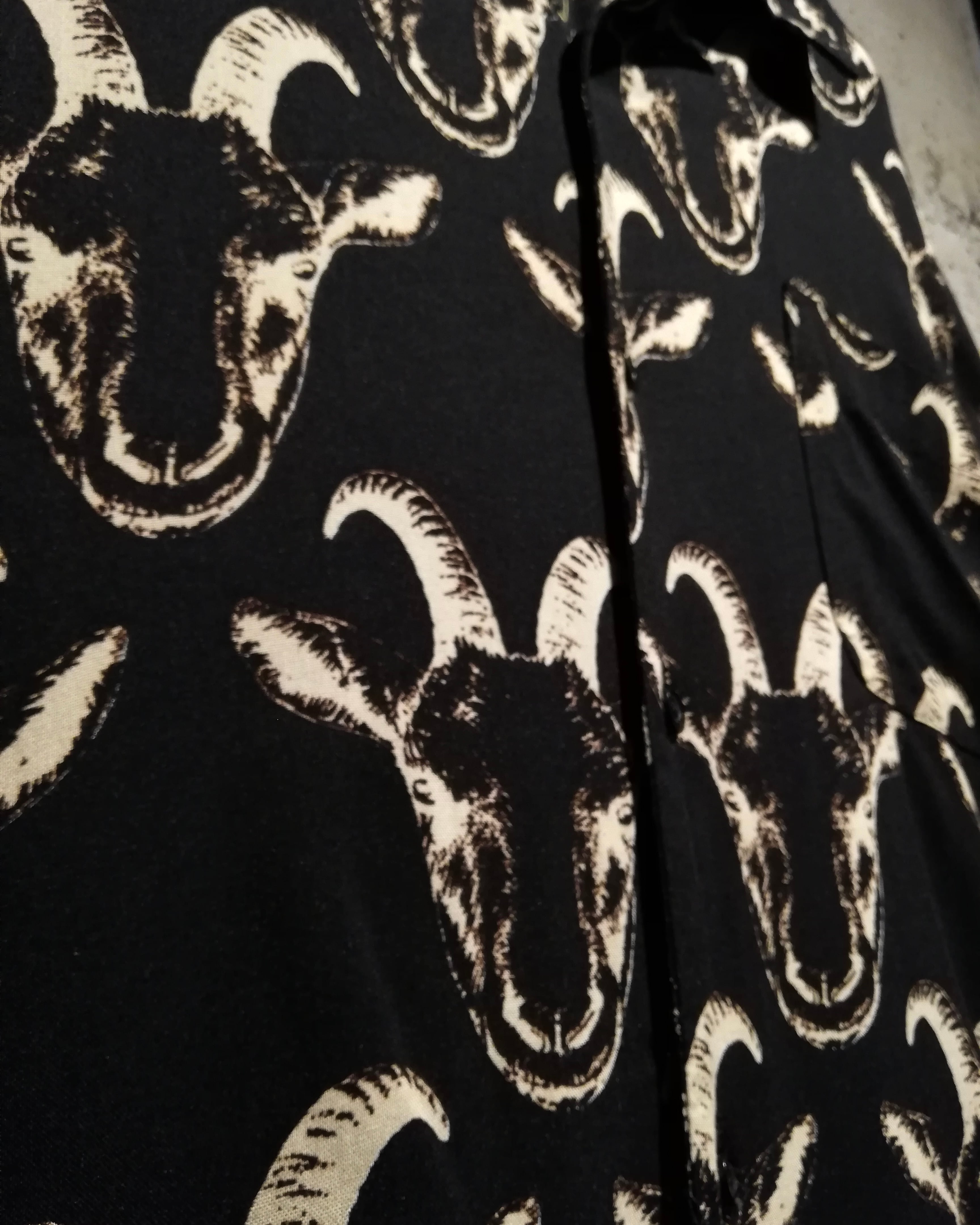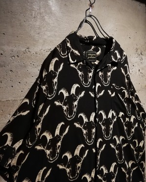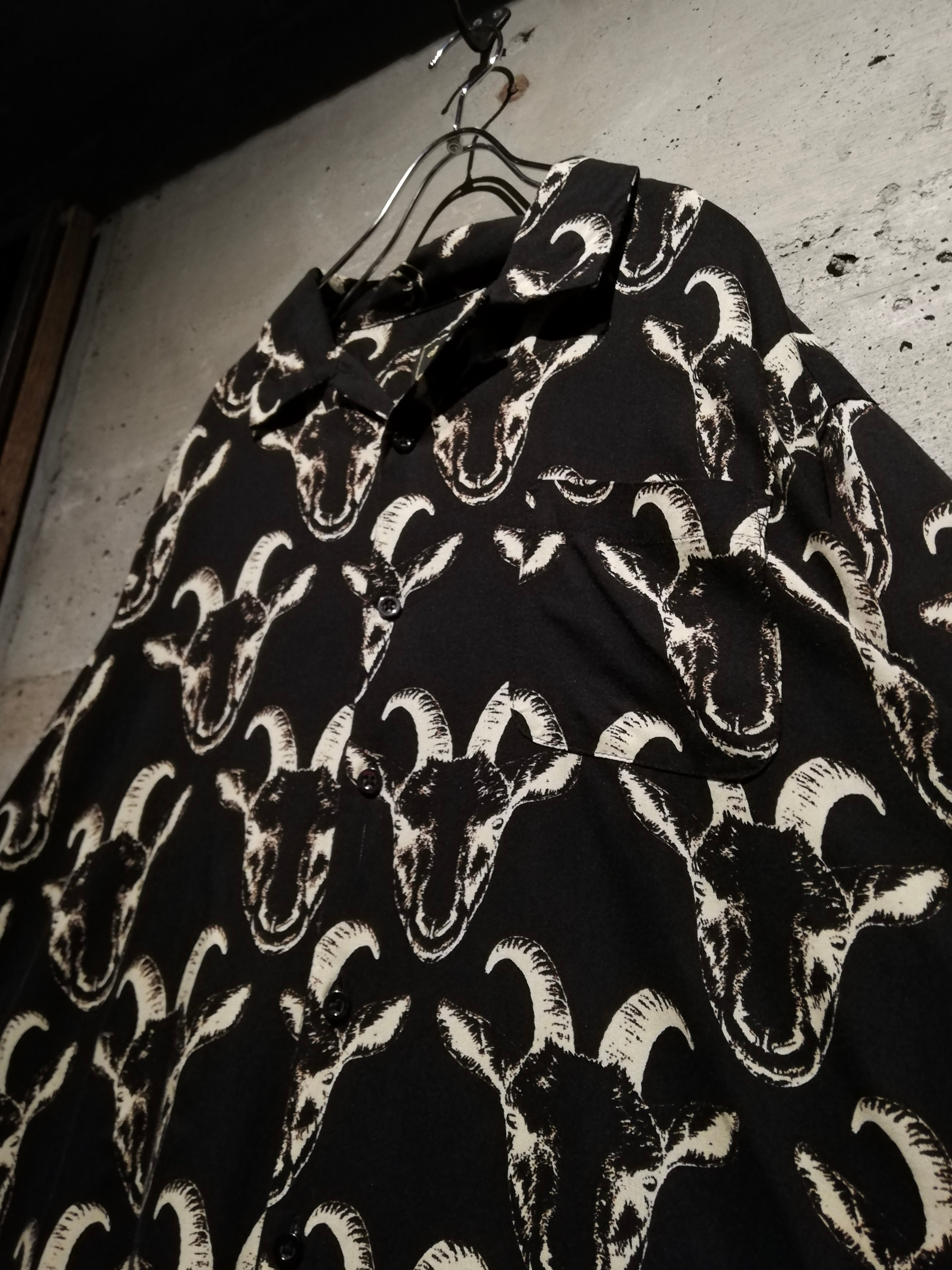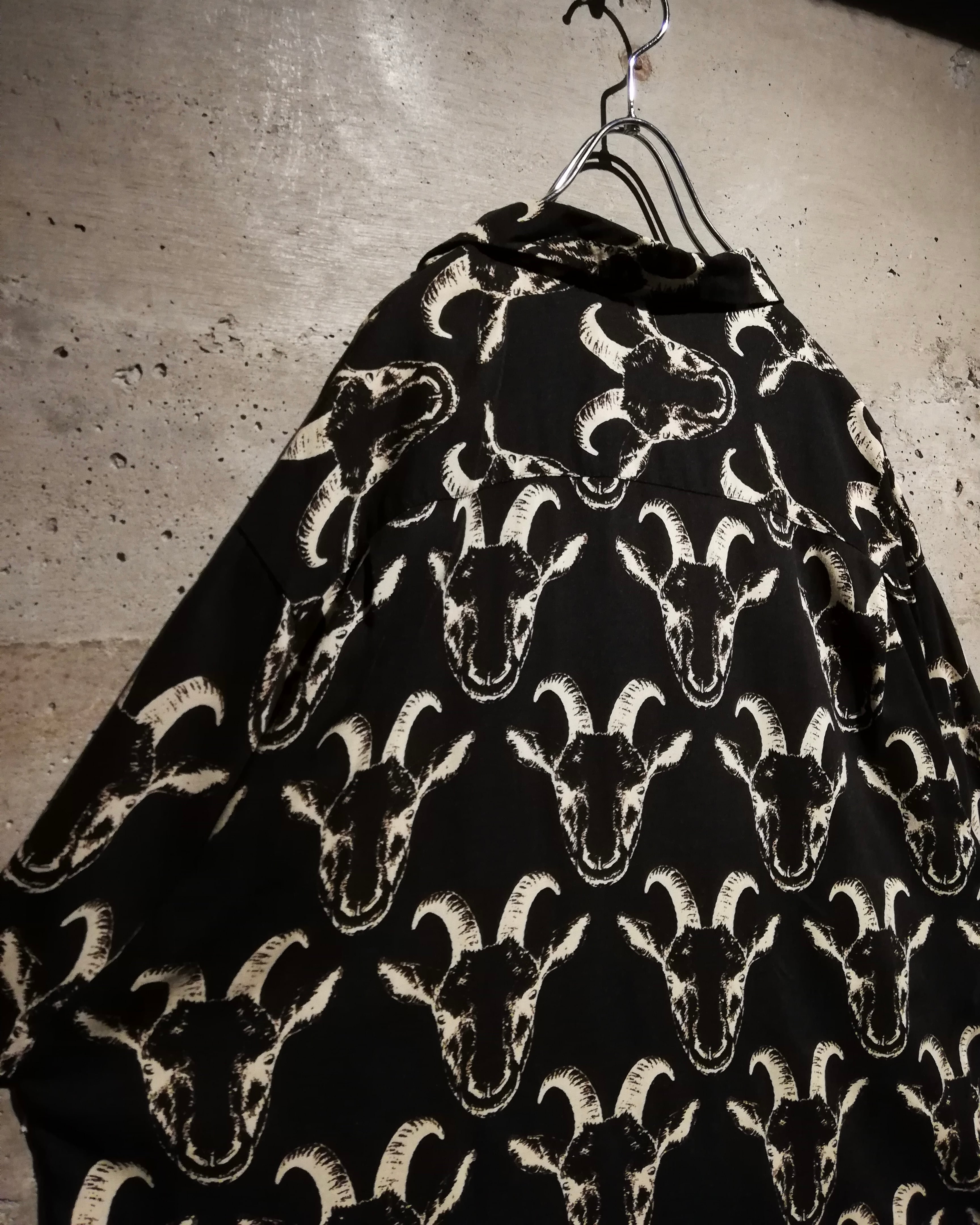 ブラックをベースとしたボディに、山羊の顔を全体に載せた半袖オープンカラーシャツ。