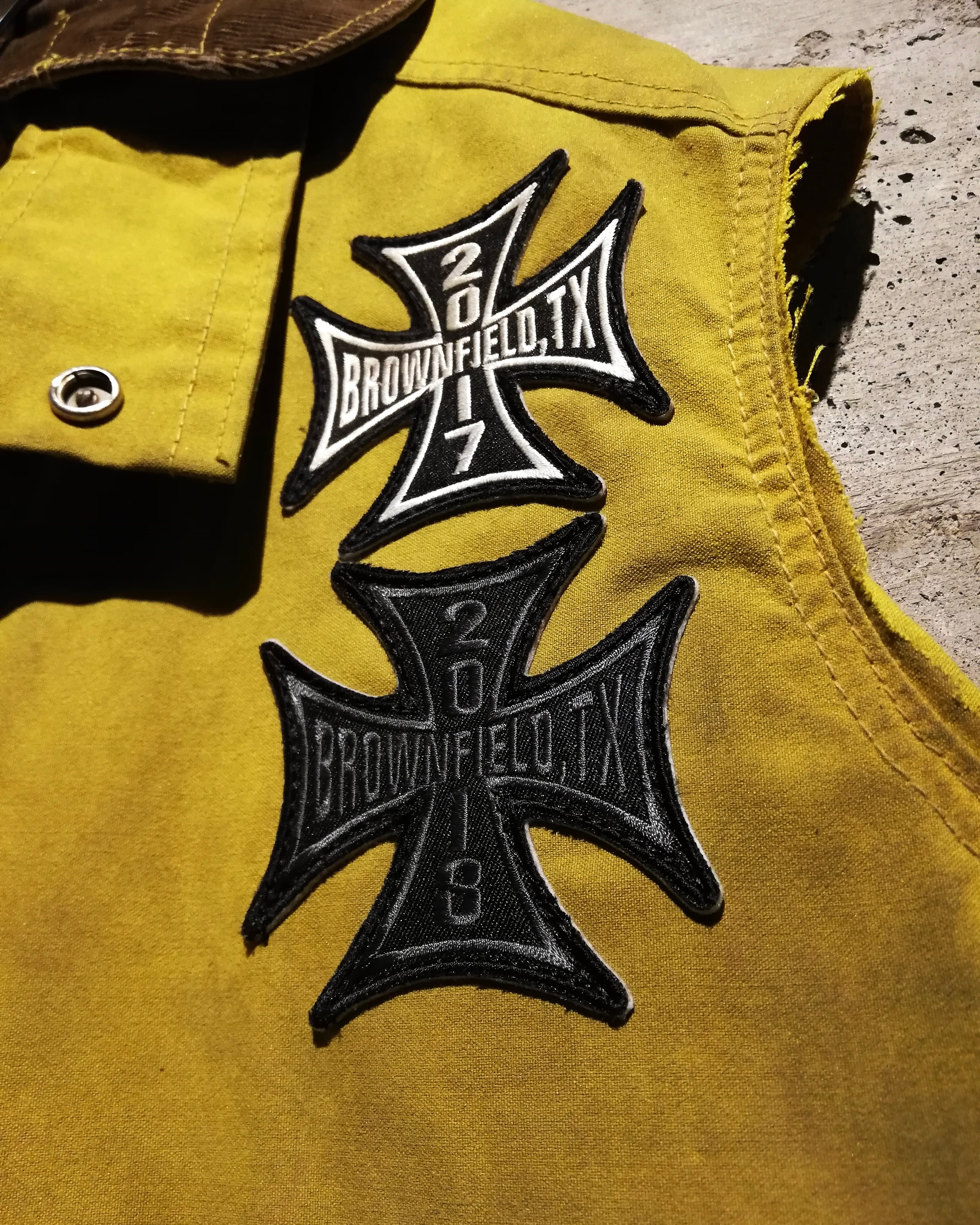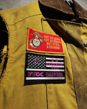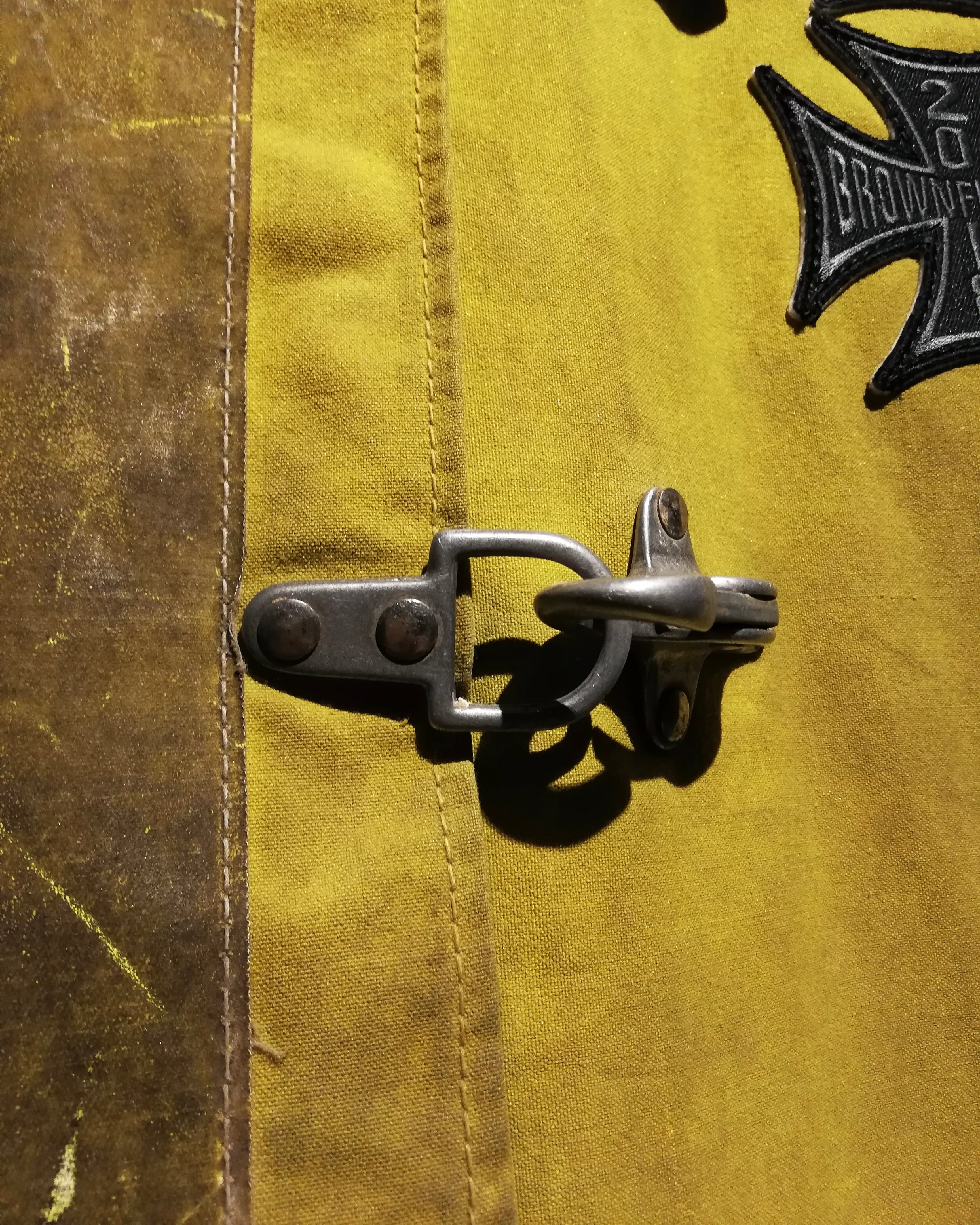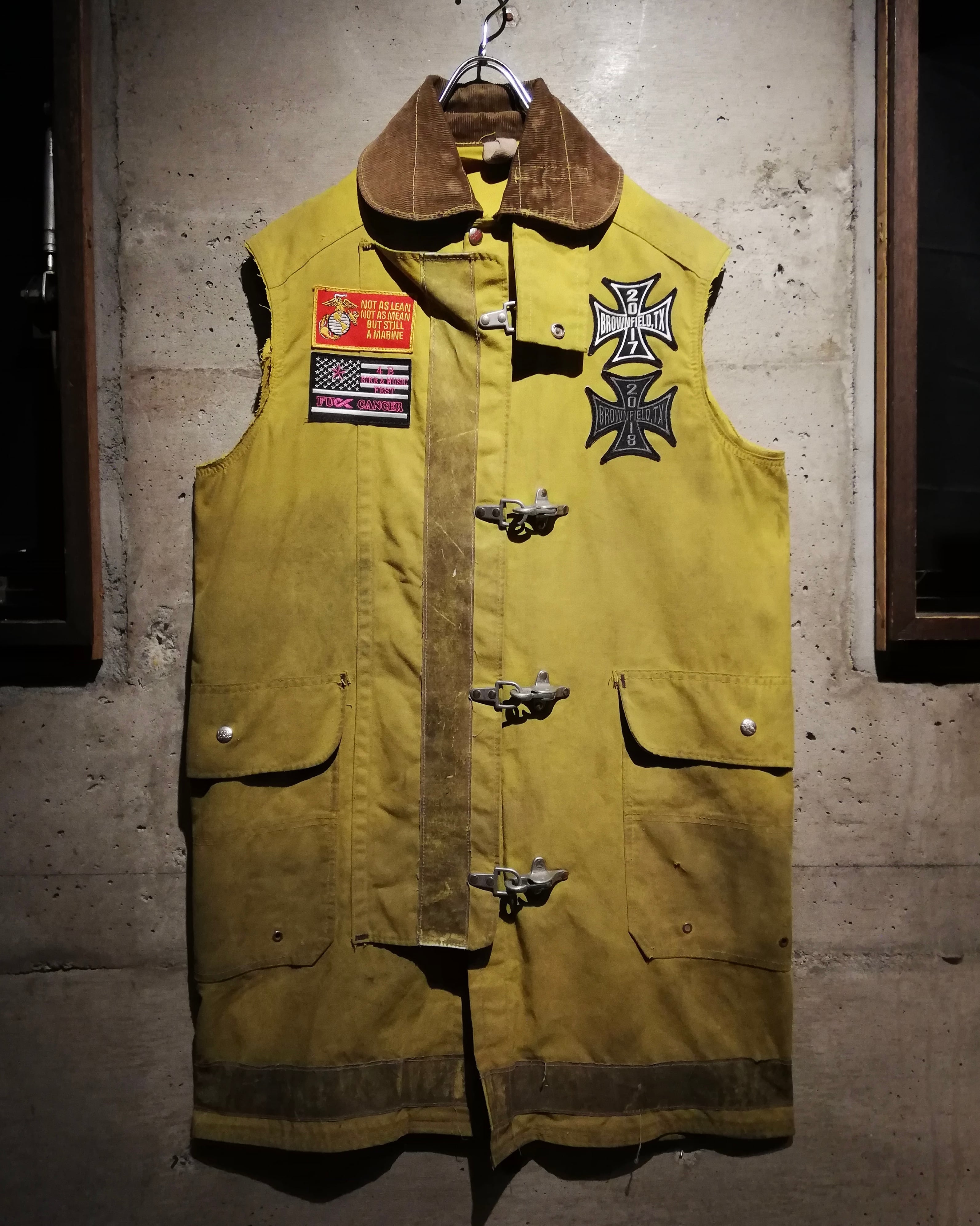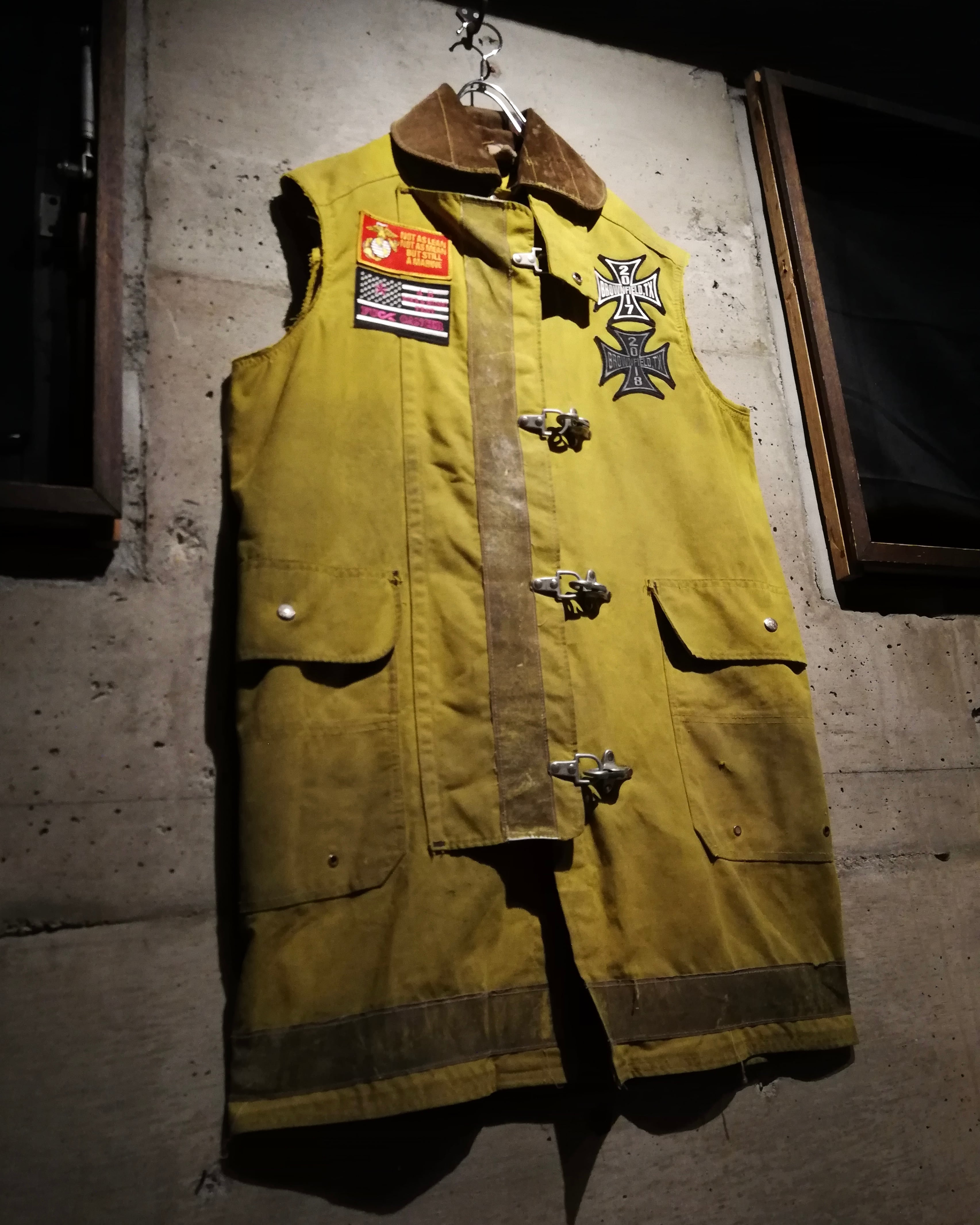 袖をカットオフ、アイアンクロスなどのパッチによるカスタムが施された、マスタードカラーのファイヤーマンジャケット。