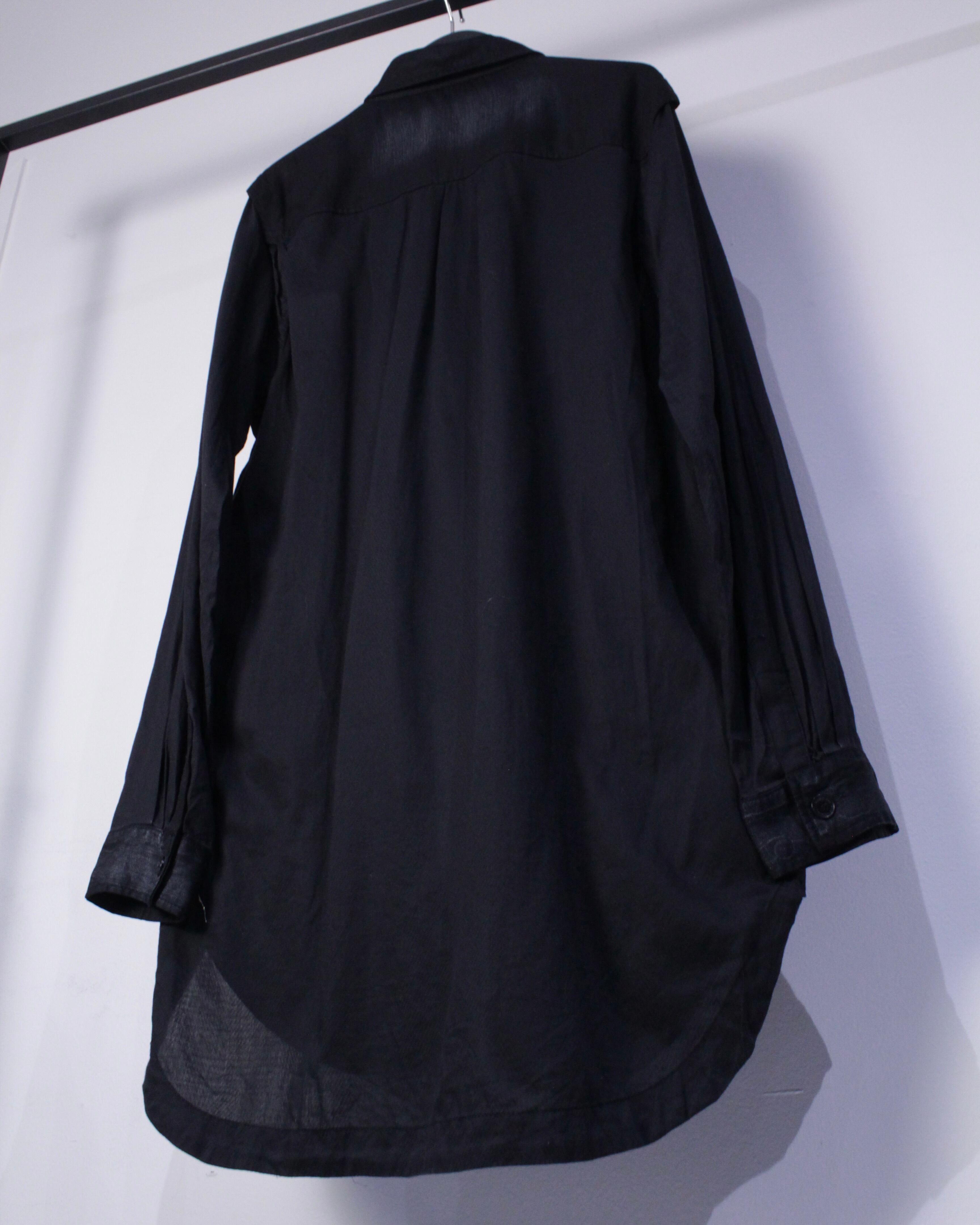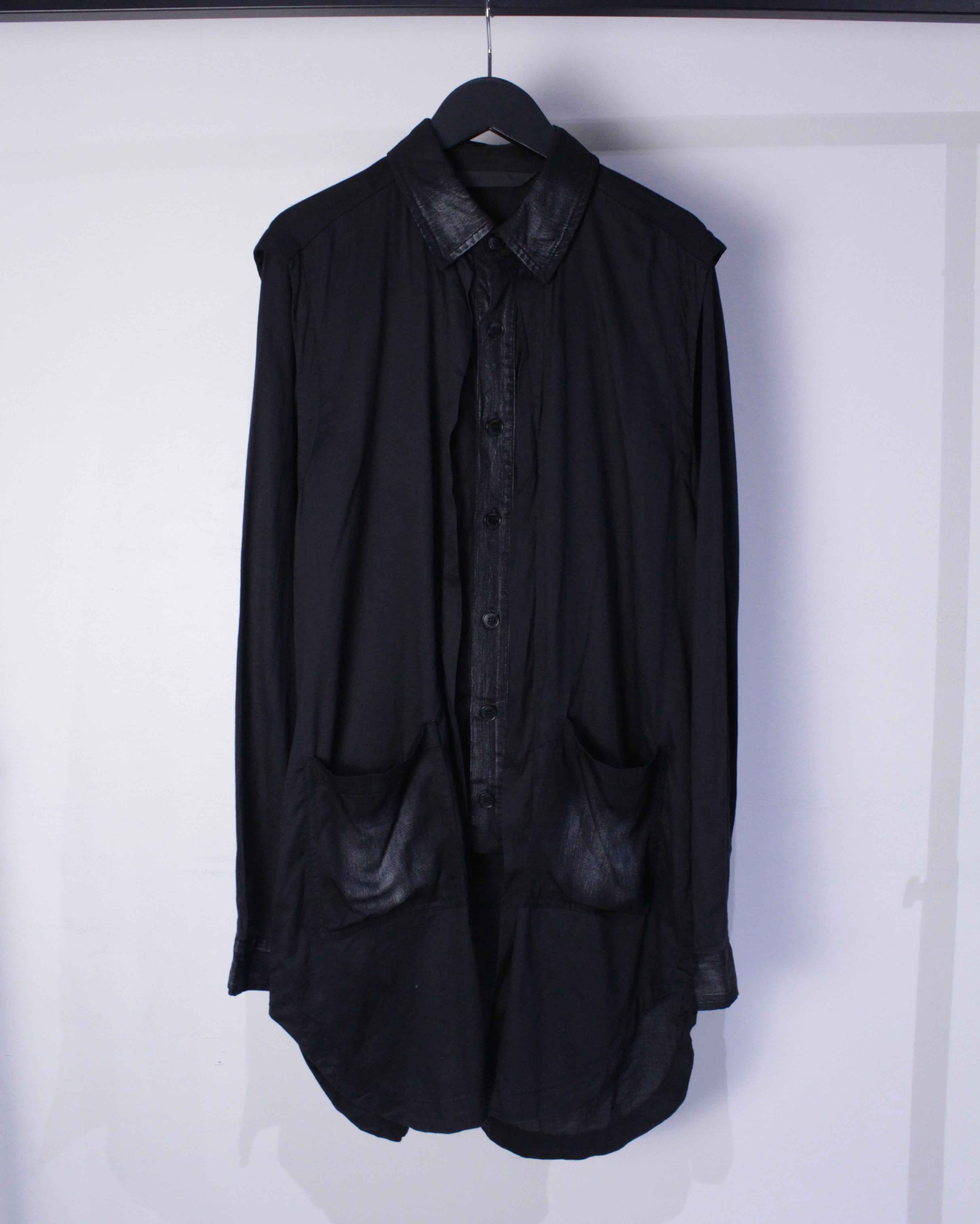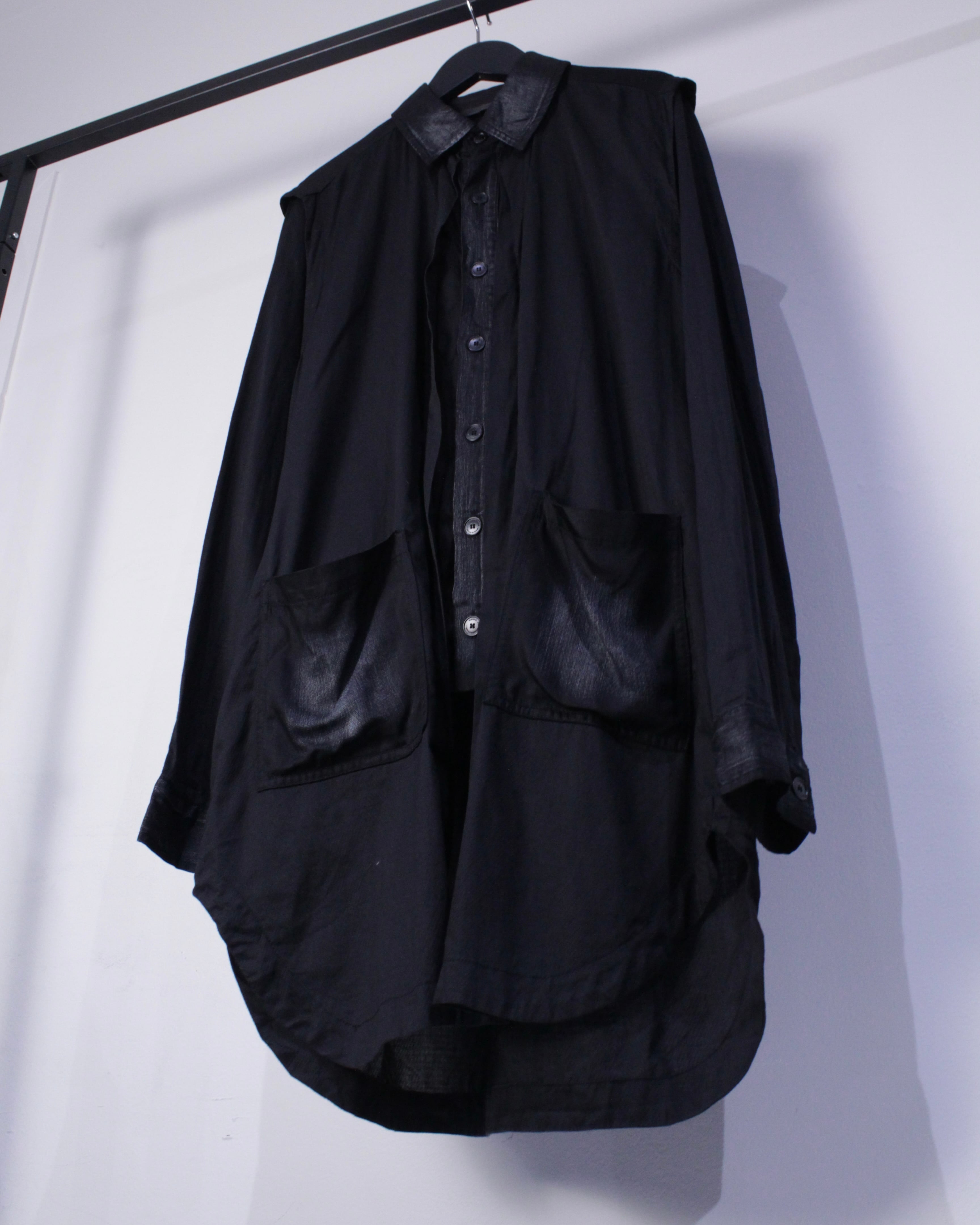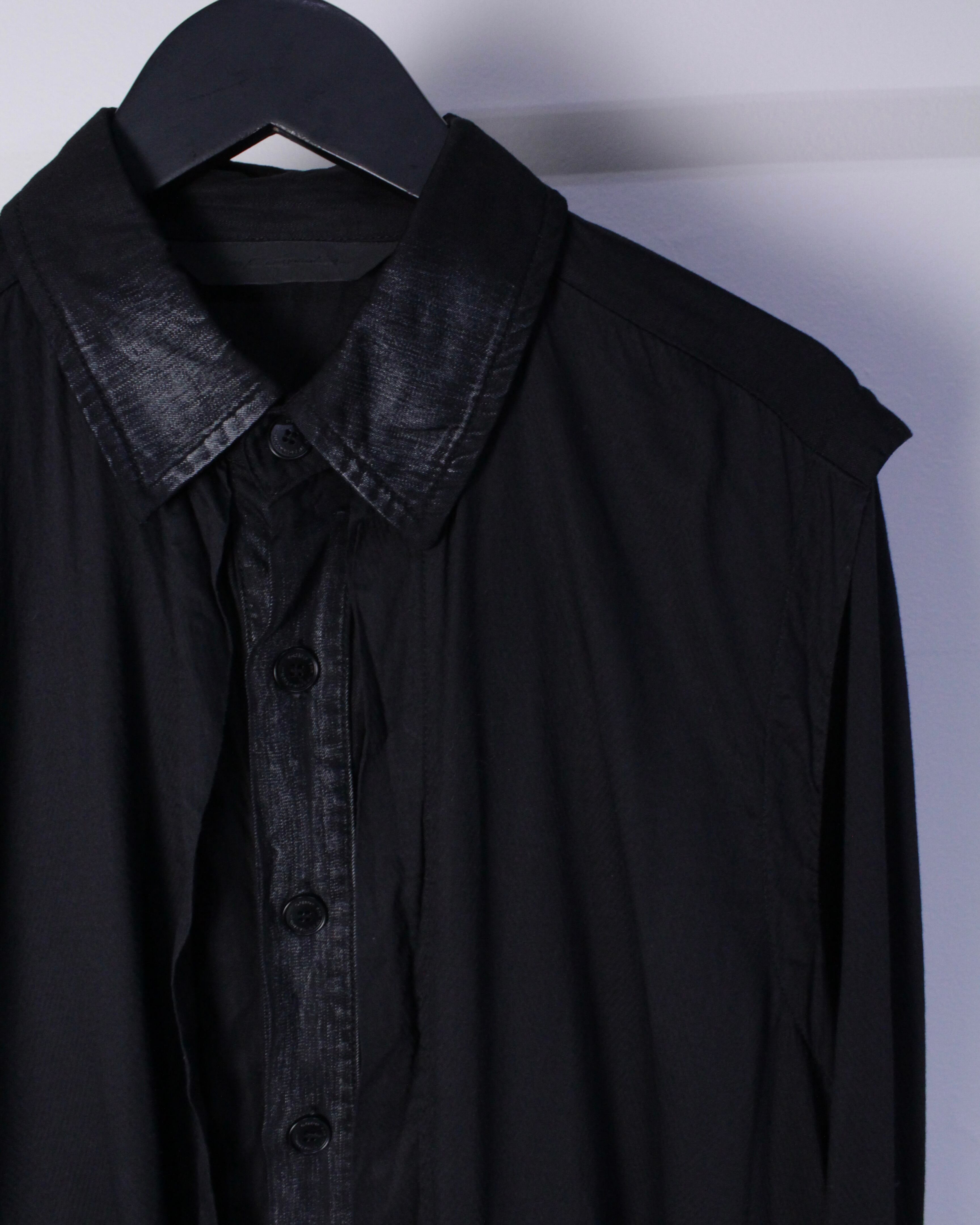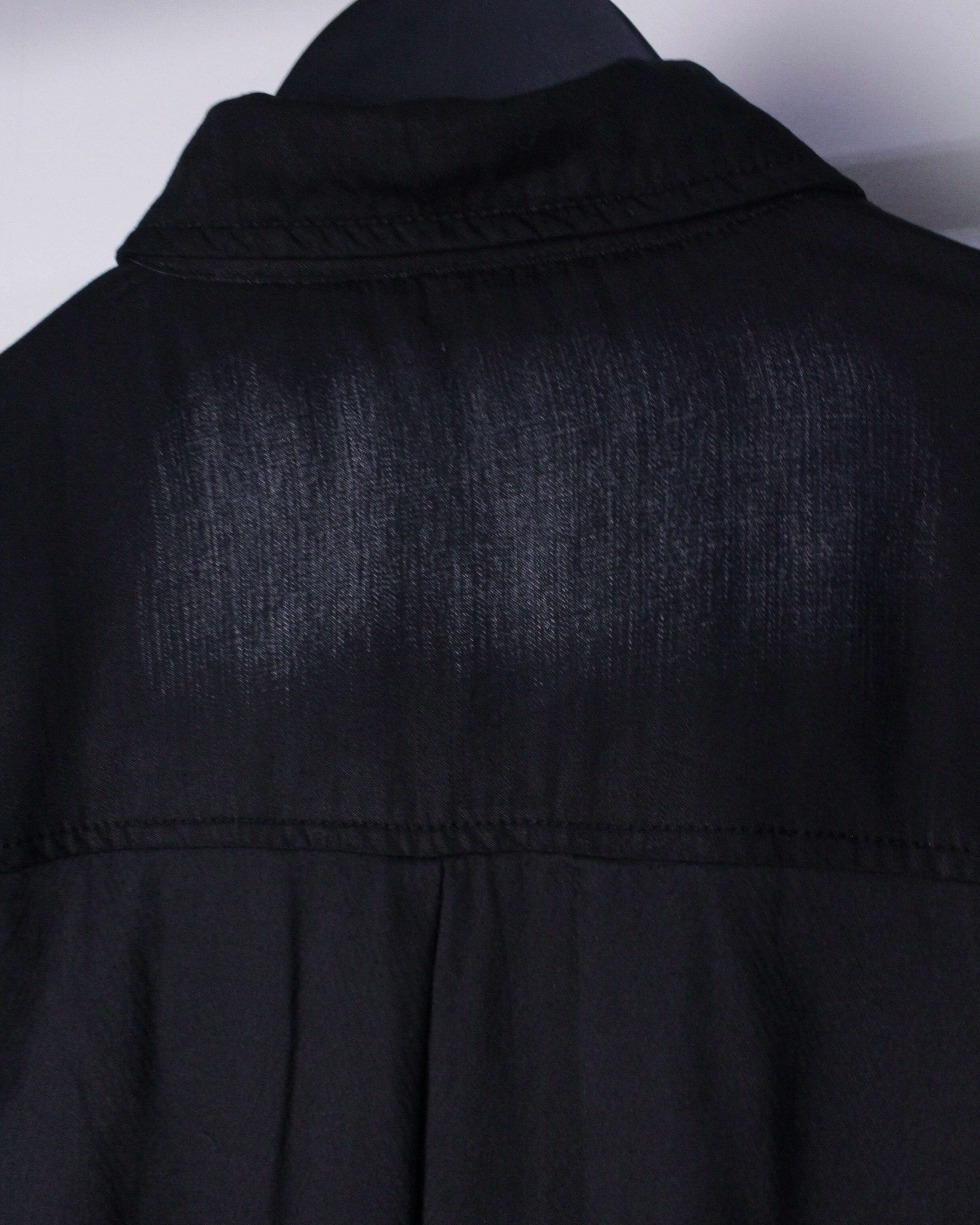 オールブラックのカラーリングにレイヤード風の独特なデザインがモードな雰囲気を演出。襟や前立て、ポケットにはアタリ風の加工が施されており、洗練されたデザインの中に非常に良いアクセントをプラスしています。