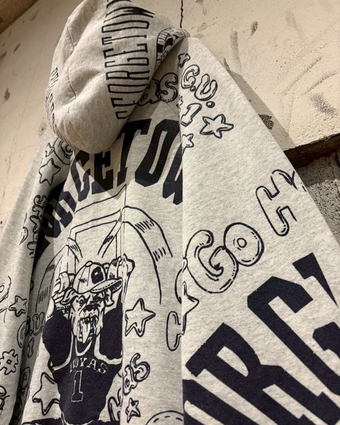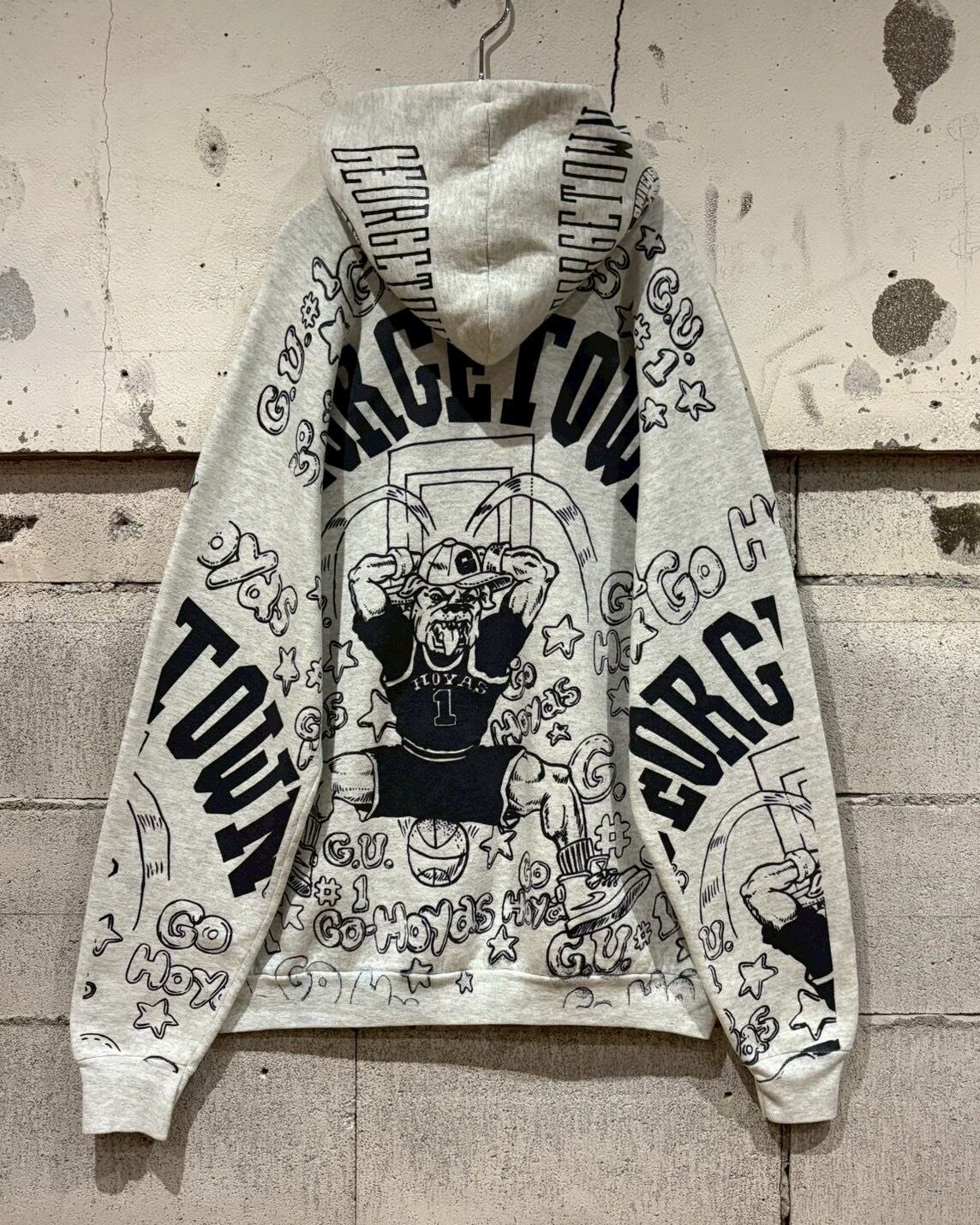グレーのボディを埋め尽くすように全体にポップなプリントが施された"GEORGETOWN HOYAS"の90'sカレッジフーディ。