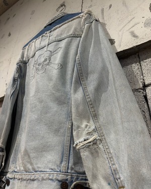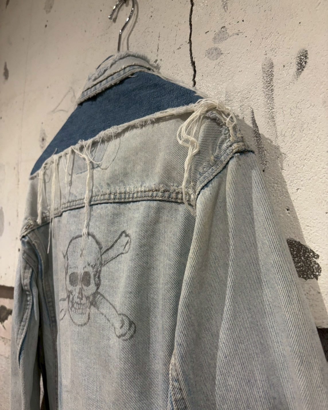 背面にはスカル、左肩には花と、前所有者によって描かれたハンドペイントが加わり、抜群の存在感を演出。美しいフェードの効いたアイスウォッシュのボディとボロ感とも相まって、抜群の存在感を見せています。