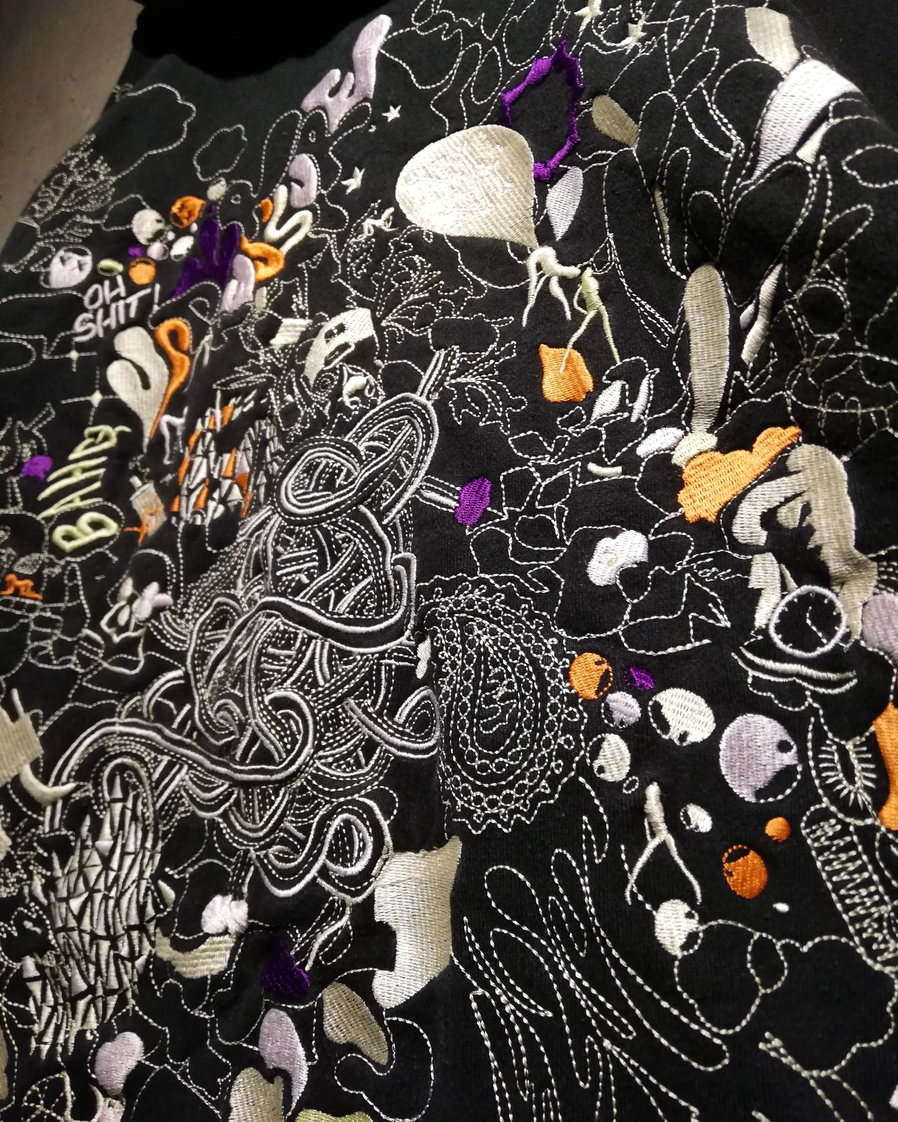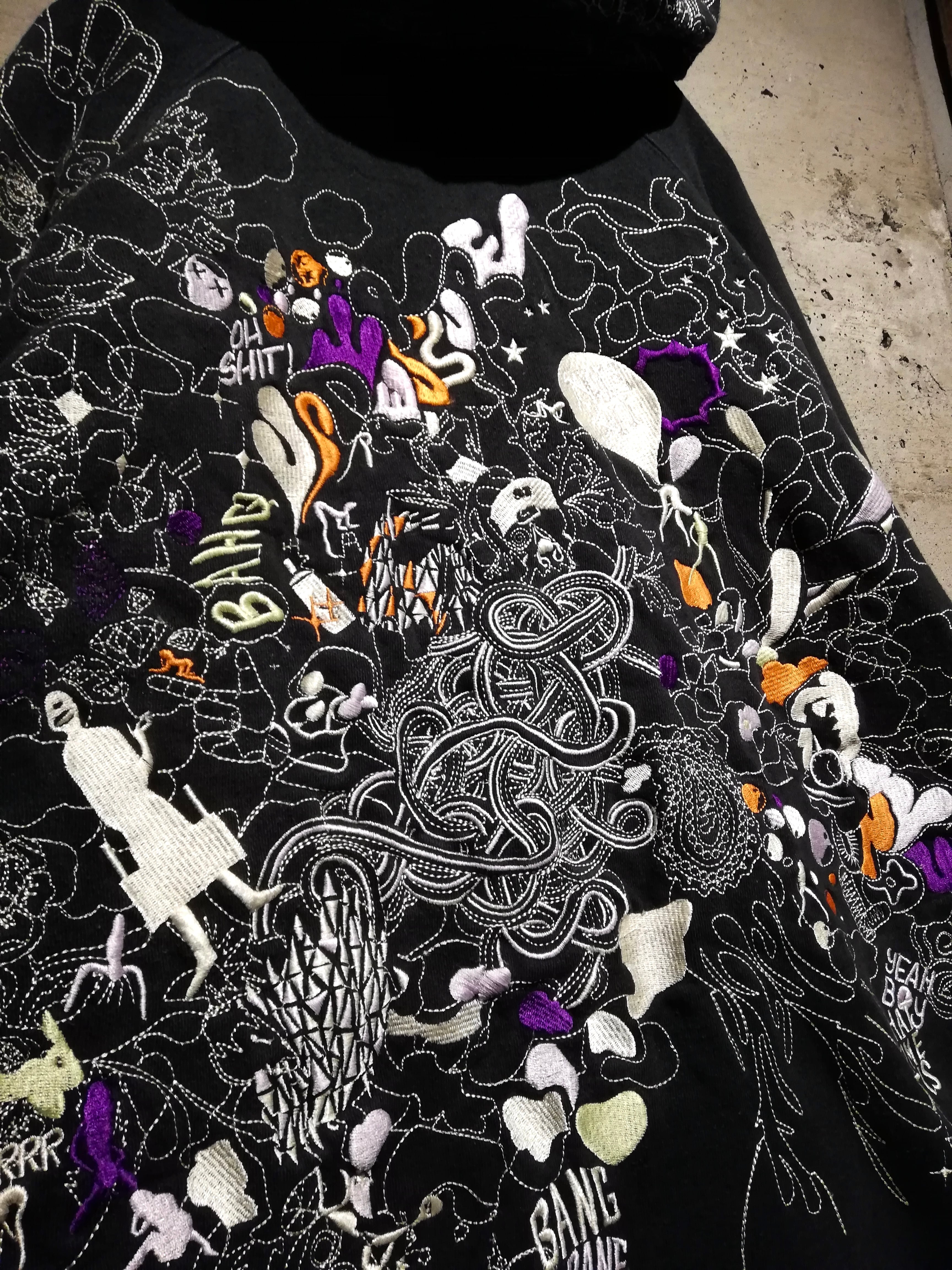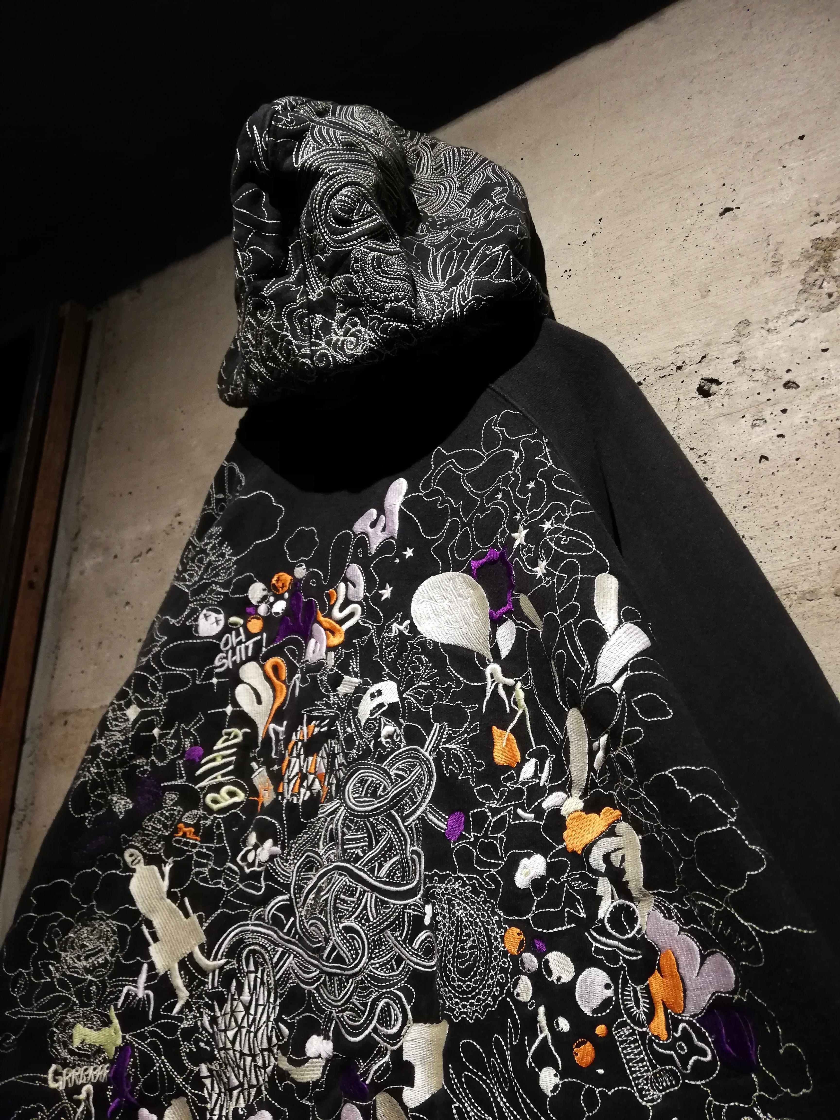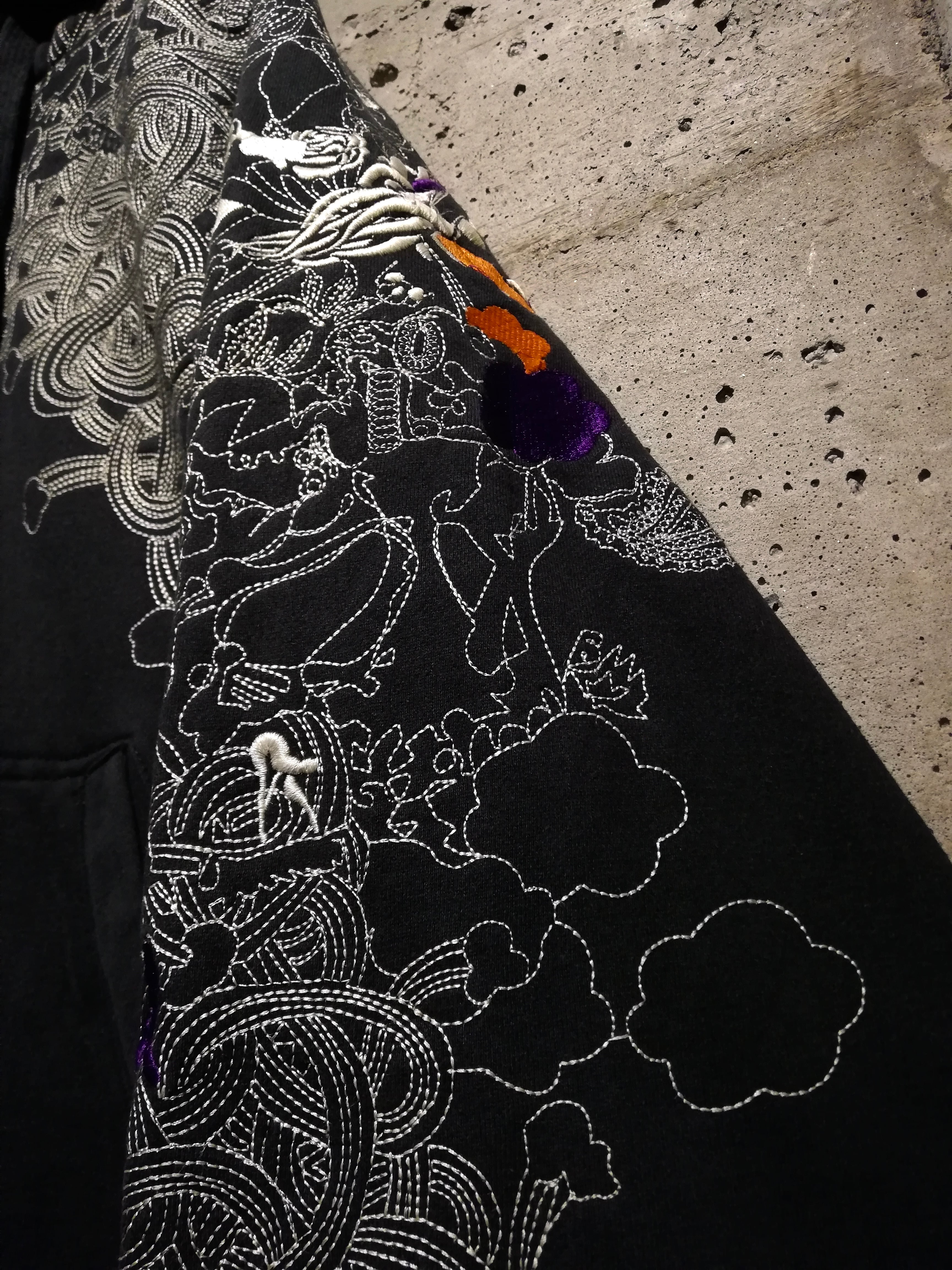 左肩からアーム、背面、そしてフード全体に繊細かつ緻密に刻まれた刺繍はもはやアート。デザイン一つ一つを見ても非常にクオリティが高く、芸の細やかさに圧倒されてしまいます。モノトーンに紫、オレンジ、黄緑の差し色も◎