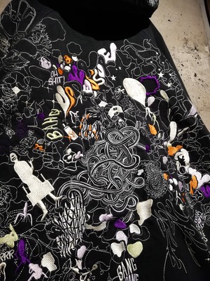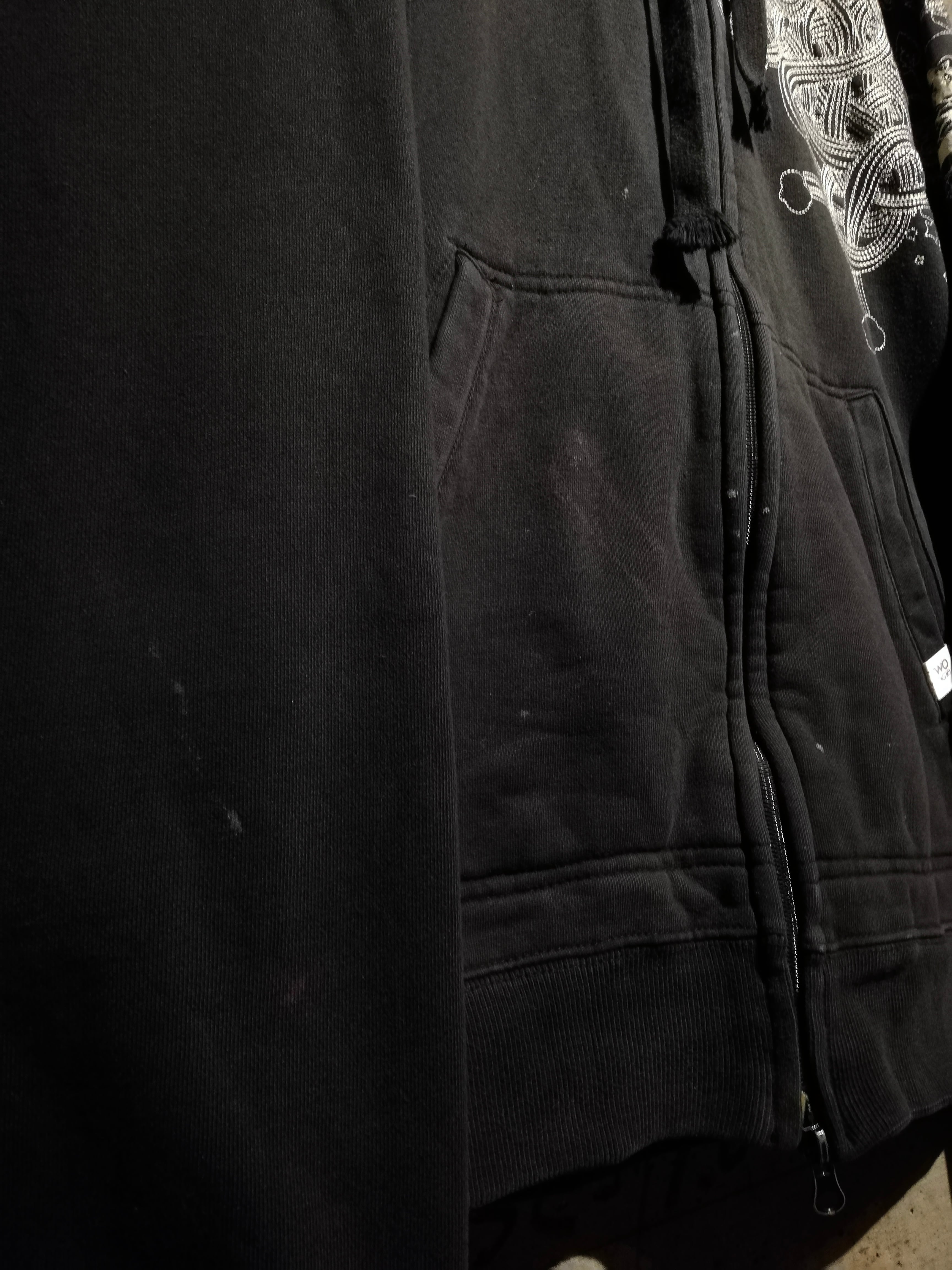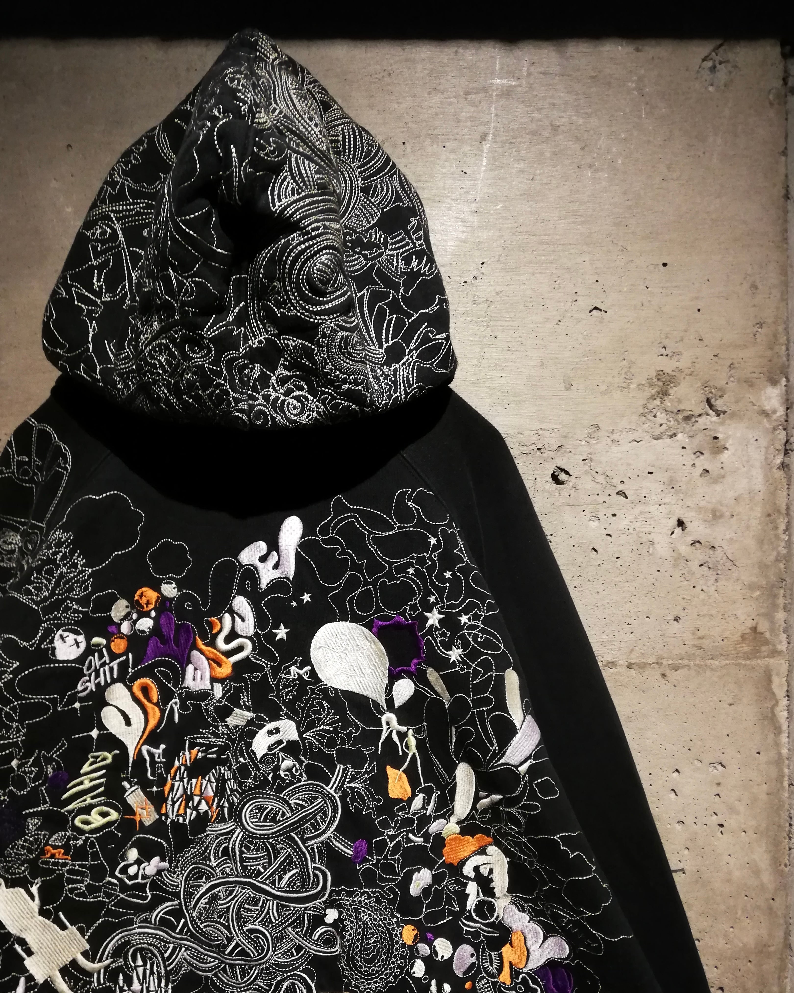 フェード感の良いブラックのボディに、刺繍をびっちりと刻み込んだ、ストリート感がムンムンに漂うジップアップフーディ。