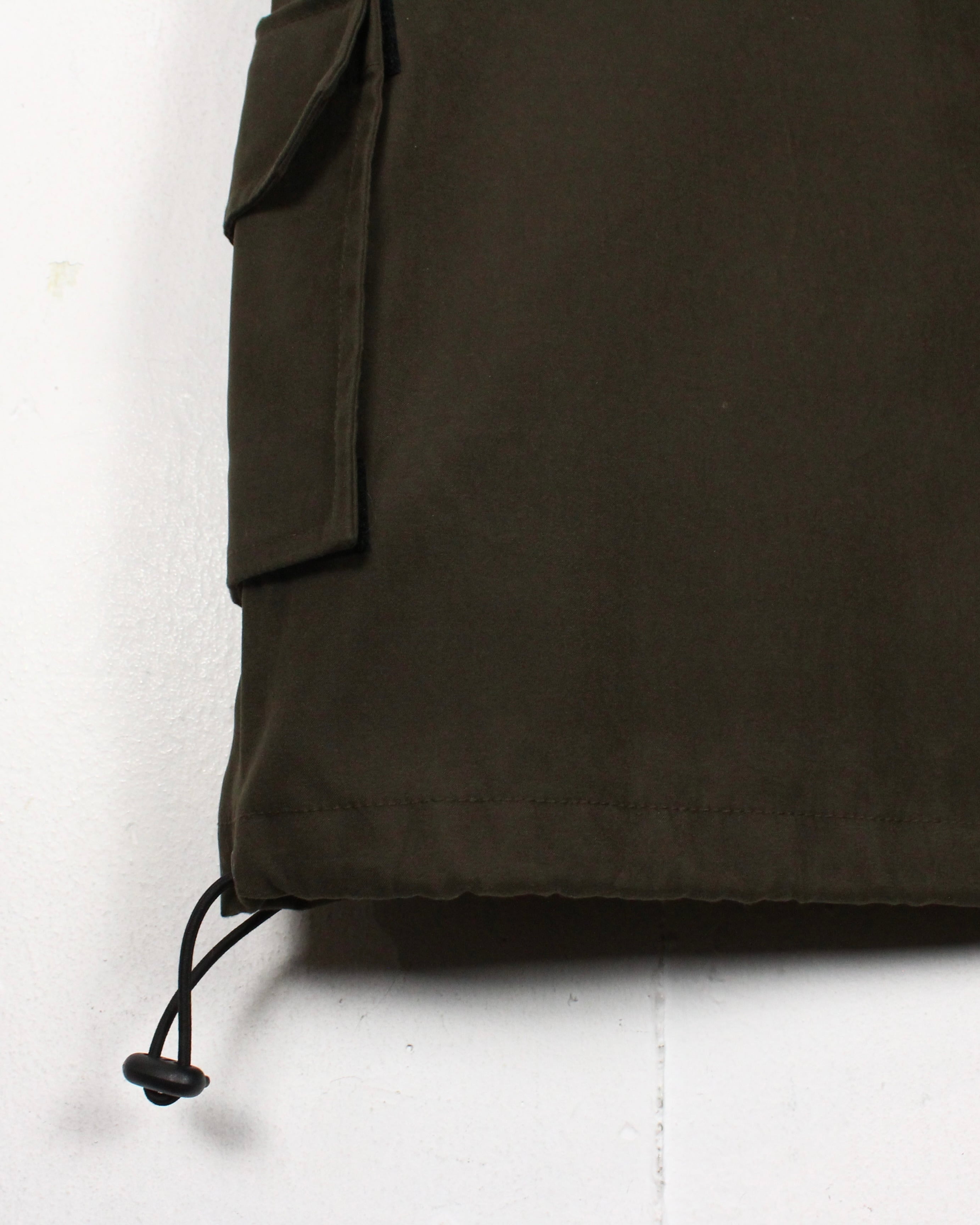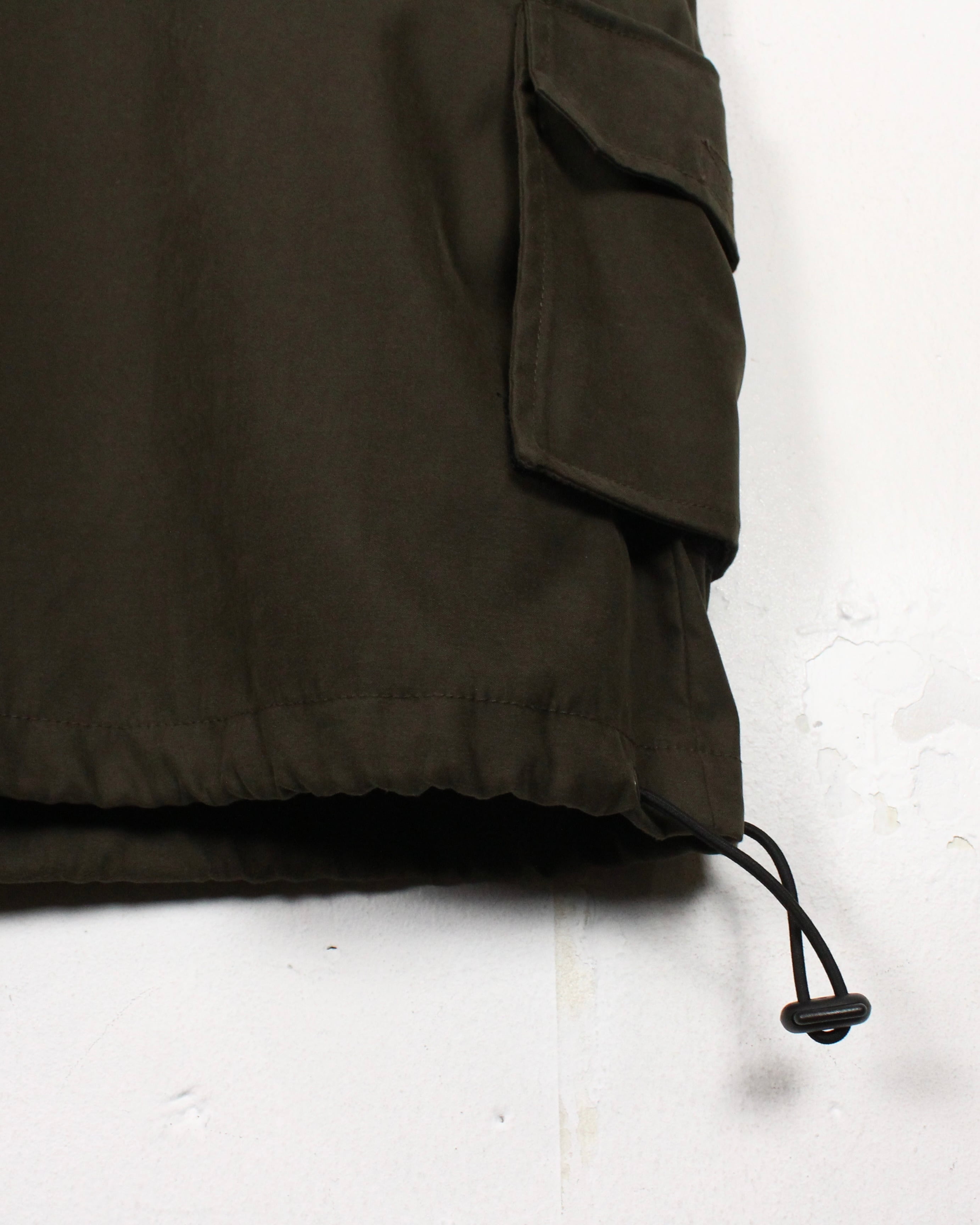 フロントはジップアップ、身幅、アームホールを広く採り、様々なレイヤードスタイルにも柔軟に対応。裾にはドローストリングが付属し、絞りを効かせる事でシルエットにアレンジを加えた着こなしも可能に。