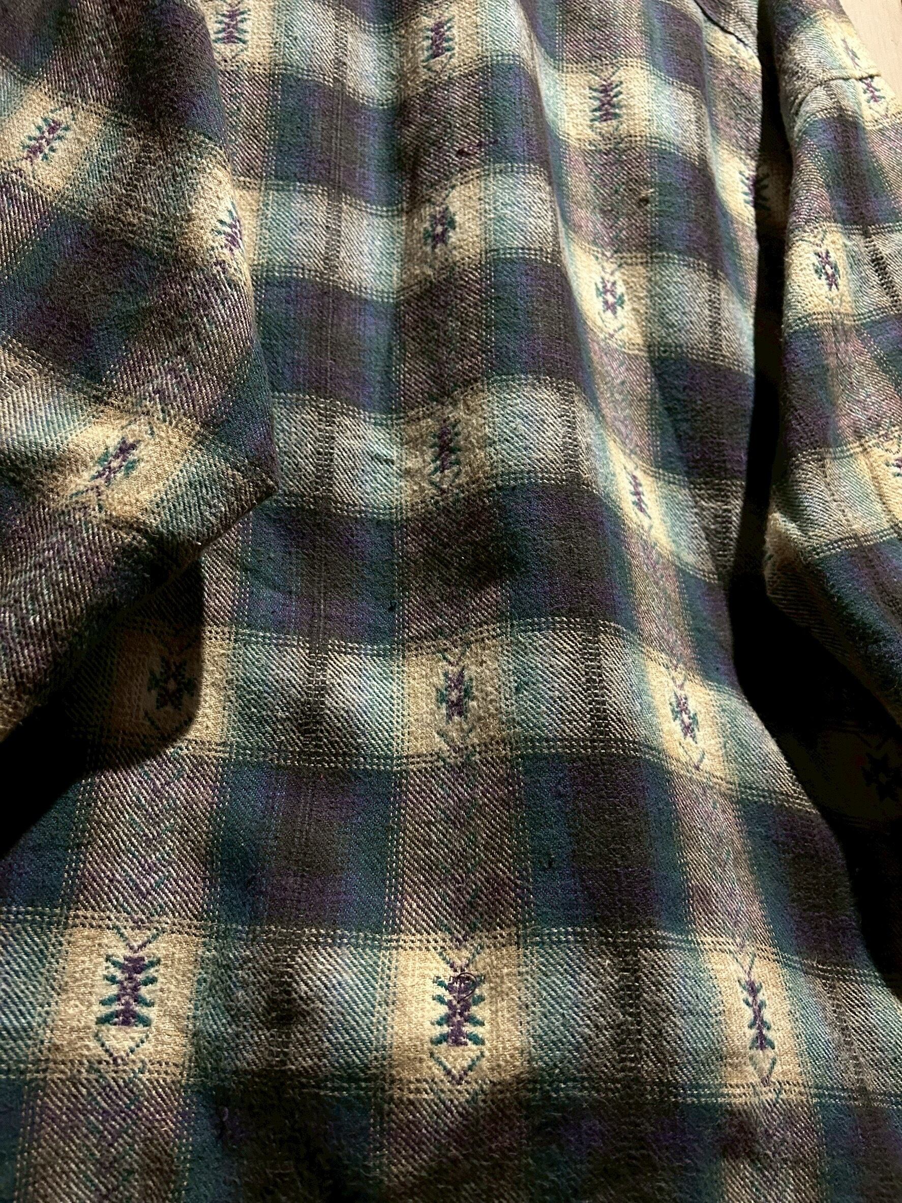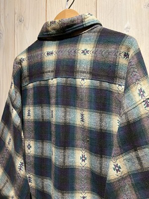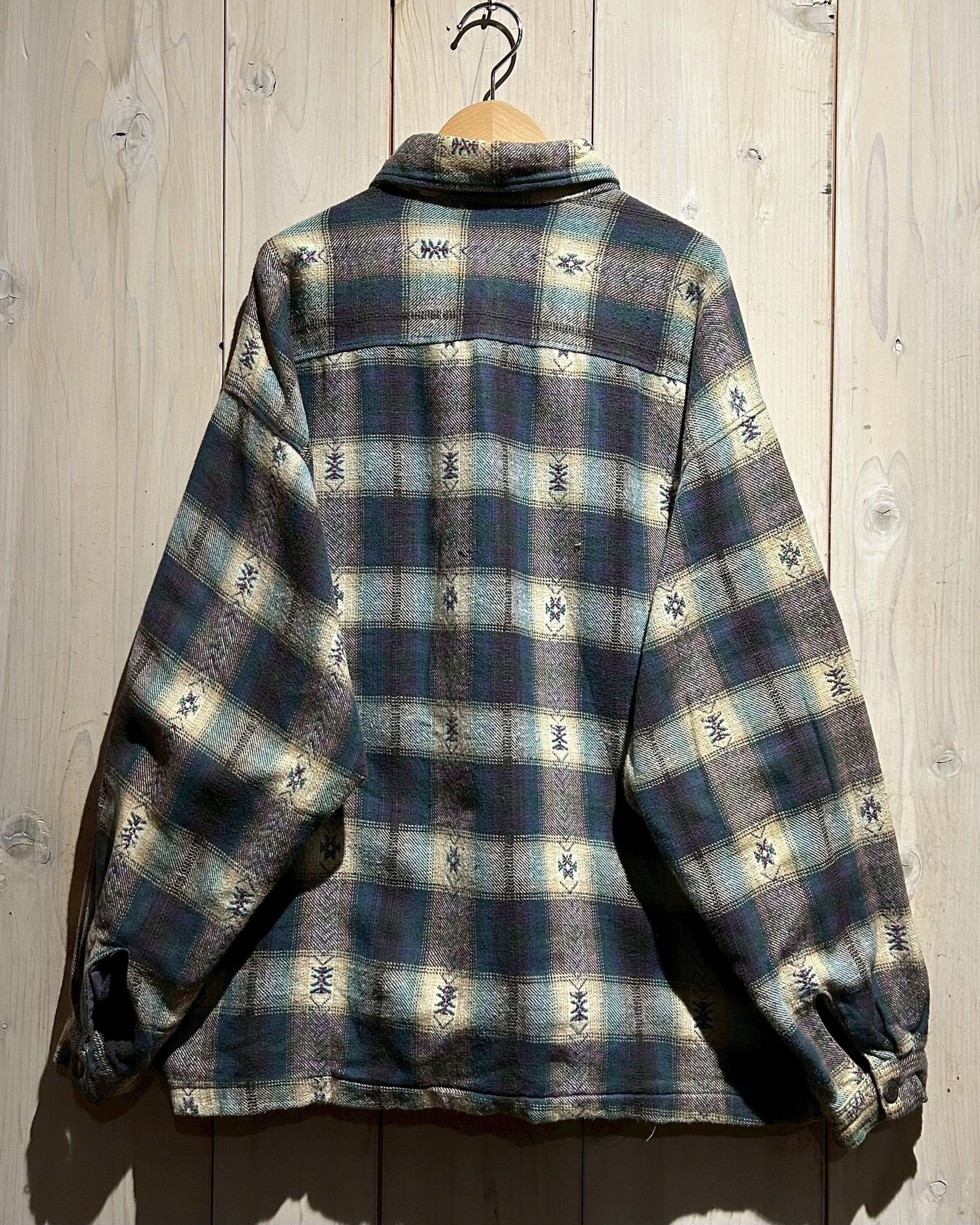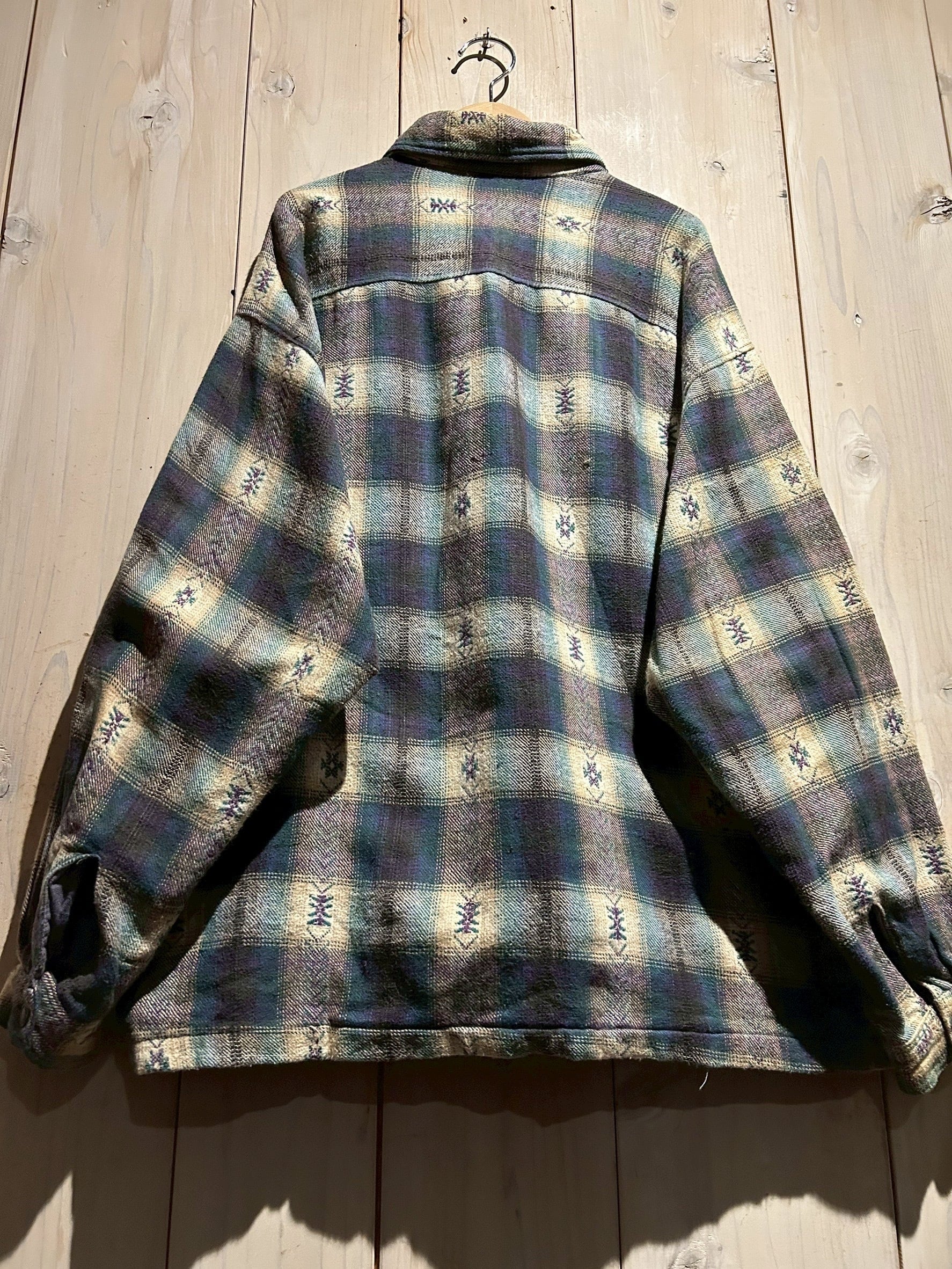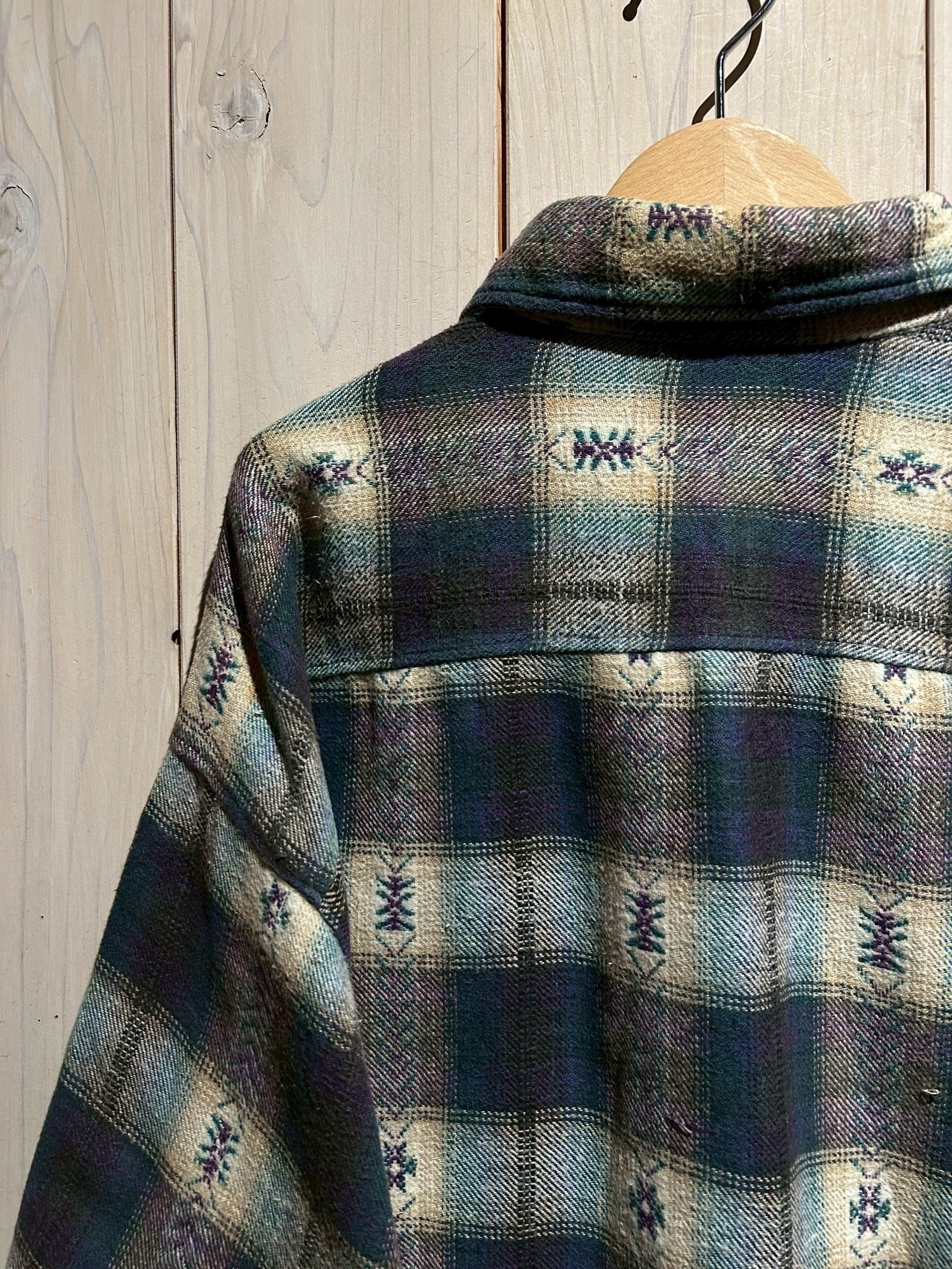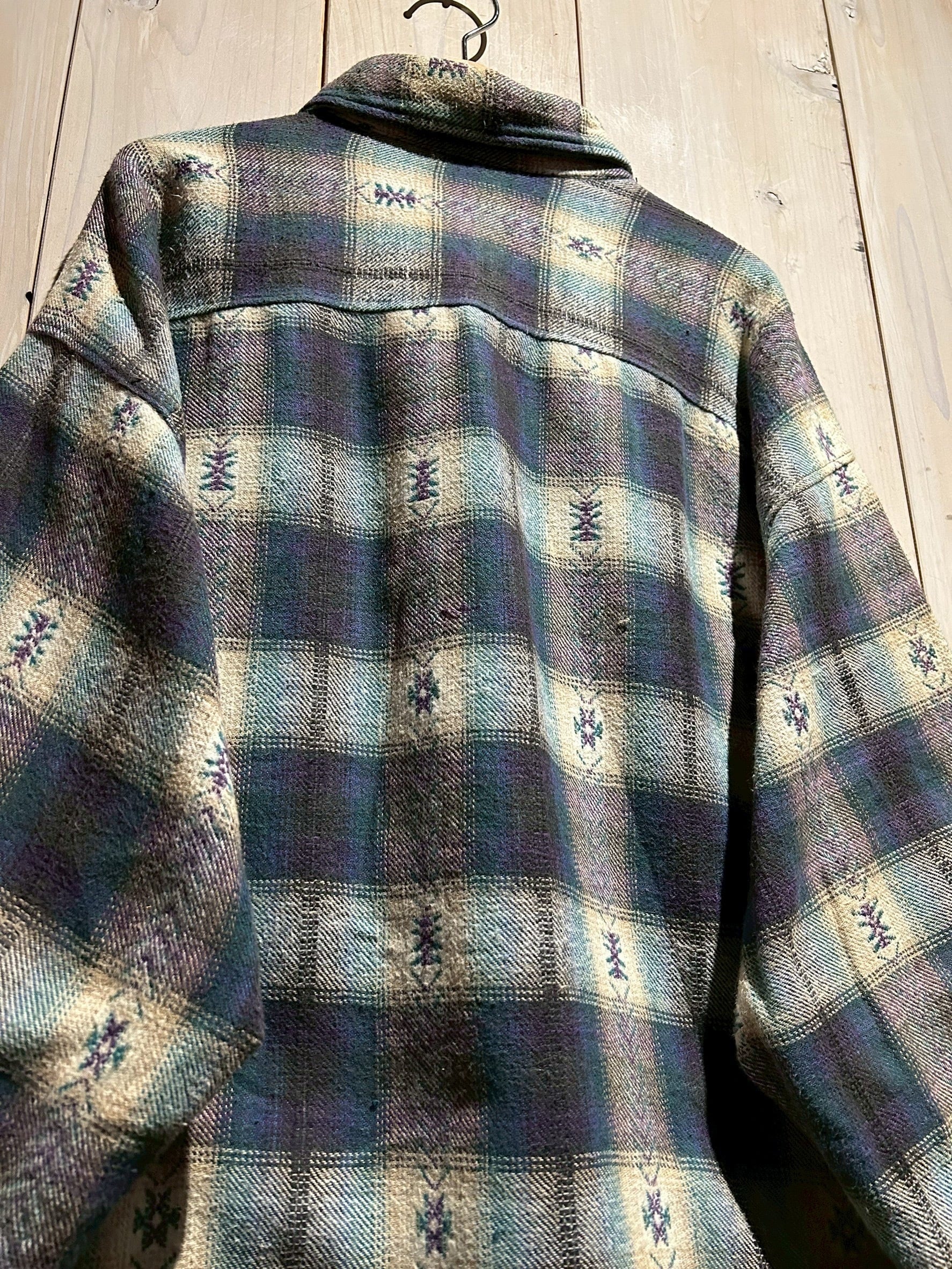 温かみのあるフランネル生地のボディに、チェック柄とネイティブ柄を載せた80'sヴィンテージのジャケット。