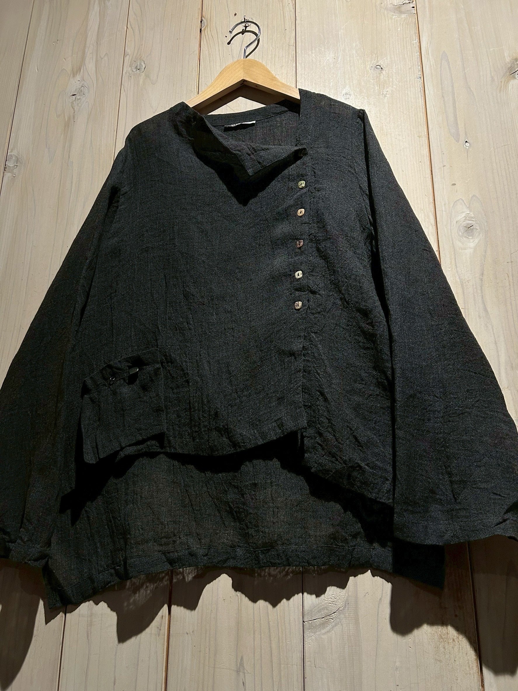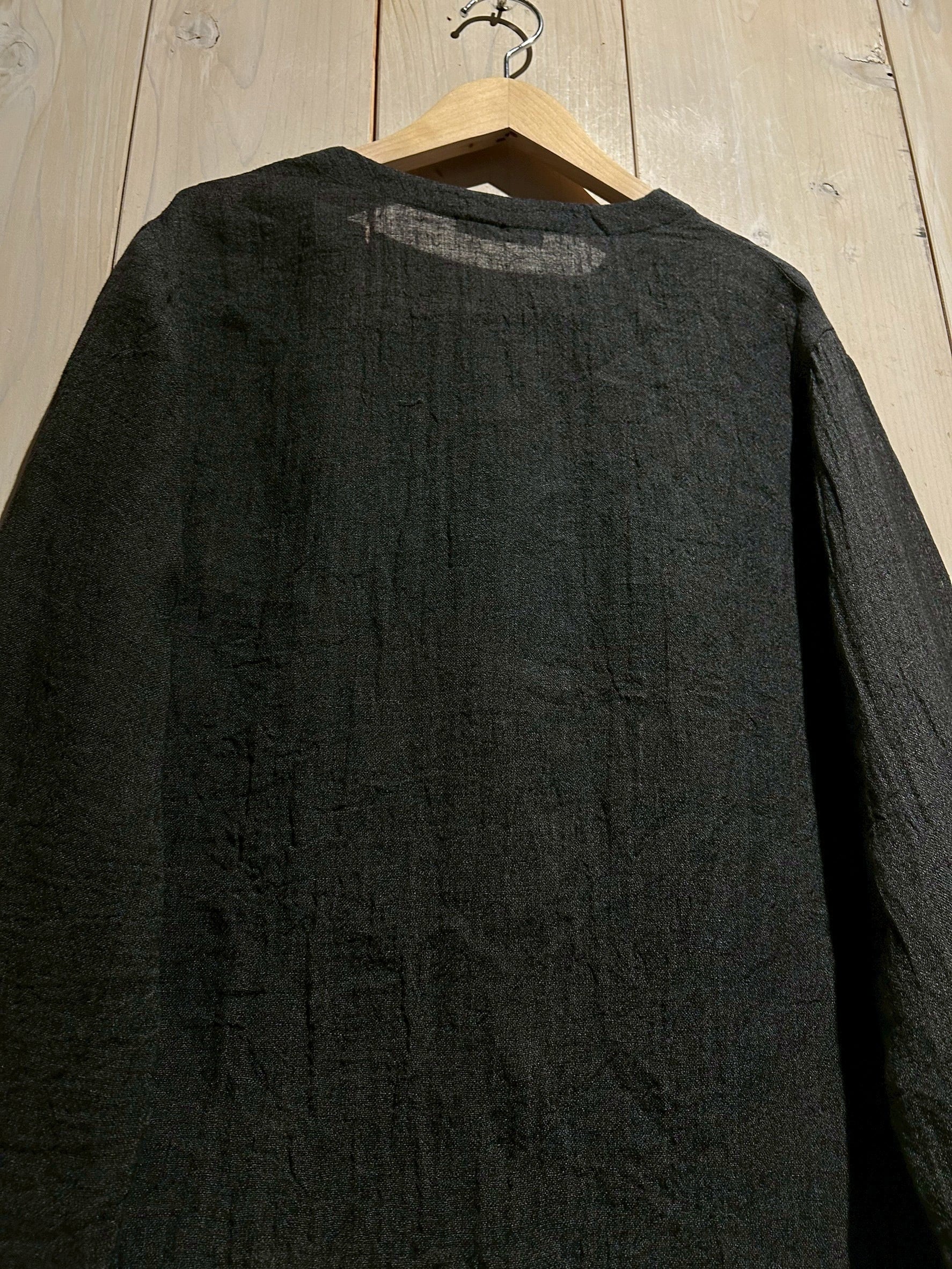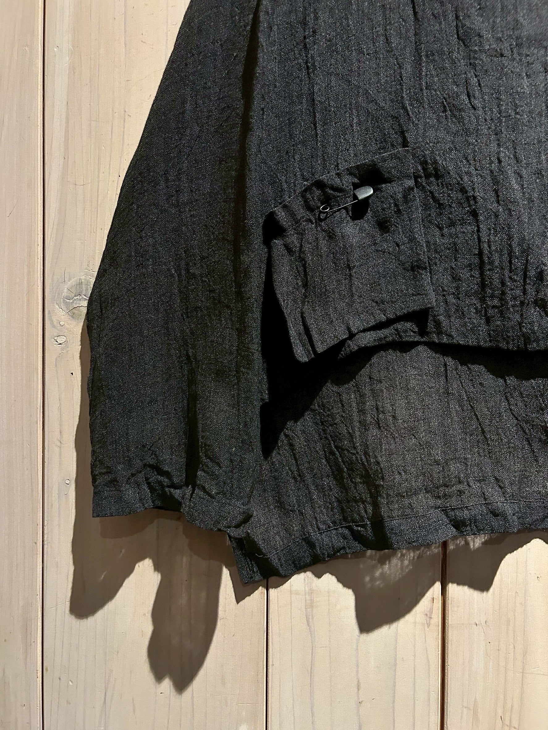 ドライな質感のブラックリネンを用いて、変形のシルエットに仕上げた長袖シャツジャケット。