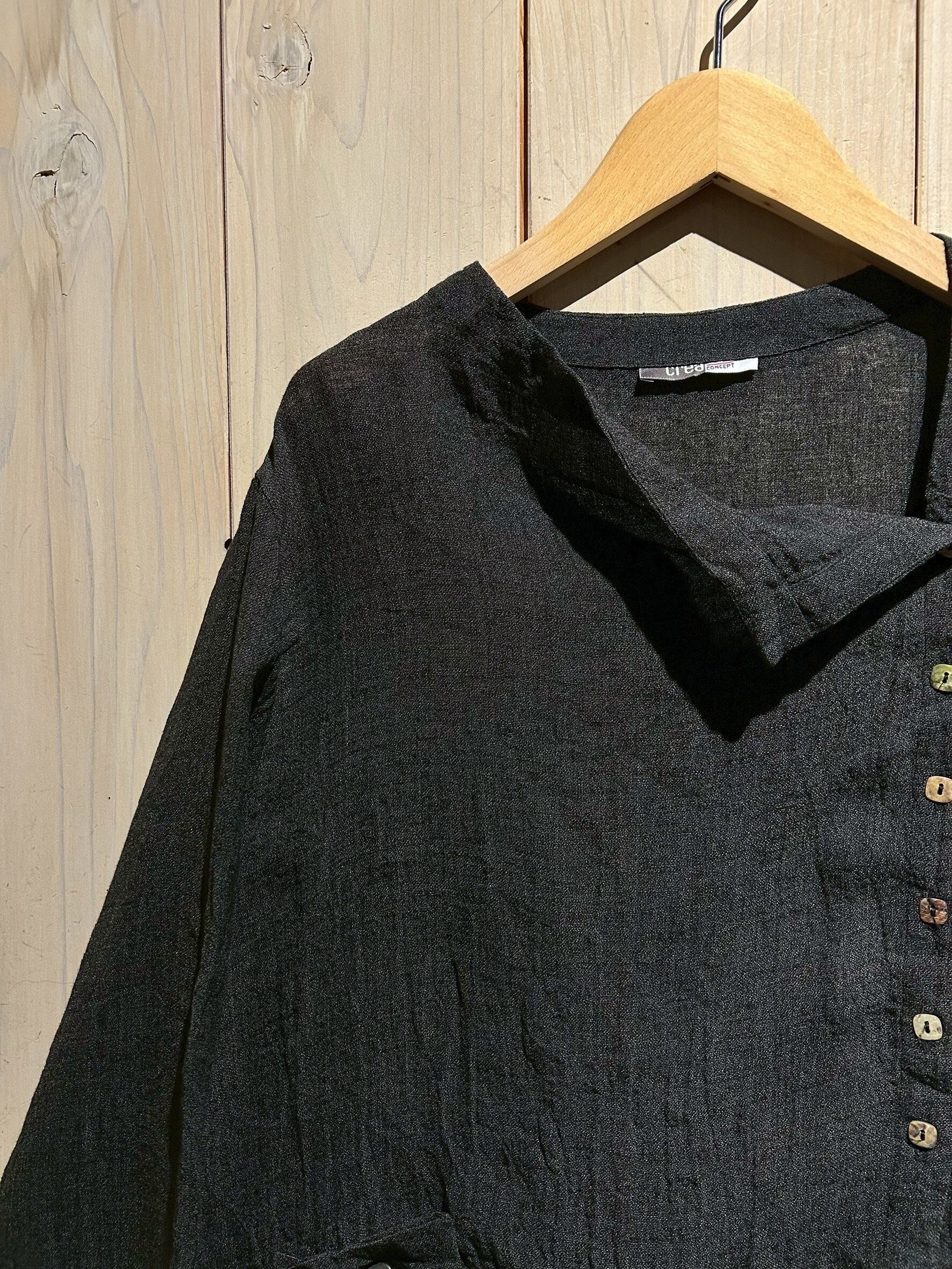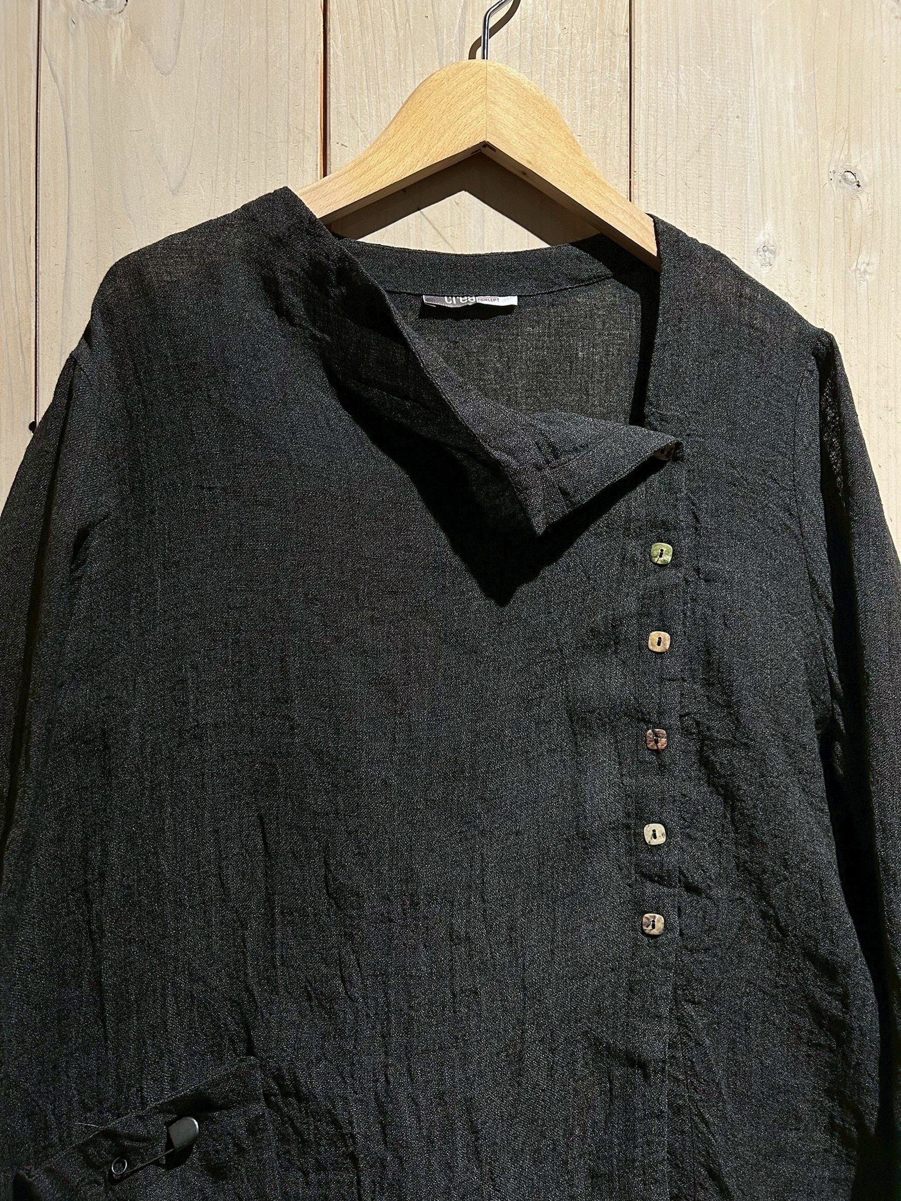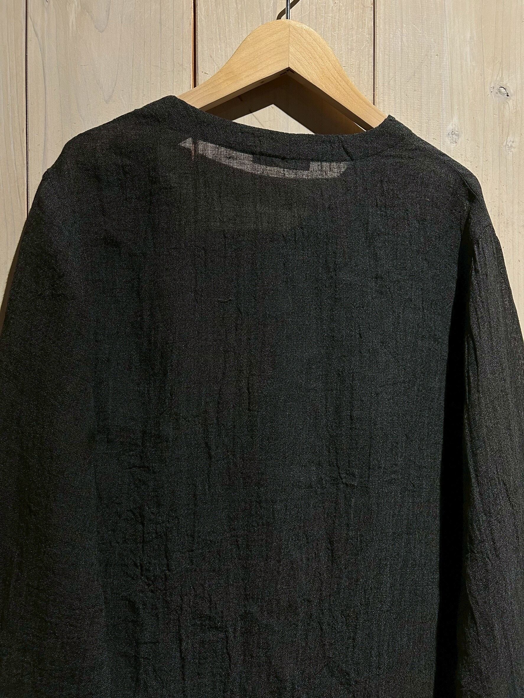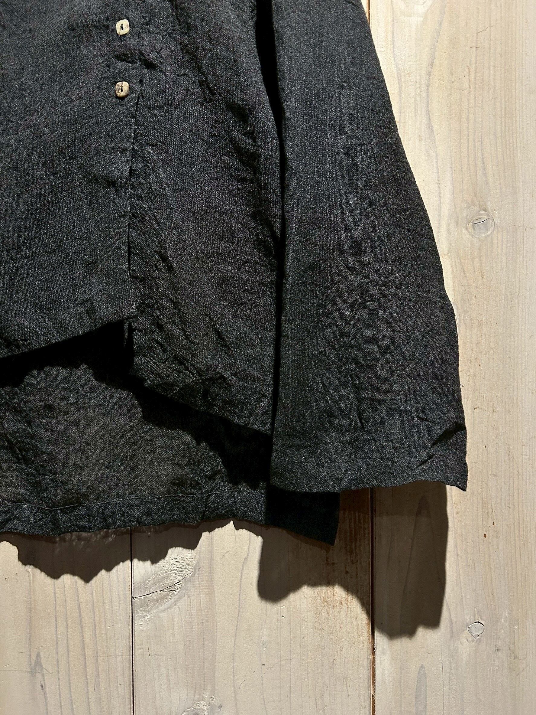 ドライな質感のブラックリネンを用いて、変形のシルエットに仕上げた長袖シャツジャケット。