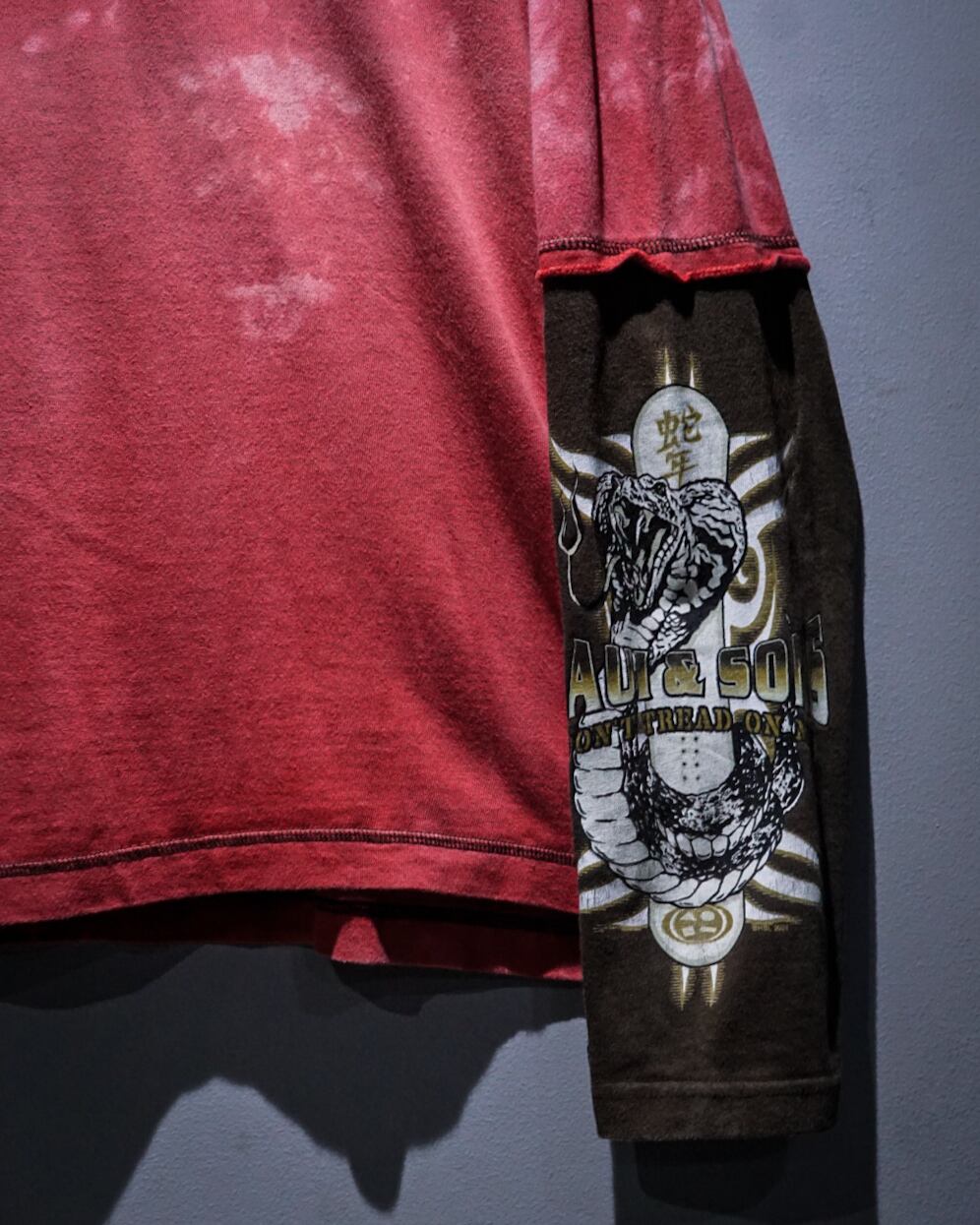 ブラウンのロンTに、染めを施した赤色のTシャツを重ねたような、レイヤード風のデザインに仕上げたロンT。