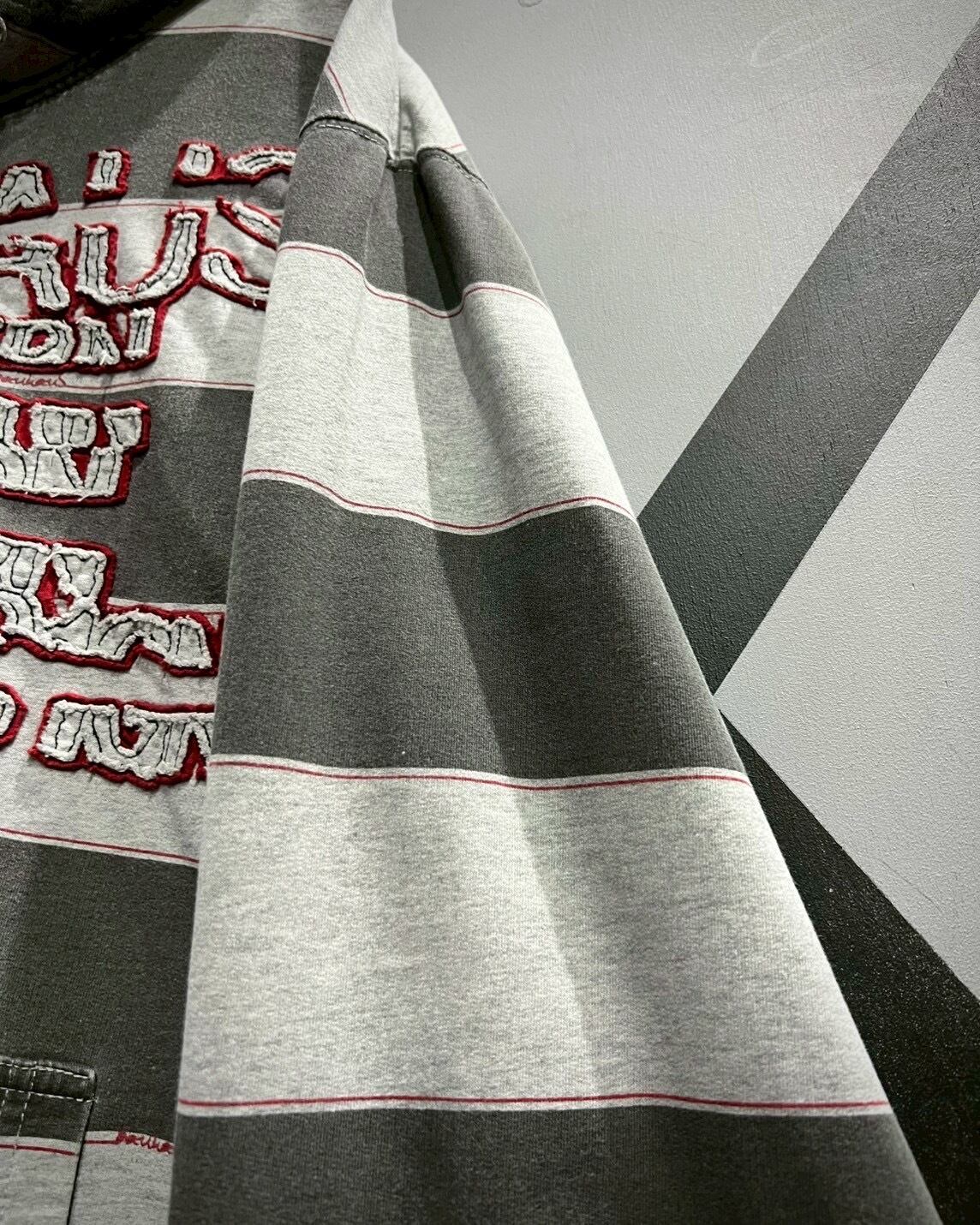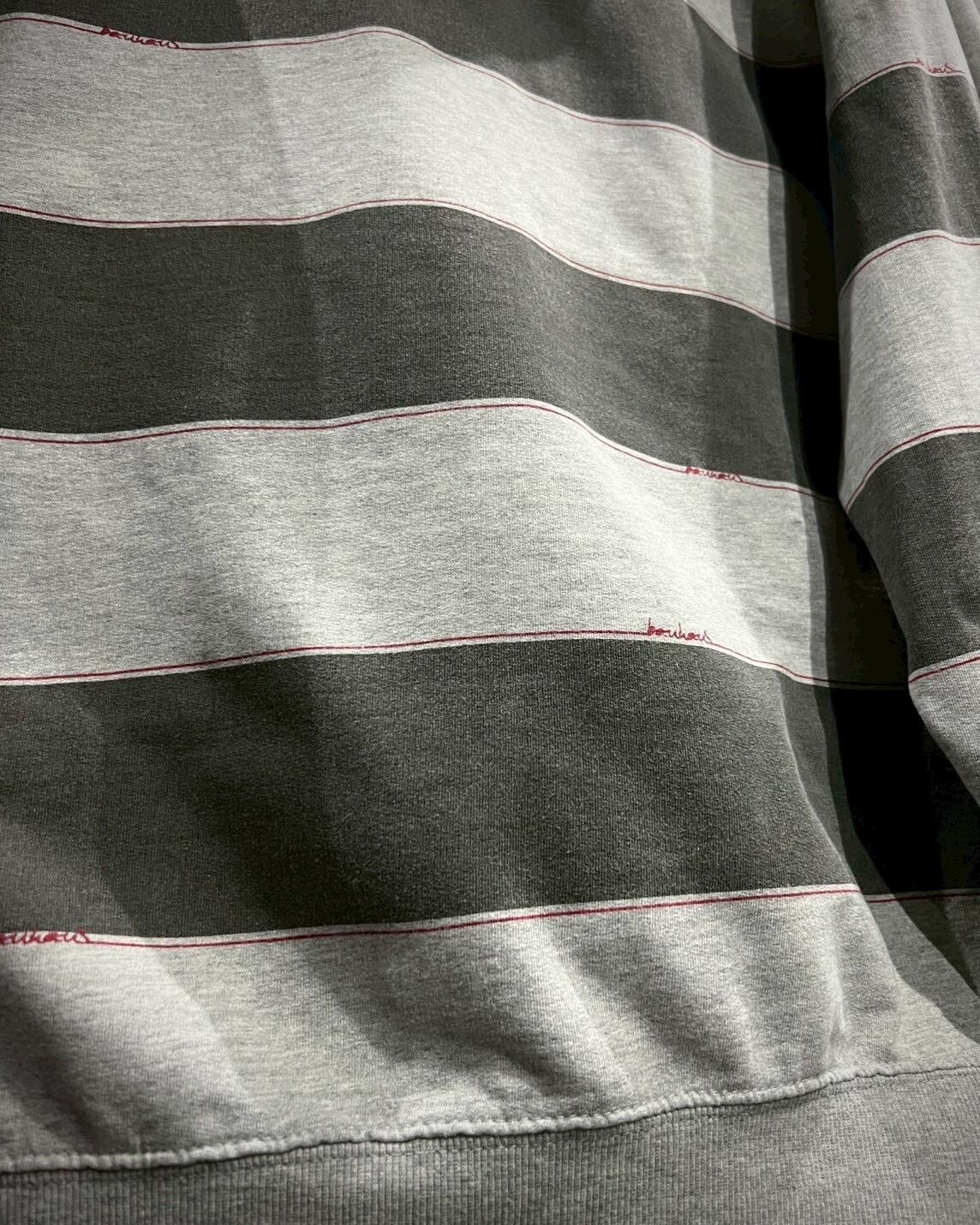 ロゴの形状に型抜きしカットオフ仕様にしたグレー、赤のスウェット生地を重ね、その上からステッチを叩き絶妙なボロ感を表現。立体感もあり、ボーダーのボディによく映えています。