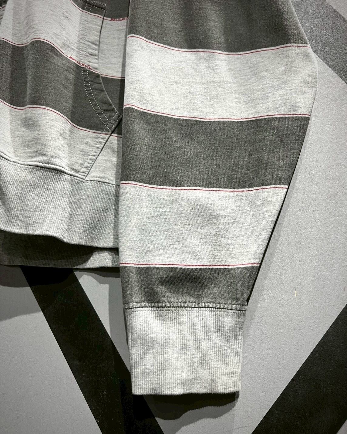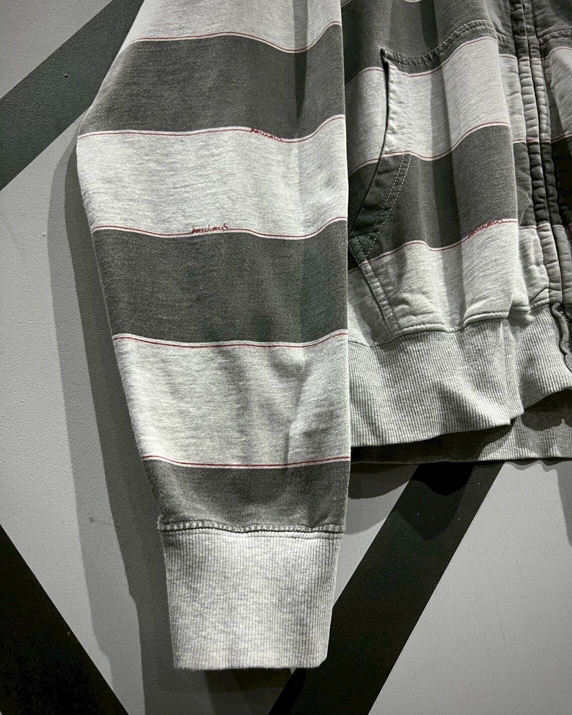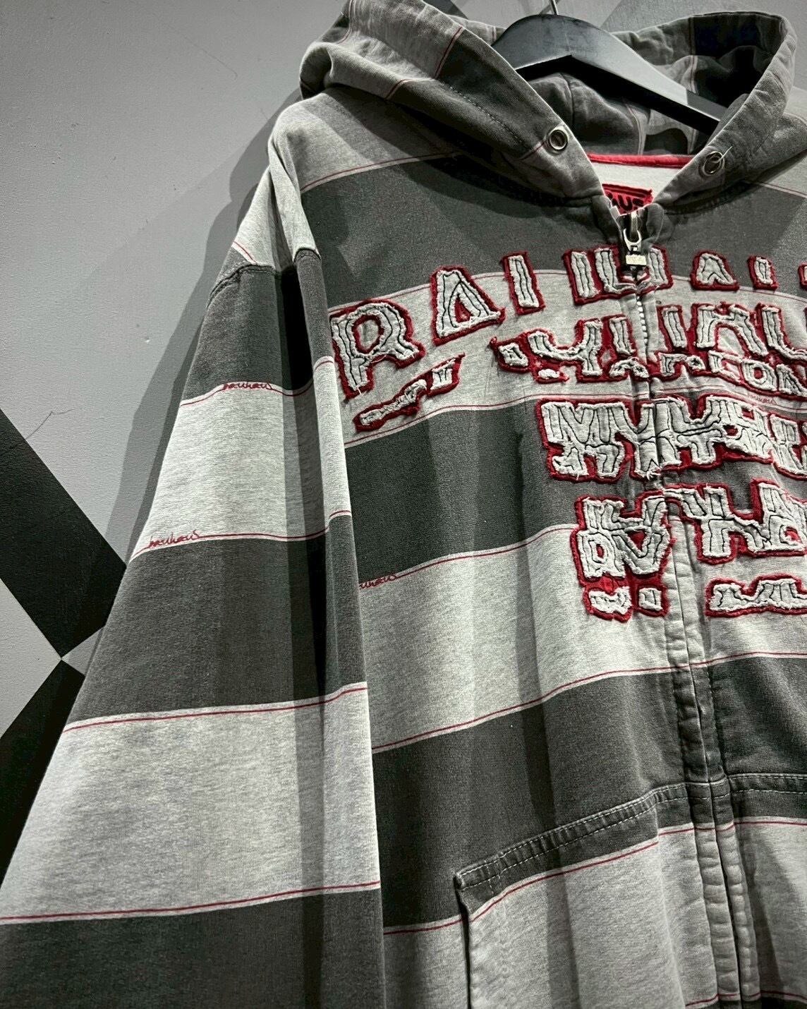 トーンの異なるグレーでボーダーを載せたボディに、ブランドロゴパッチを載せたジップアップフーディ。