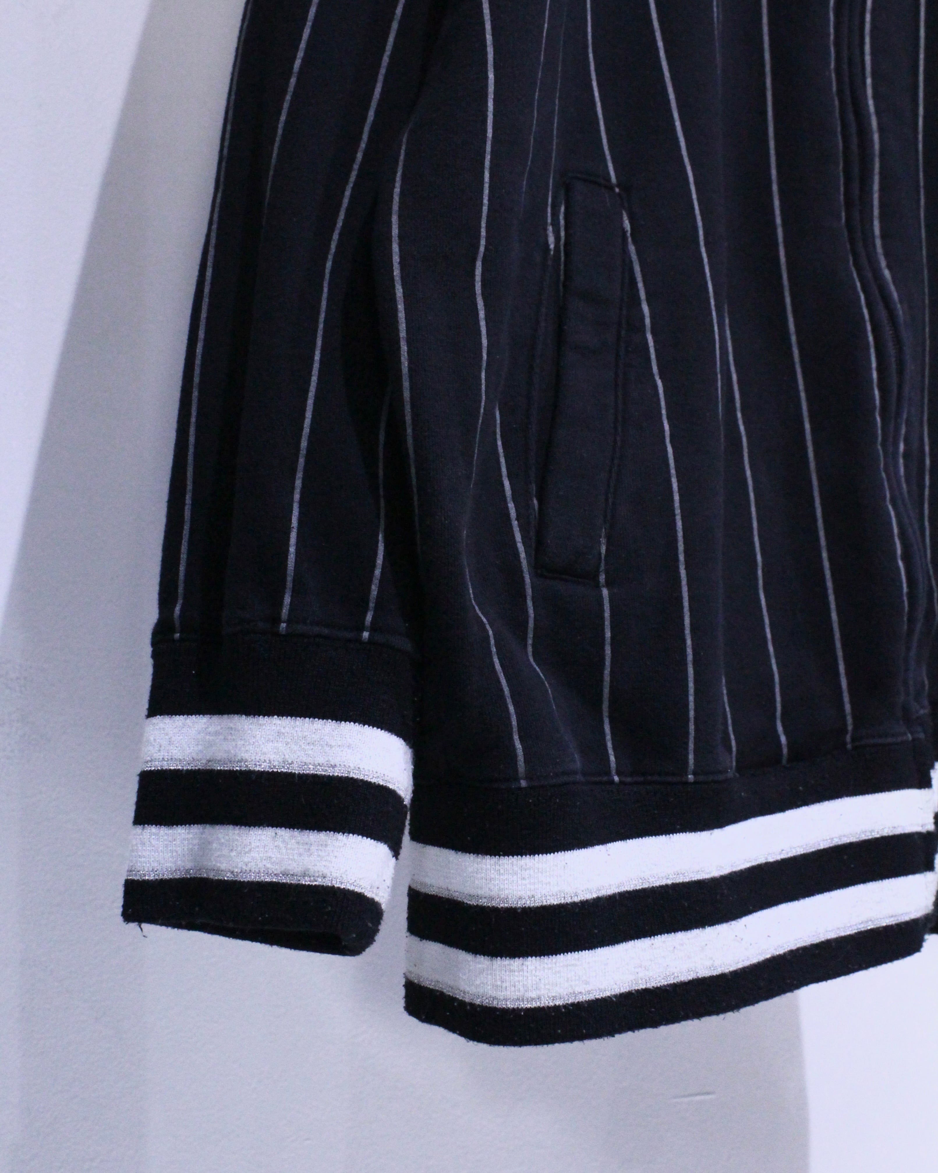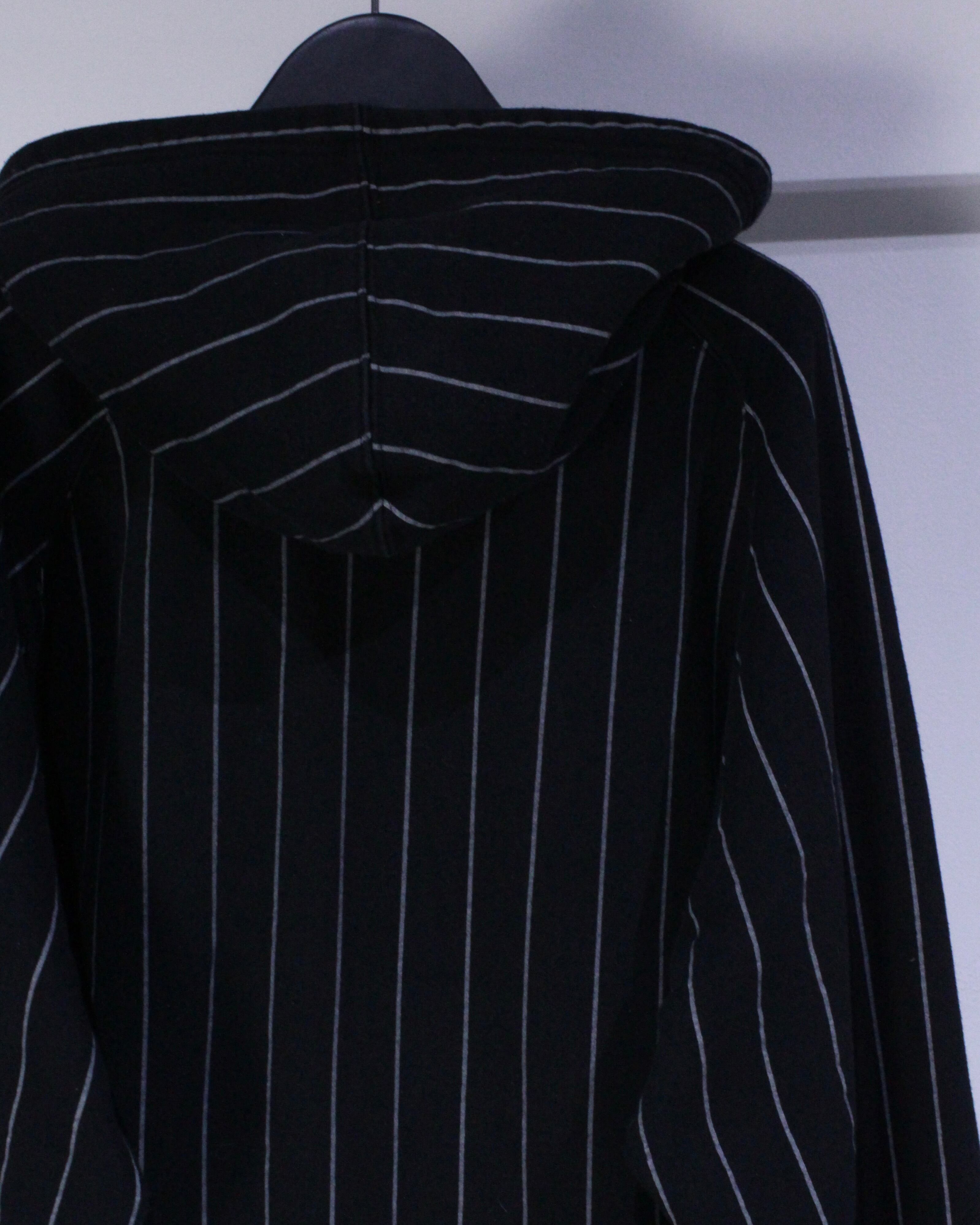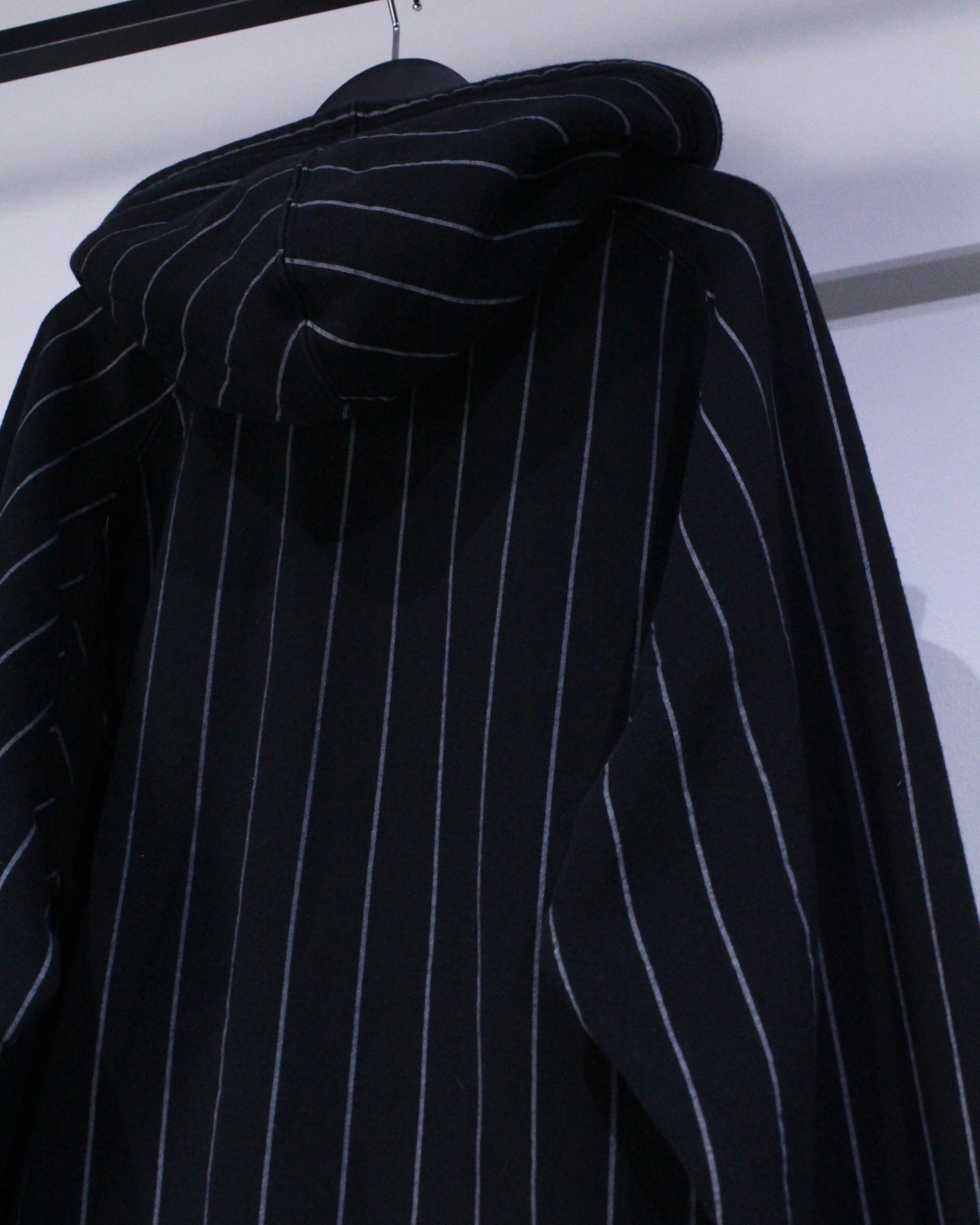 肉感のあるストライプのボディに、フロントにロゴパッチを載せたジップアップフーディ。