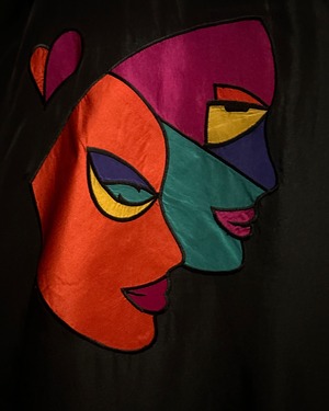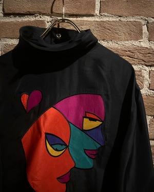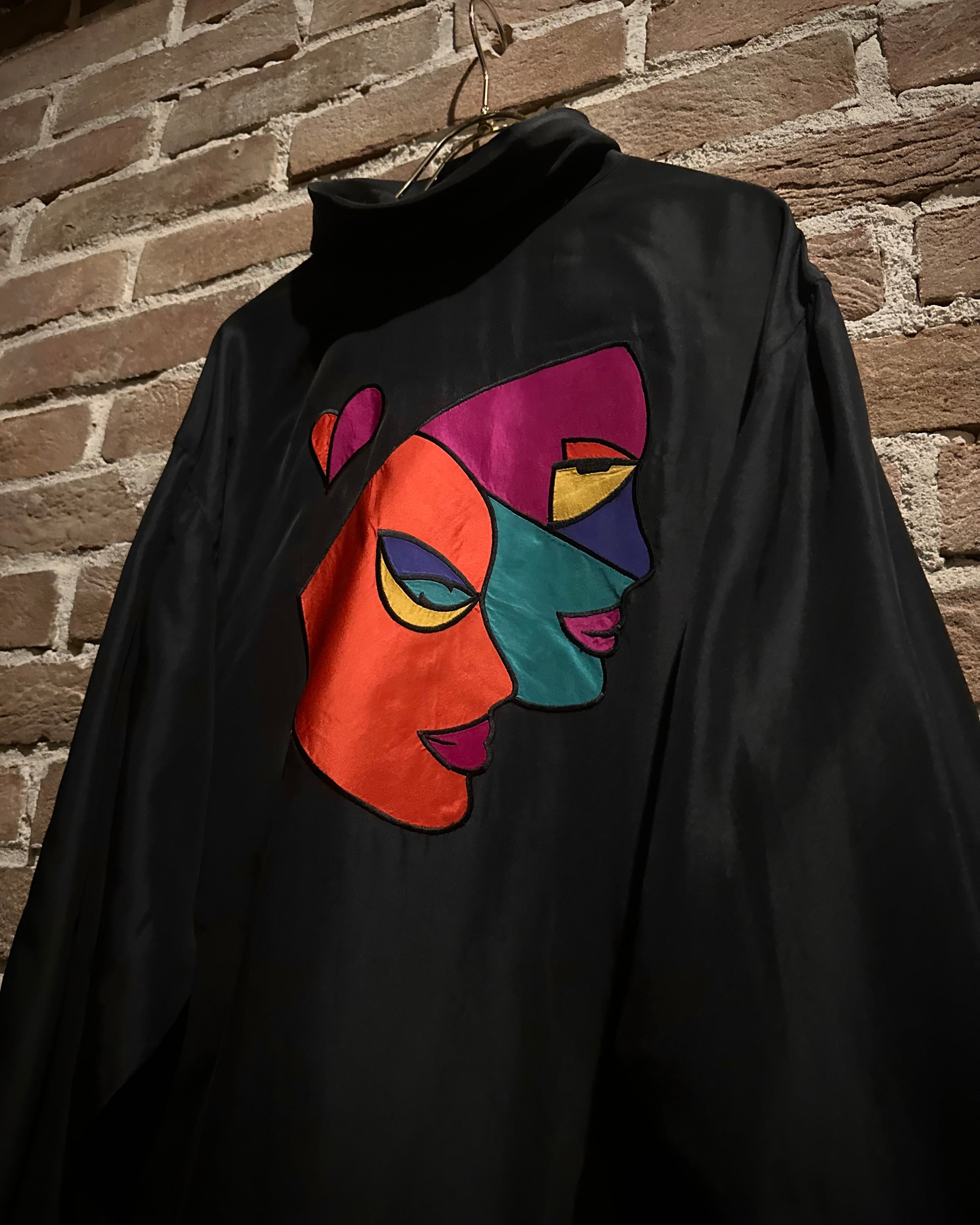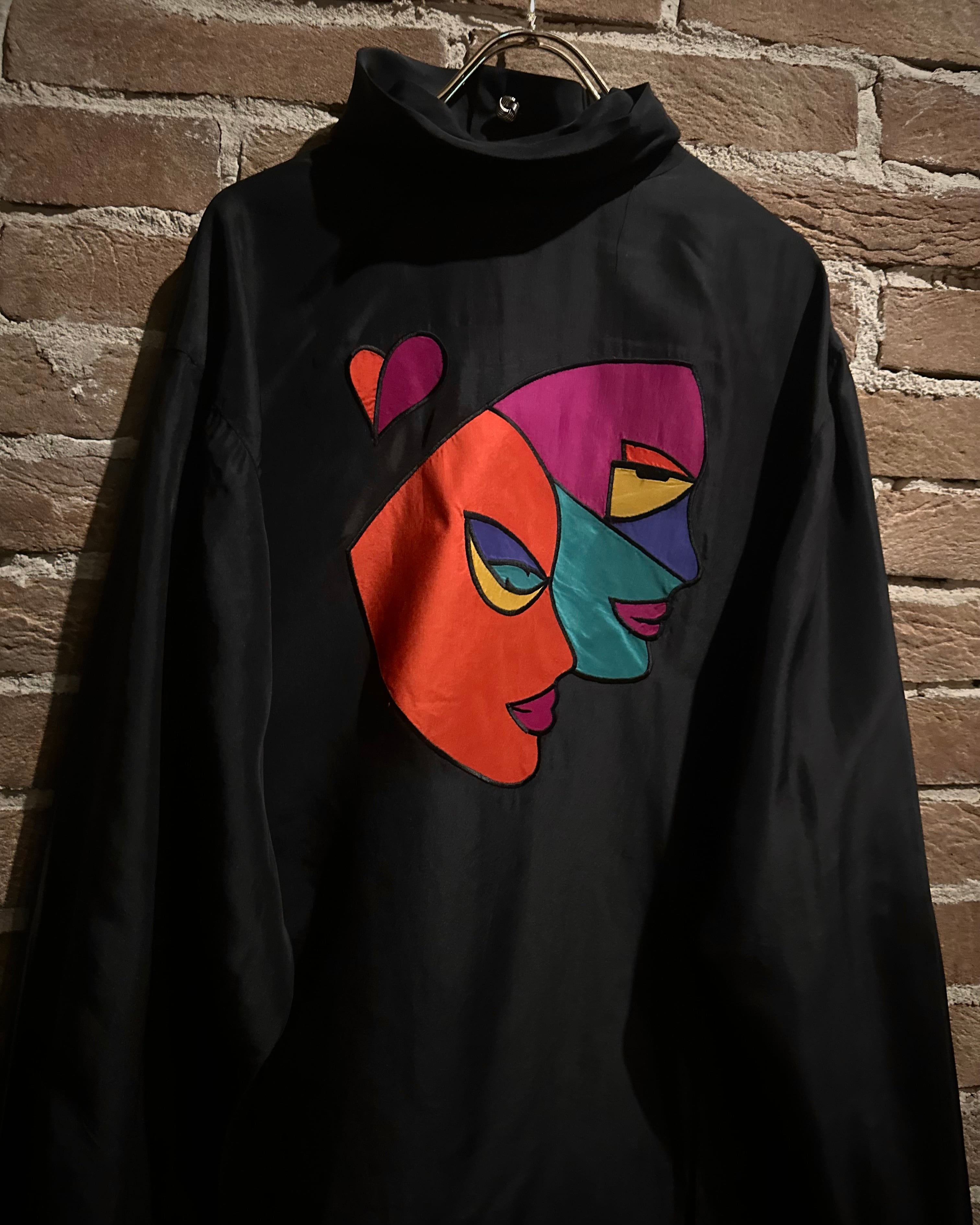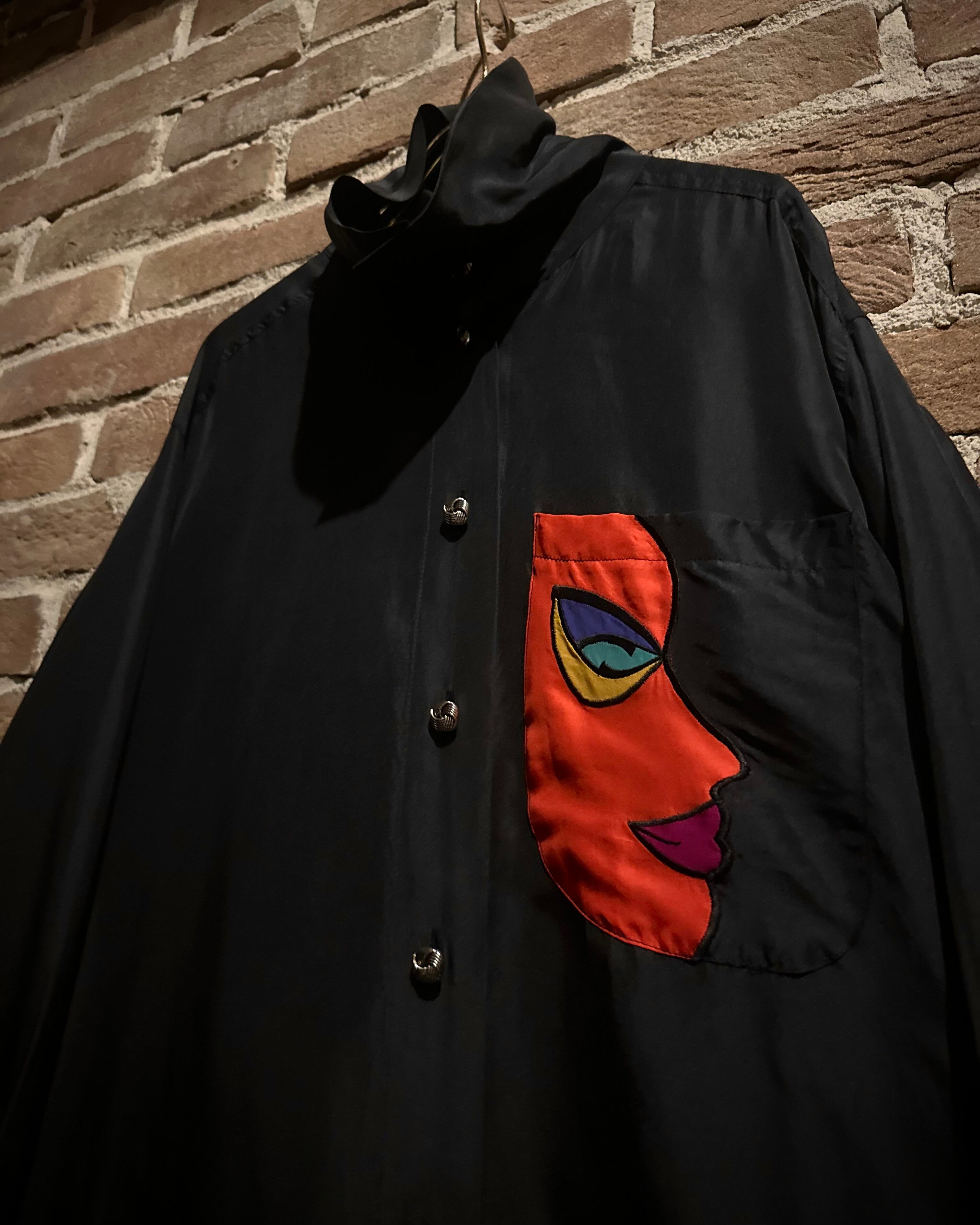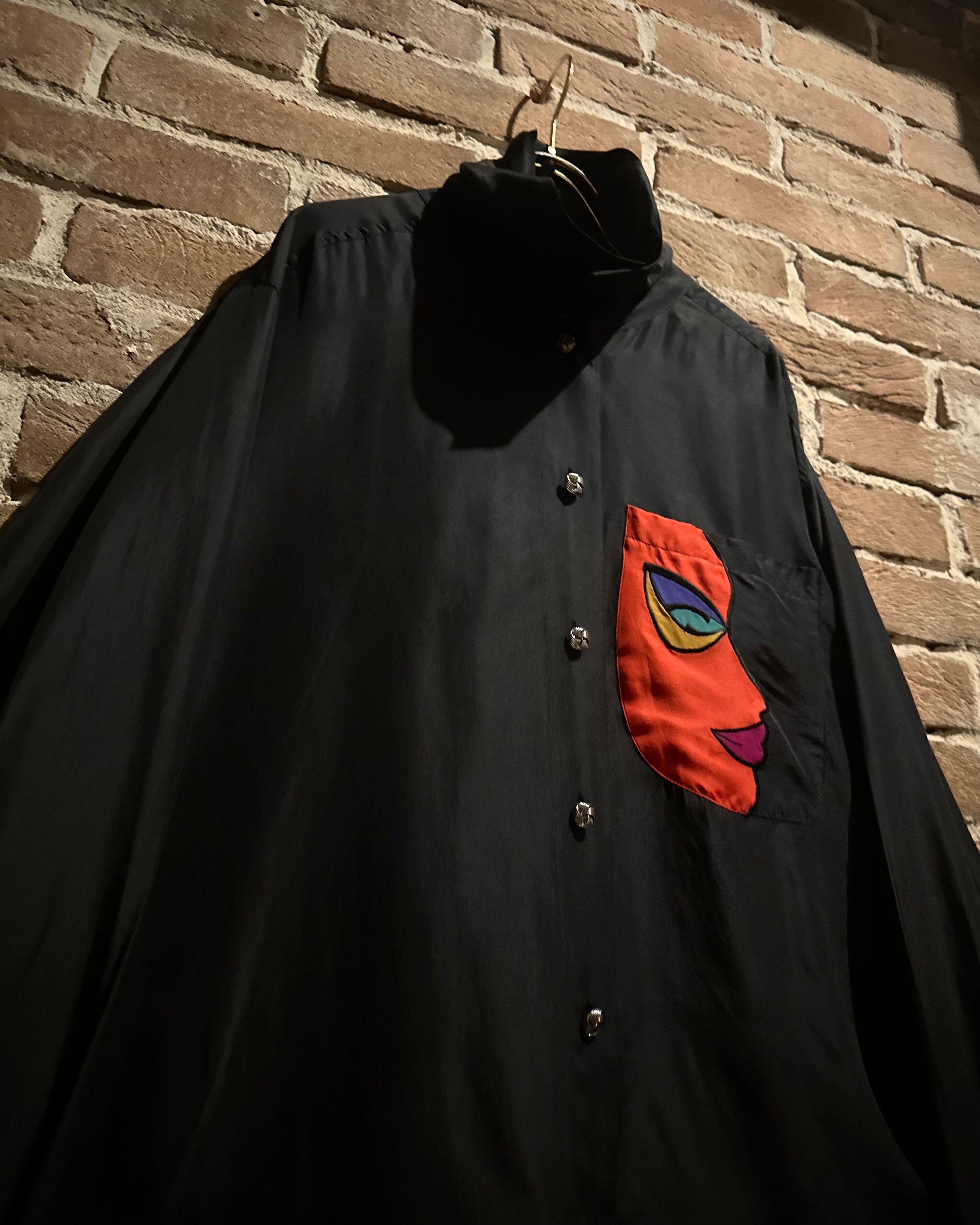 ハリ、光沢のあるブラックシルクのボディに、左胸と背面に仮面の様なアートを載せた長袖シャツ。