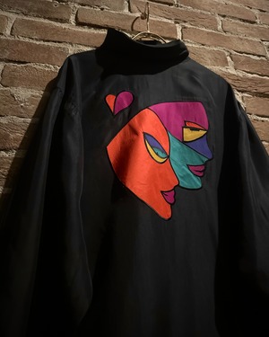 黒のボディに映えるあ鮮やかなカラーリングに、唯一無二感のあるデザインで身に纏えるアートそのもの。首元はボタンでスタンドカラーに変形させることができ、シルエットで遊びを効かせることもできます。デザインの効いたシルバーのボタン使いも◎