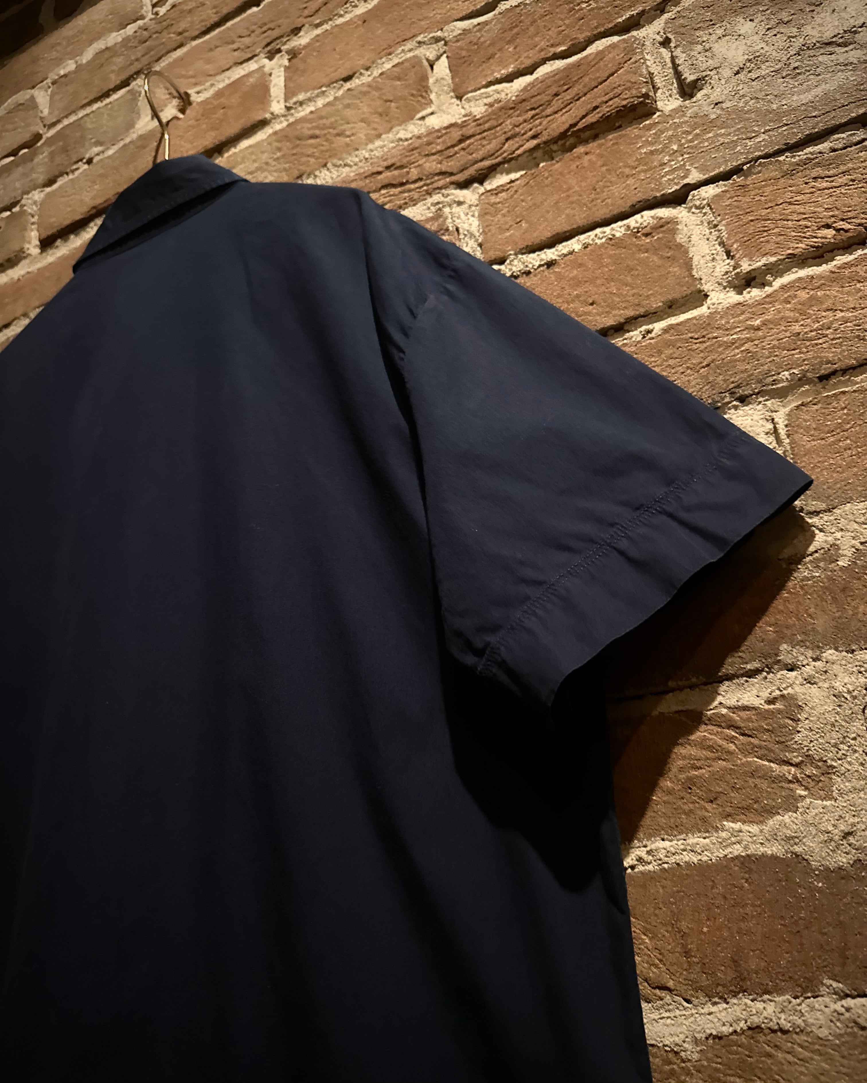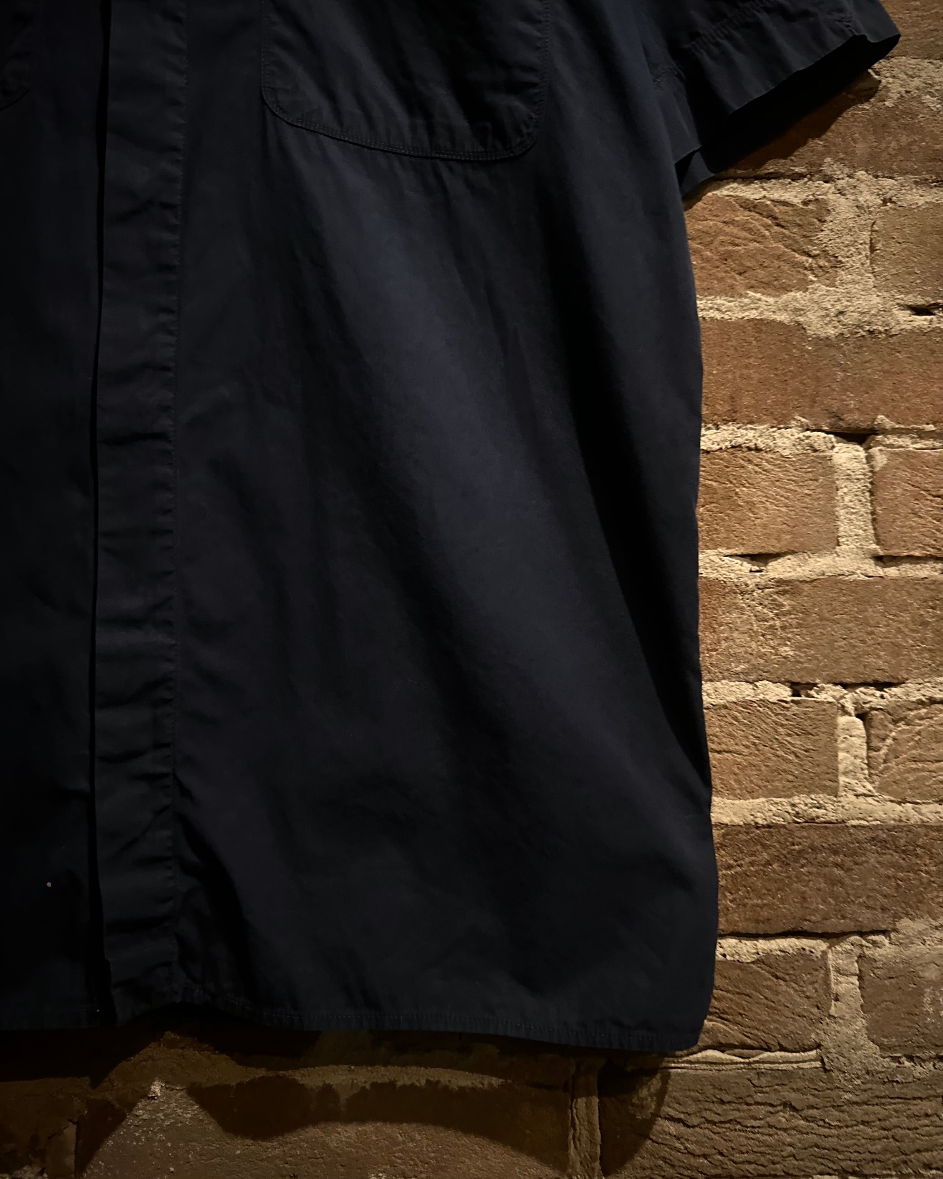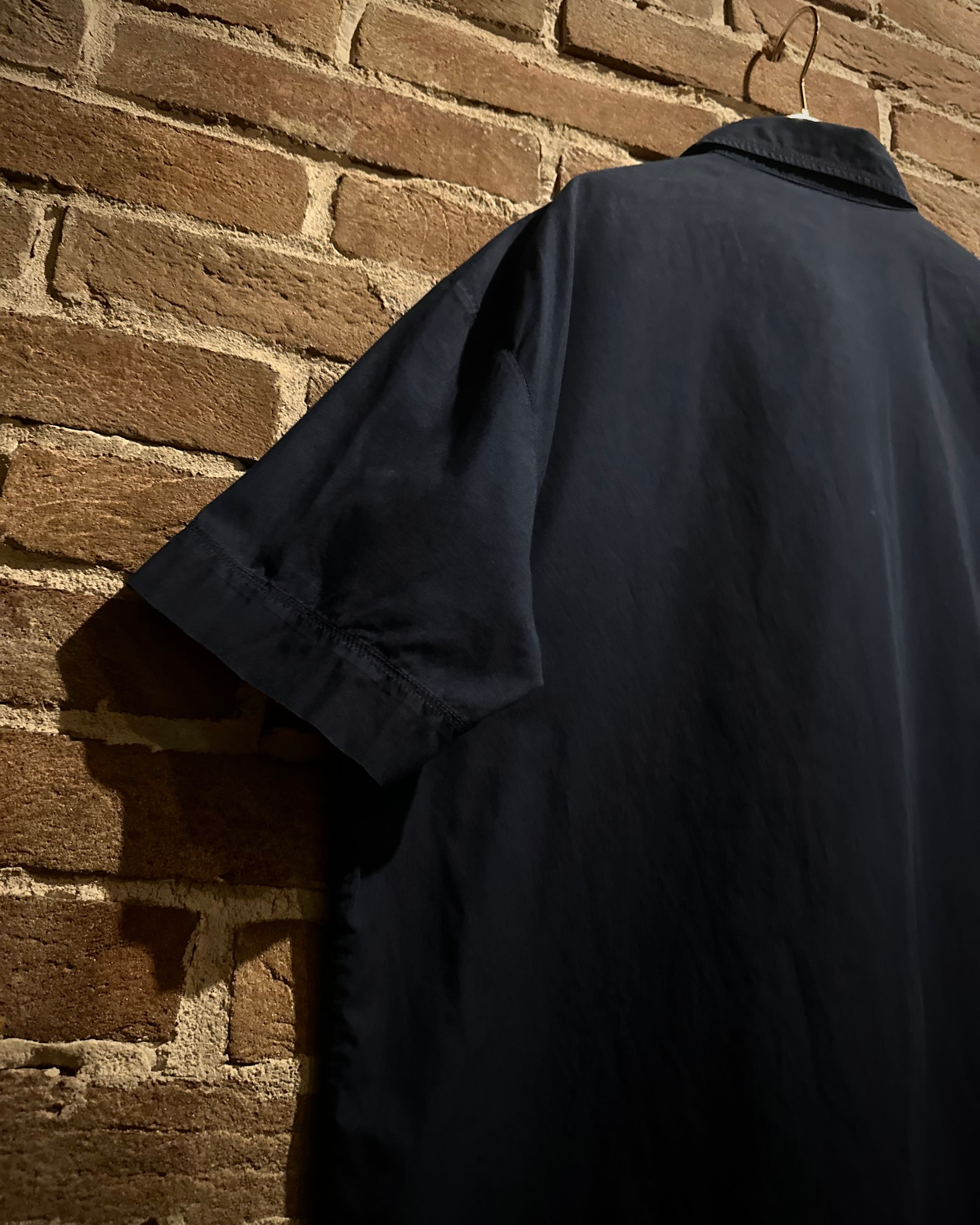 柔らかくハリのあるブラックのボディに、両胸にフラップポケットを載せた半袖シャツ。