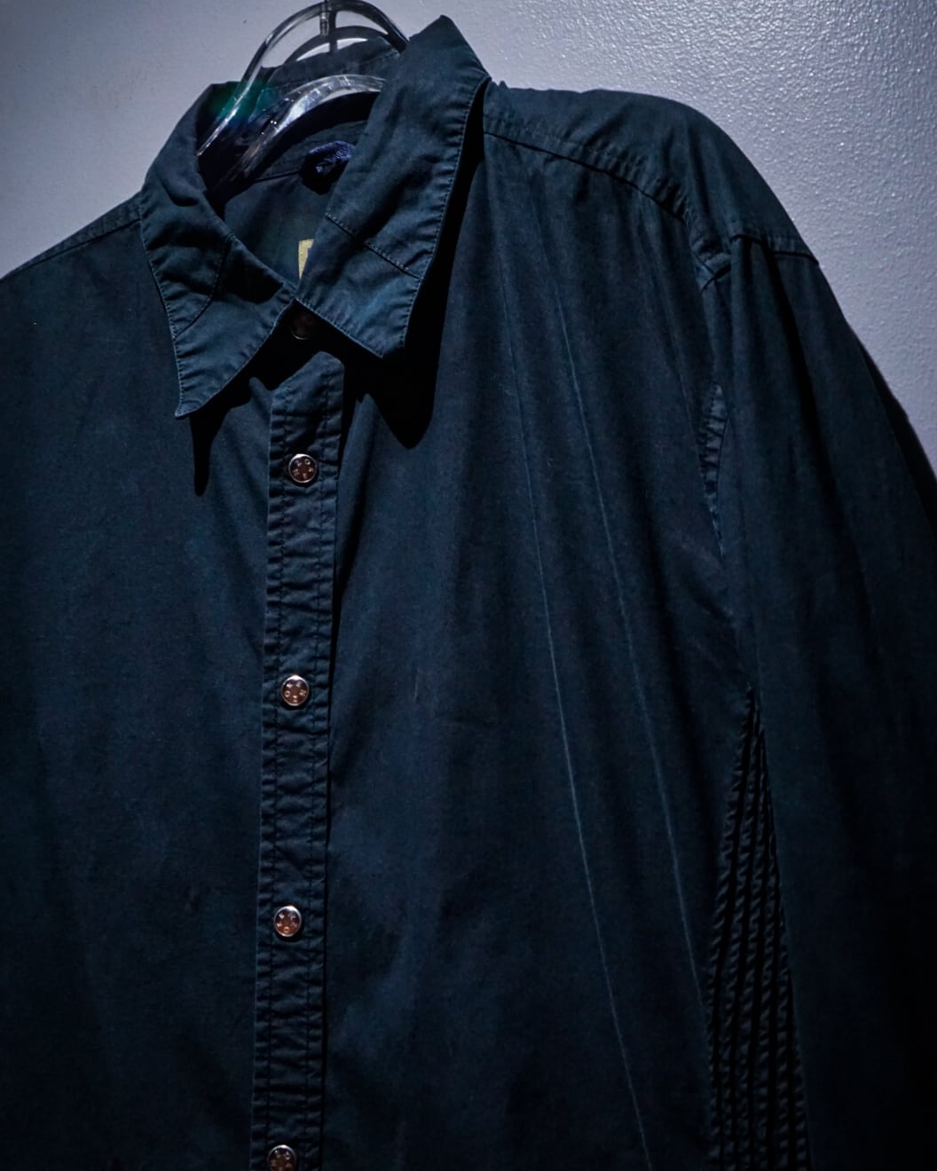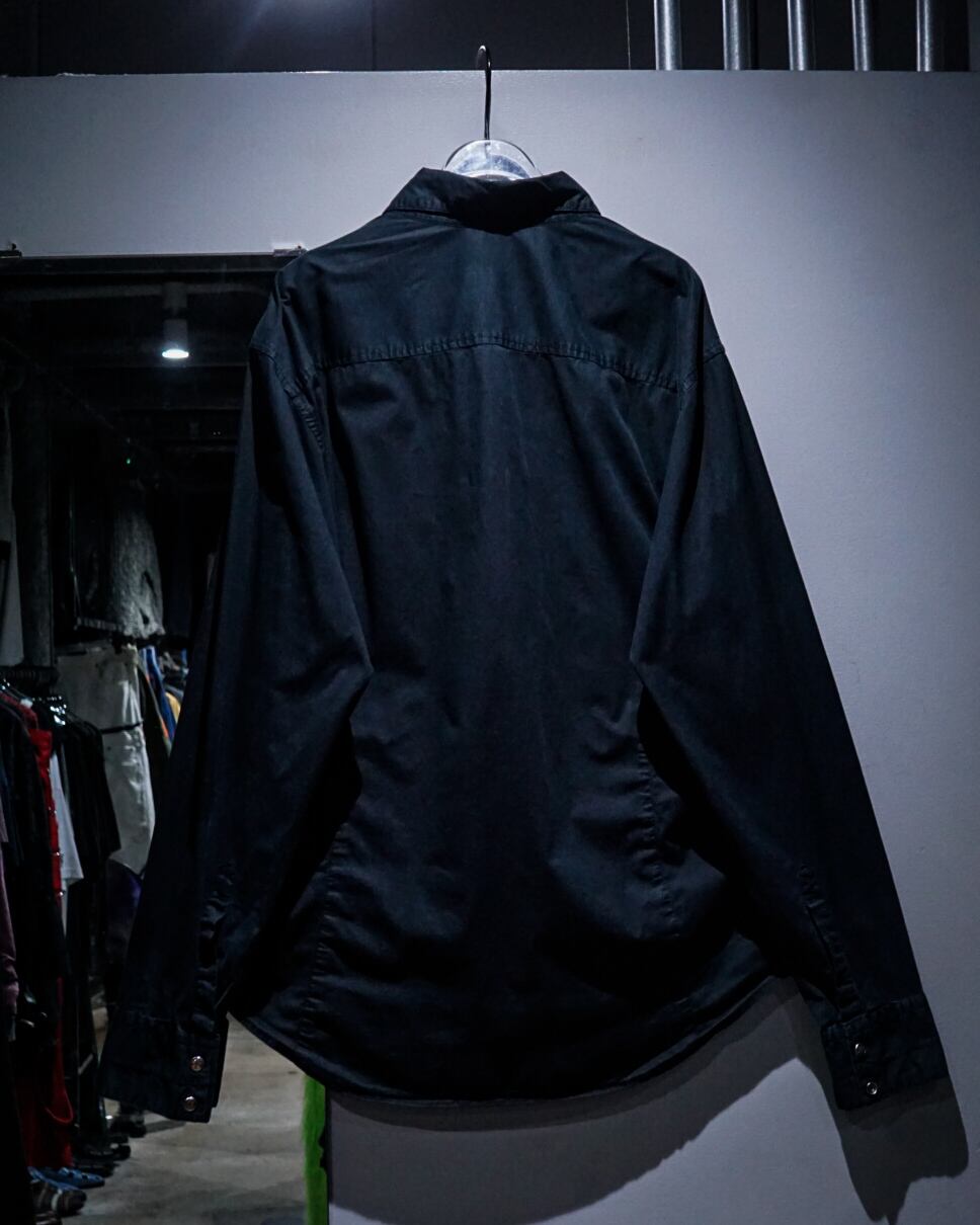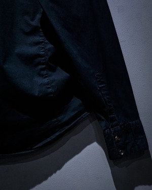 ブラックのボディに、ウエストのシェイプに沿ってプリーツ加工を施した長袖シャツ。