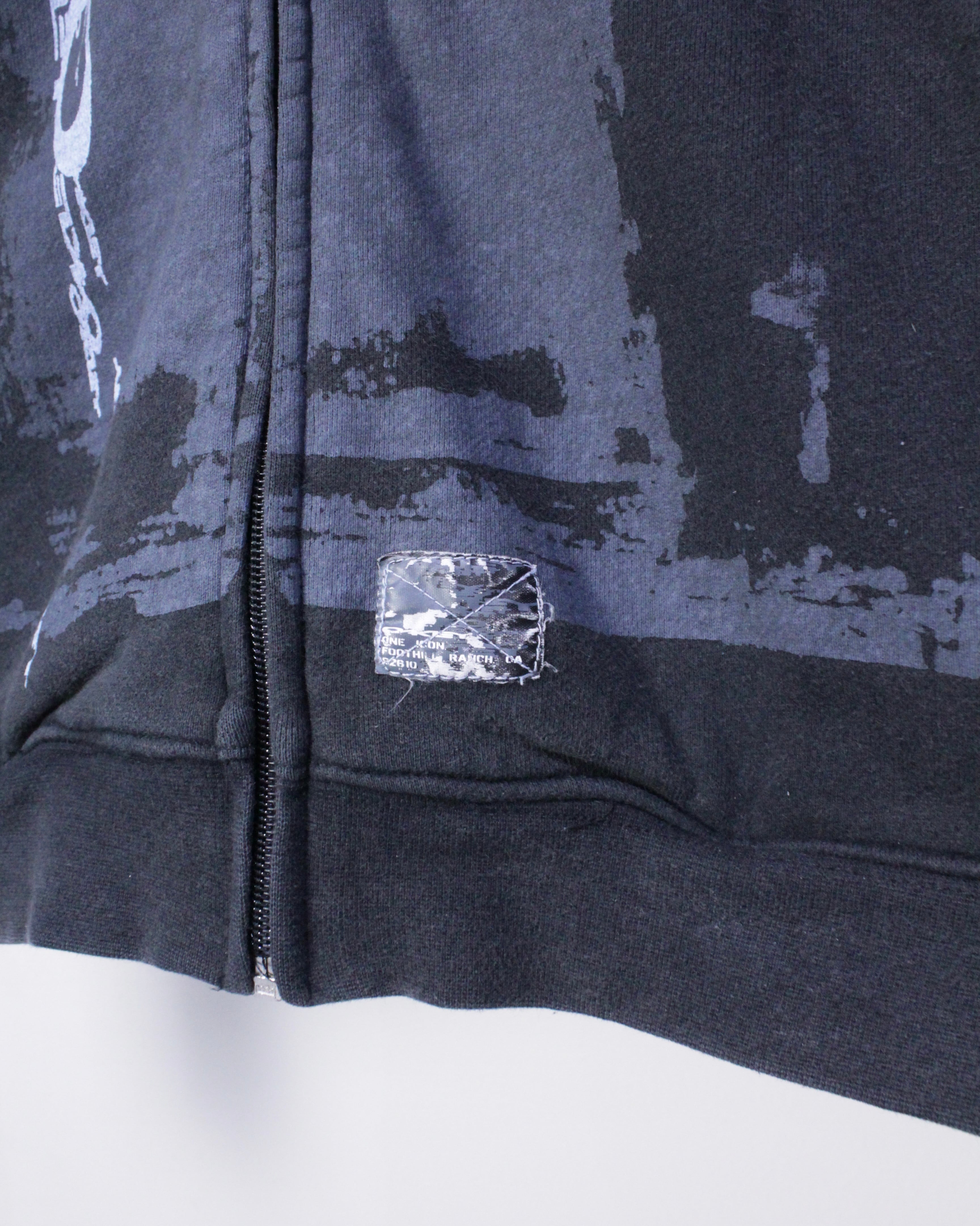 ブラックのボディをベースに、ロゴを組み合わせたグラフィックをプリントで、ロゴをカットオフ仕様のパッチで載せたジップアップスウェットジャケット。