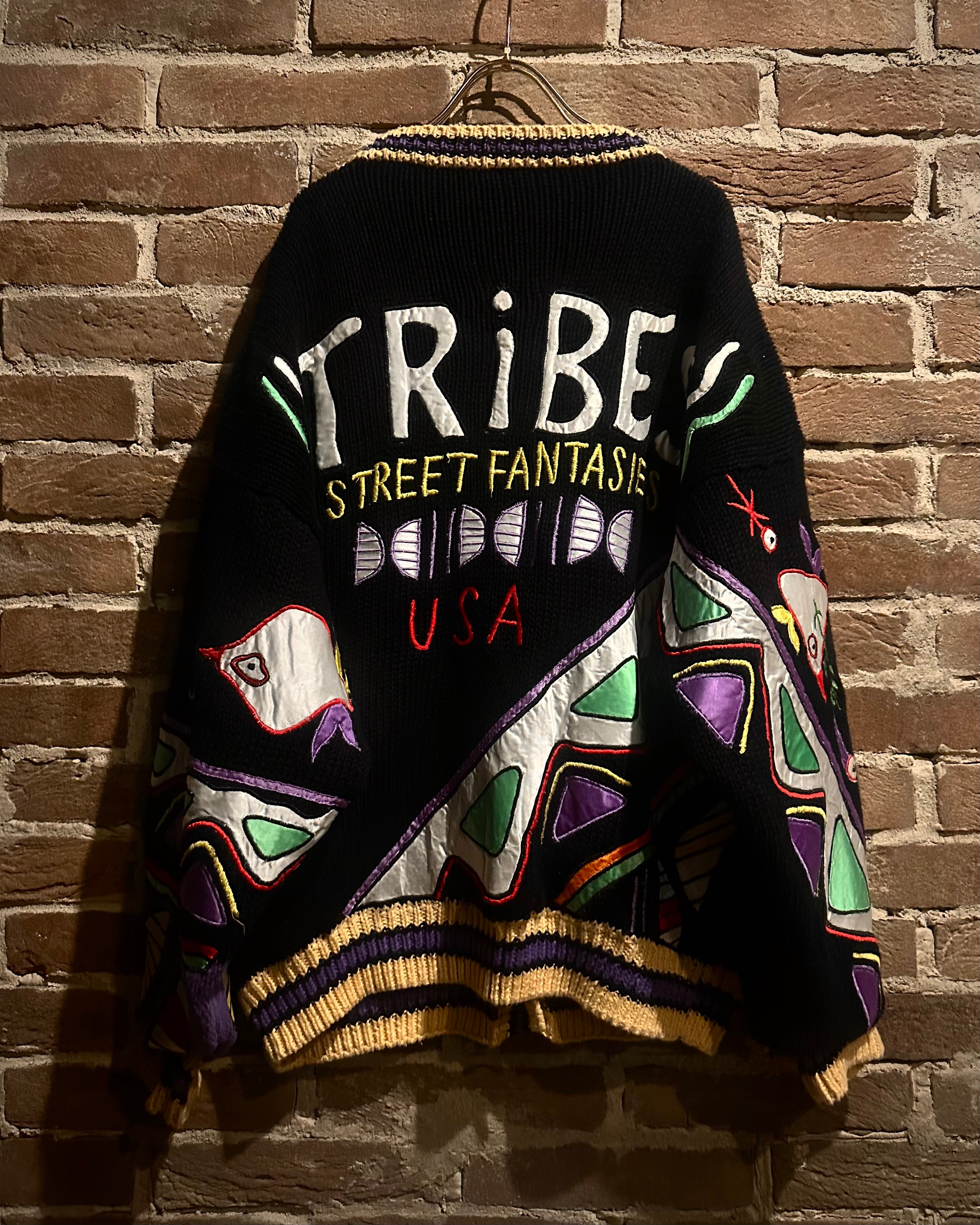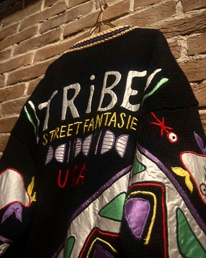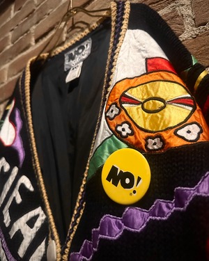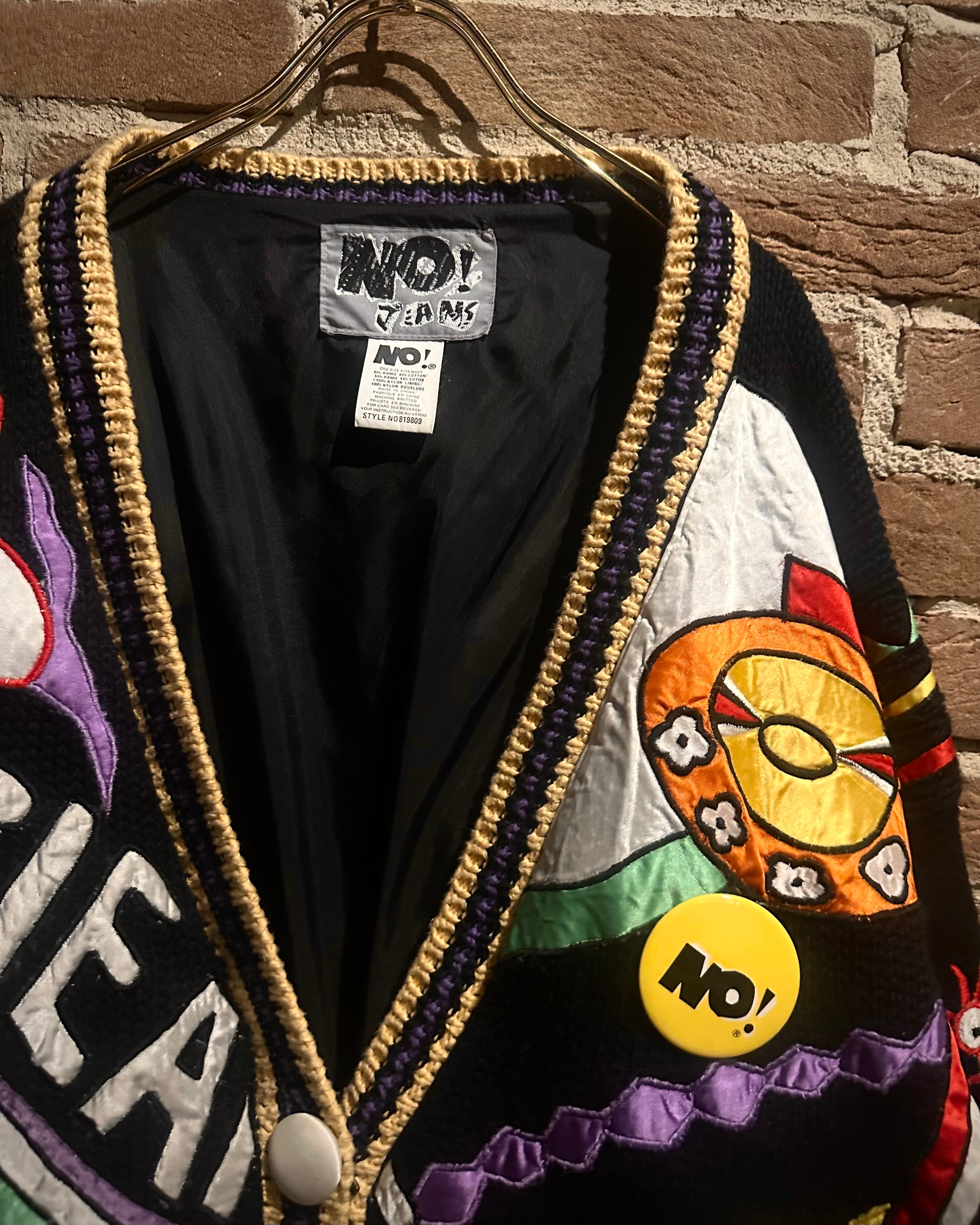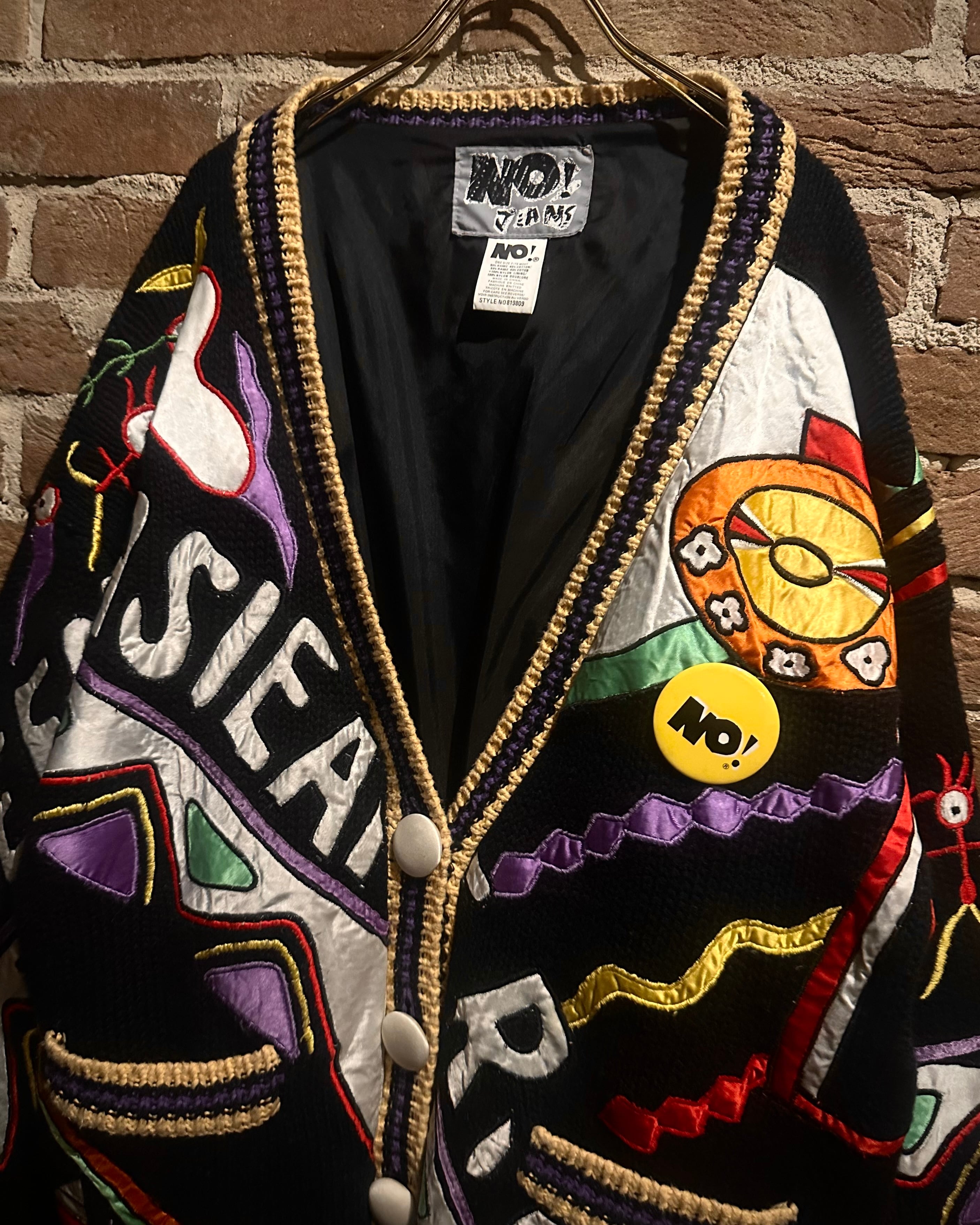 ブラックのニットボディをベースに、ツルッと滑らかで光沢のある生地を切り替えた80’s "NO JEANS"の当店らしいカーディガンジャケット。