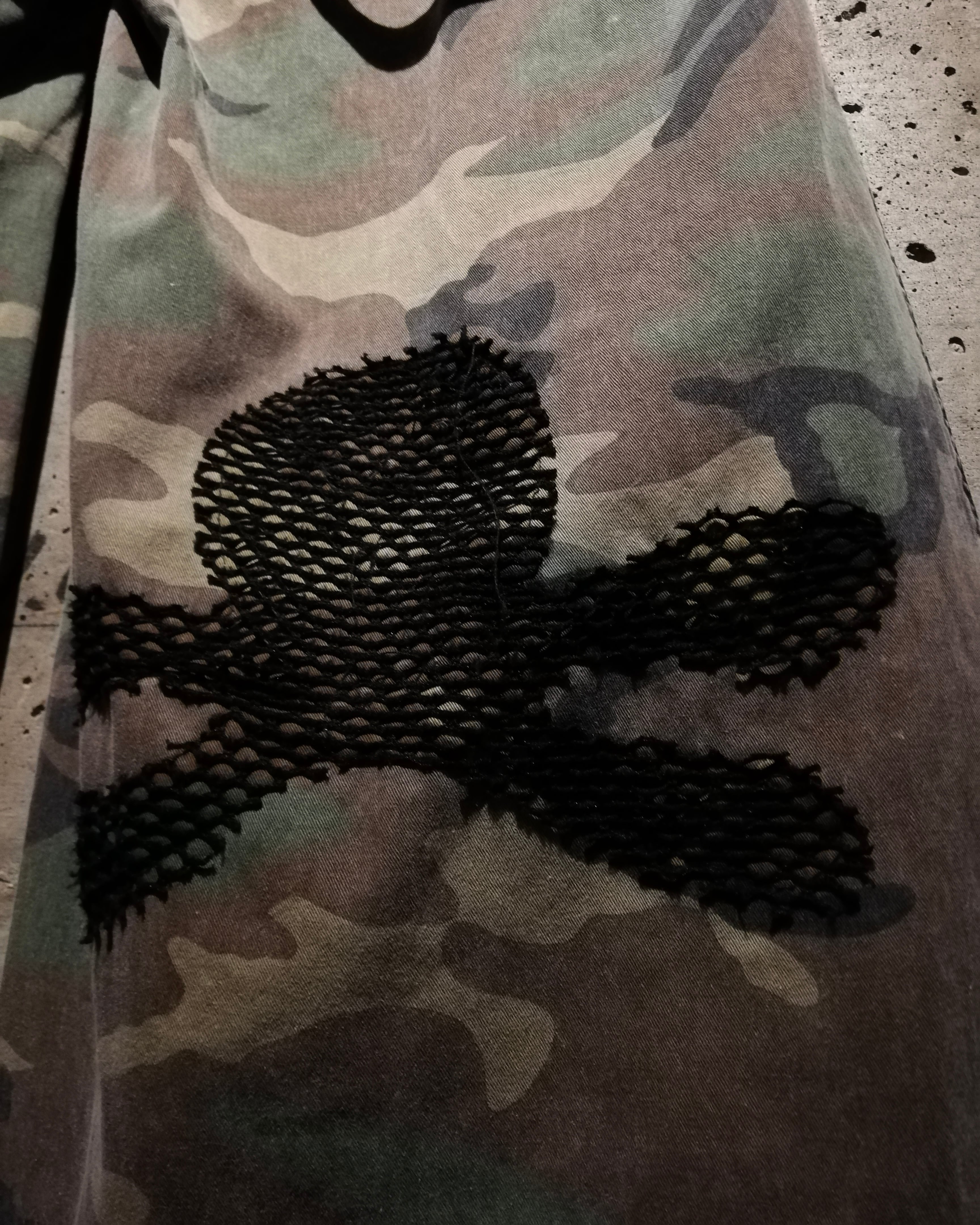 フロントのポケットと背面のスカルには黒のメッシュ生地を使用。そしてベルトやハトメ等の装飾と、このブランドらしくパンクなデザインにまとめ上げられています。