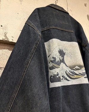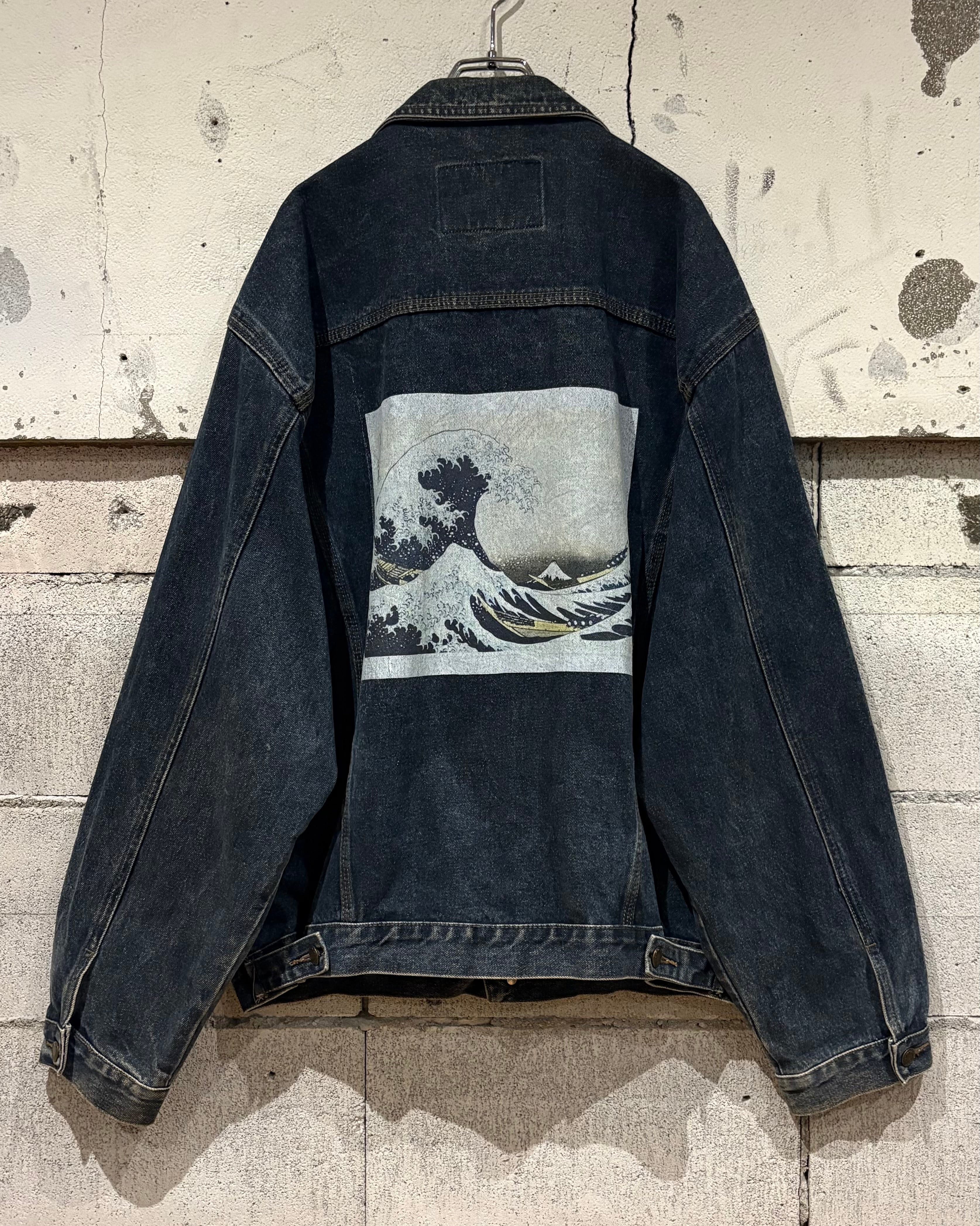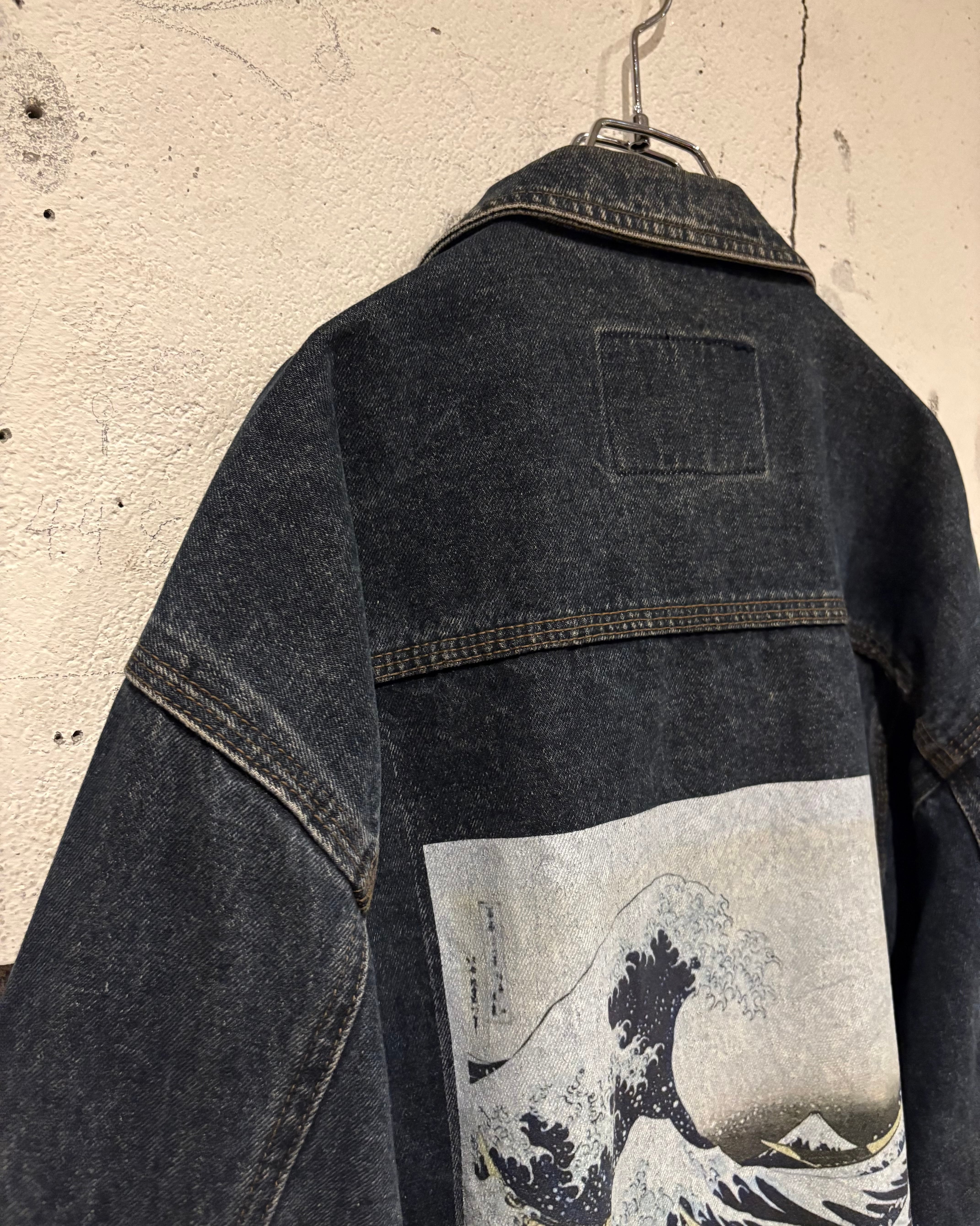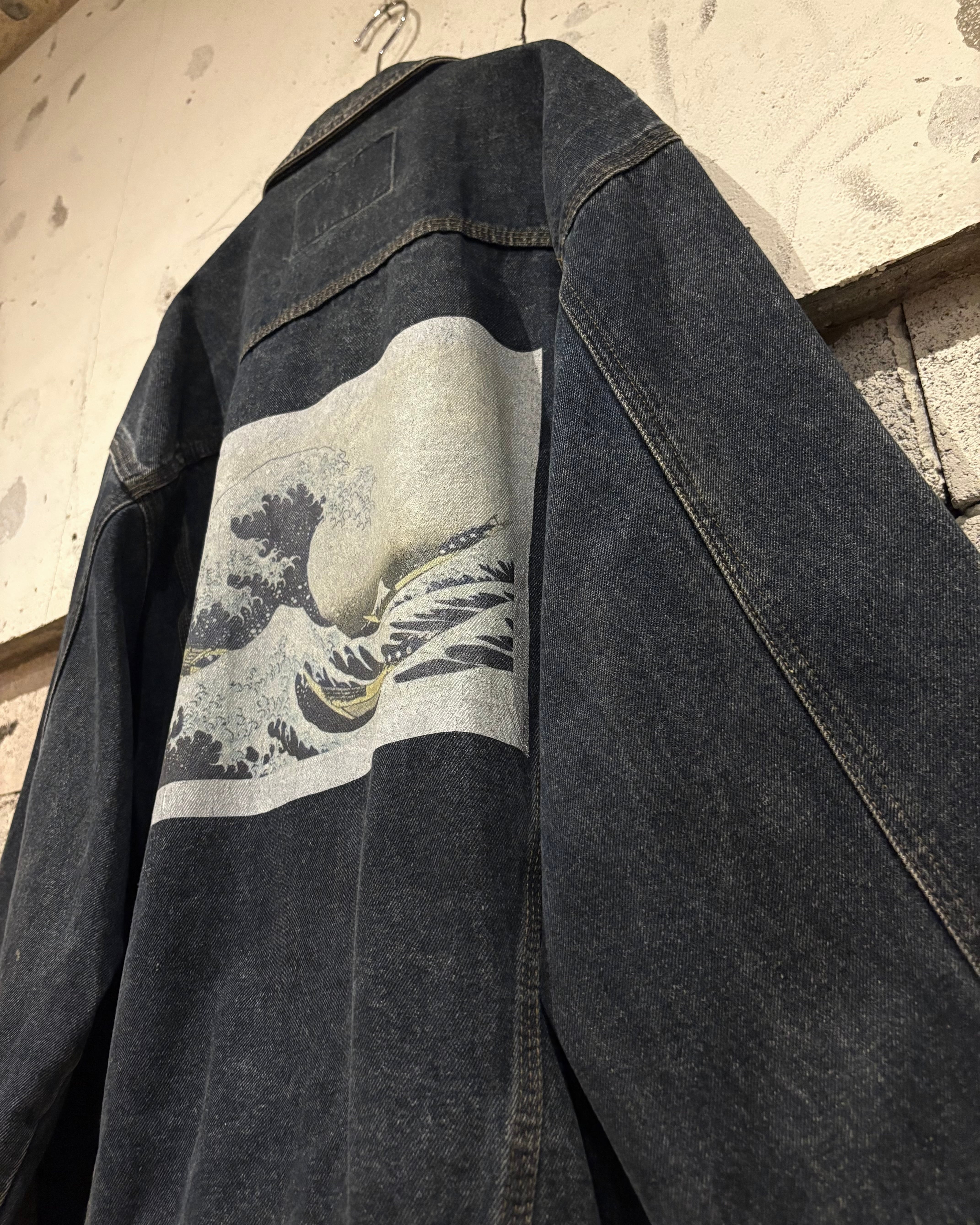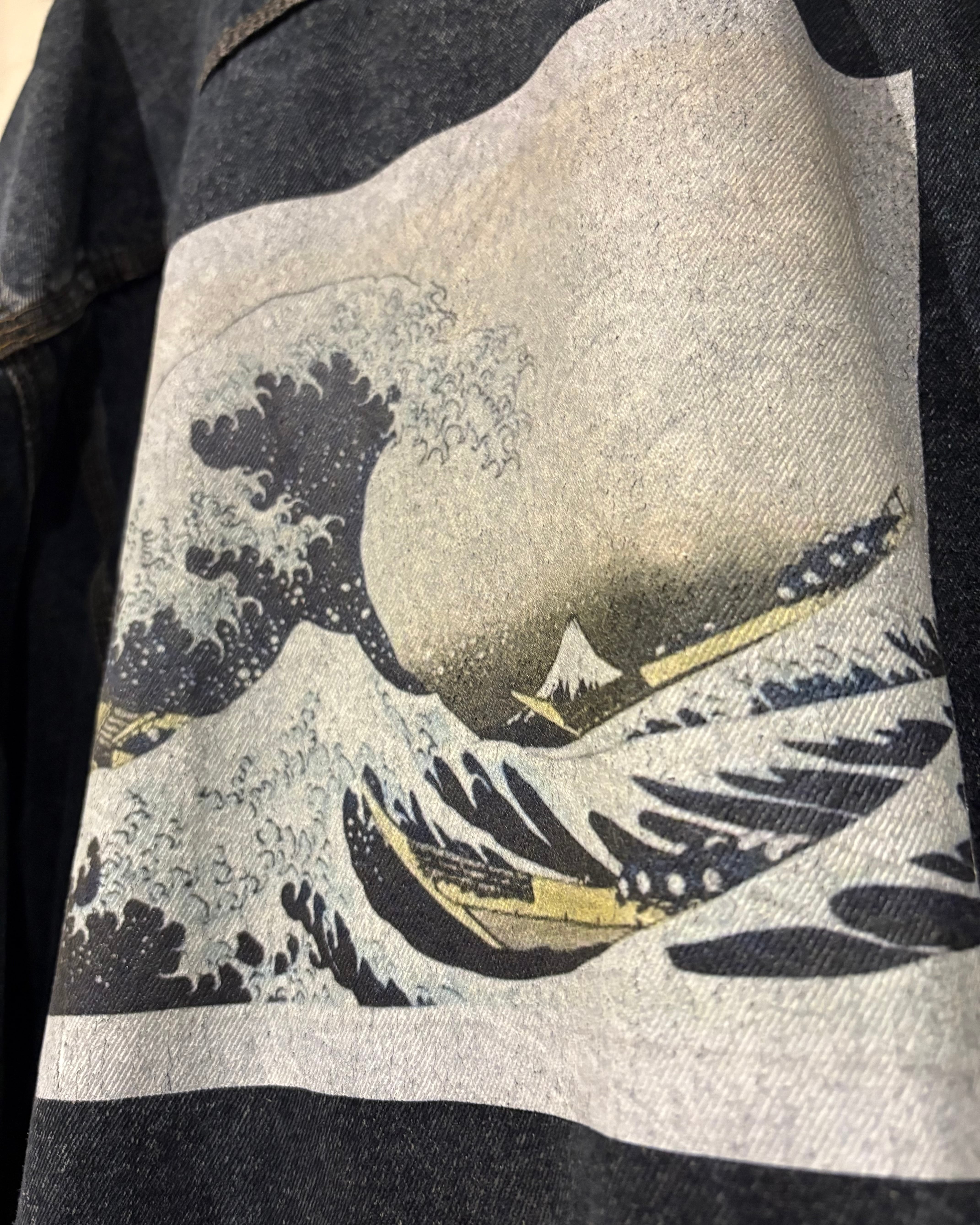 美しくフェードがかったボディに、葛飾北斎の『冨嶽三十六景の神奈川沖浪裏』を背面にプリントで載せたデニムジャケット。