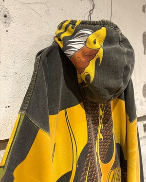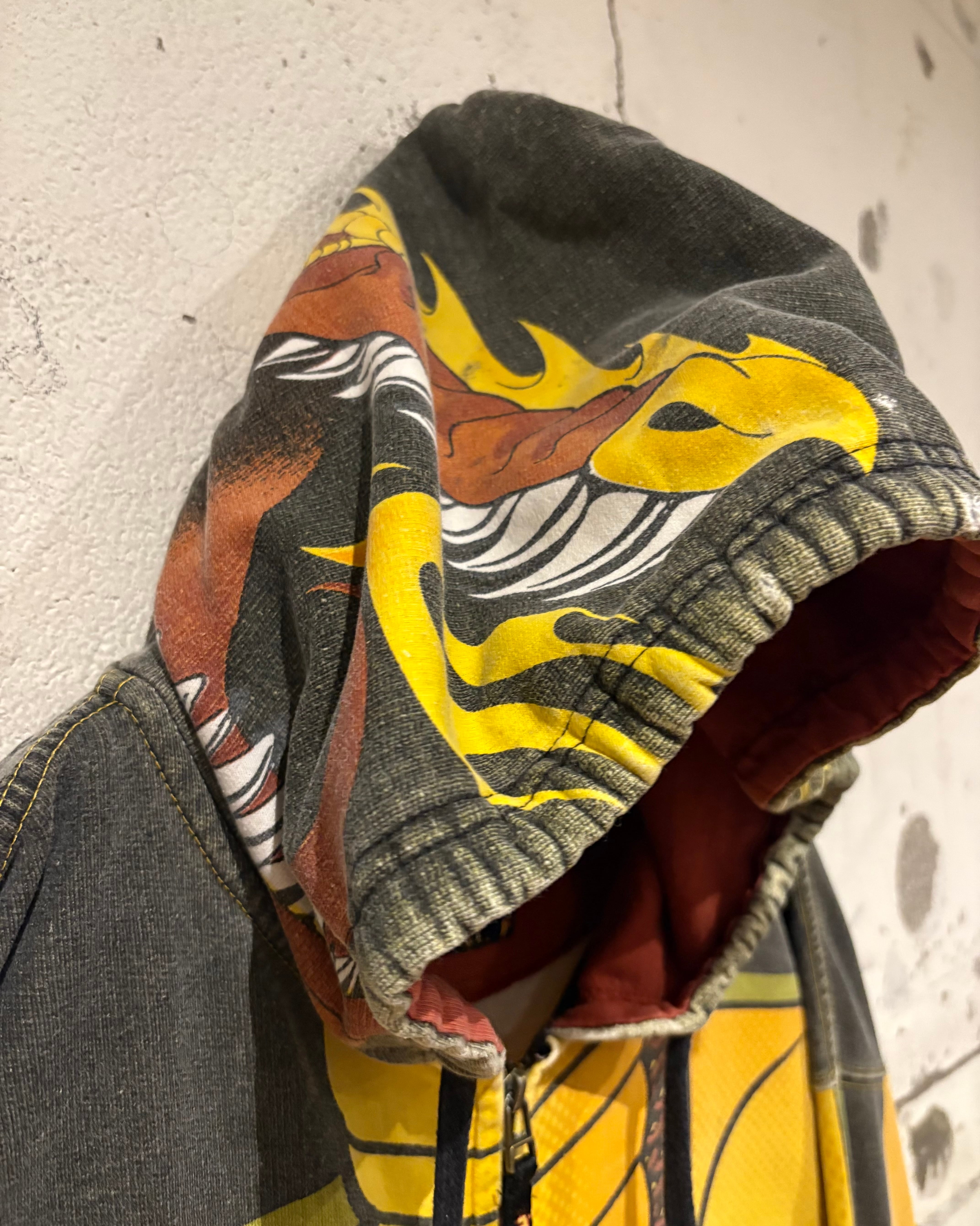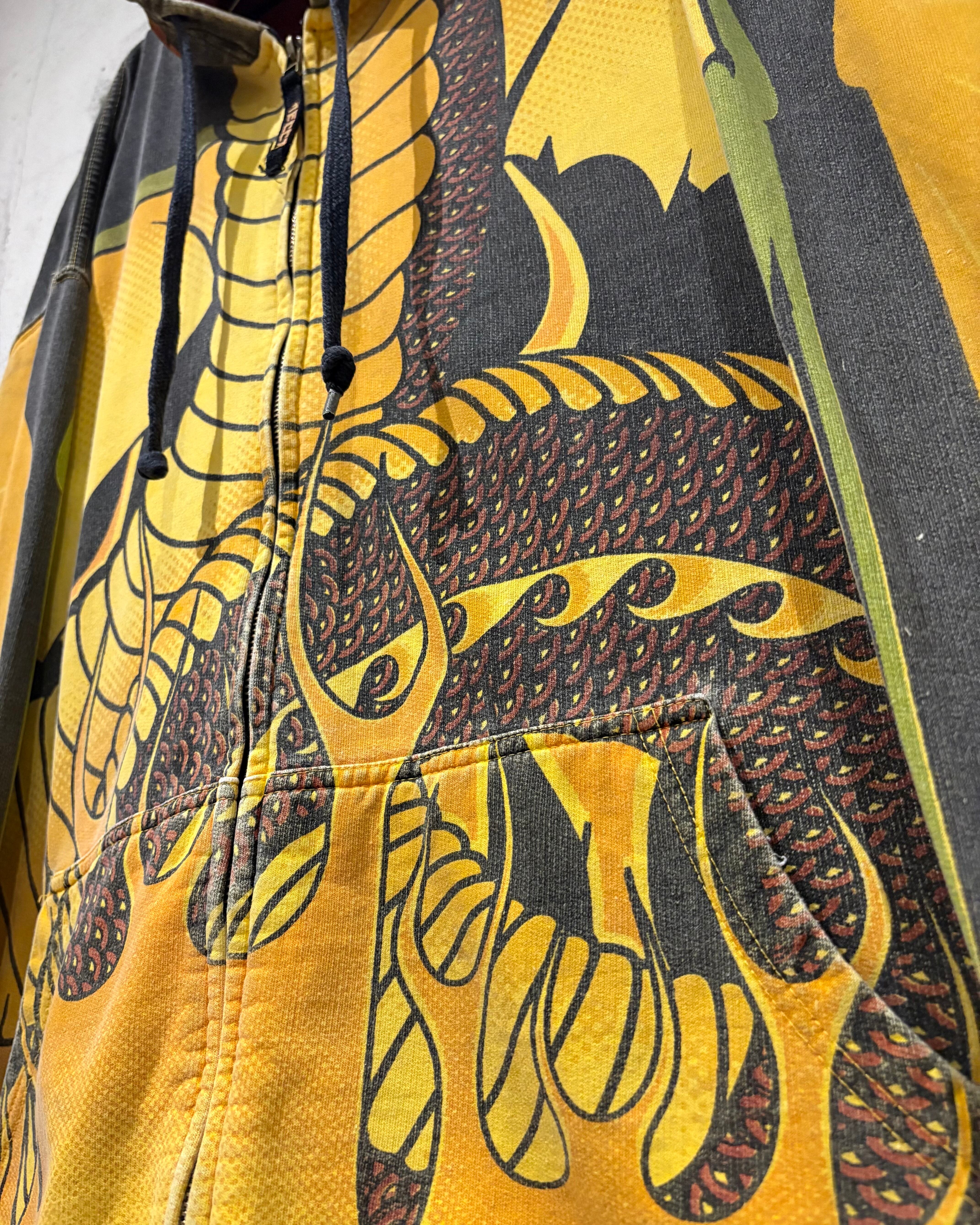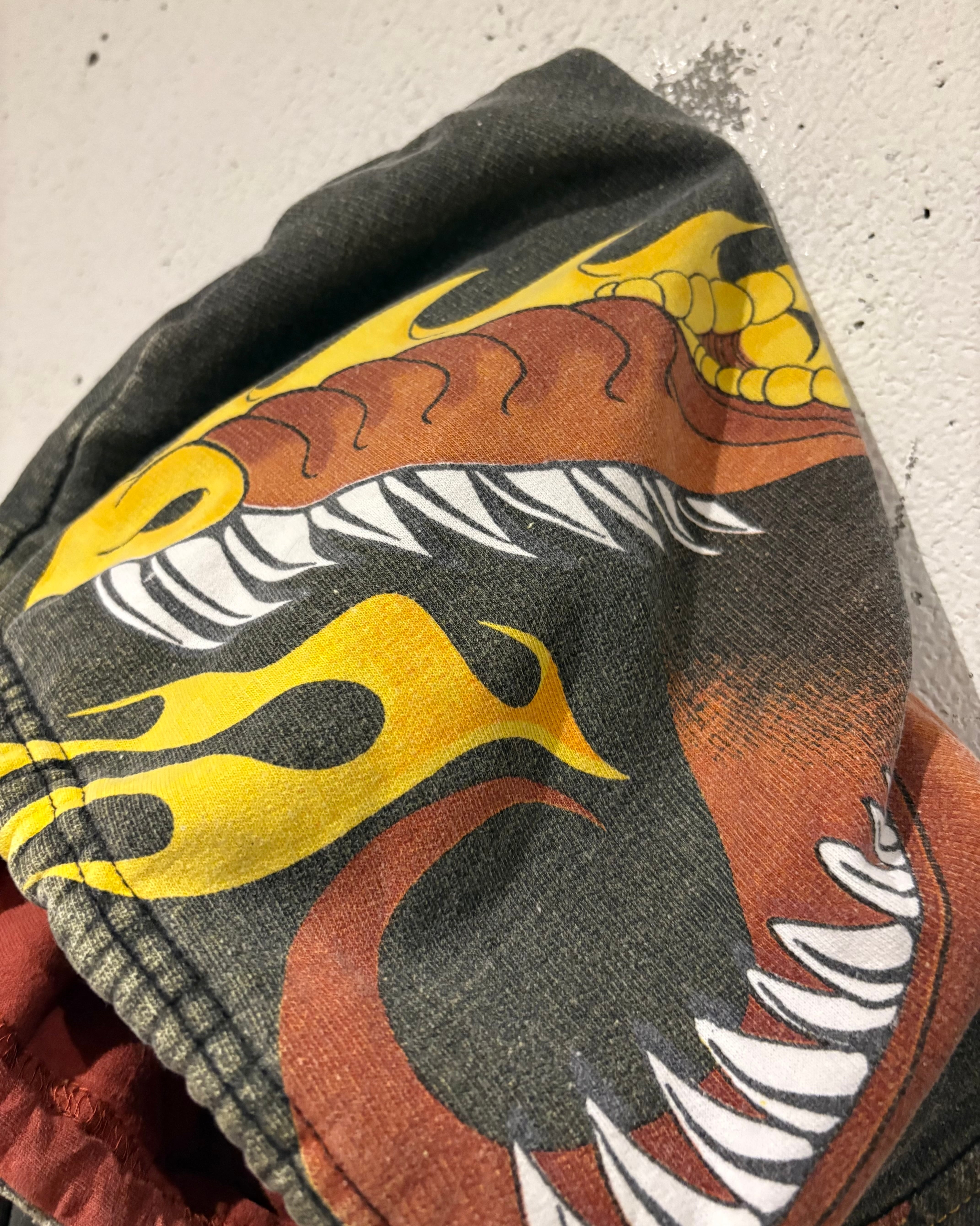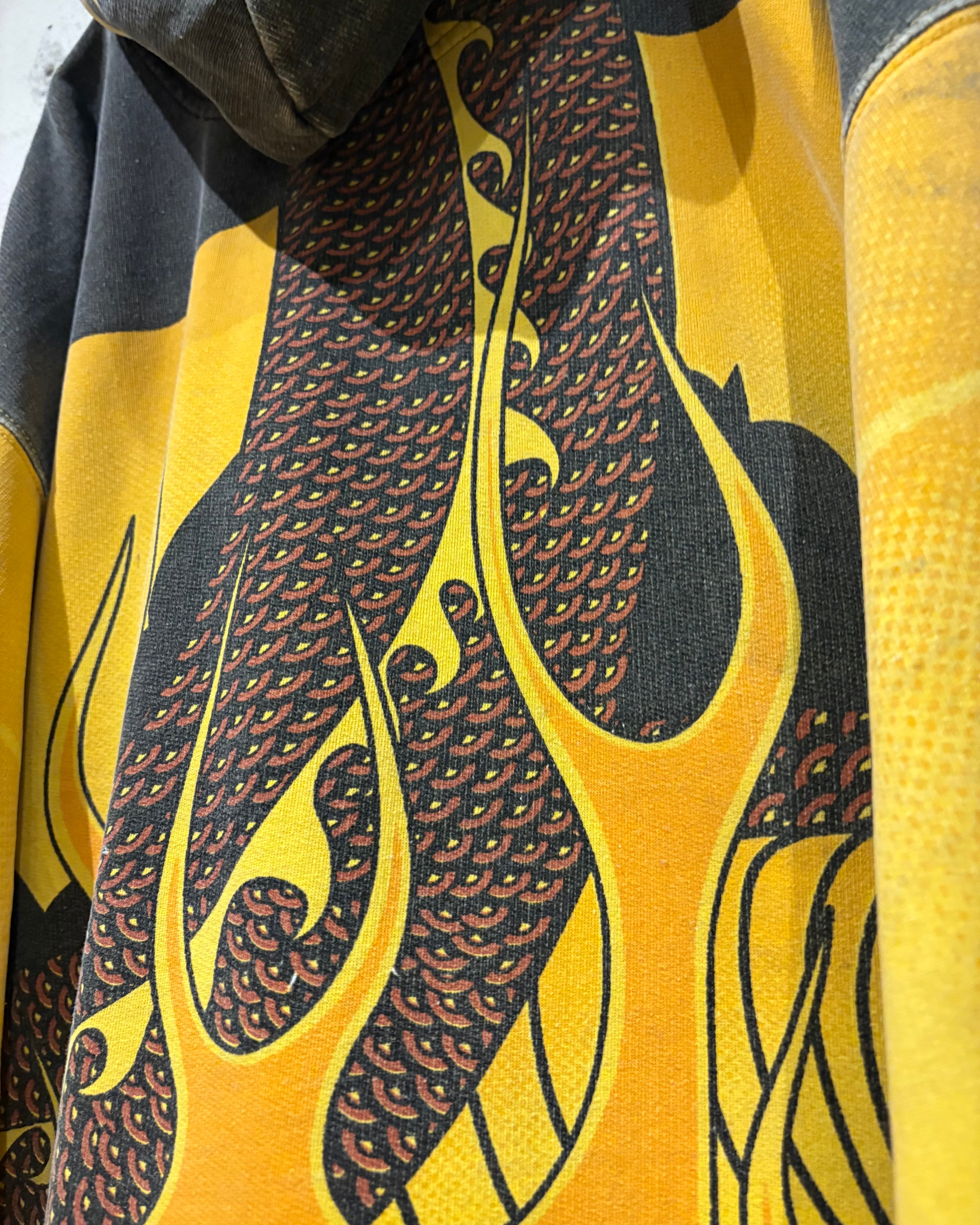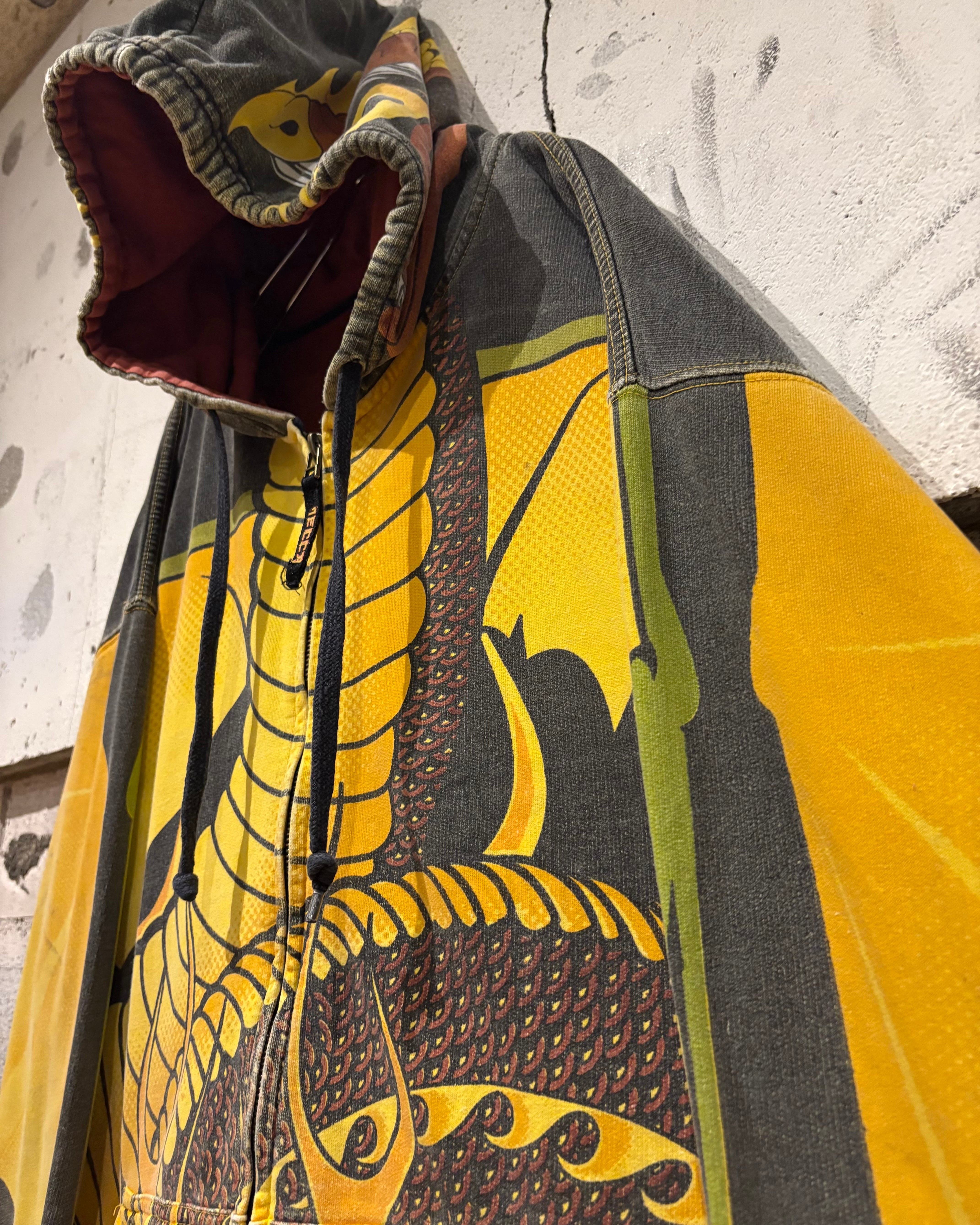 炎が燃え盛るデザインに、ボディ部分には龍の胴体、そしてフード部分には頭をプリントした、オーバーなデザインからは当時のストリートのムード感をヒシヒシと感じられます。