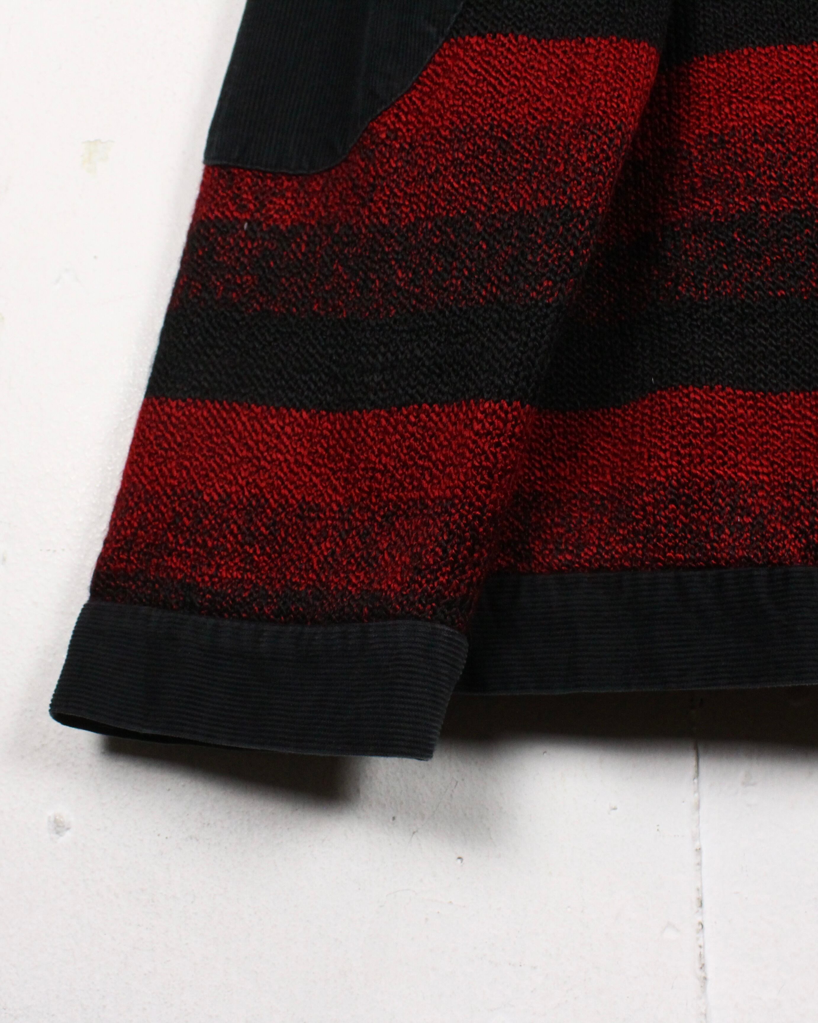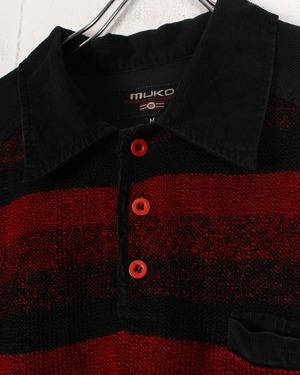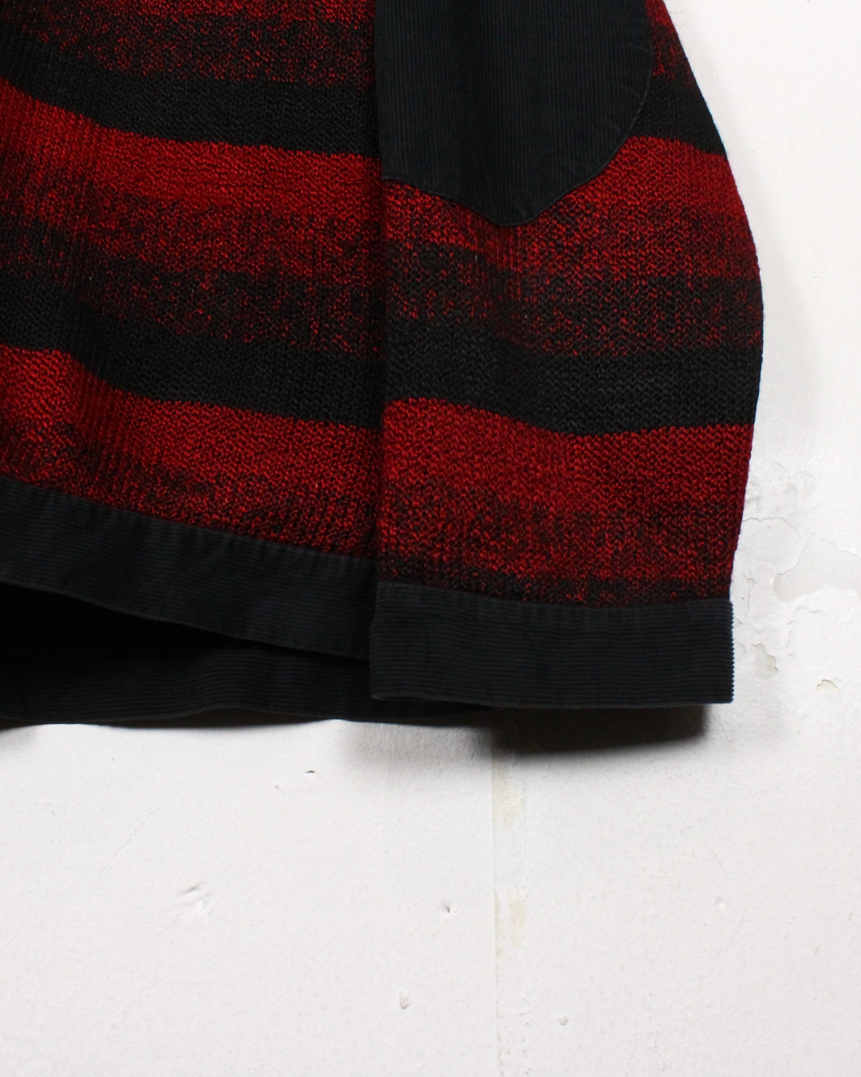 赤× 黒のグラデーションが美しいボーダーに仕上げられたボディに、襟、ポケット口、エルボーパッチ、袖口や裾に黒の細畝コーデュロイを切り替えた長袖ニットポロ。