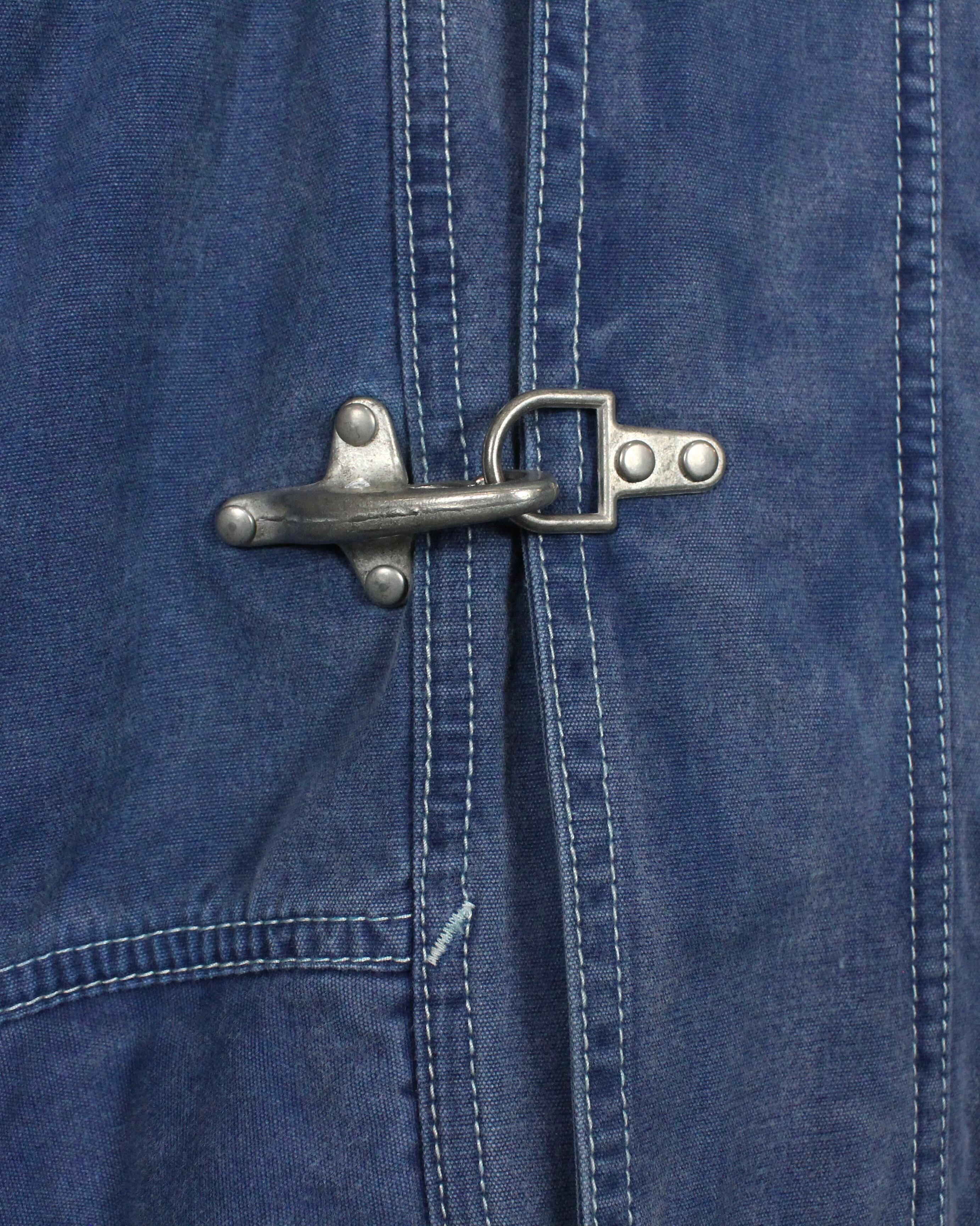経年によるフェードが非常に美しいダック地のボディに、フロントに重厚感のあるシルバーのファイアーマンバックルを載せた1着。