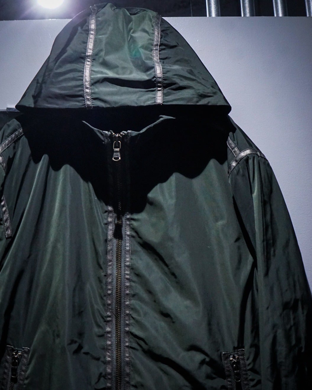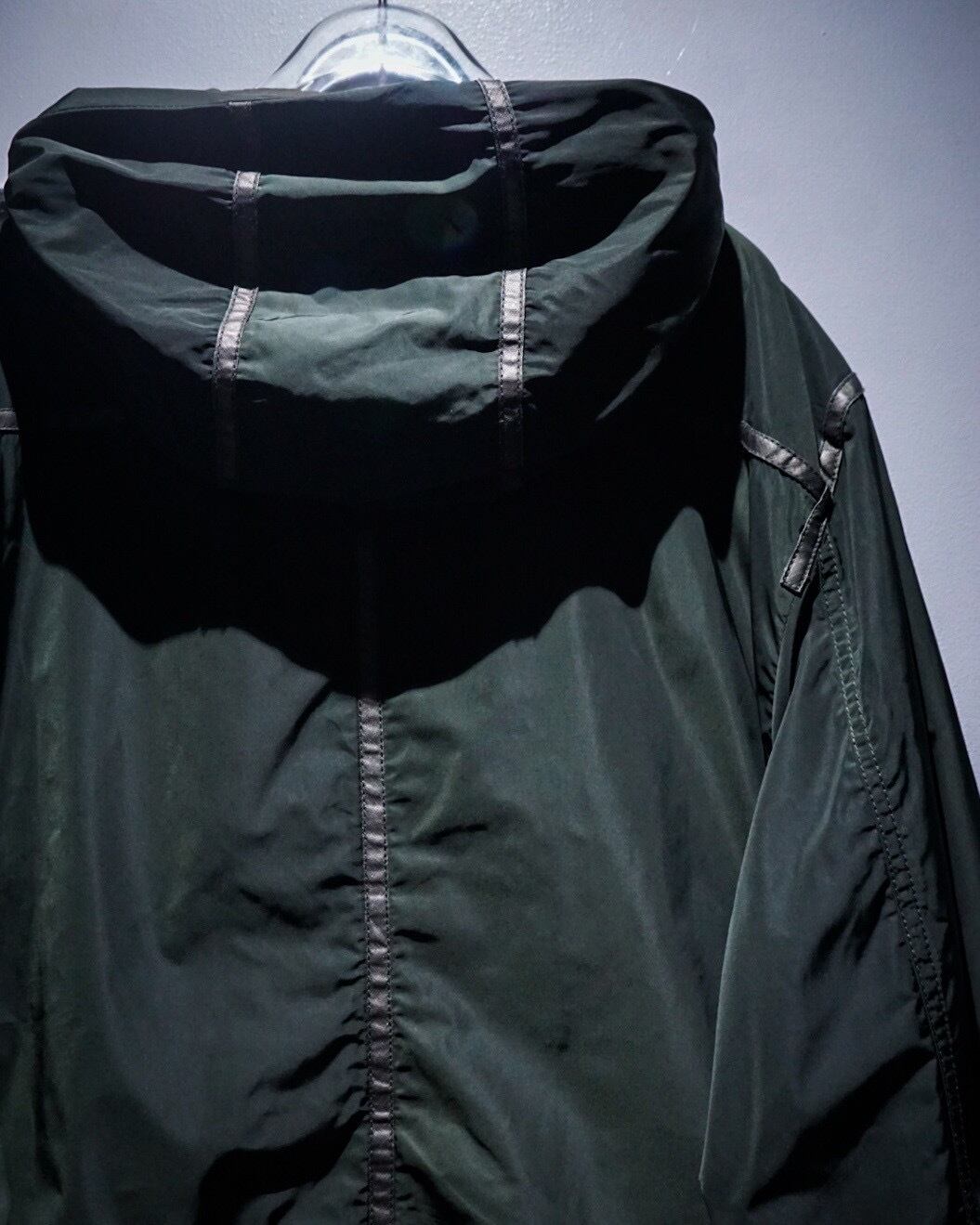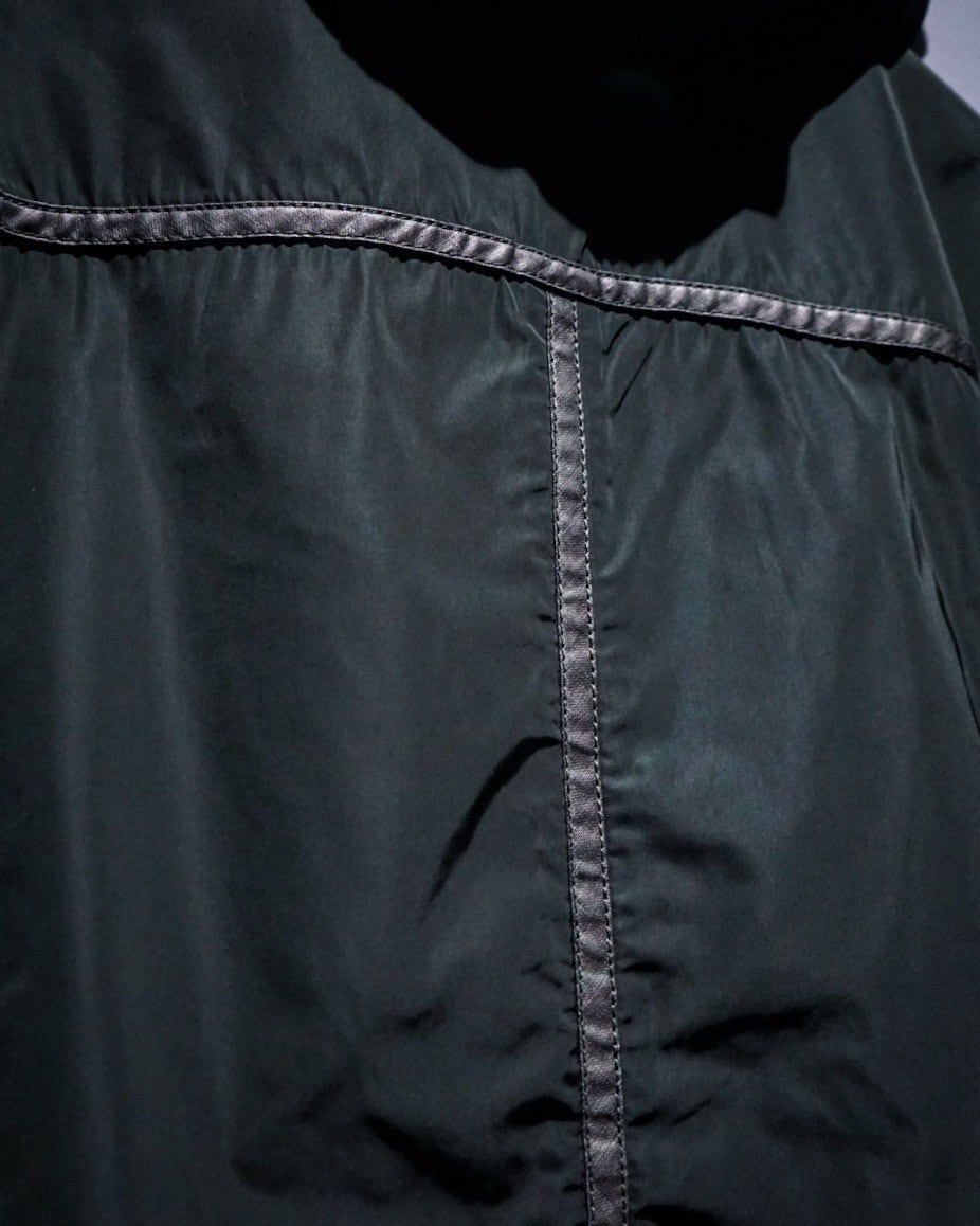 シャリ感のあるポリエステルのボディに、光沢のあるテキスタイルでシームに沿ってラインを施したジップアップジャケット。