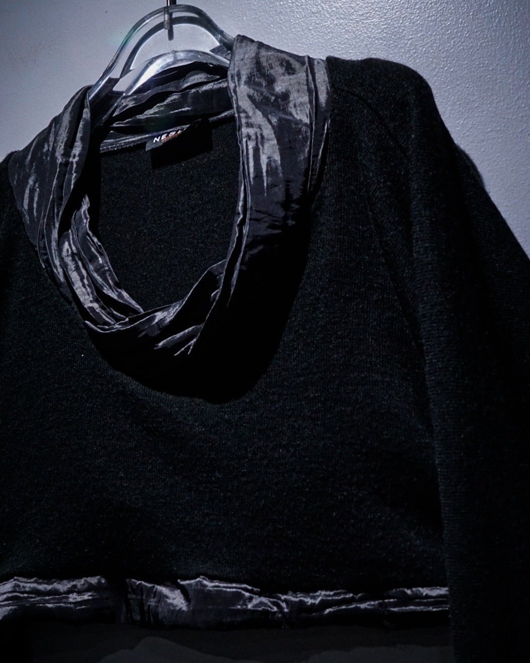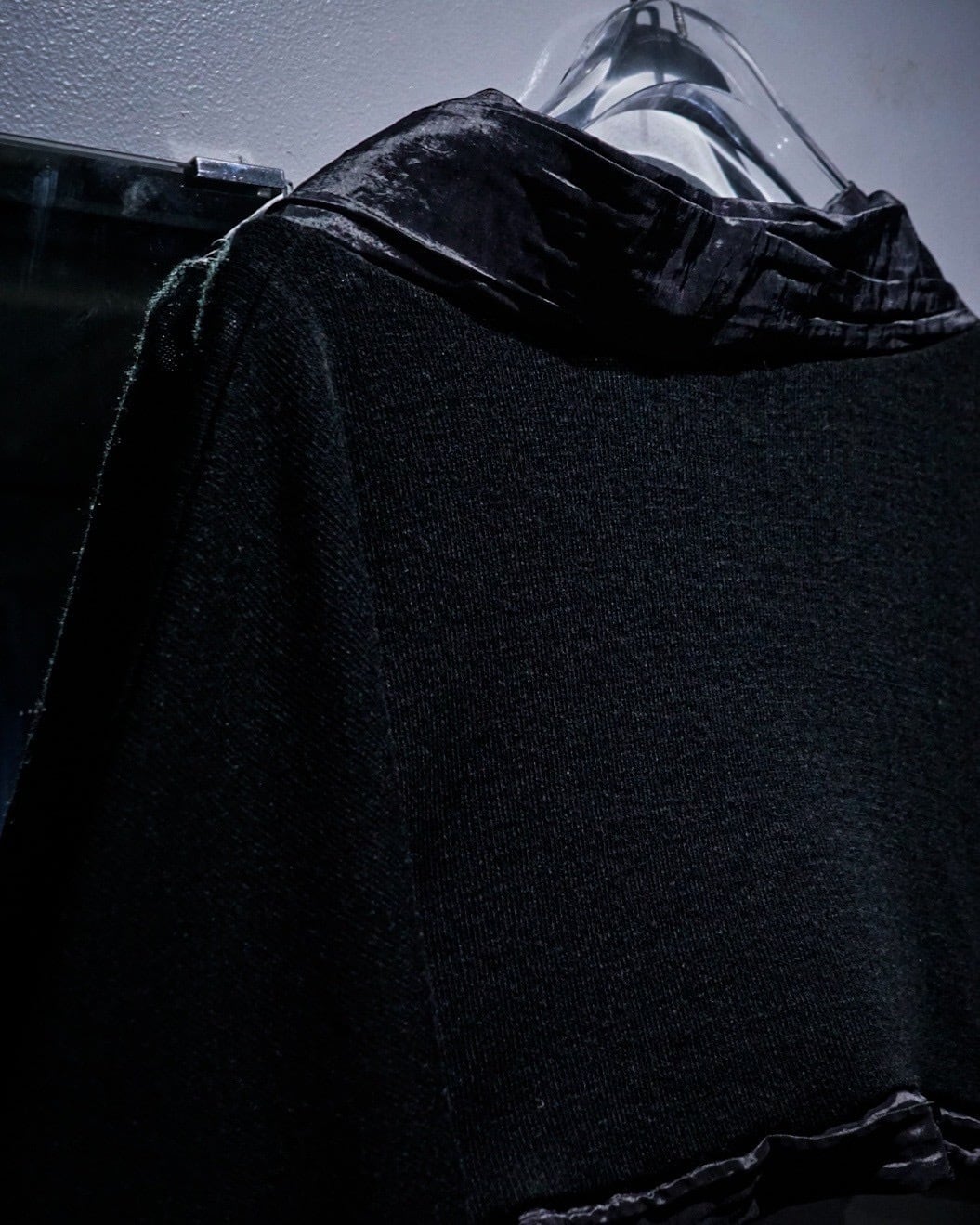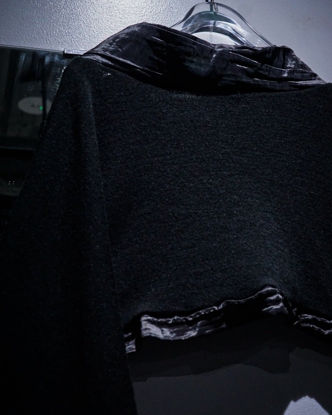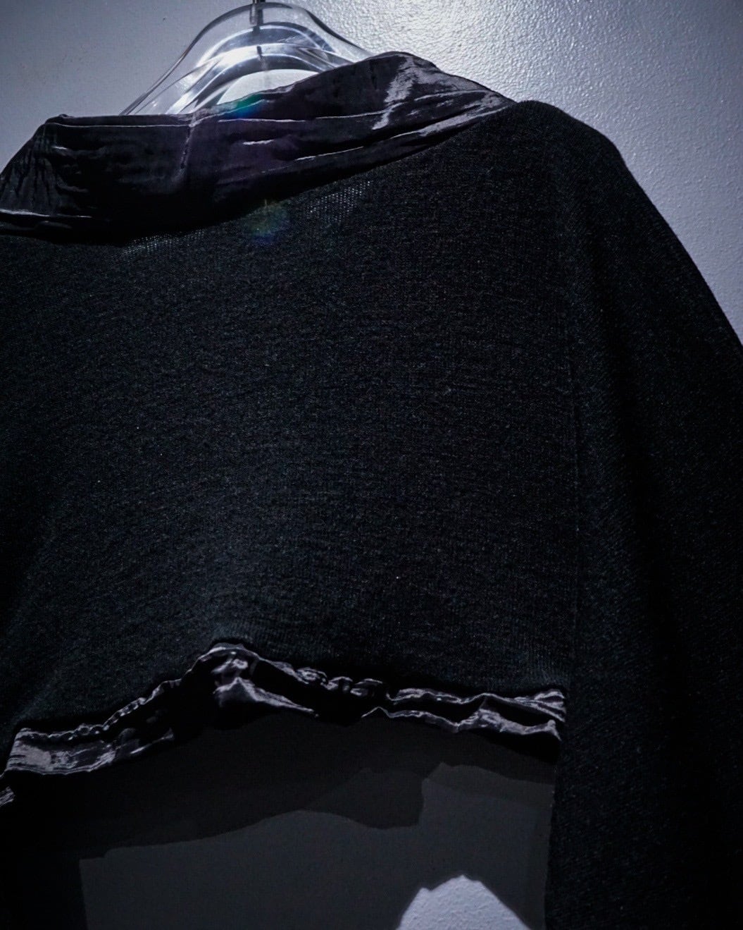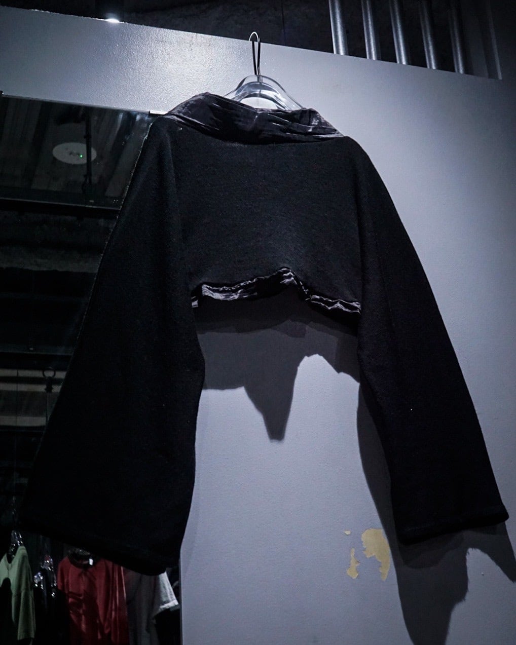 ブラックのボディに、首元、裾にツルッと光沢のあるテキスタイルを切り替えた、超短丈のプルオーバー。