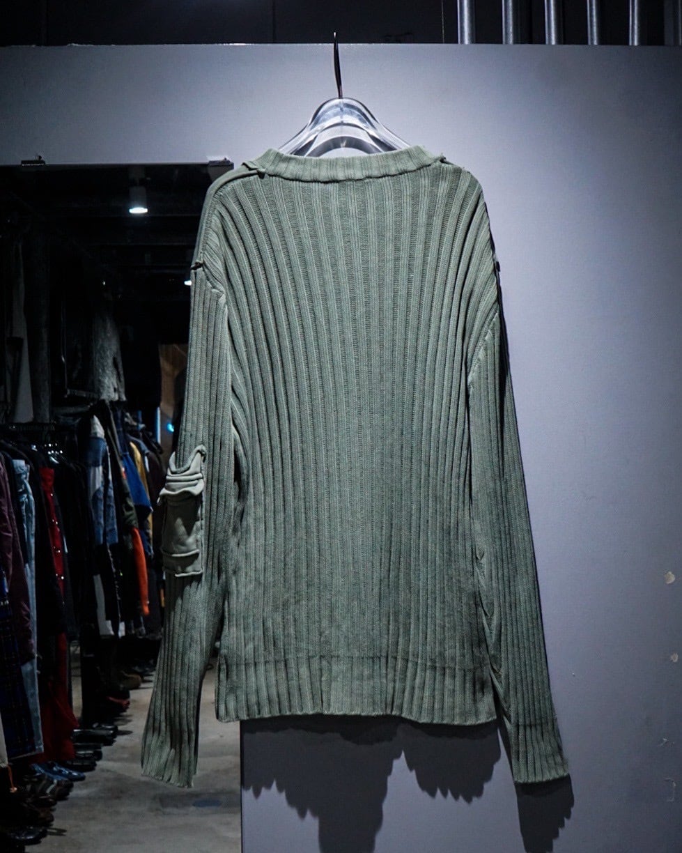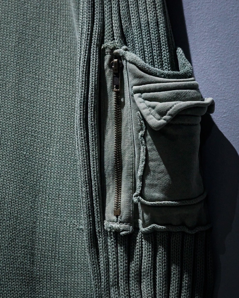 ピスタチオグリーンのボディをベースに、肩、アームに付属したポケットにスウェット生地を切り替えた長袖ニット。