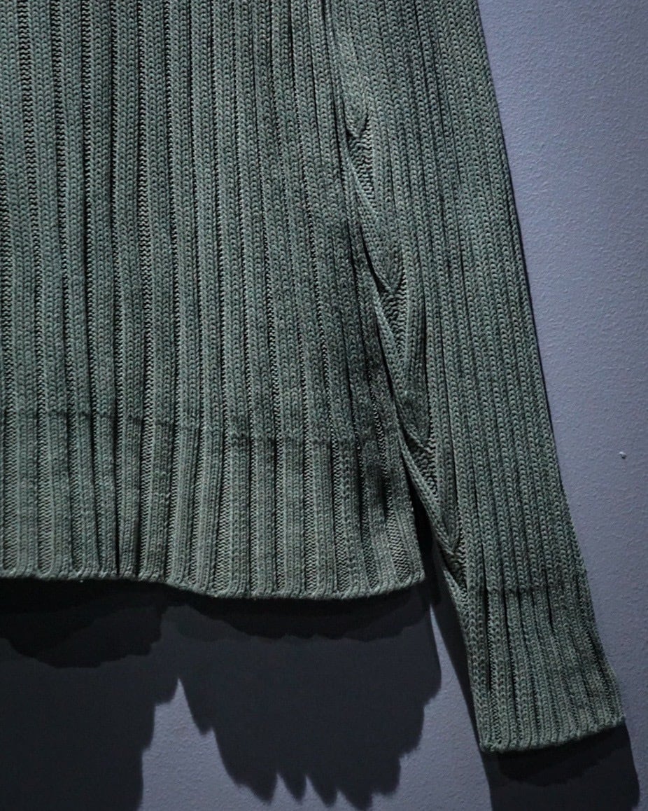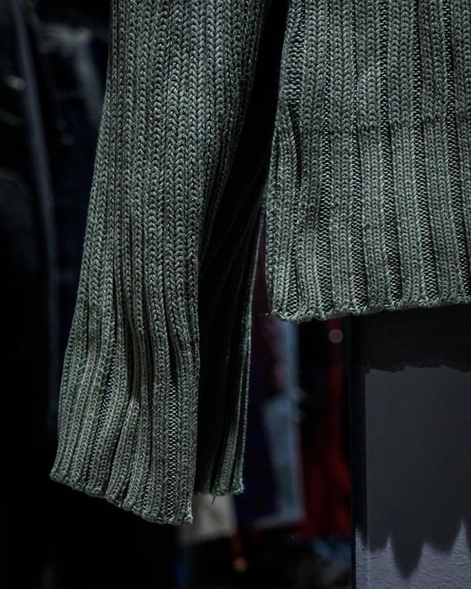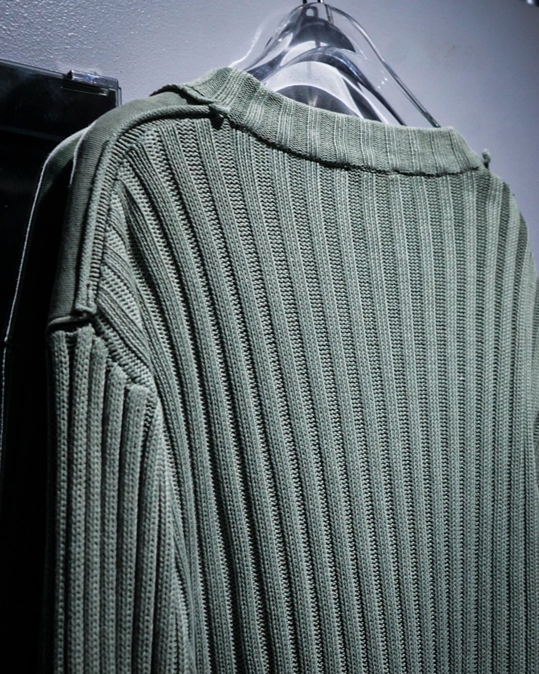 ボディ各所に縫い代を表に出したインサイドアウトのデザインを施し、絶妙な退廃感を表現。首元、アーム、ボディサイド、裾にはリブニットを切り替えたことでデザインにコントラストが生み出されています。