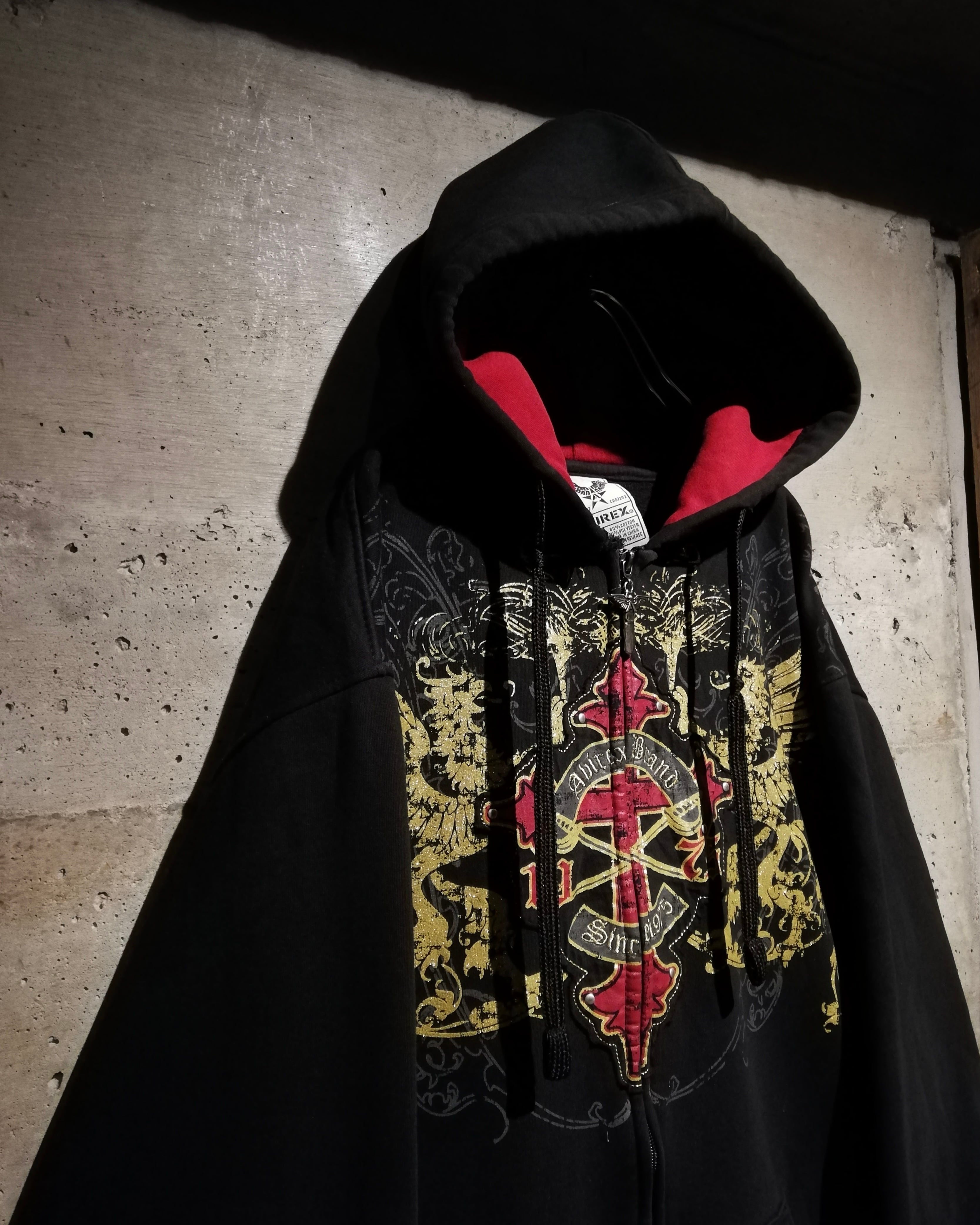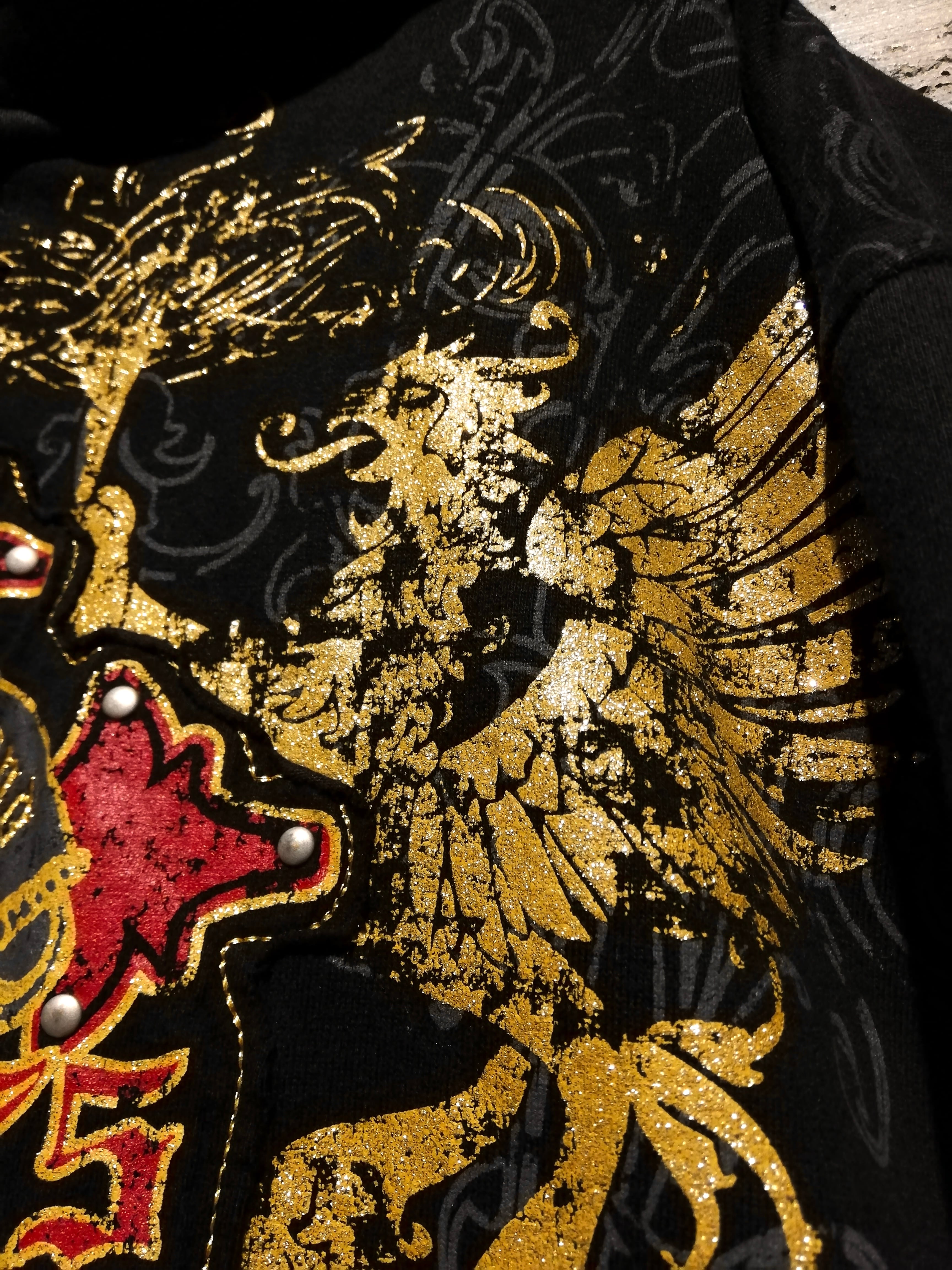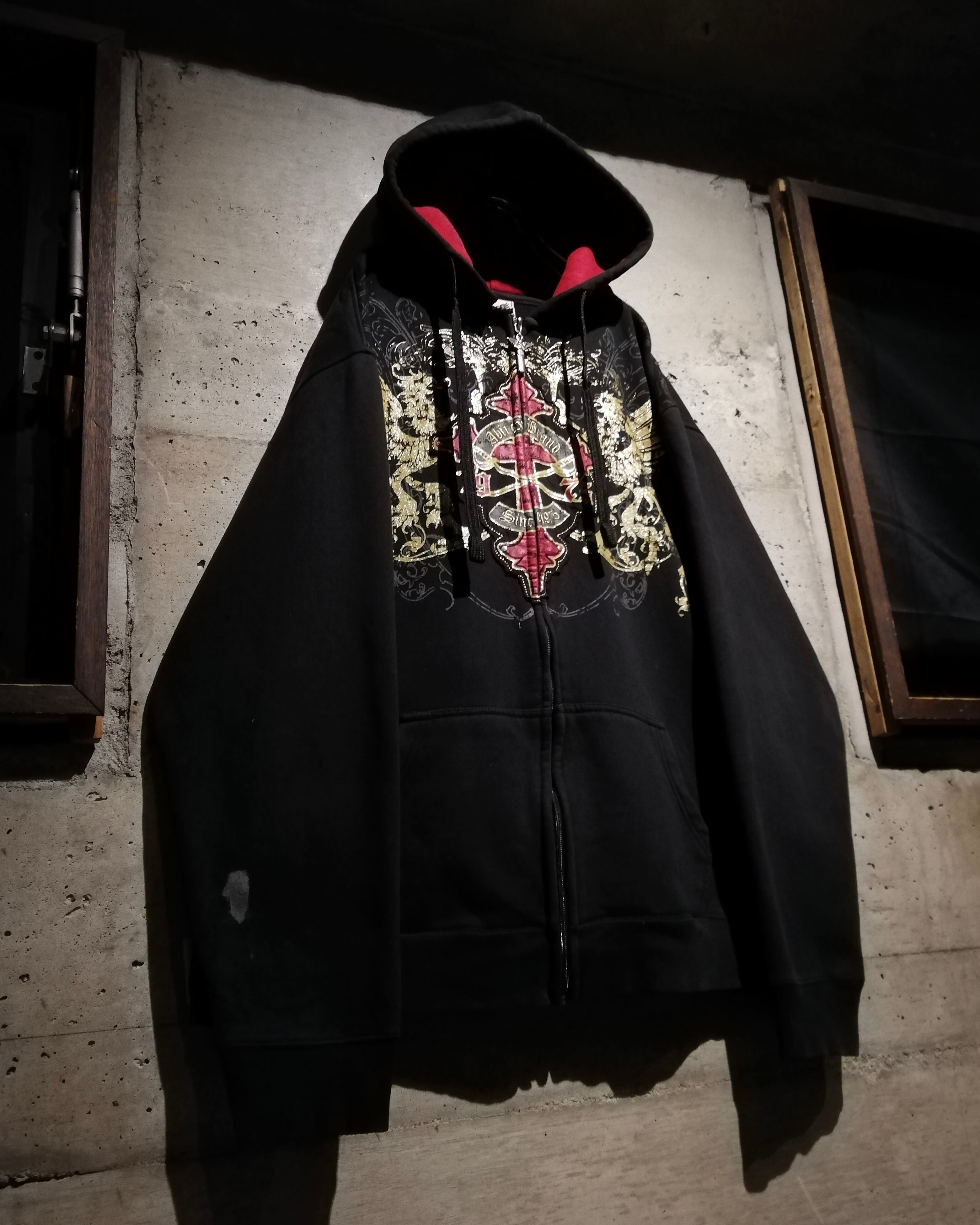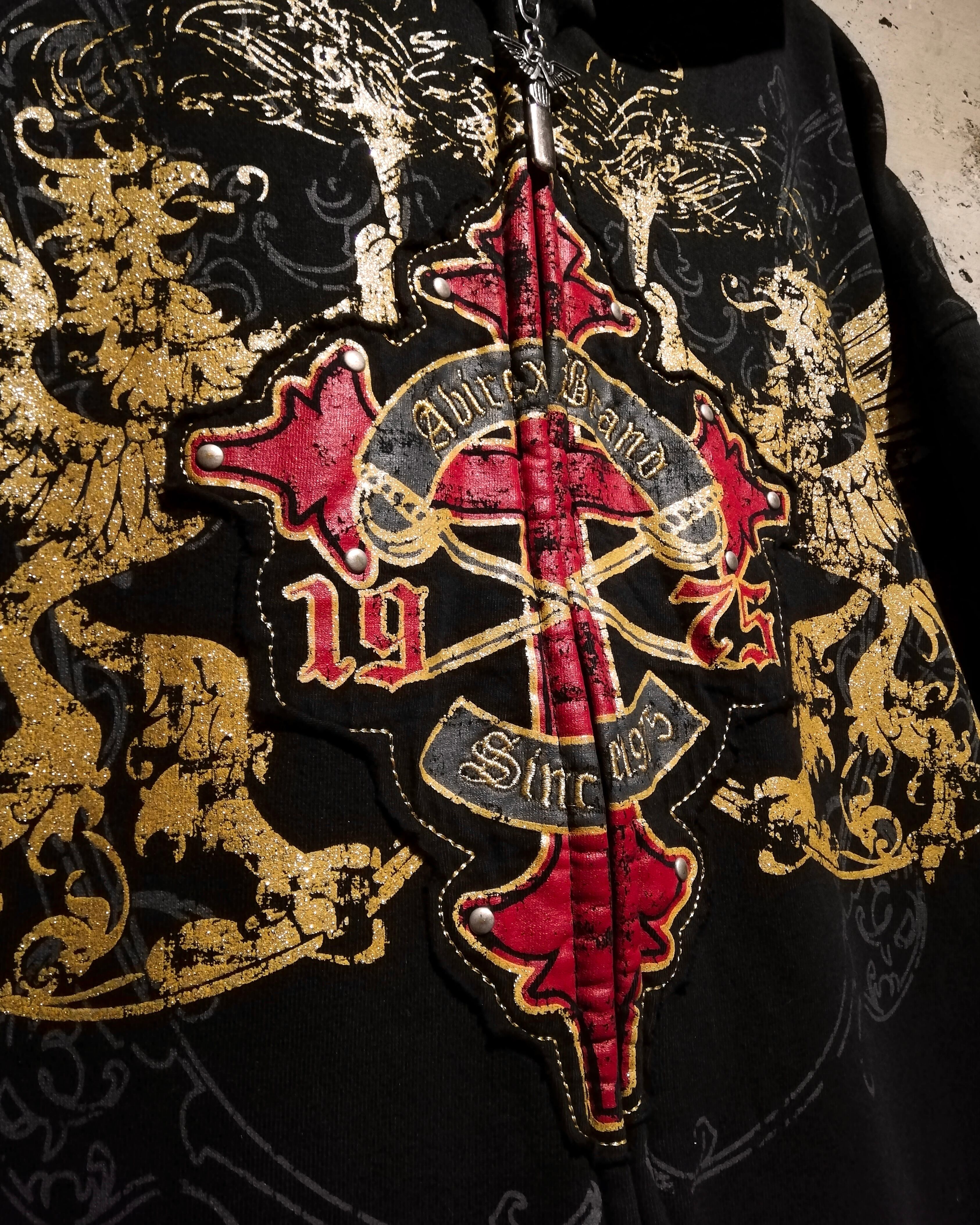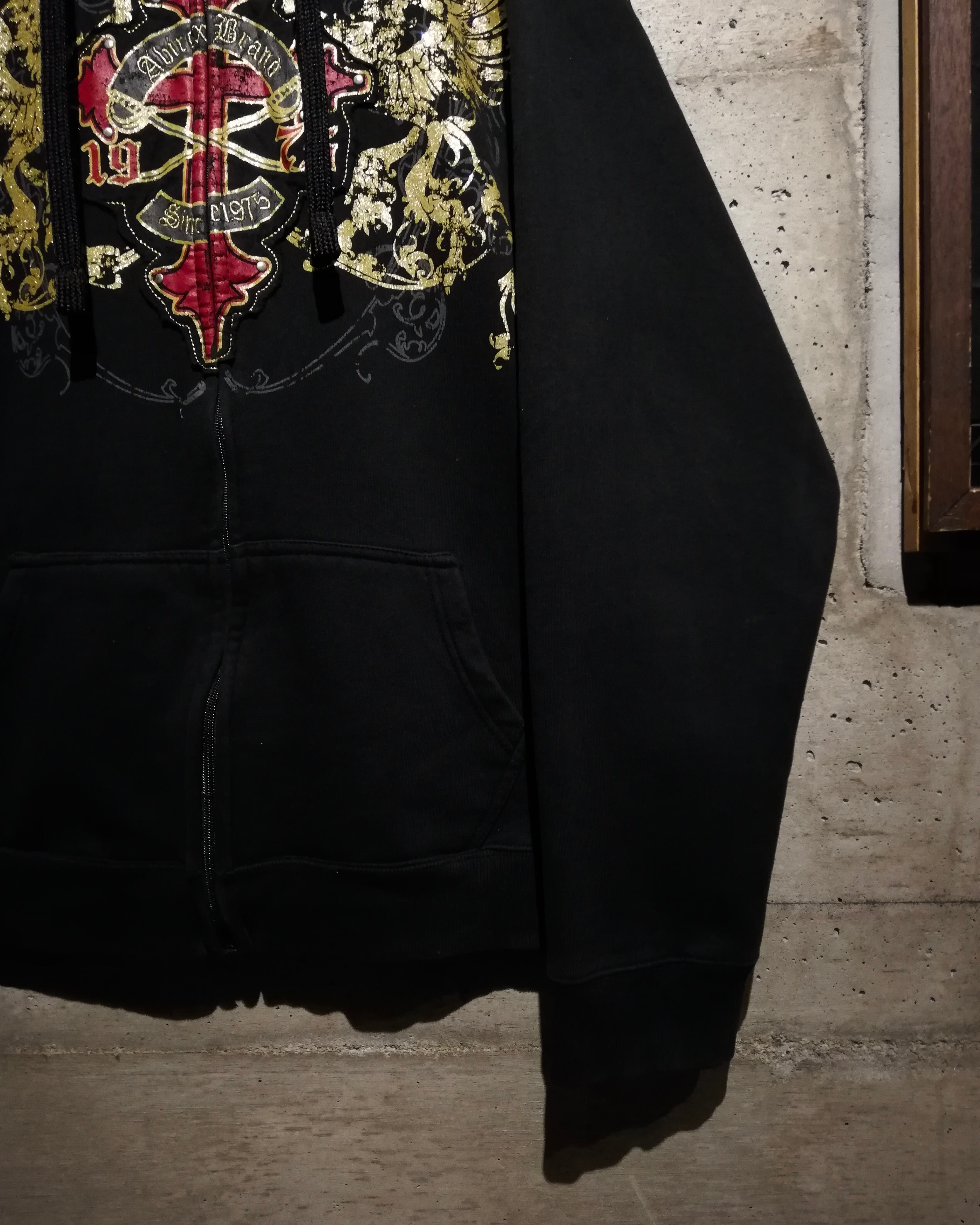 深みのあるブラックのボディをベースに、フロントにはクロスのパッチ、ラメプリントによってグリフォン、パッチには刺繍やスタッズを打ち込んだ、当店らしいbling-blingなデザインを載せたジップフーディー。