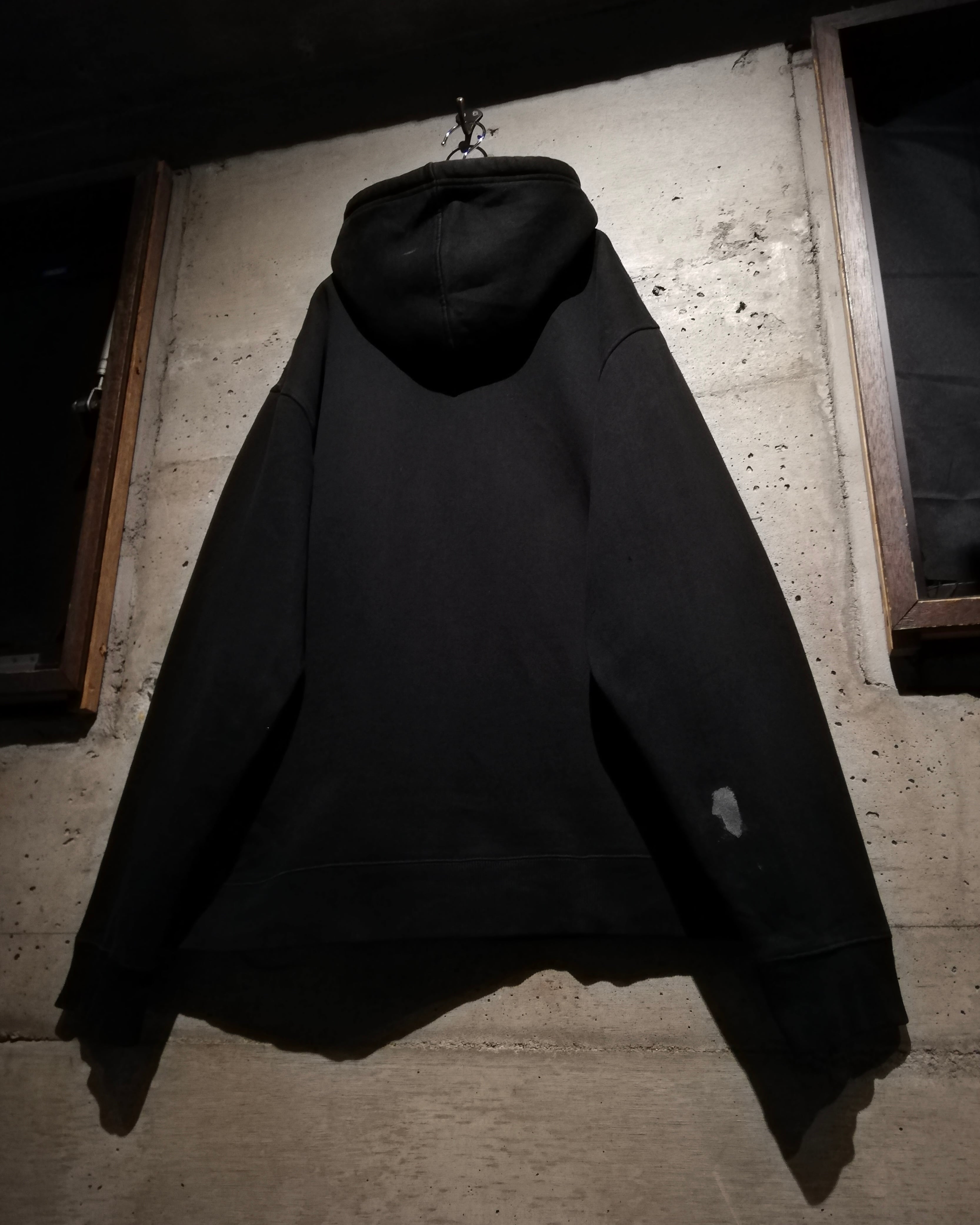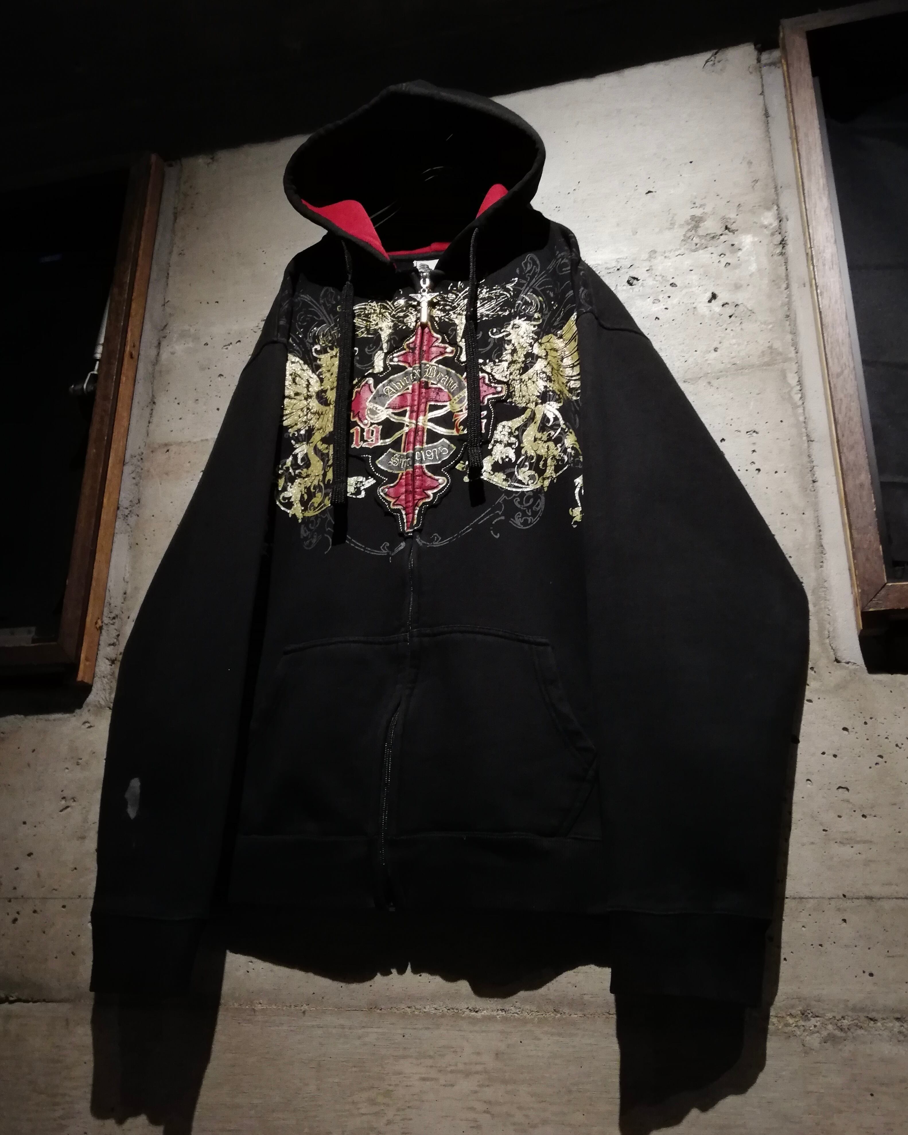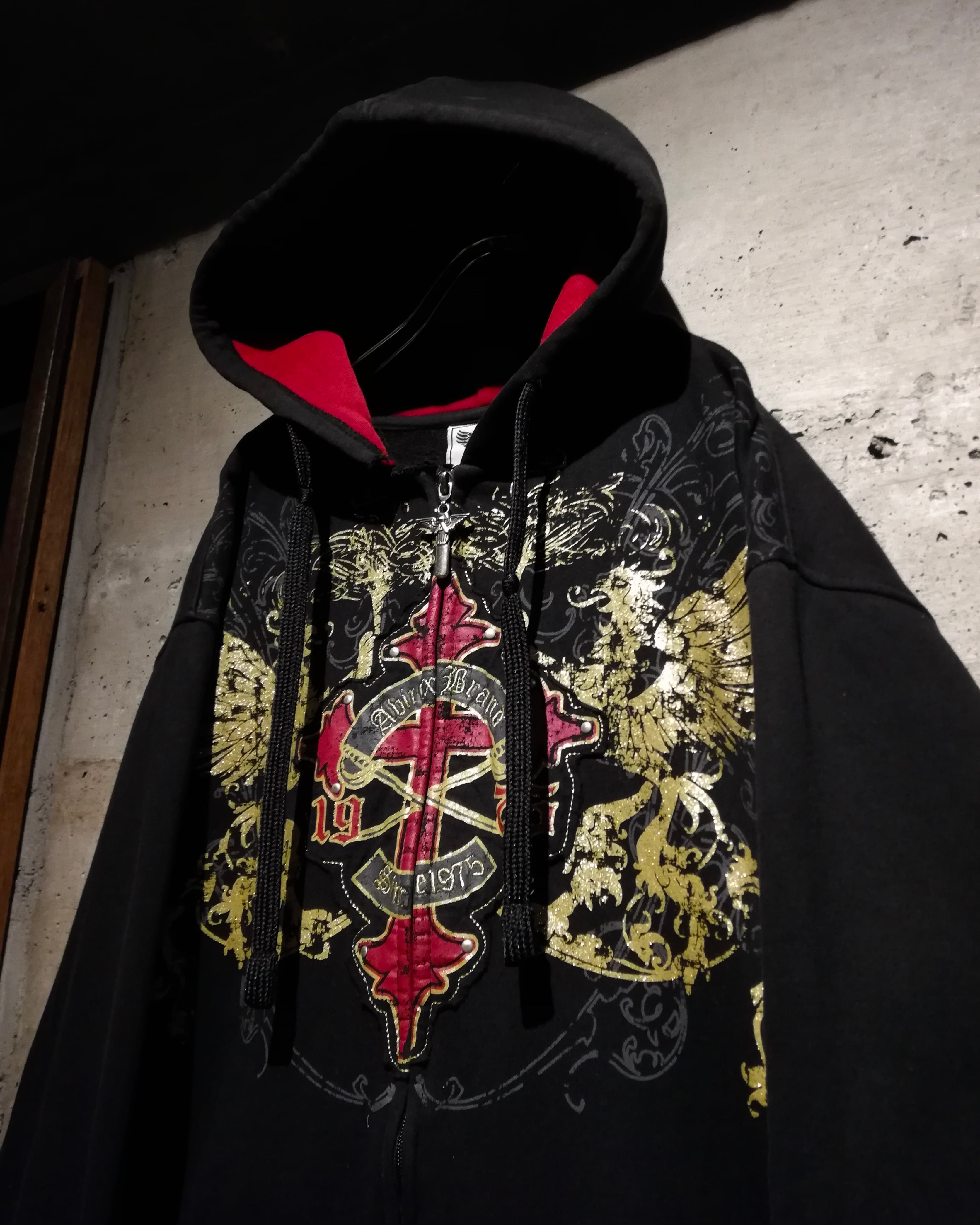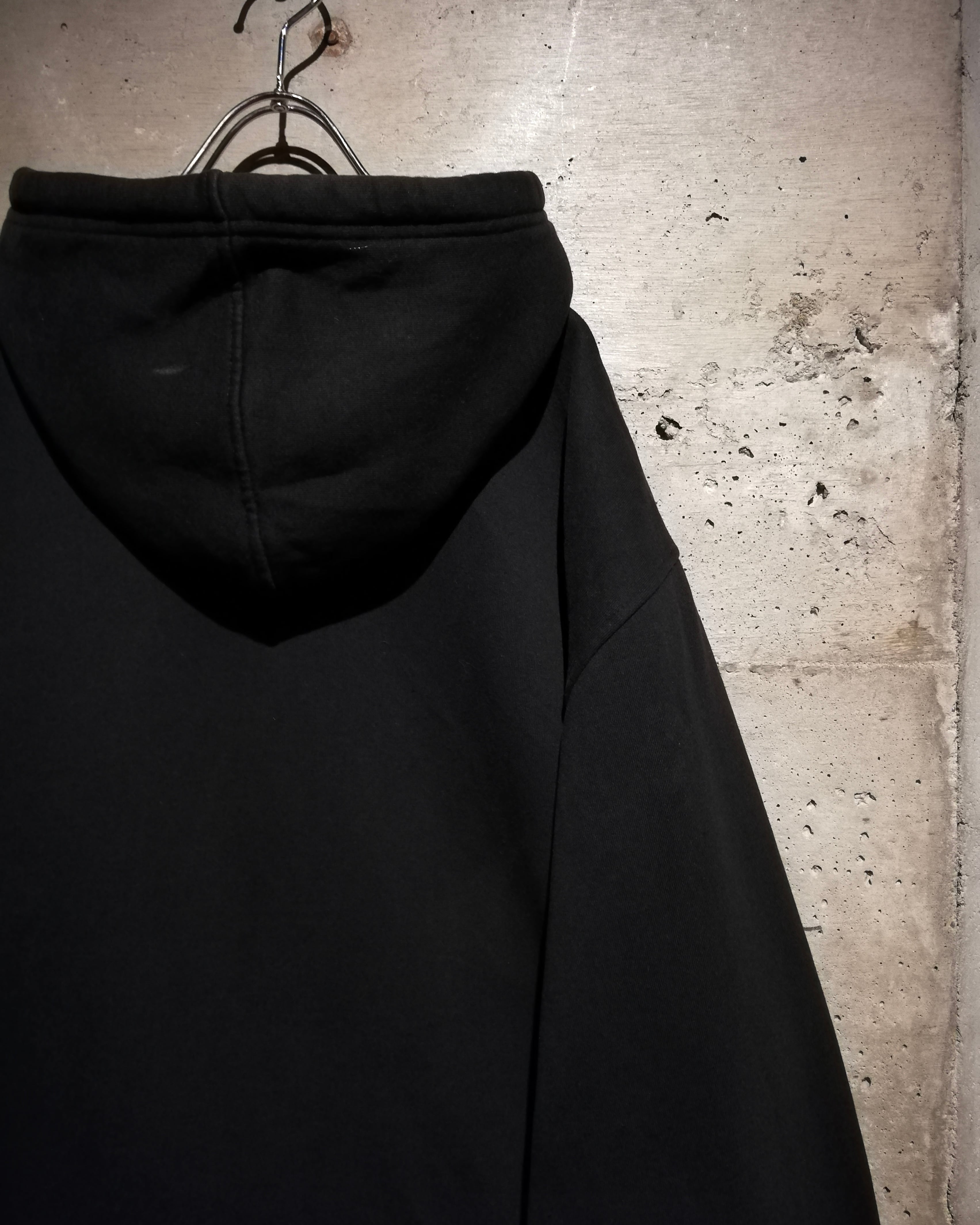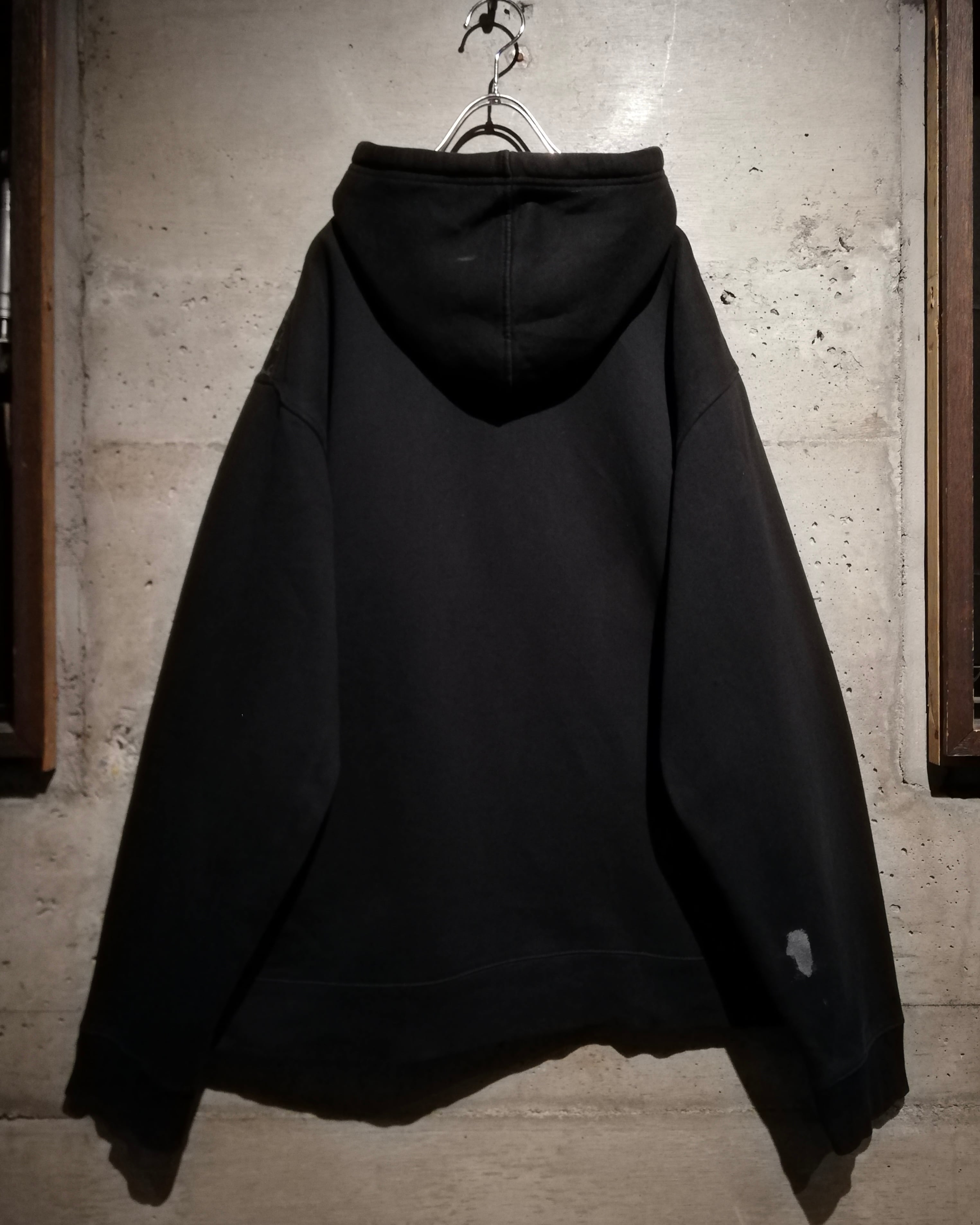 深みのあるブラックのボディをベースに、フロントにはクロスのパッチ、ラメプリントによってグリフォン、パッチには刺繍やスタッズを打ち込んだ、当店らしいbling-blingなデザインを載せたジップフーディー。