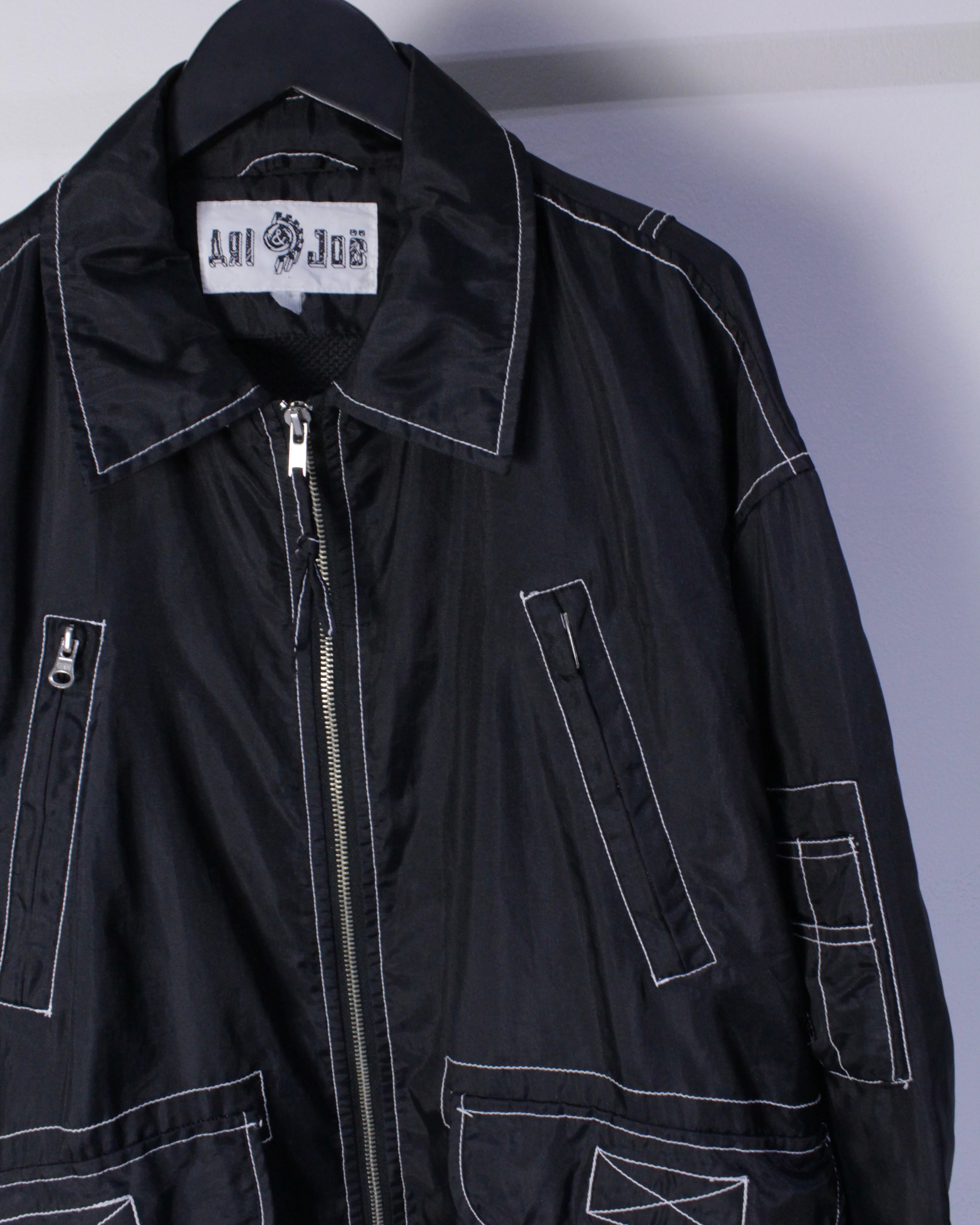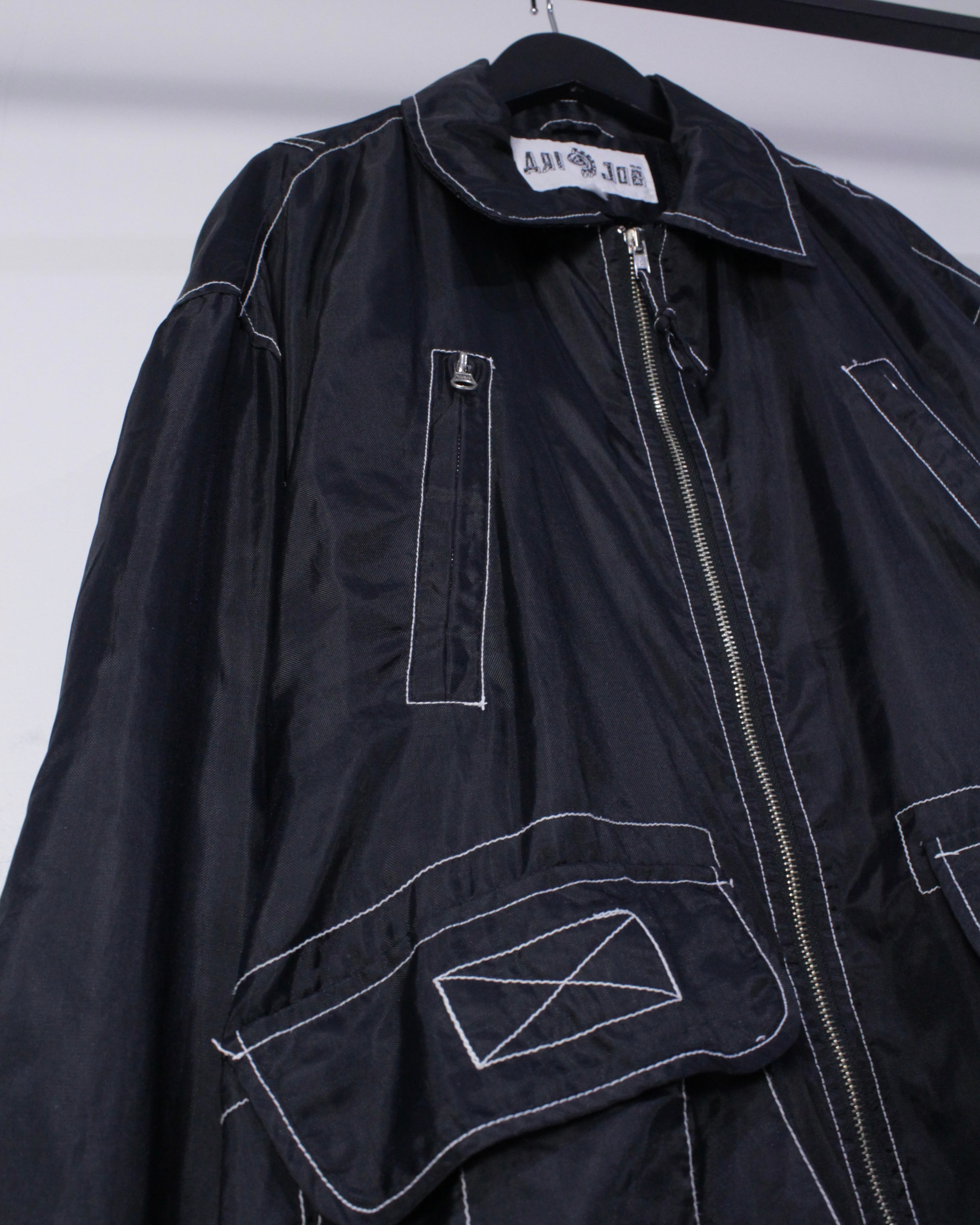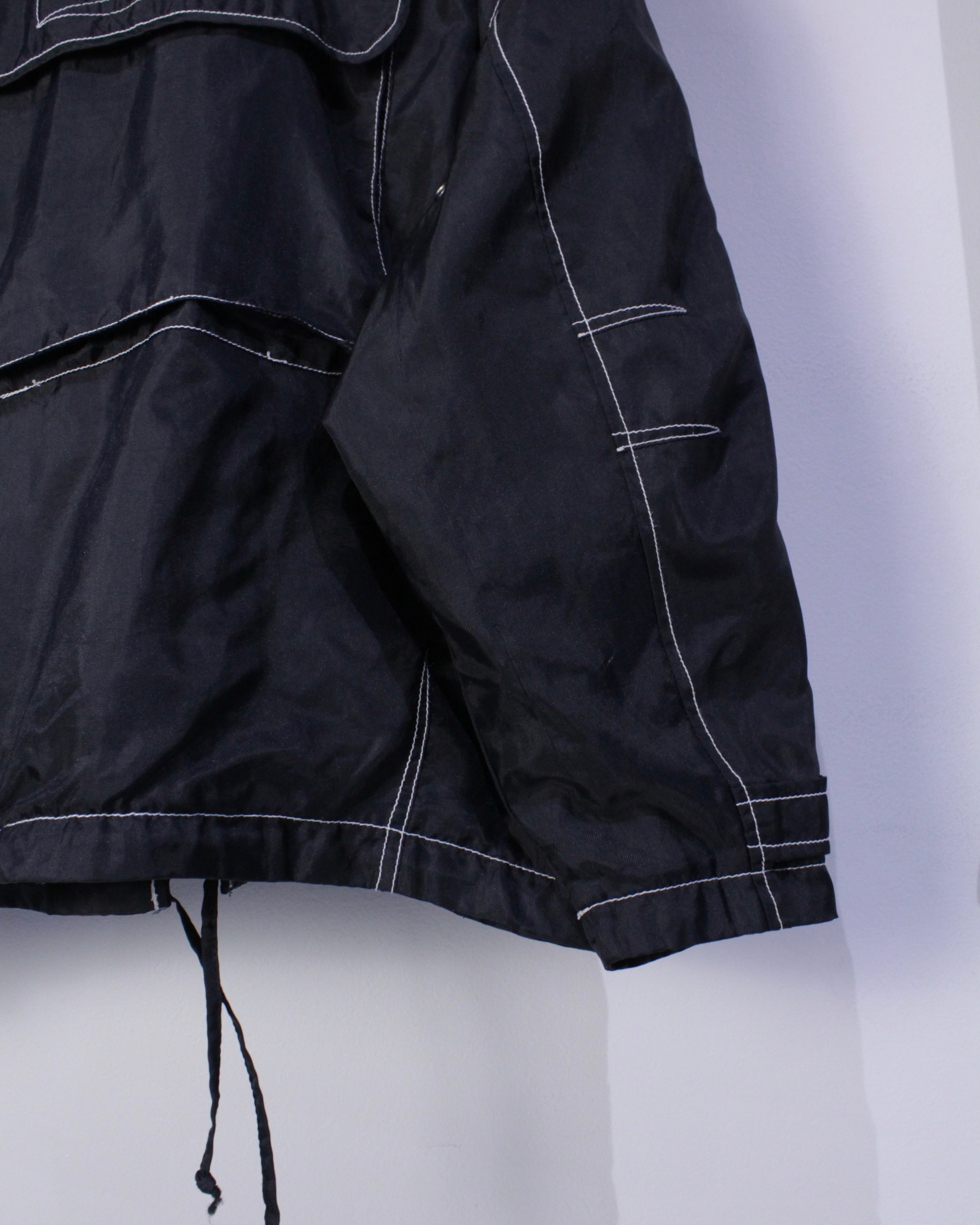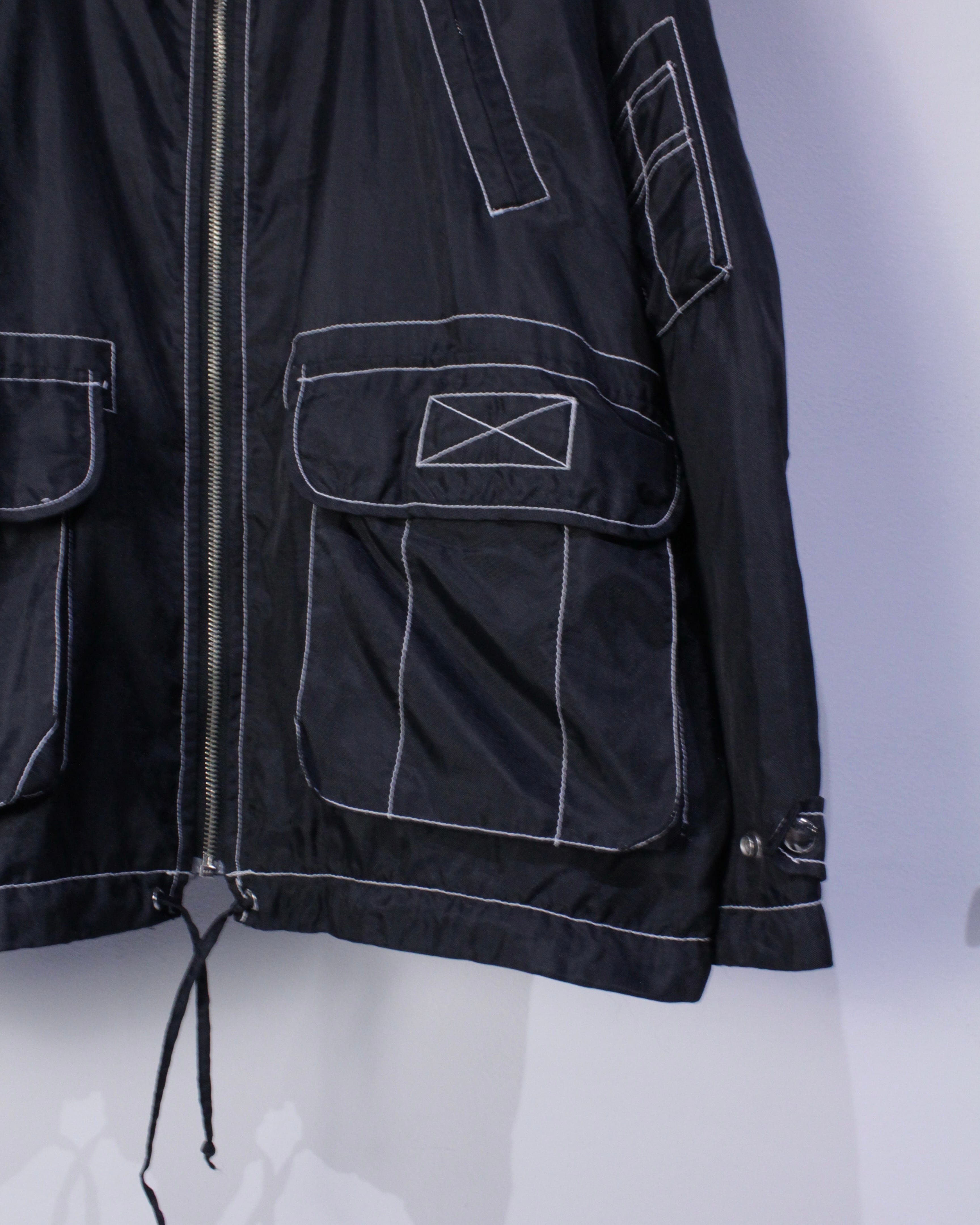 ブラックのナイロン素材をベースに、白のステッチを用い全体にポケットのギミックを配したジャケット。