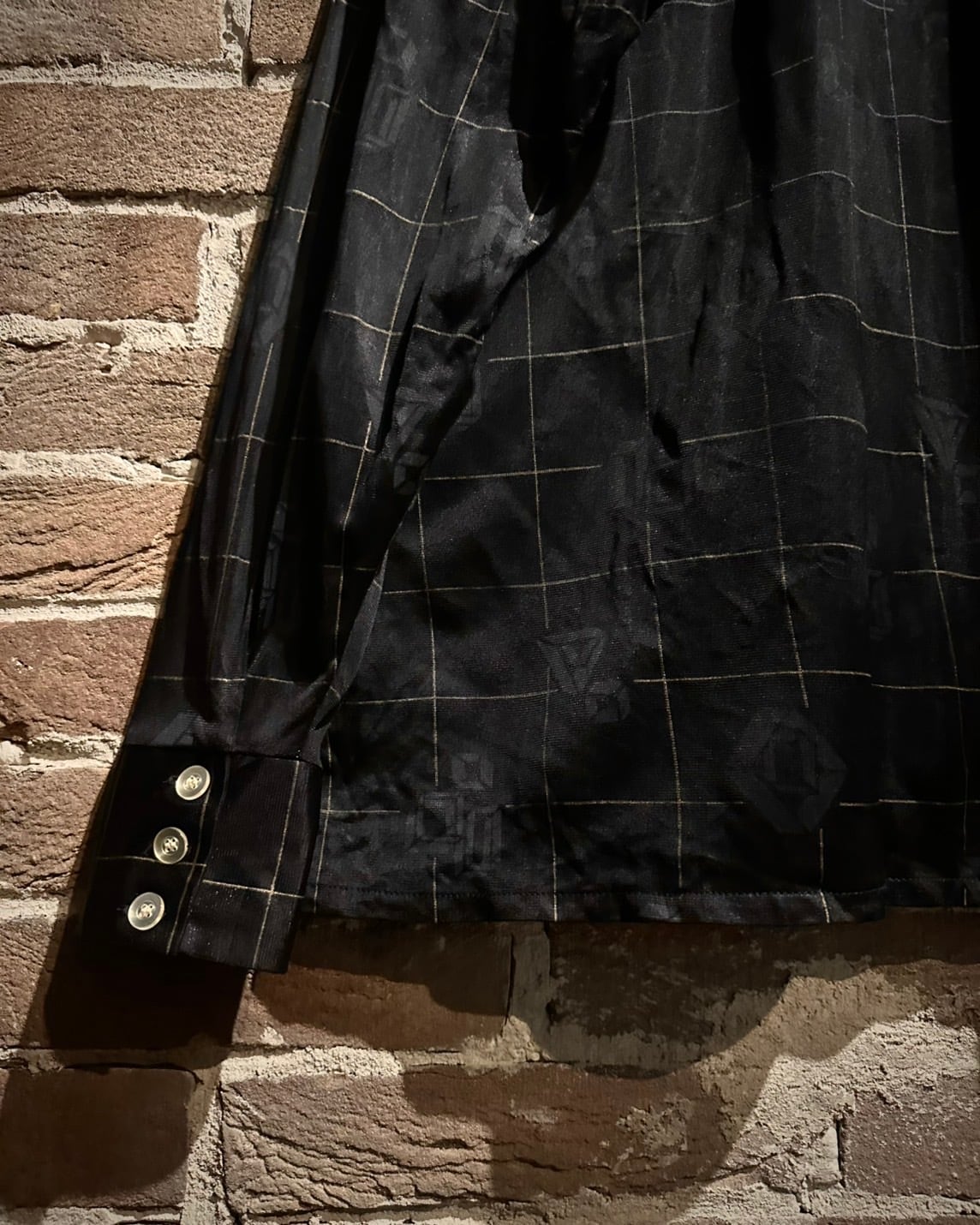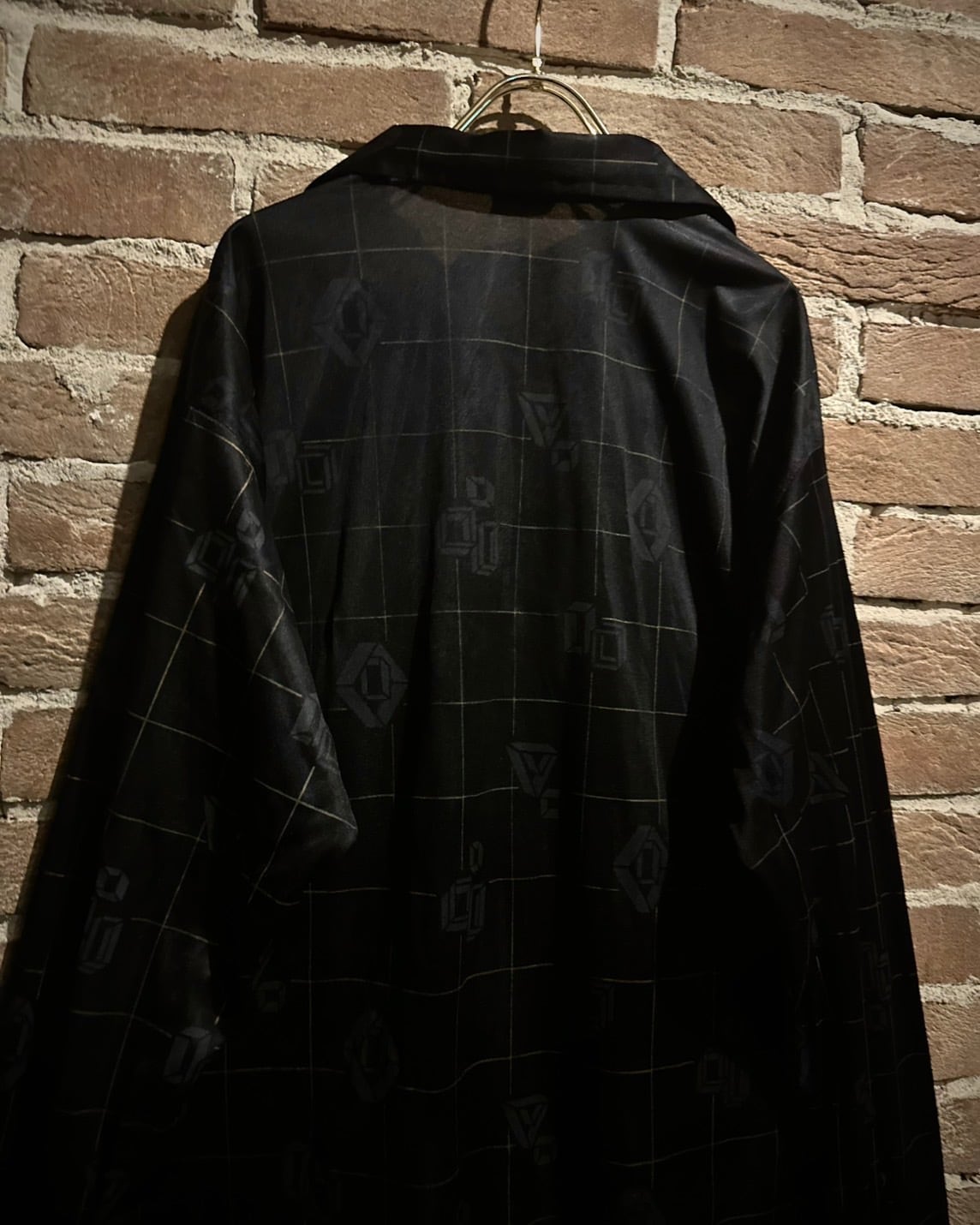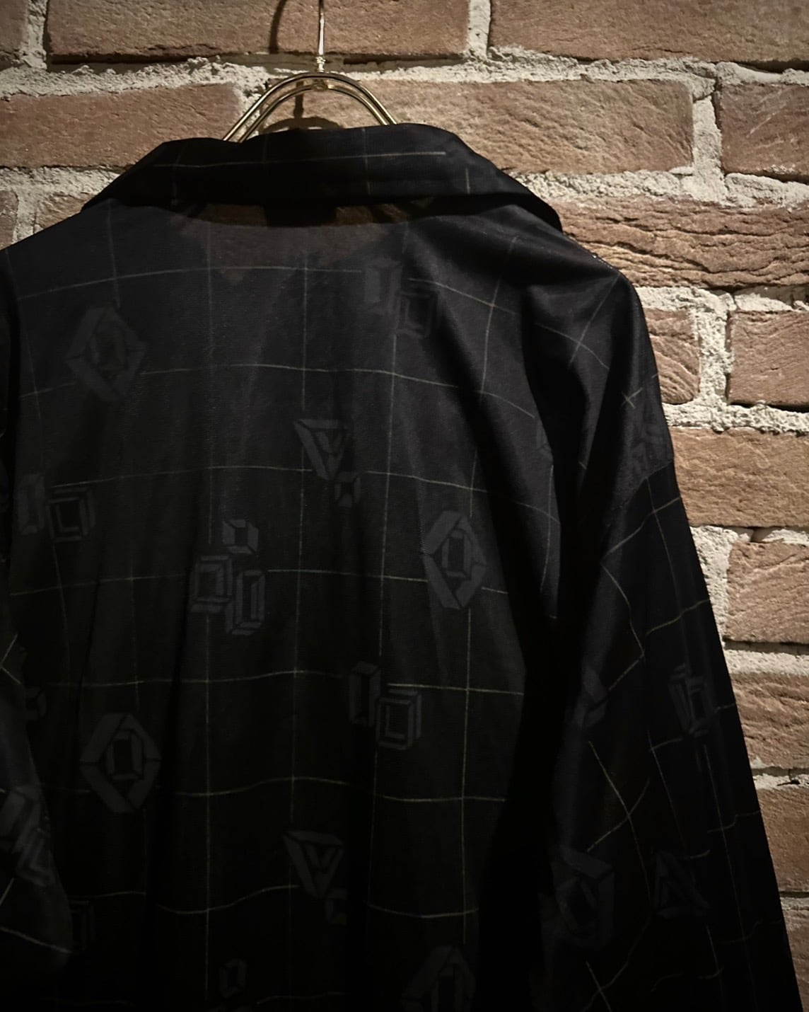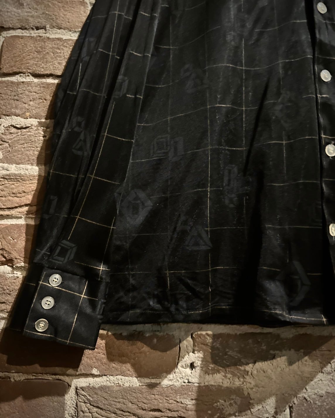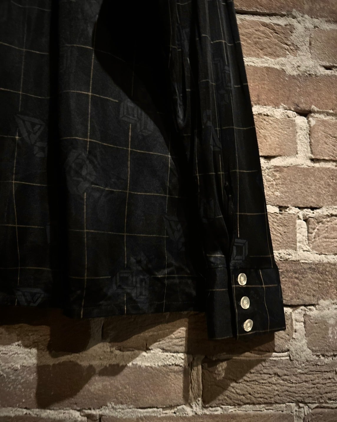 艶やかな光沢を帯びたブラックボディに、グラフチェック×様々な図形を柄として全体に落とし込んだ70'sの長袖ポリシャツ。