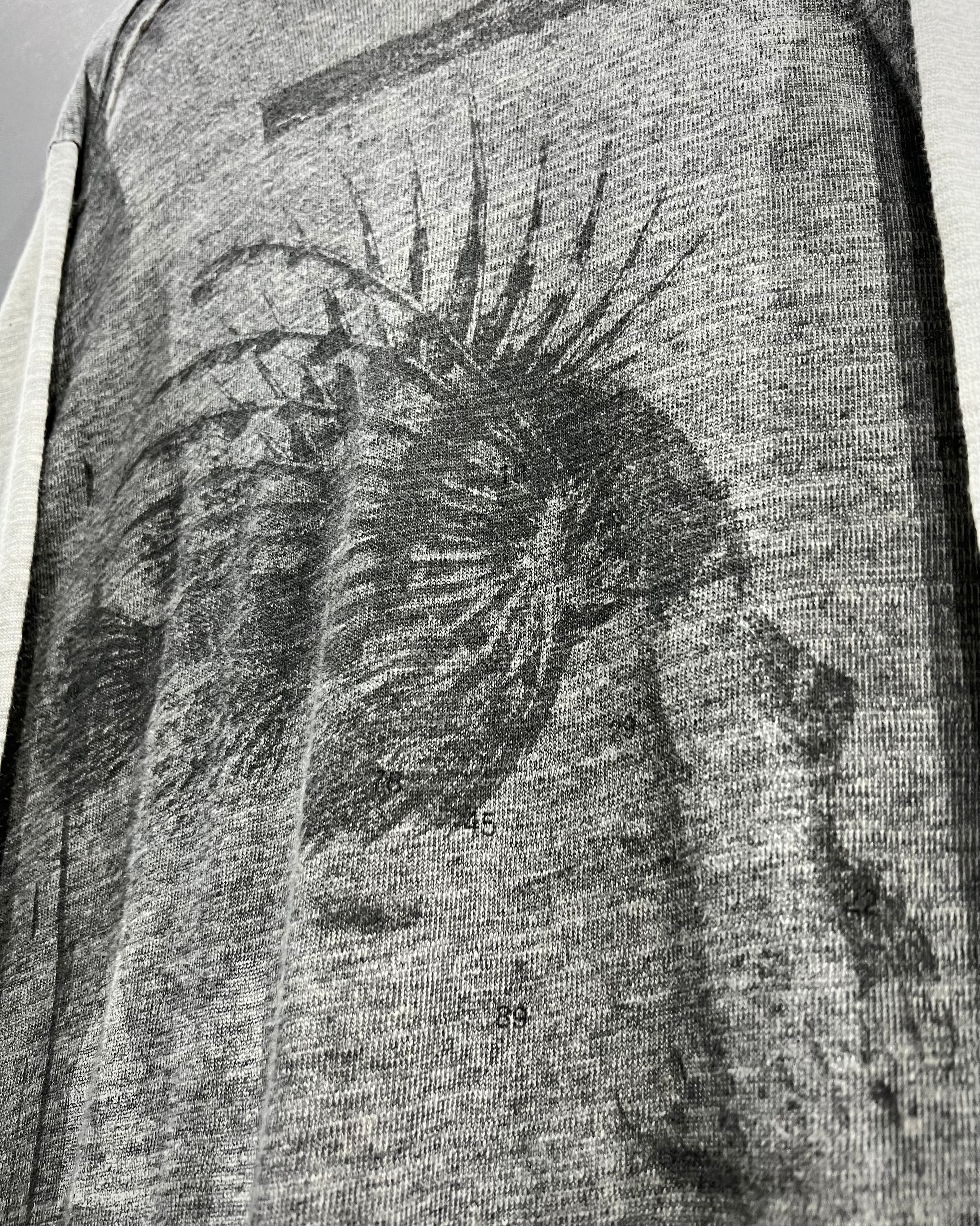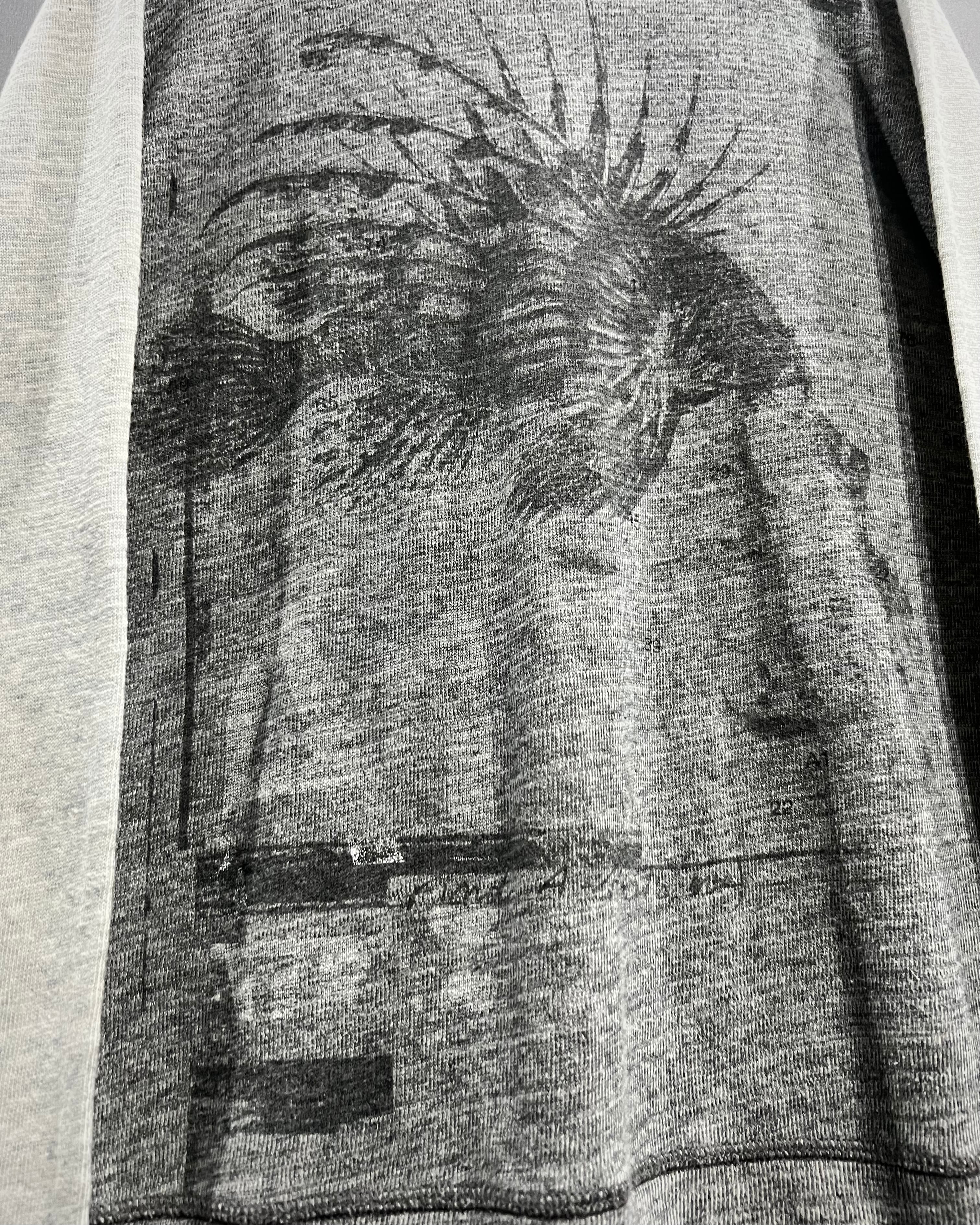 アームには同素材の白のカラー切り替え、フロント中央にカサゴのようなヒレの長い魚をプリントした1着。どこかアートな雰囲気も醸し出しています。