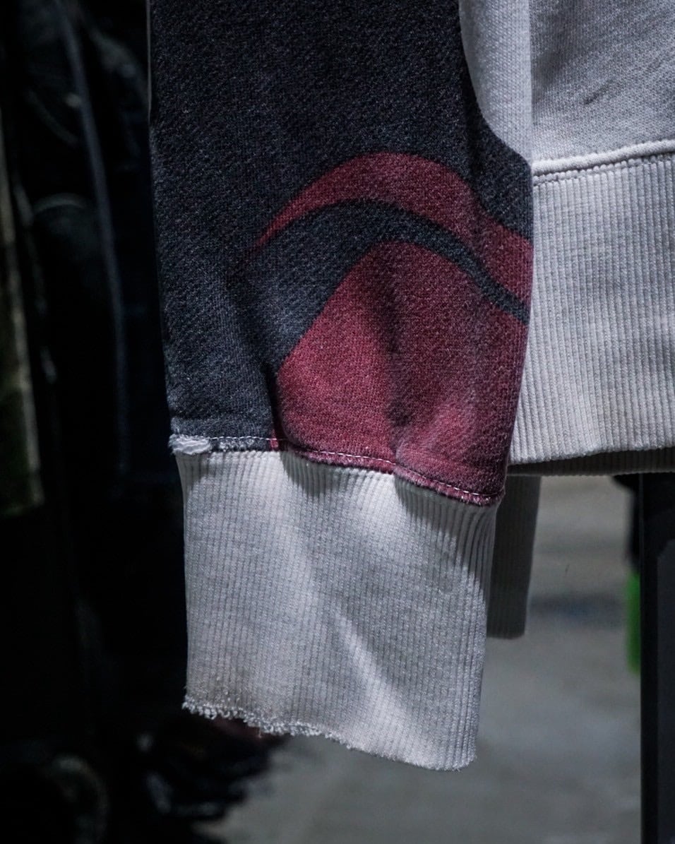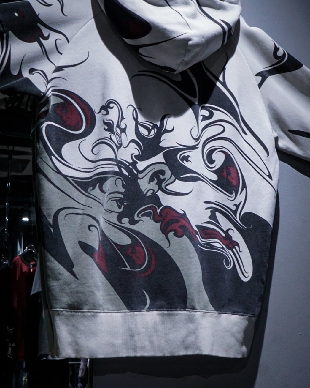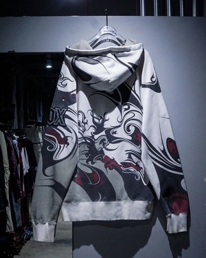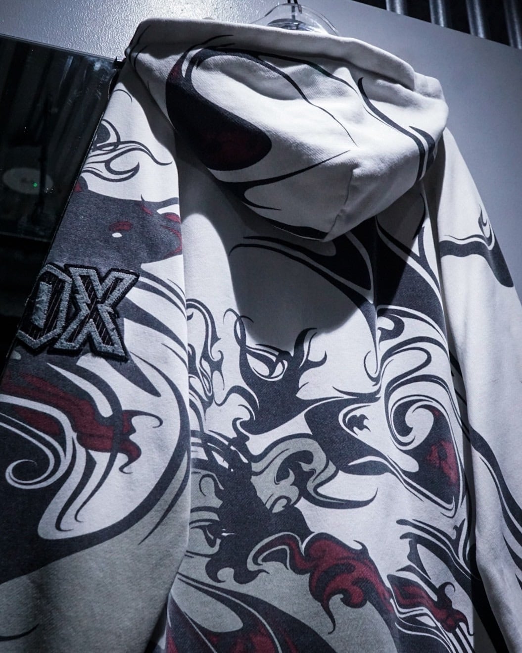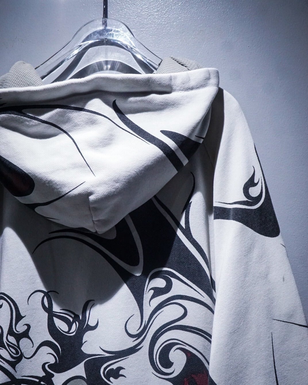 白のボディをベースに、墨黒、赤の配色でボディ全体にゴシック調のデザイン、フロント、アームには立体感のあるロゴパッチを載せた逸品。
