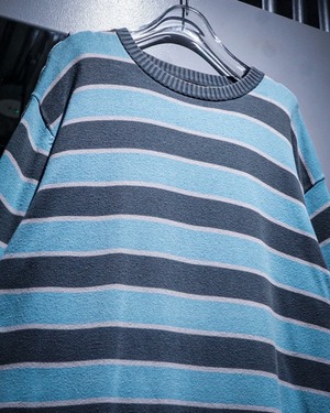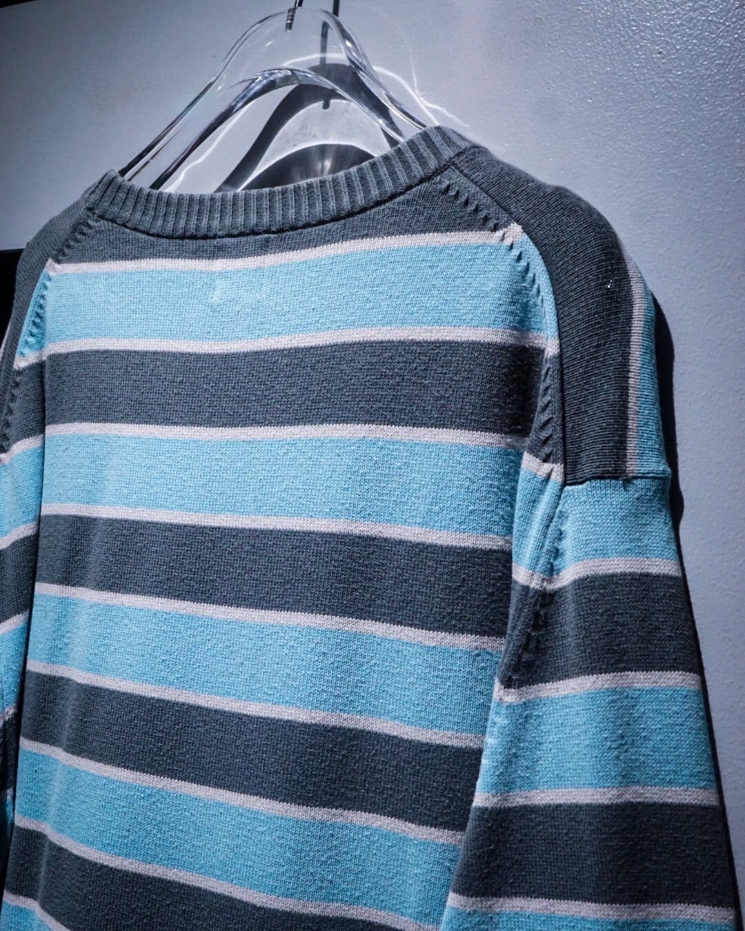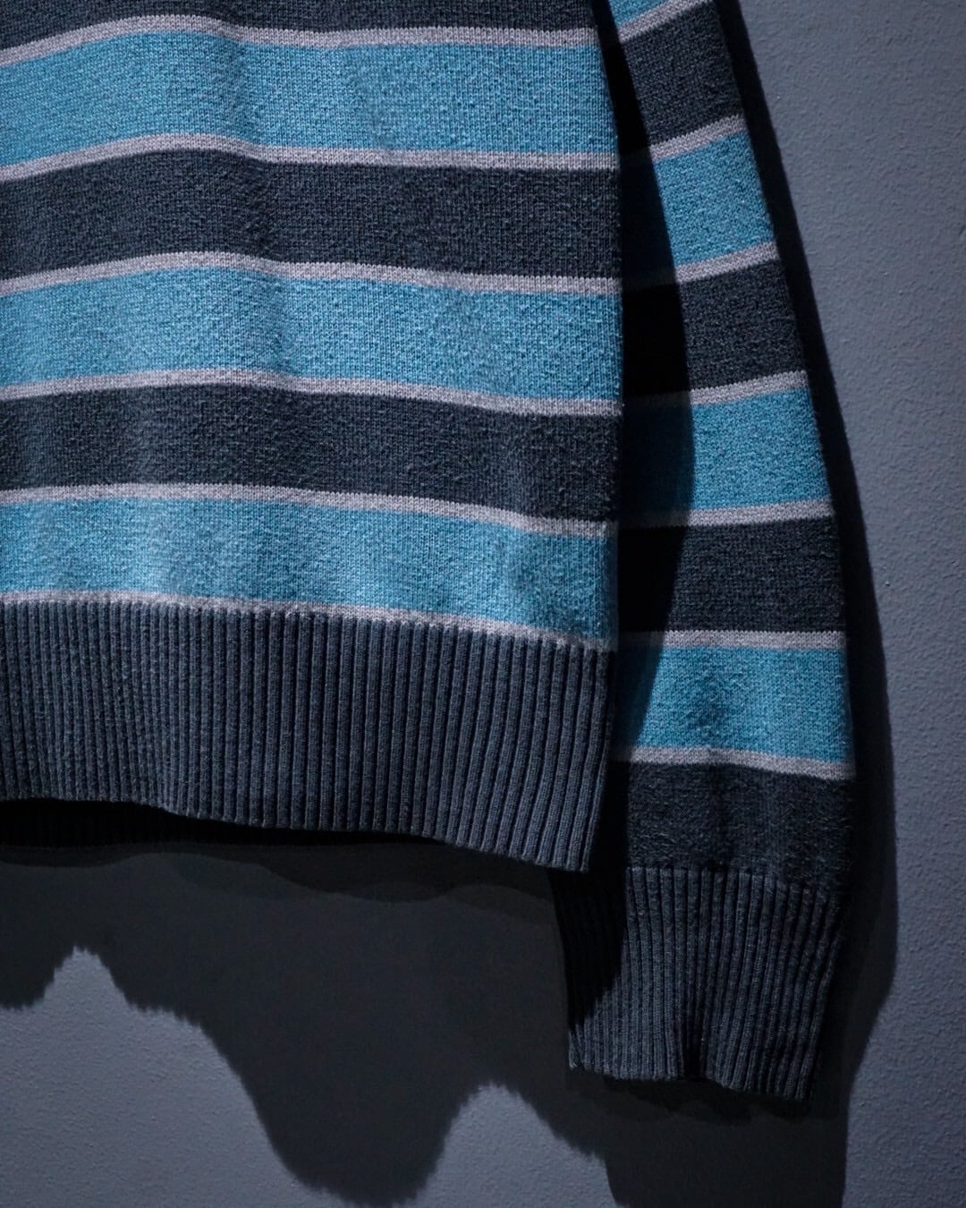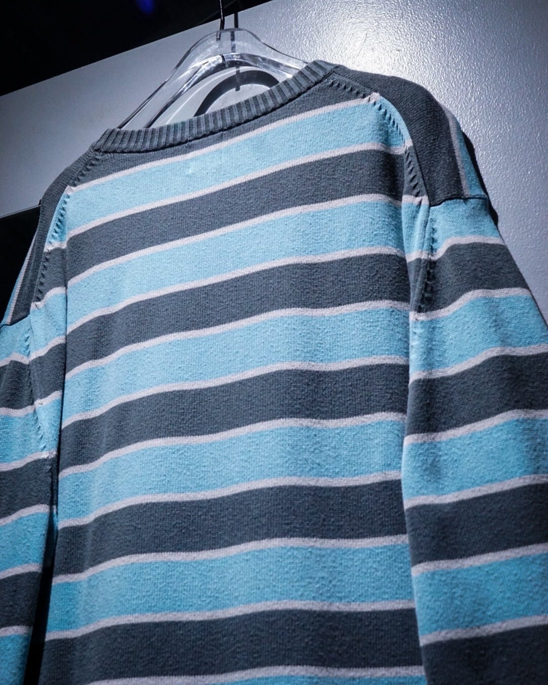 柔らかく、肌触りの優しいコットン素材を用いたボディに、グレー、水色、白でボーダーを載せたニット。