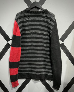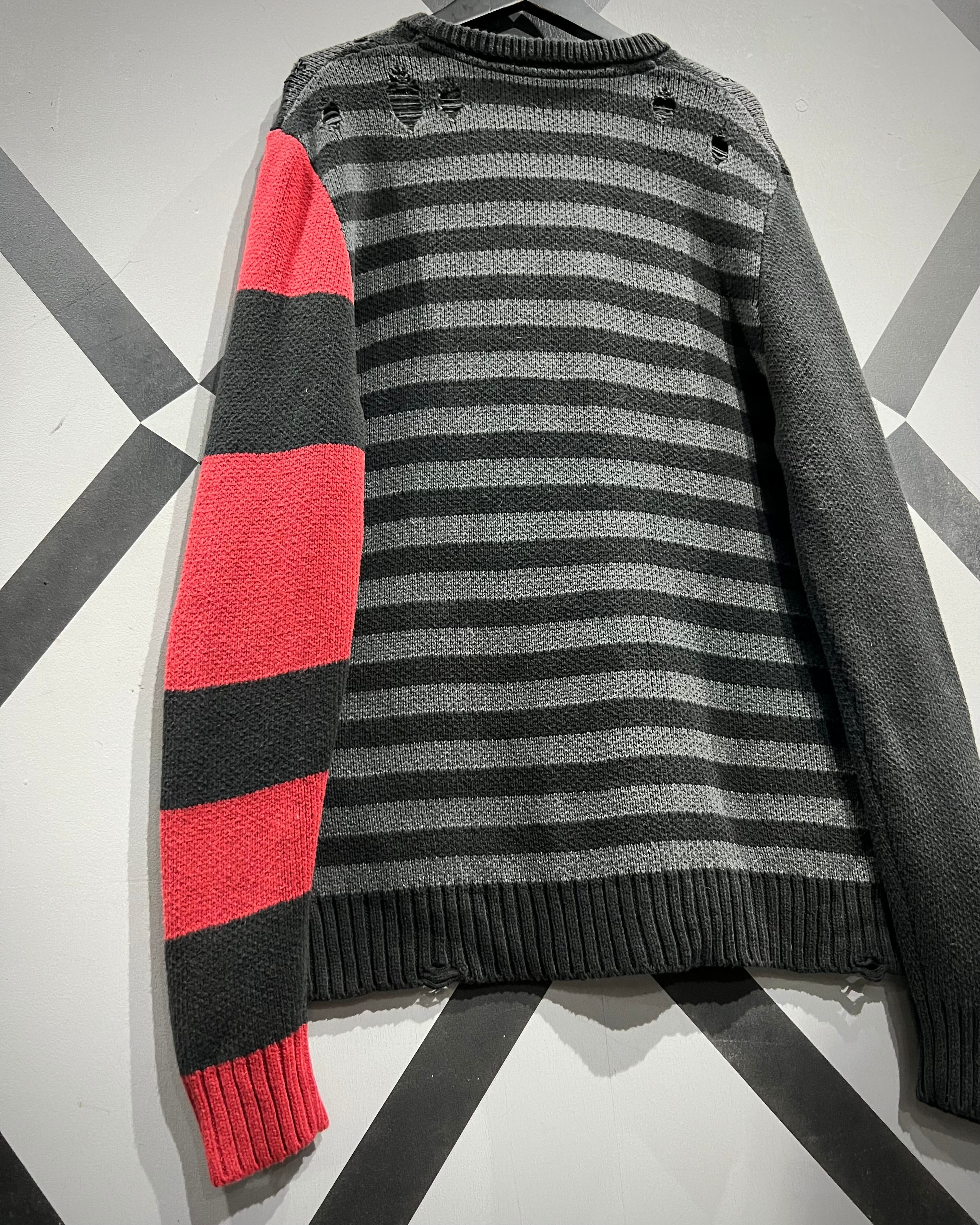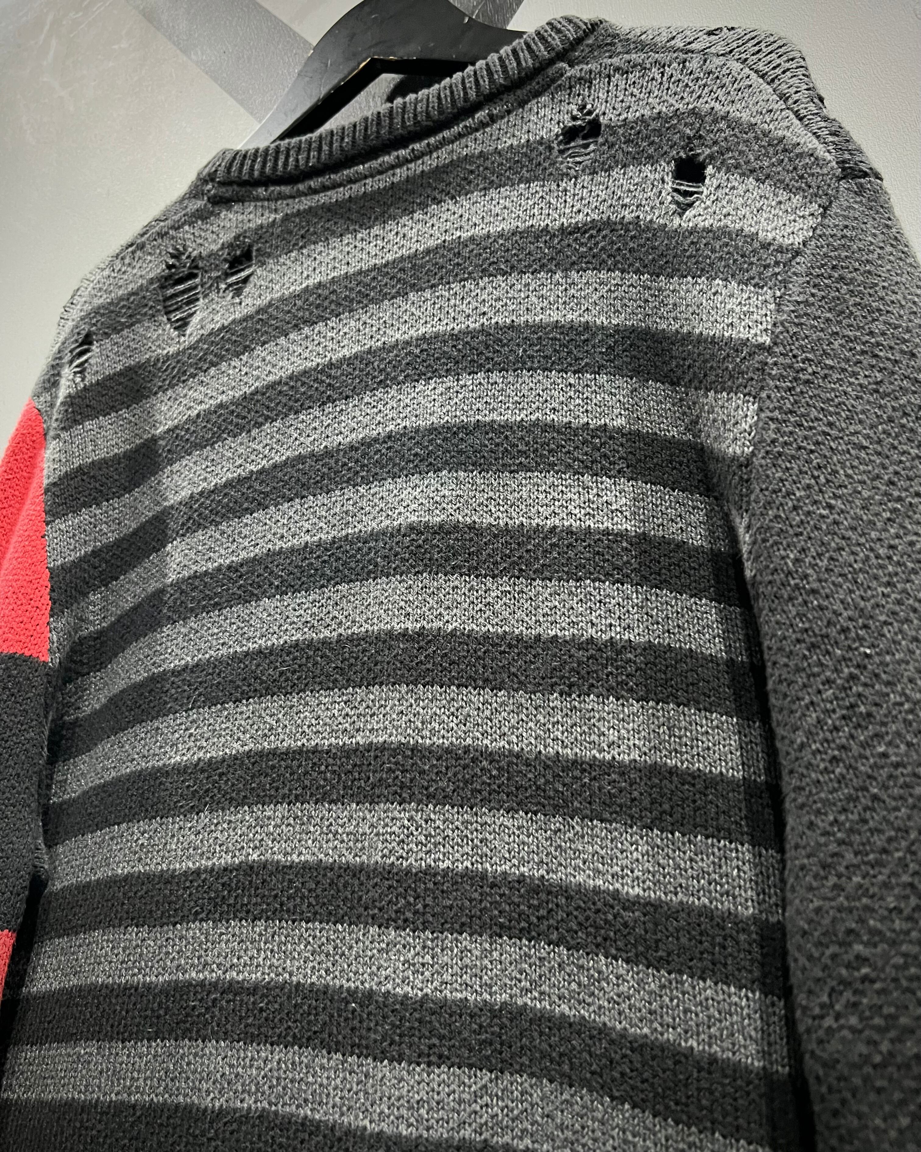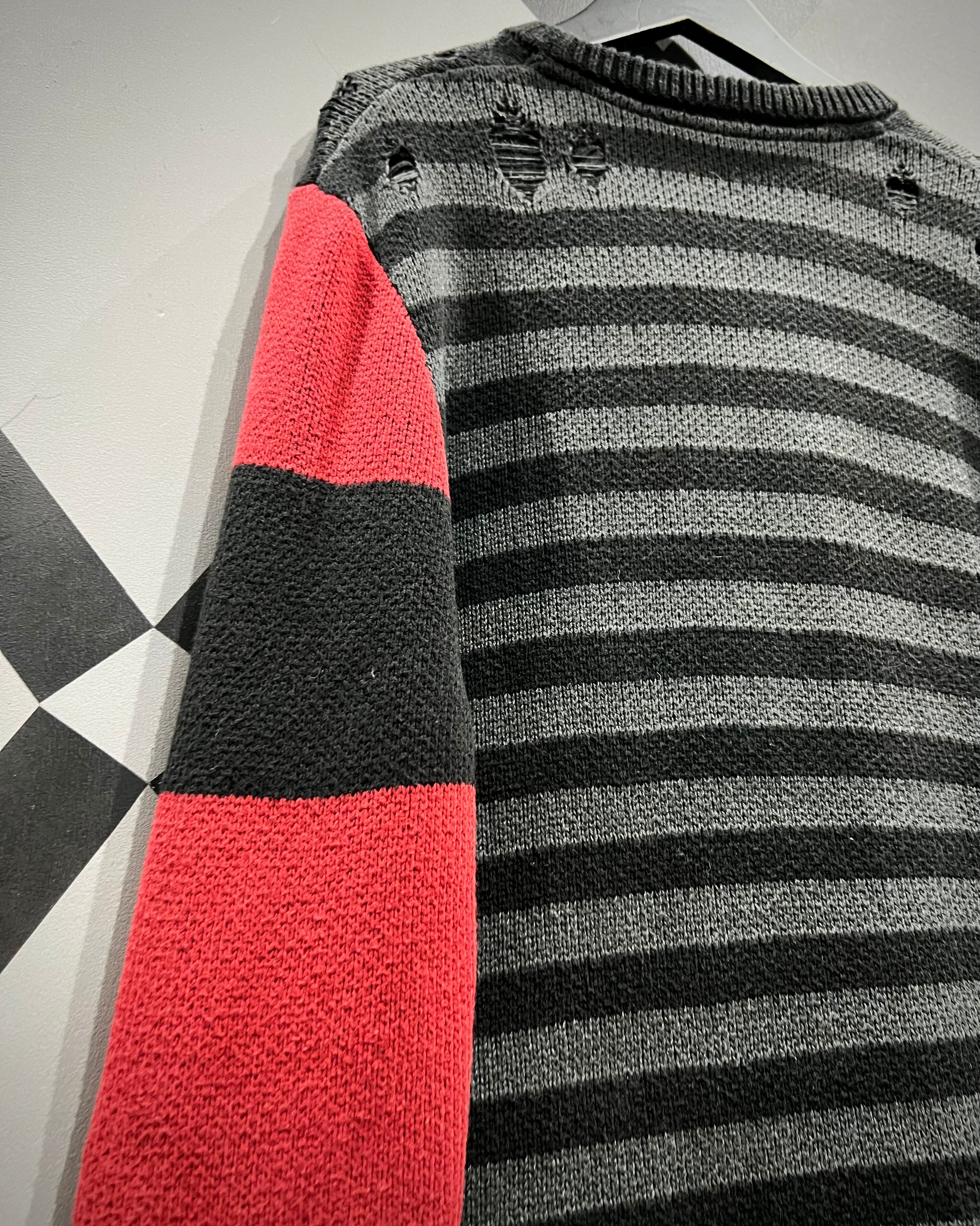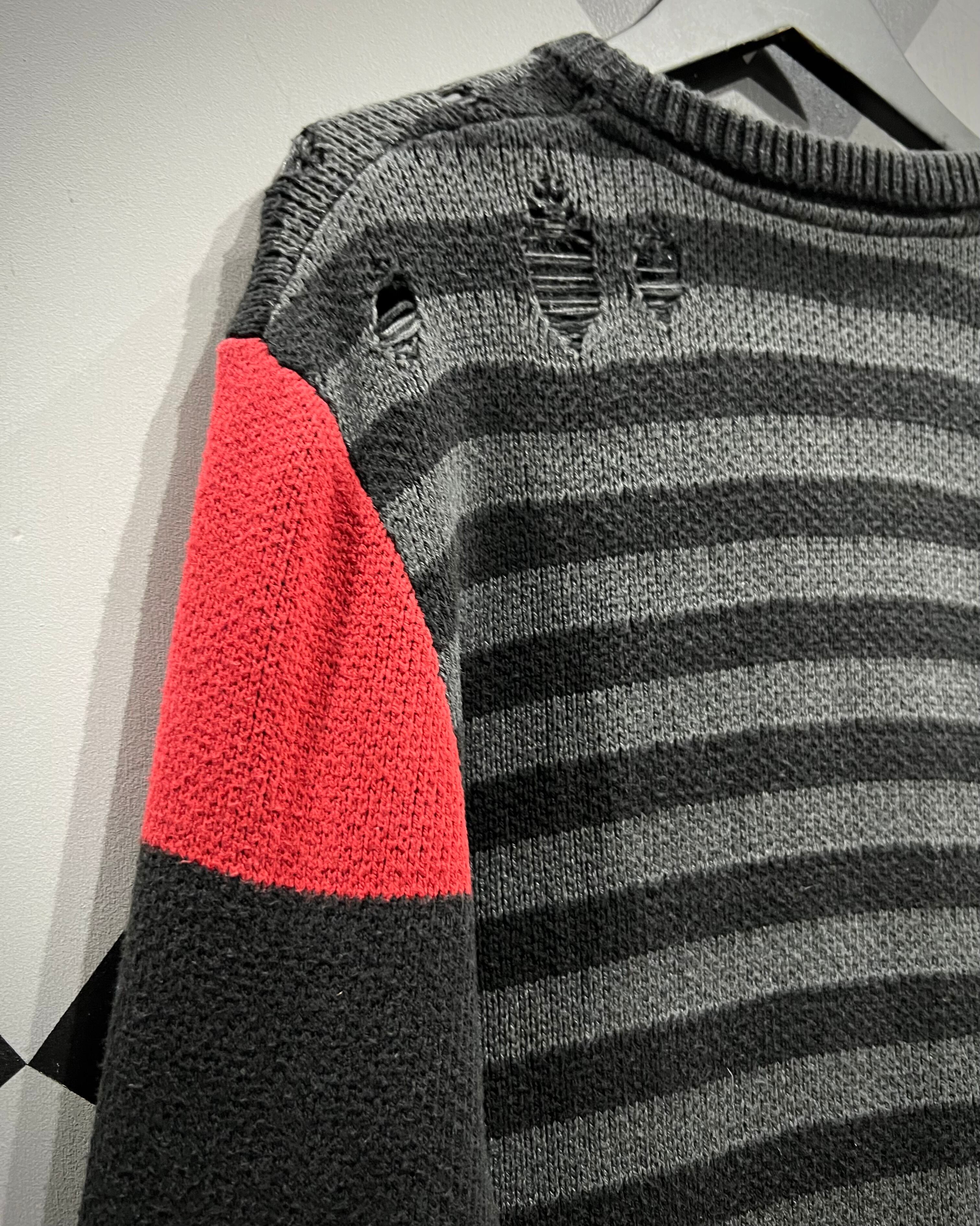 身頃を黒×グレー、左袖を赤×黒のボーダー、右袖を黒無地のニットで切り替え、随所にダメージ加工を施した、パンクな雰囲気をヒシヒシと感じさせるプルオーバーニット。