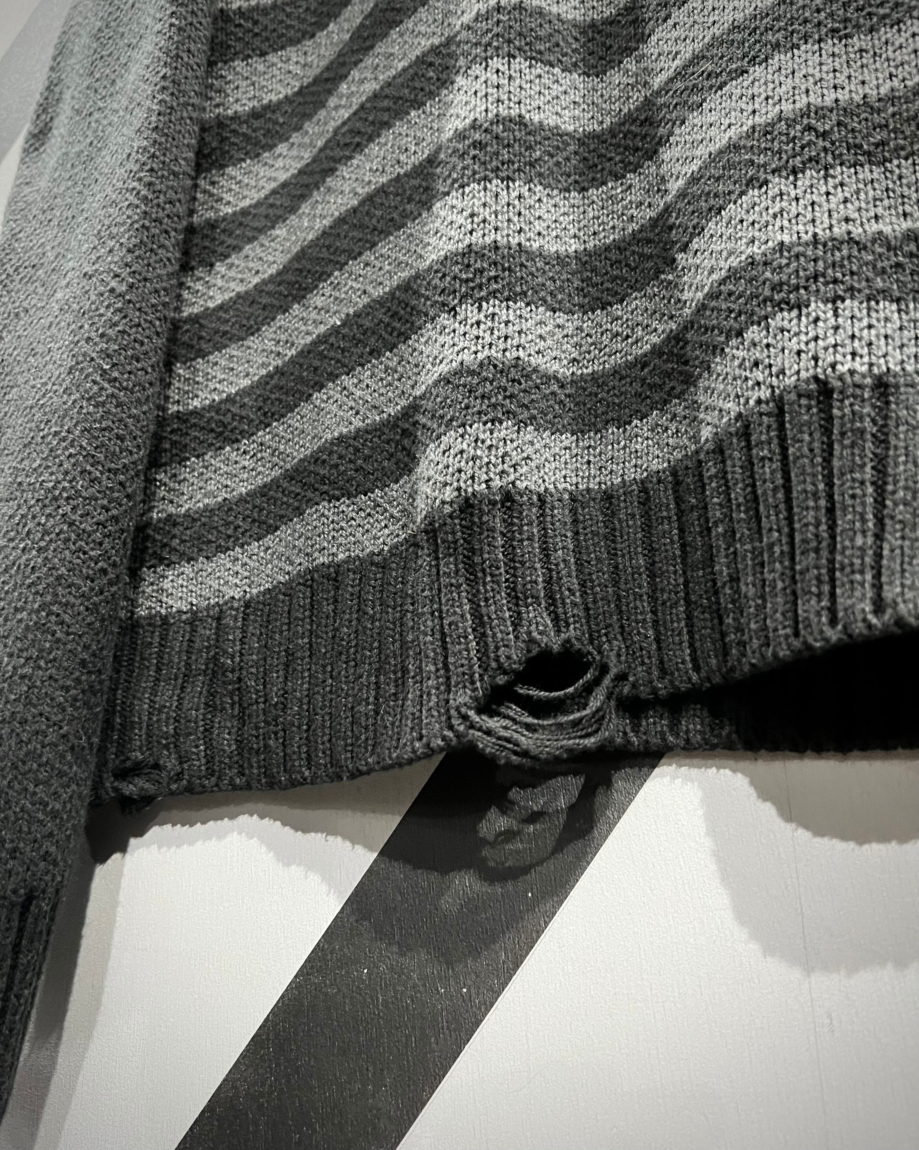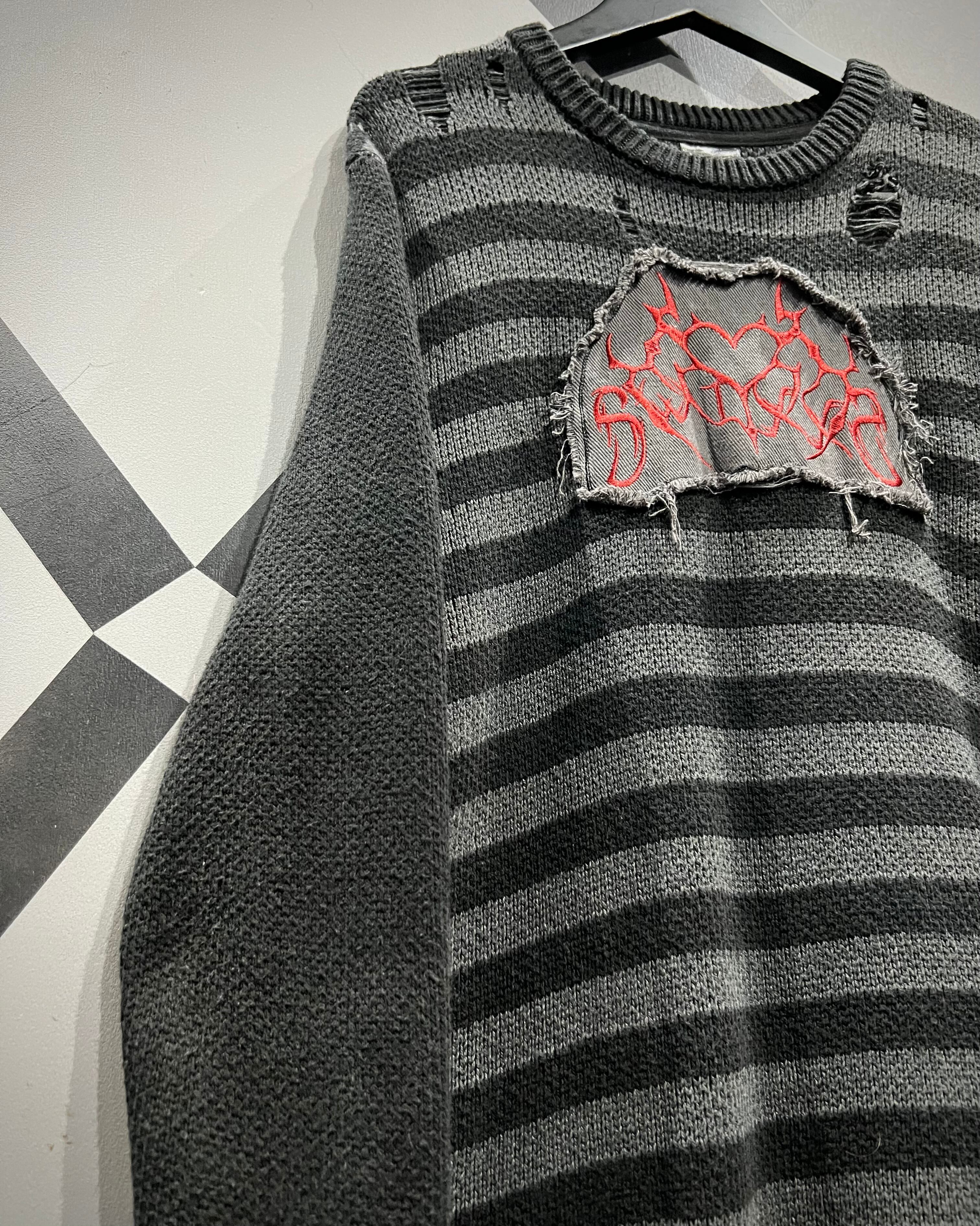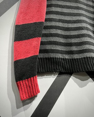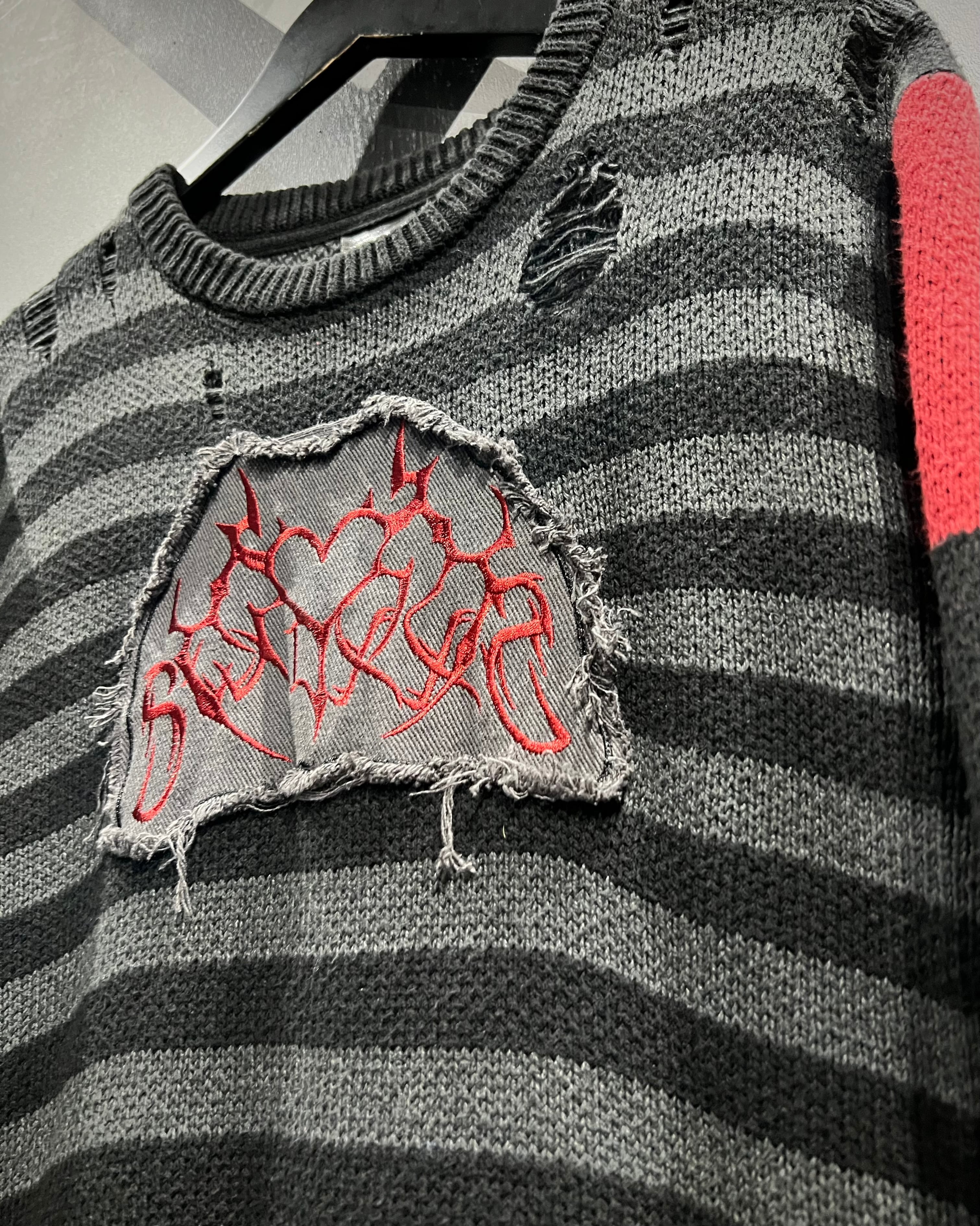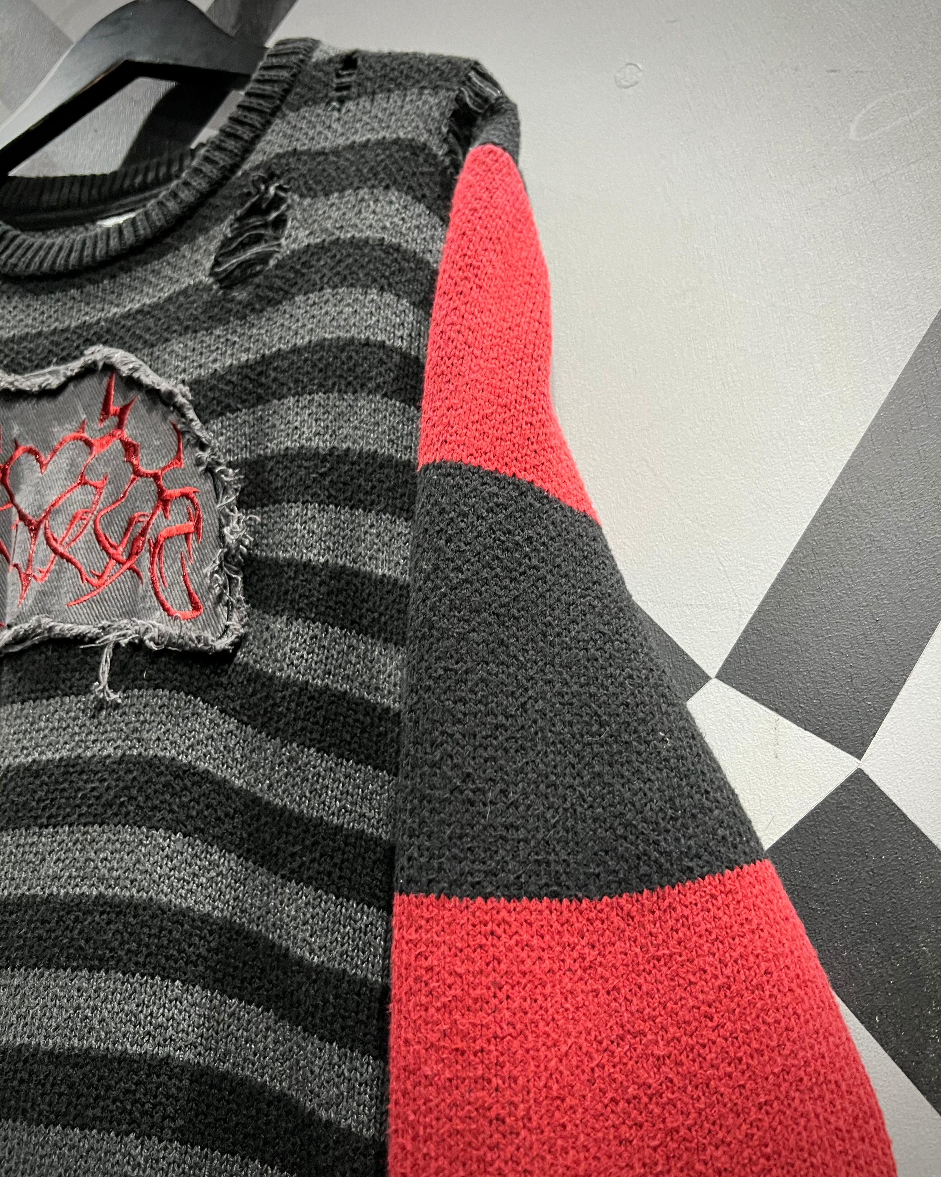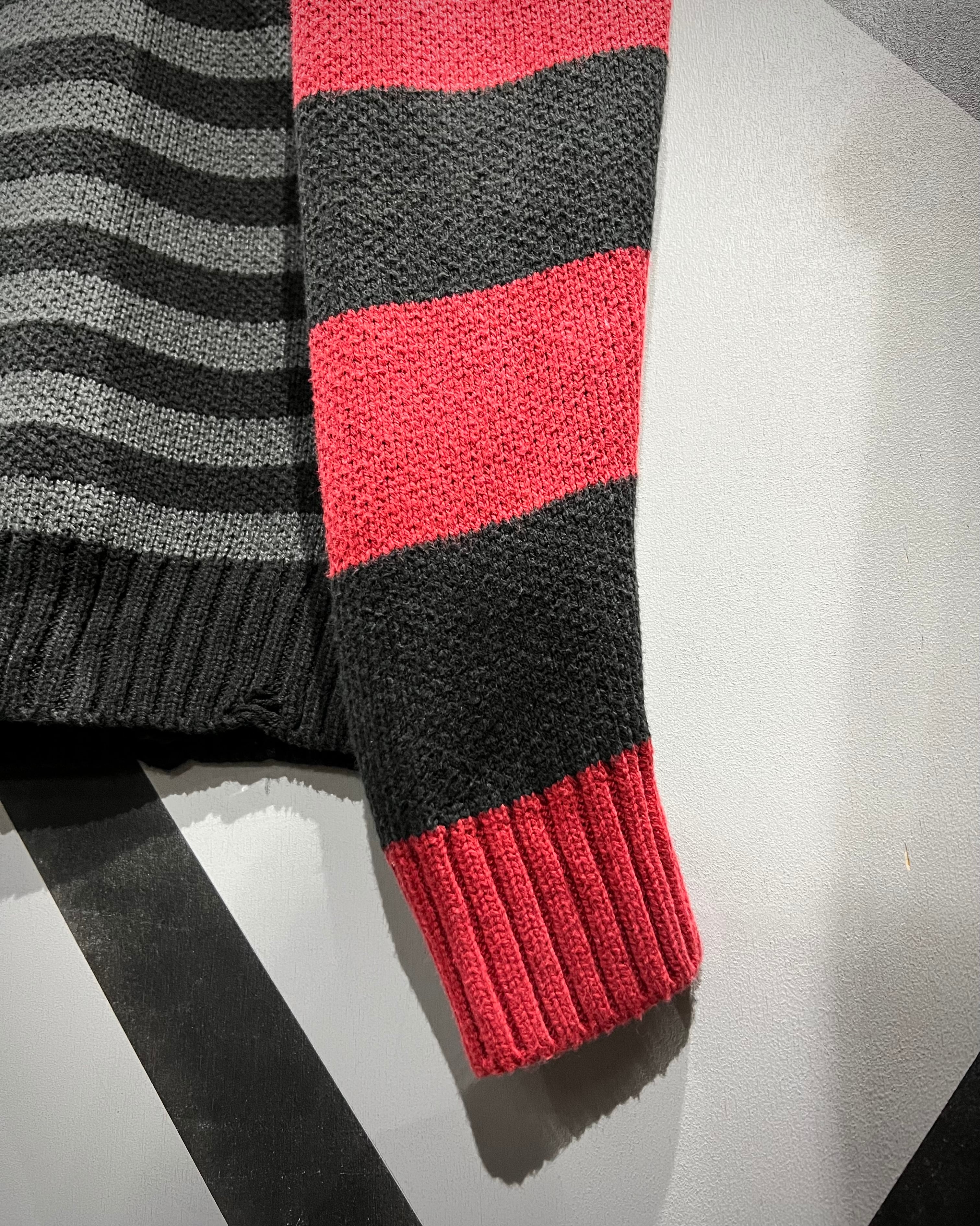 身頃を黒×グレー、左袖を赤×黒のボーダー、右袖を黒無地のニットで切り替え、随所にダメージ加工を施した、パンクな雰囲気をヒシヒシと感じさせるプルオーバーニット。