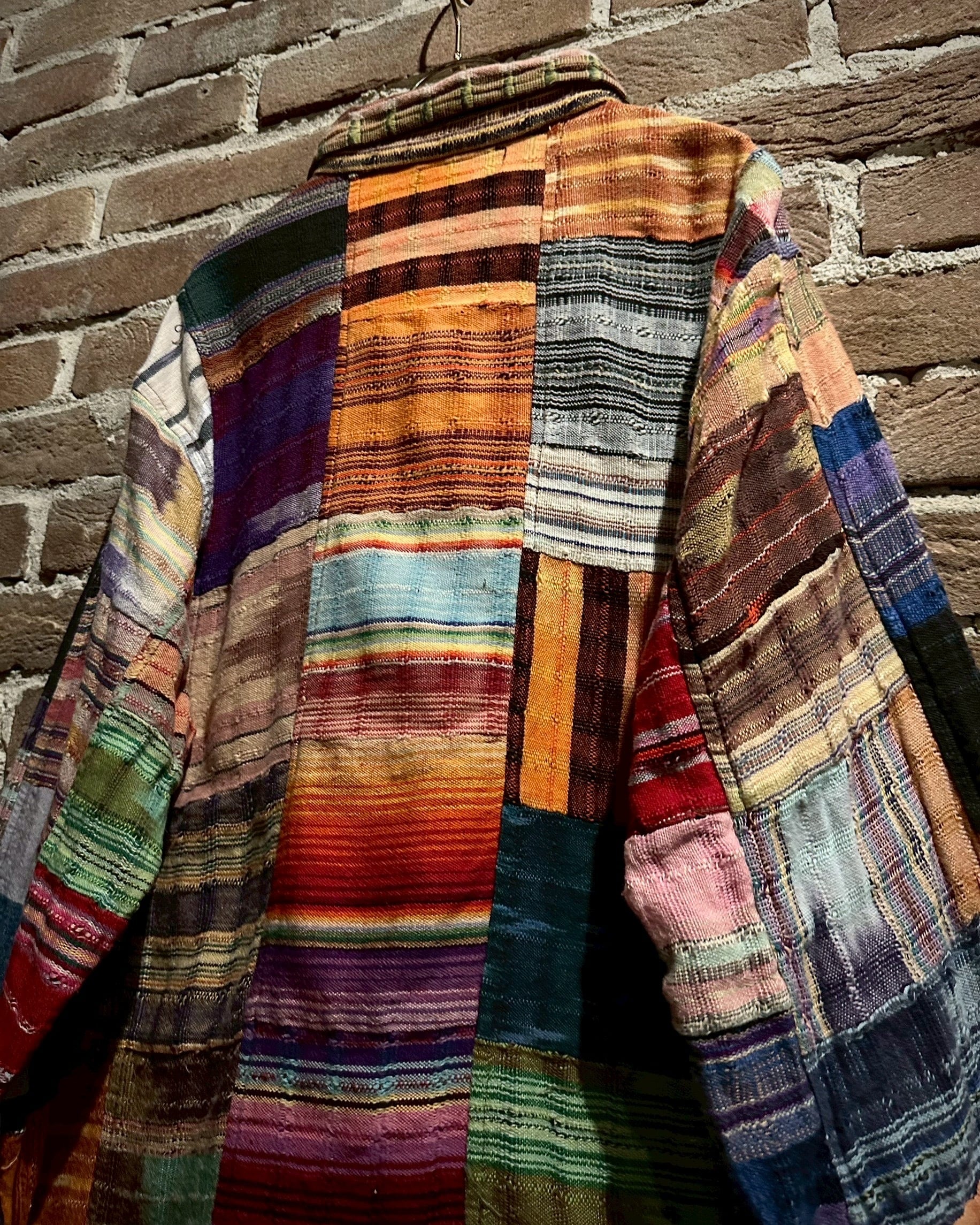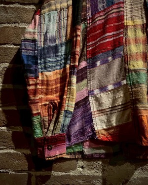 鮮やかな色使いに、温もりを感じさせるグアテマラ織り特有の風合いを、パッチワークによって更に際立たせた非常に美しい仕上がりを見せる1枚。