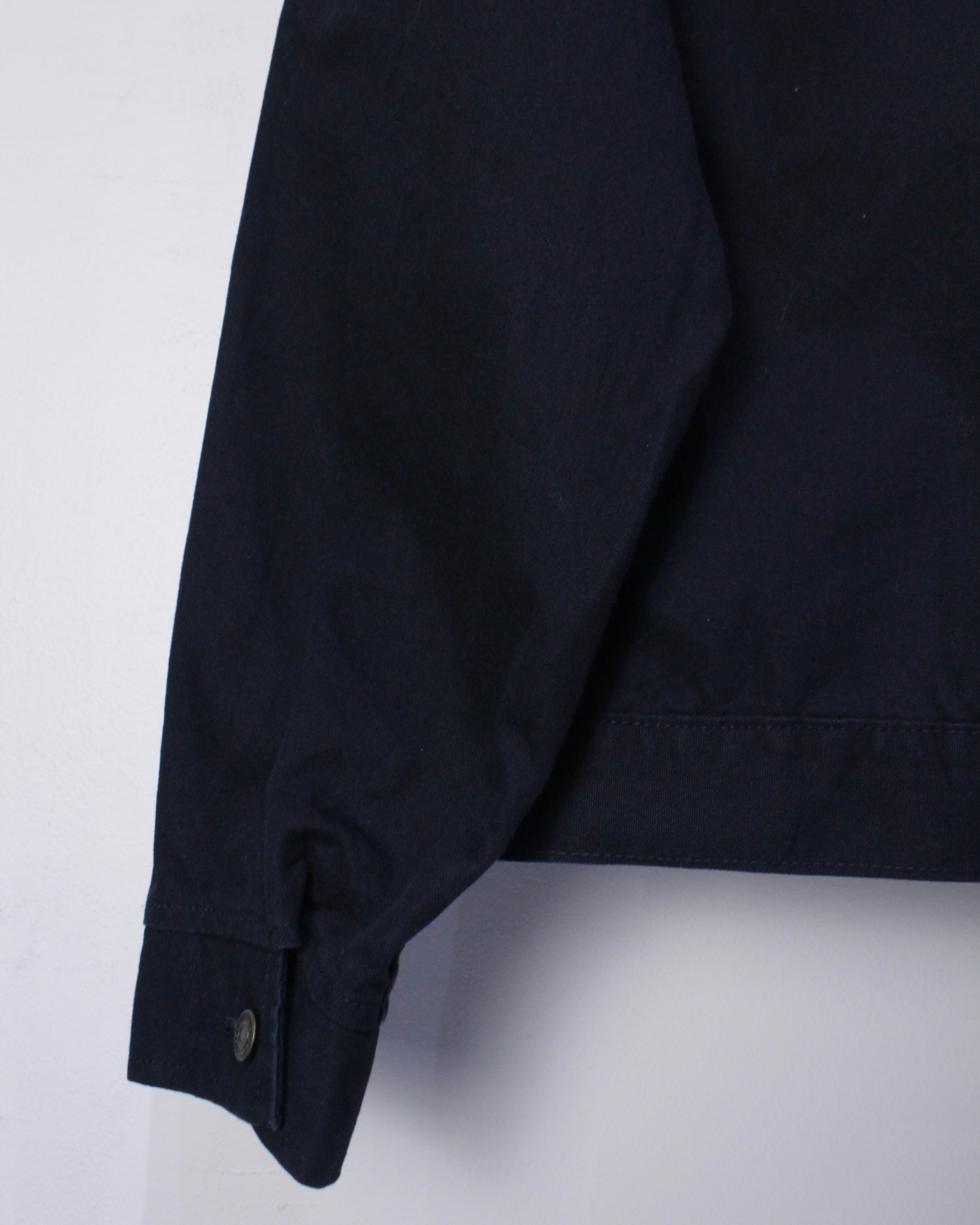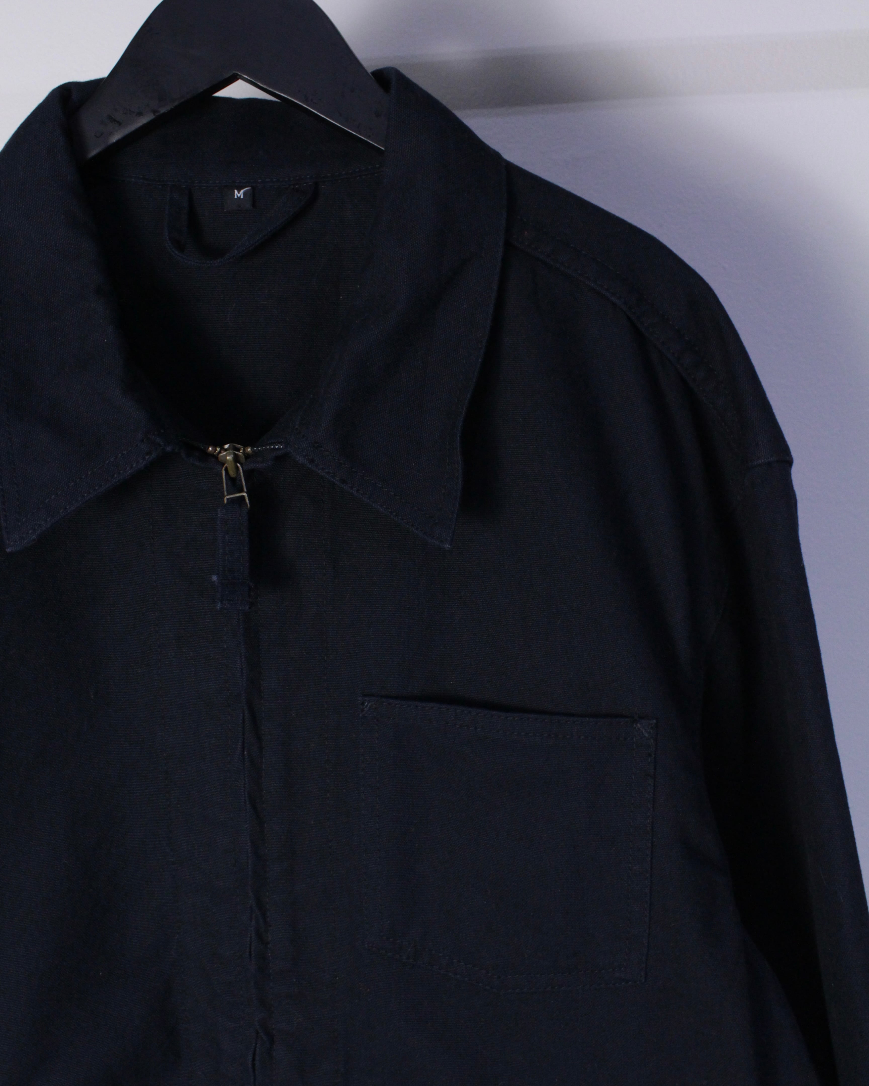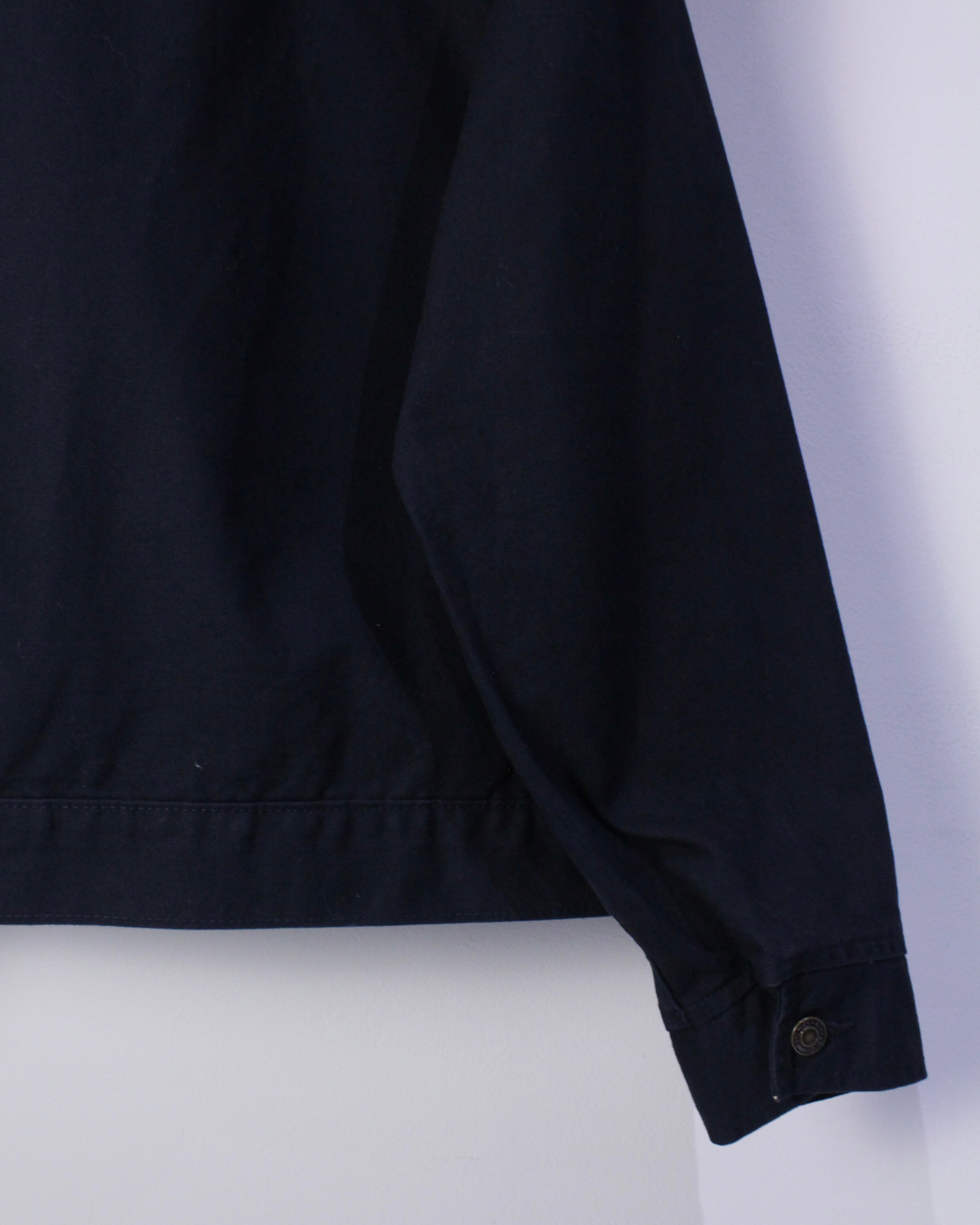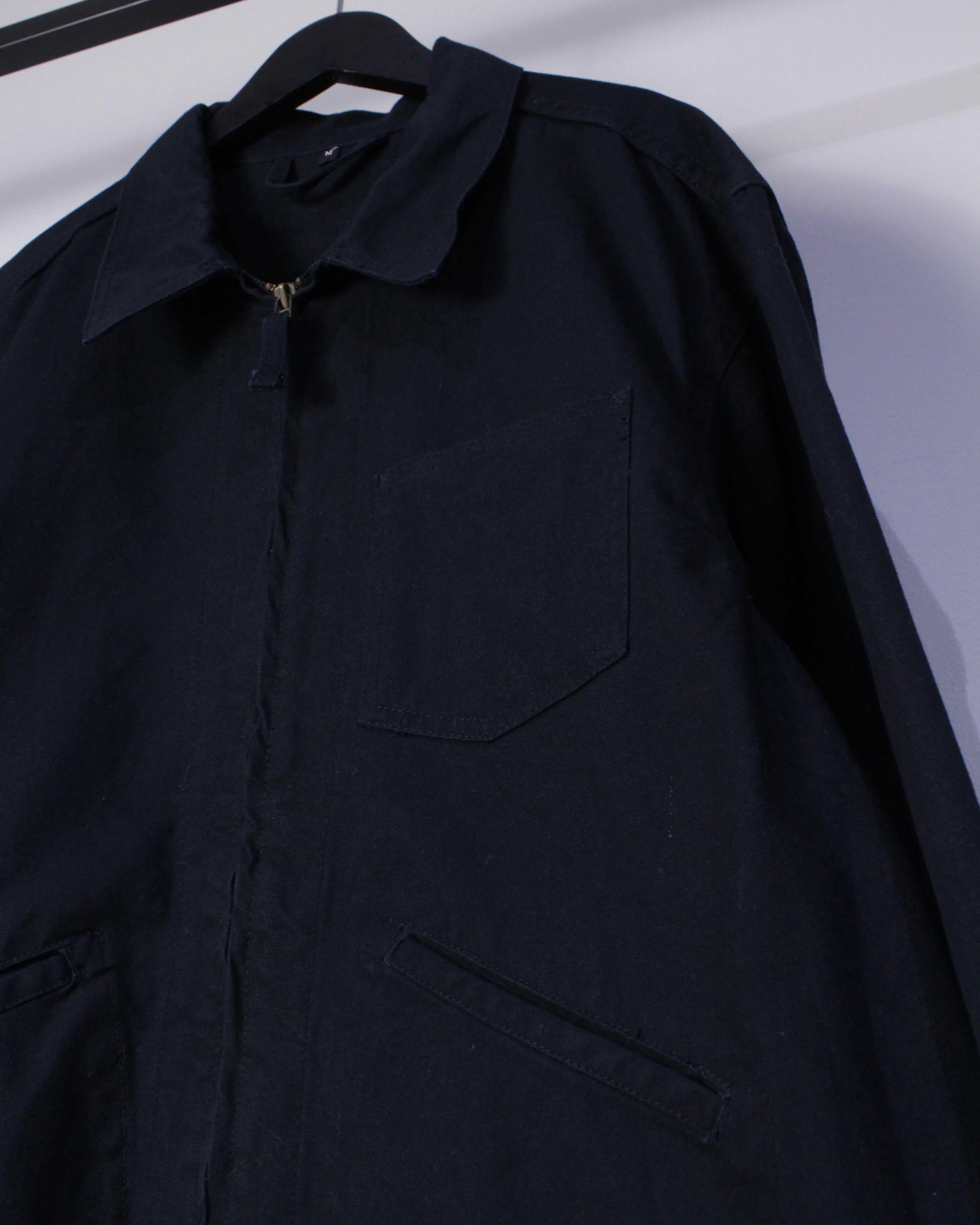 ハリのあるブラックのダック生地をボディに使用したジップアップジャケット。