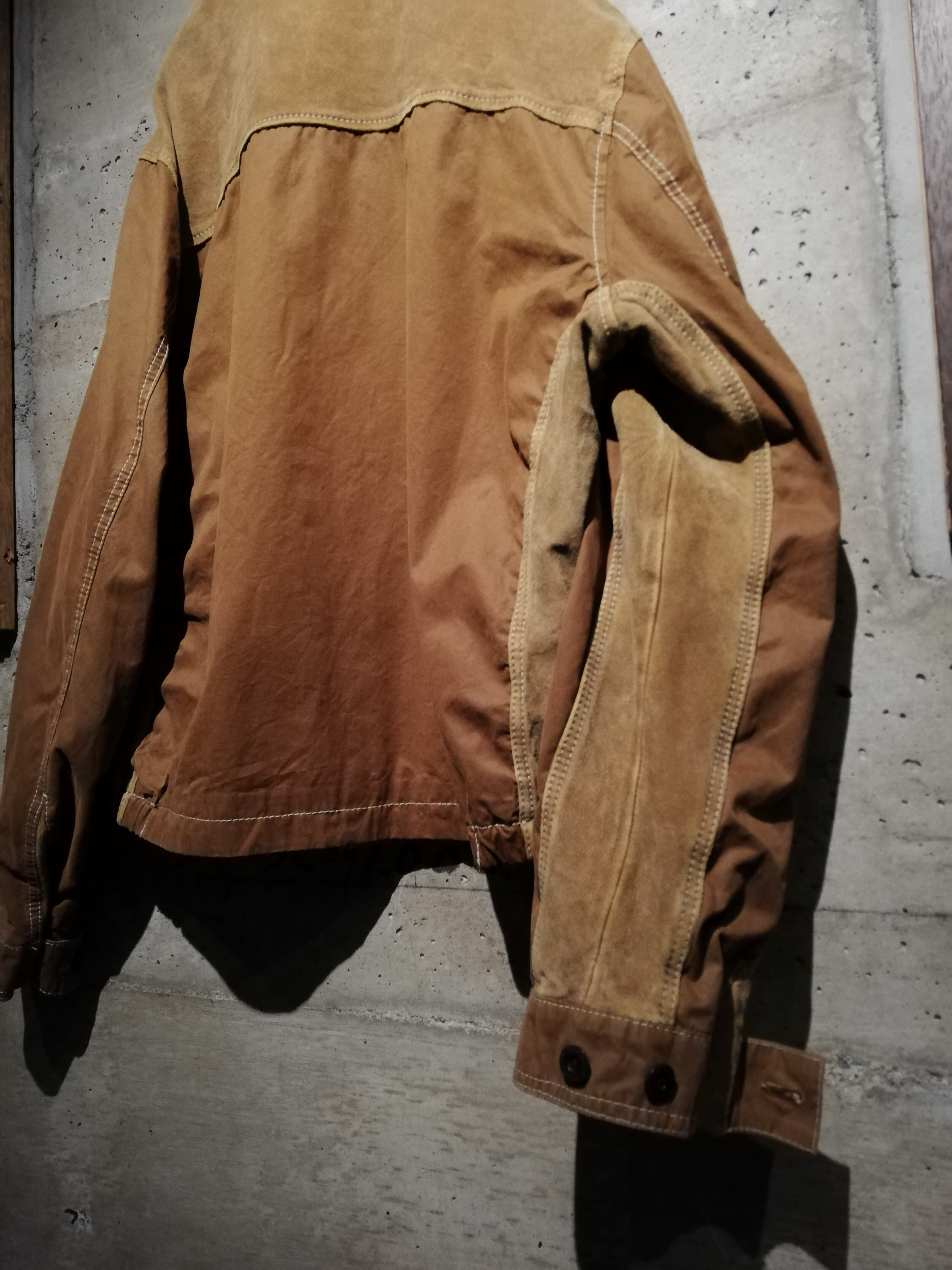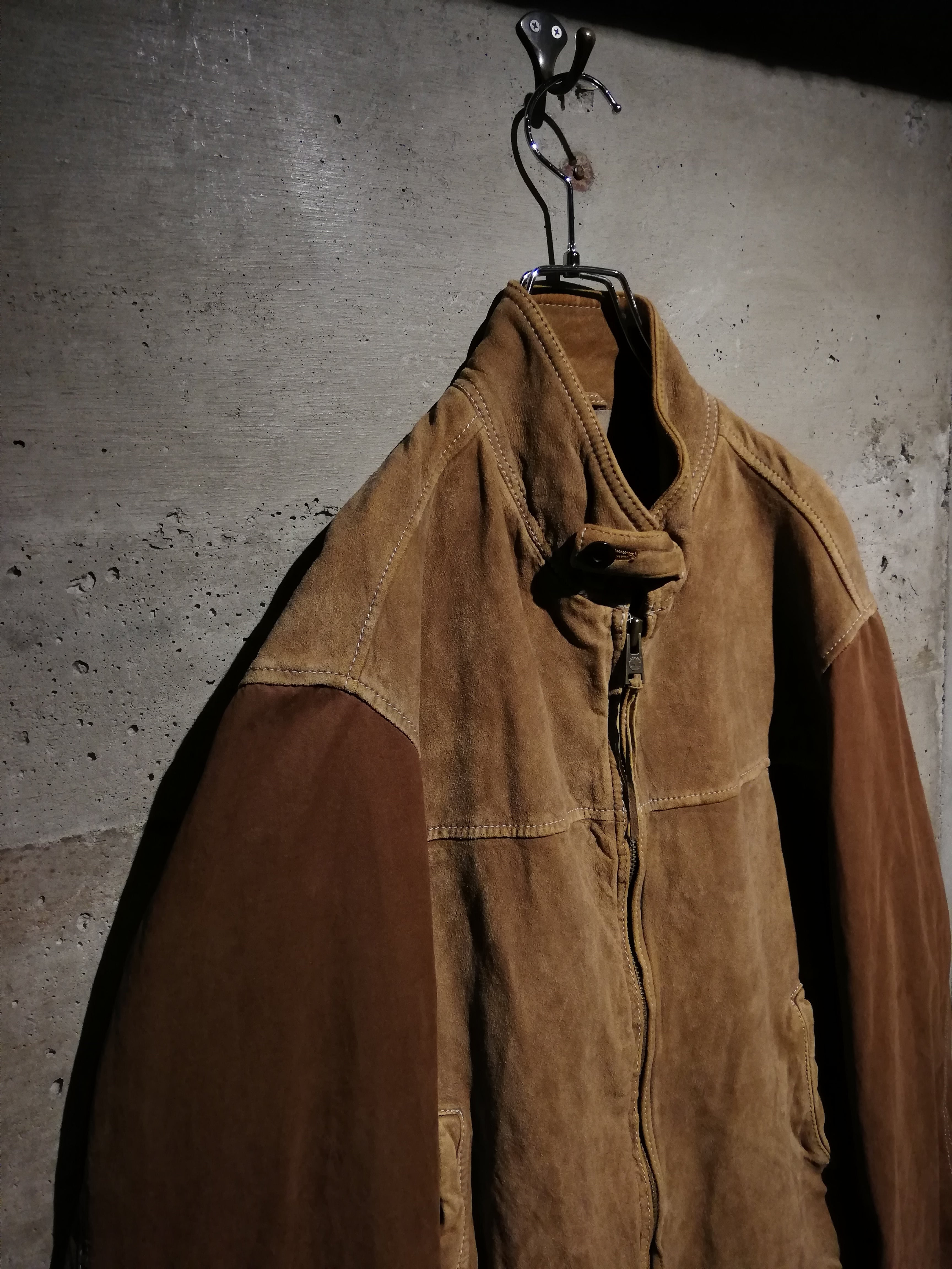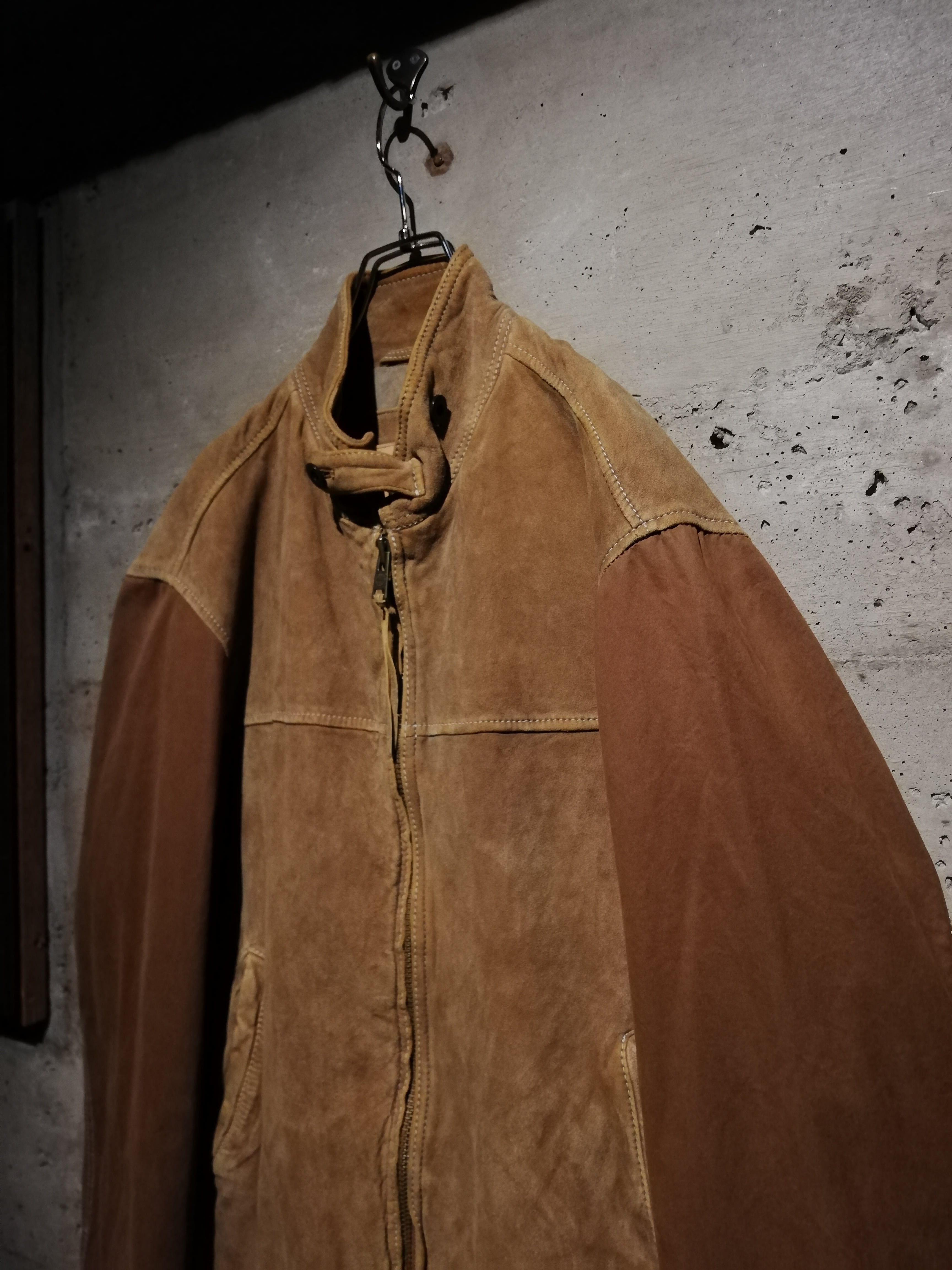 ハリのあるキャメルカラーのボディをベースに、フロントや脇、袖などにヌバックレザーでの切り替えを施したジップアップジャケット。
