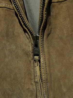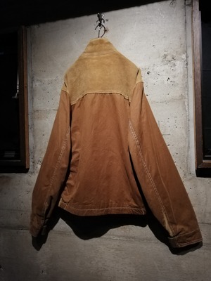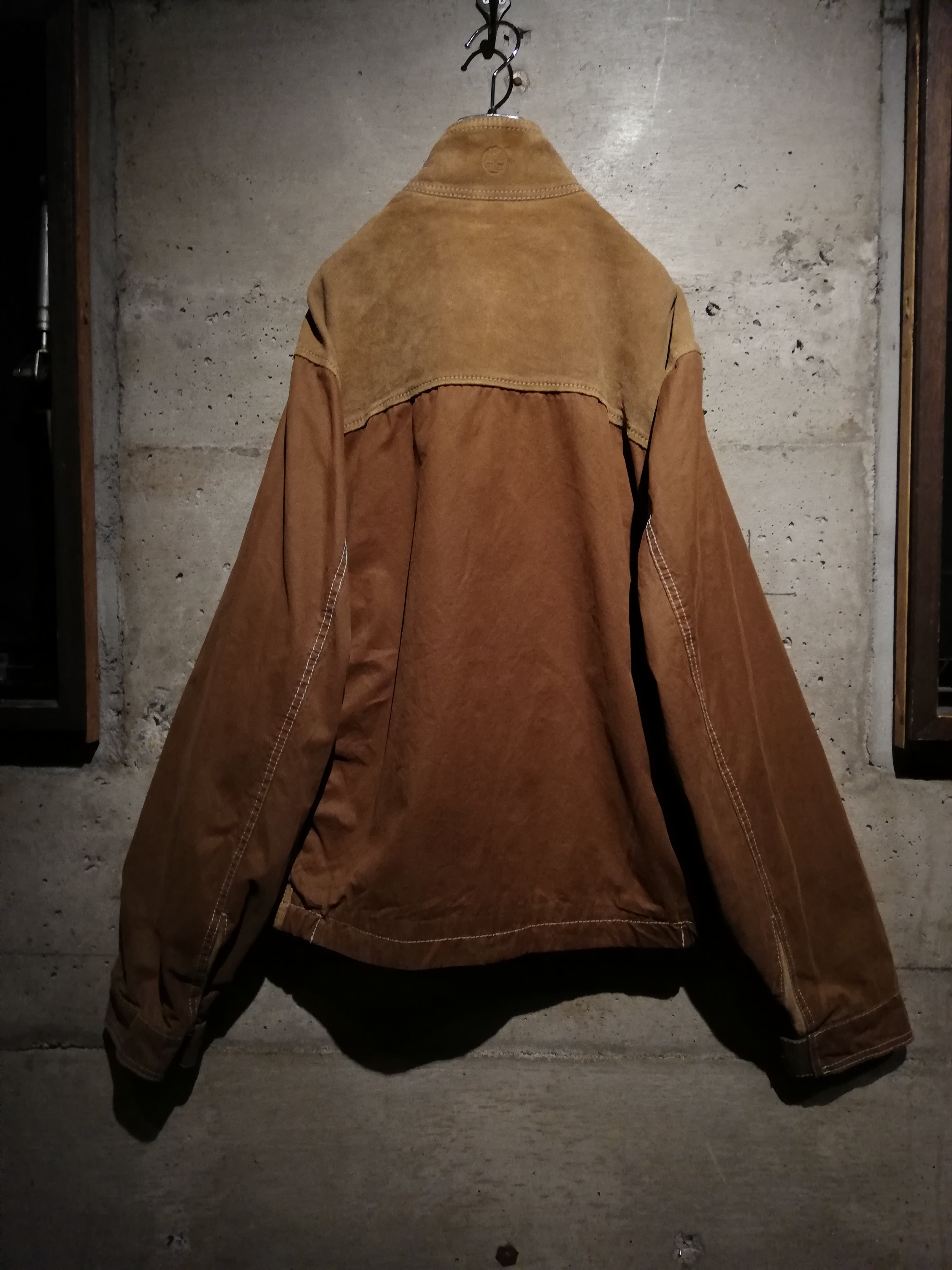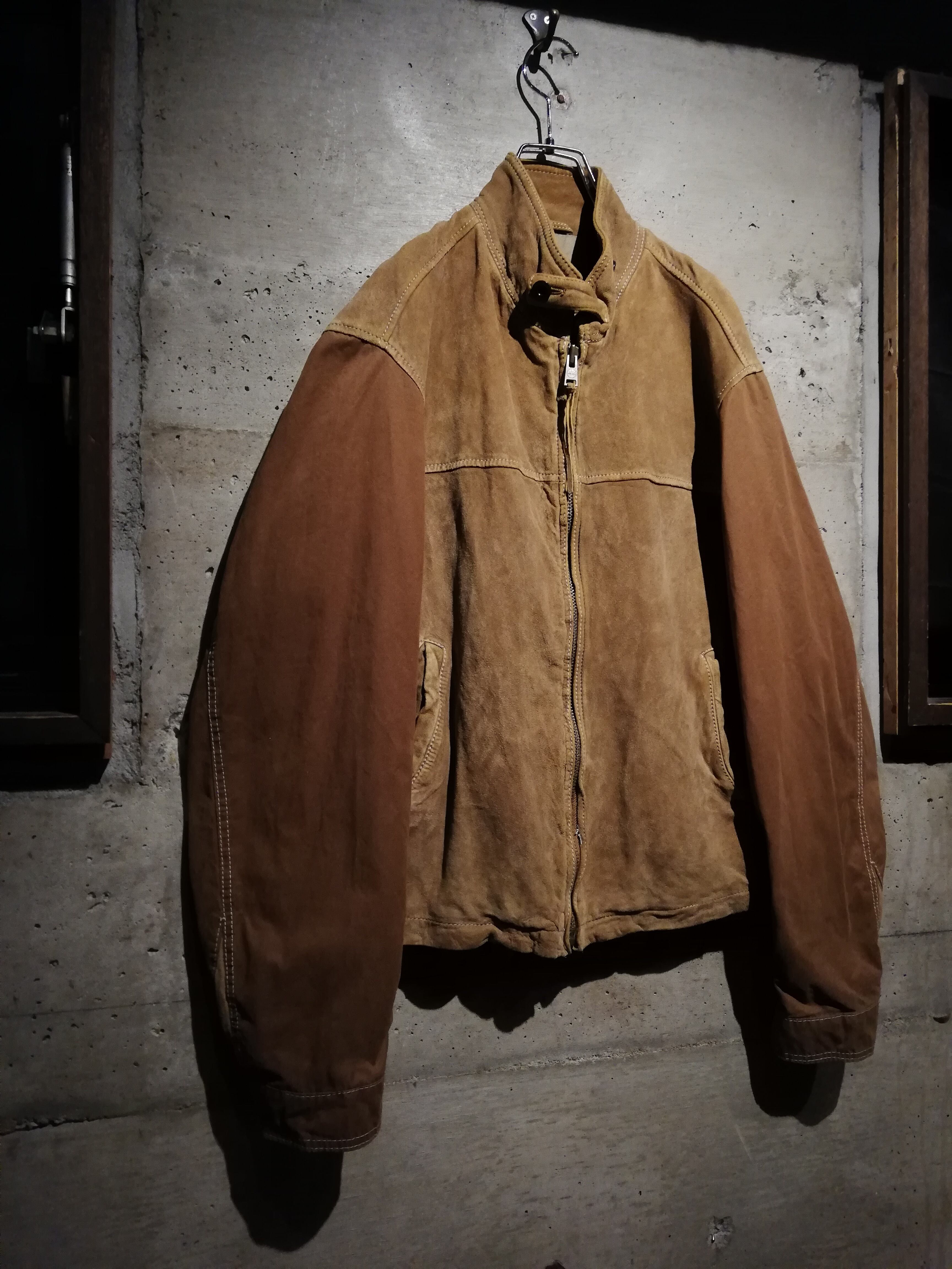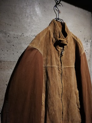 ハリのあるキャメルカラーのボディをベースに、フロントや脇、袖などにヌバックレザーでの切り替えを施したジップアップジャケット。