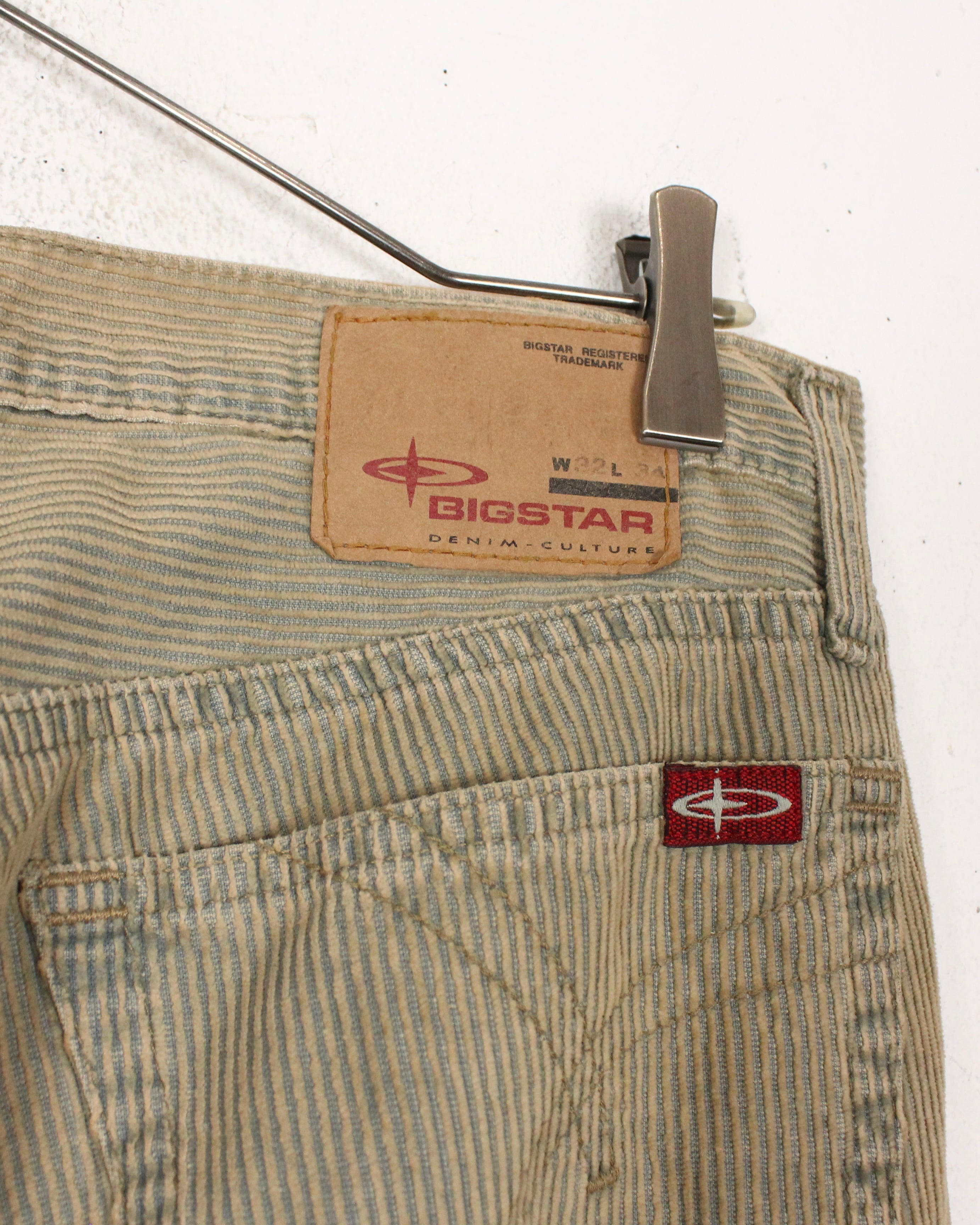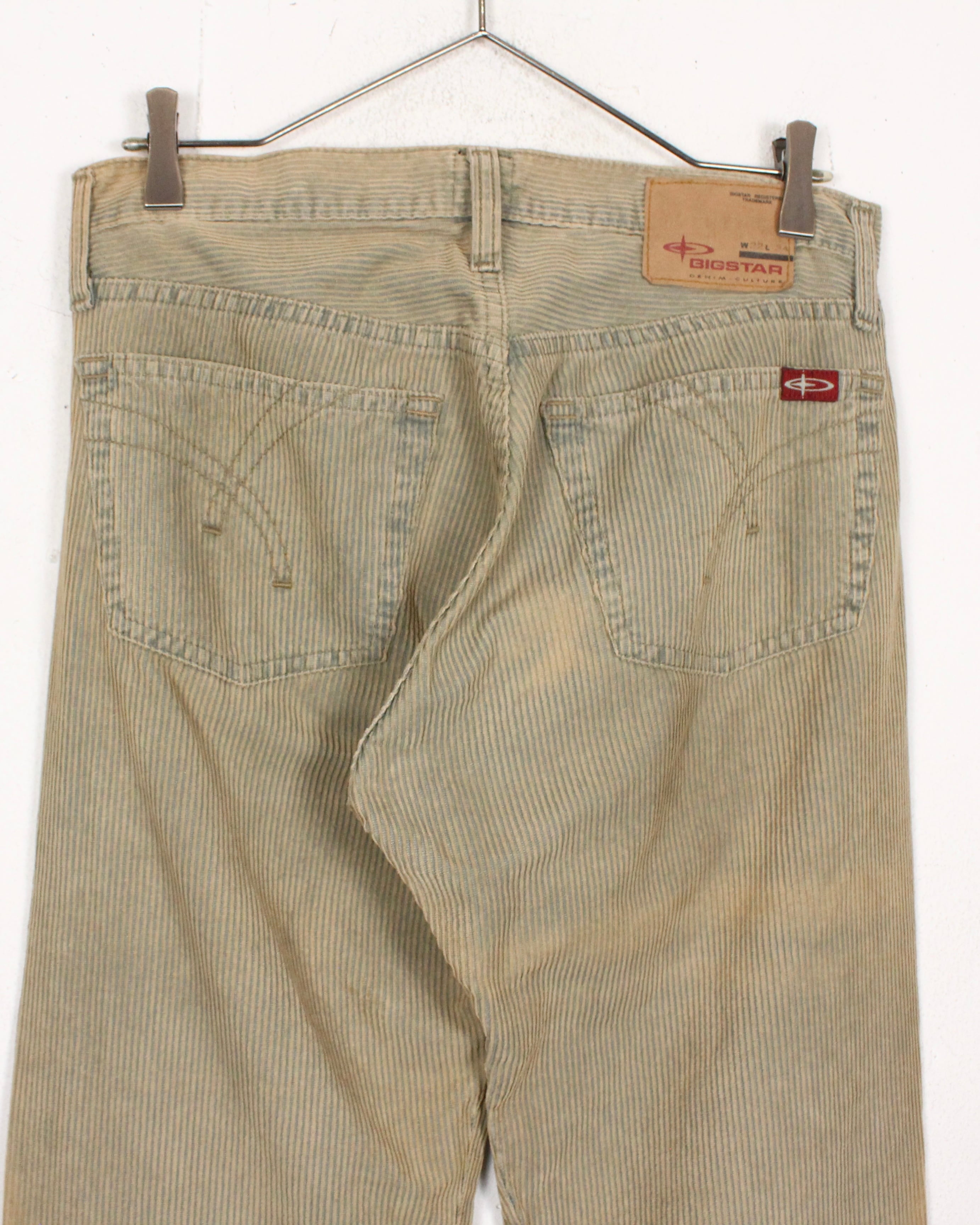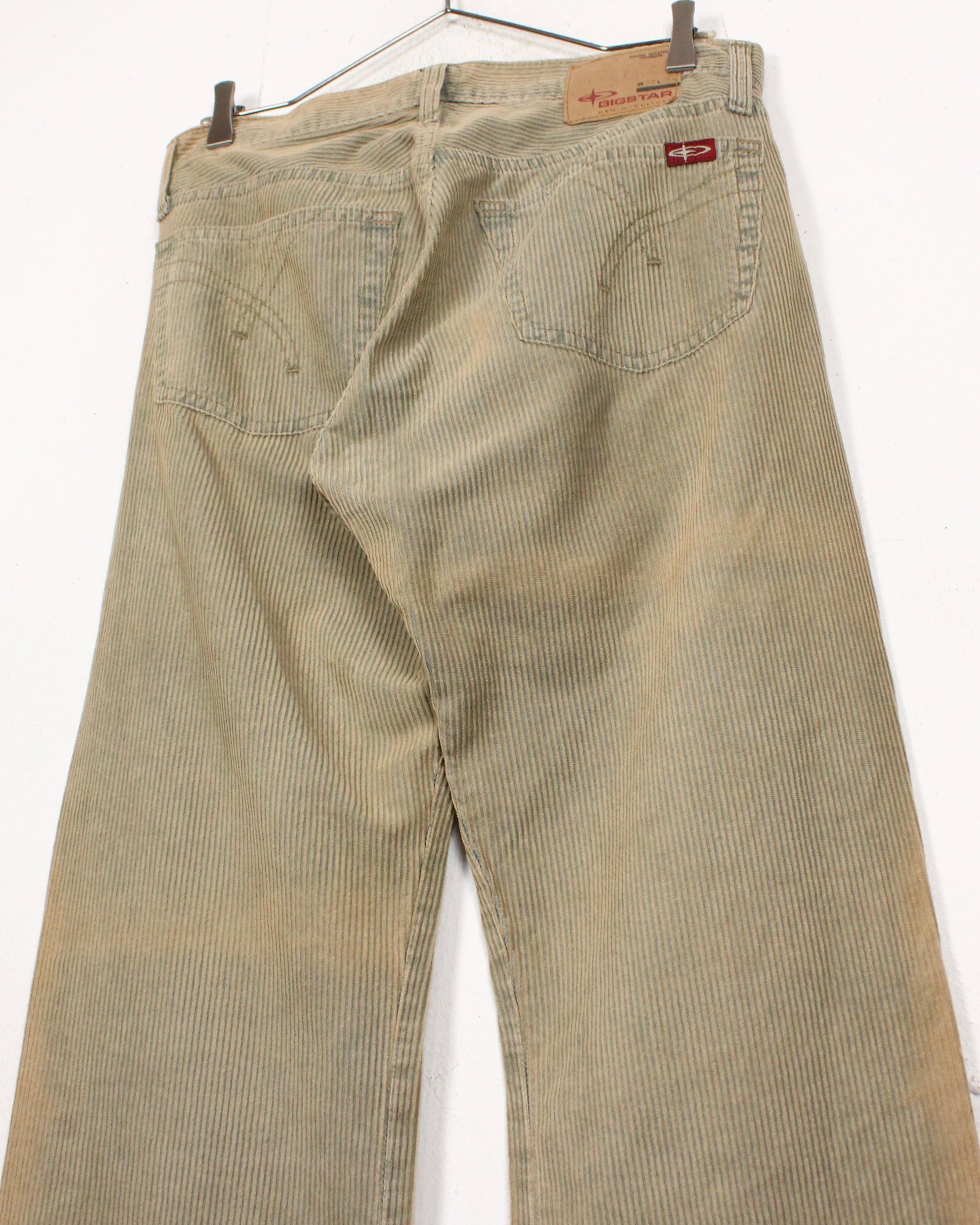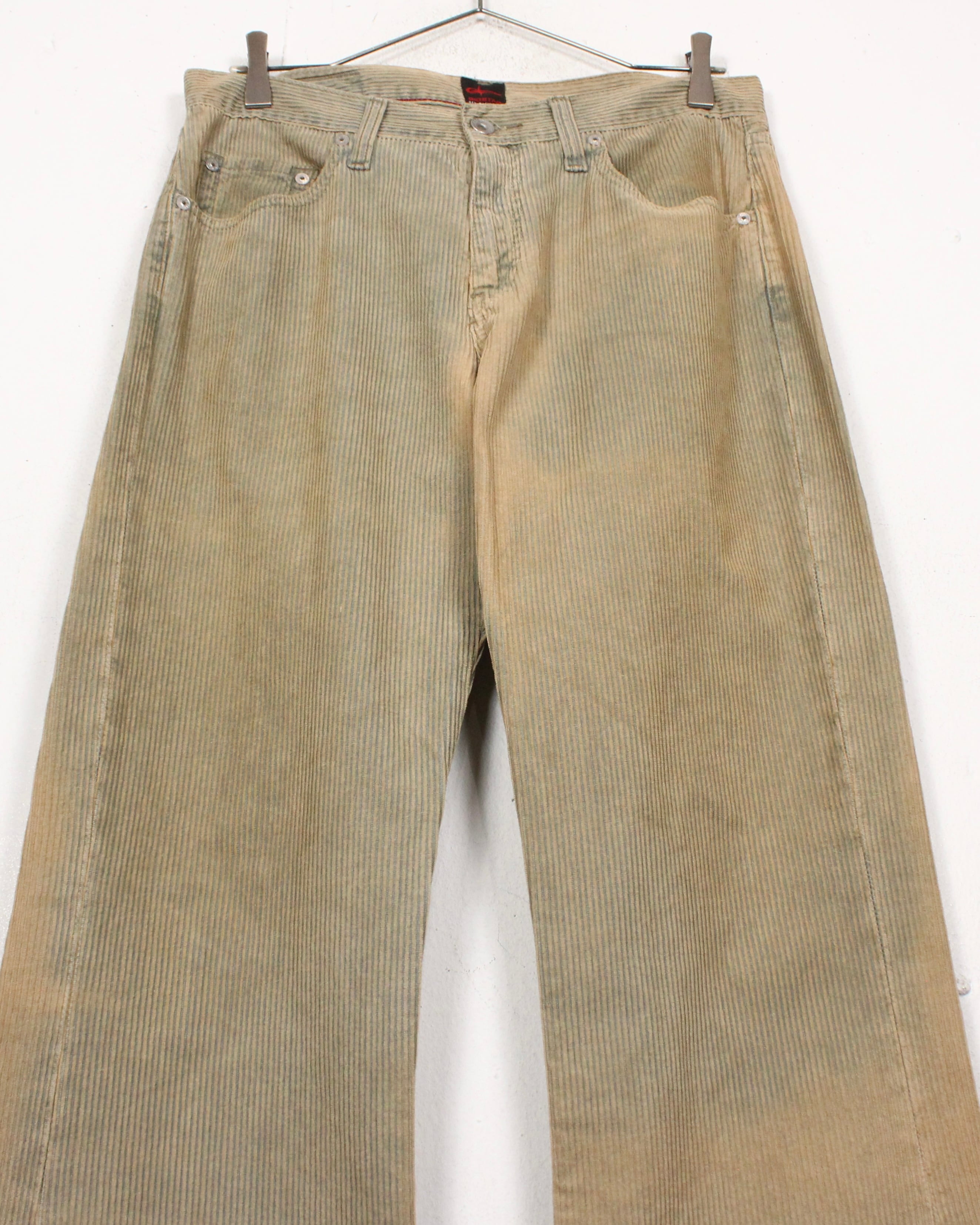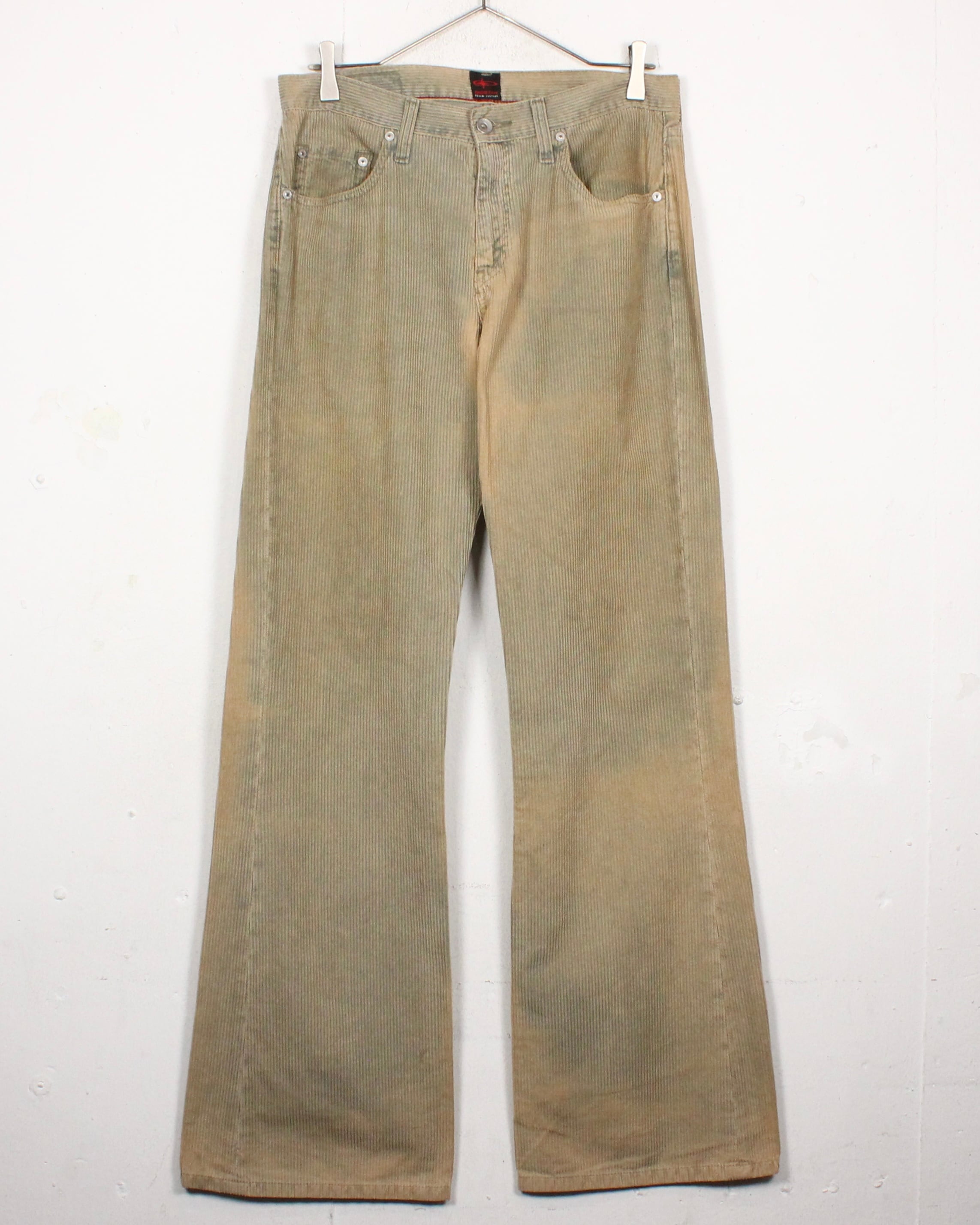 インディゴのボディをベースに、ベージュ畝のコーデュロイを載せたフレアパンツ。